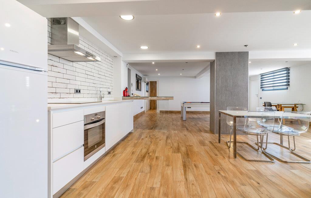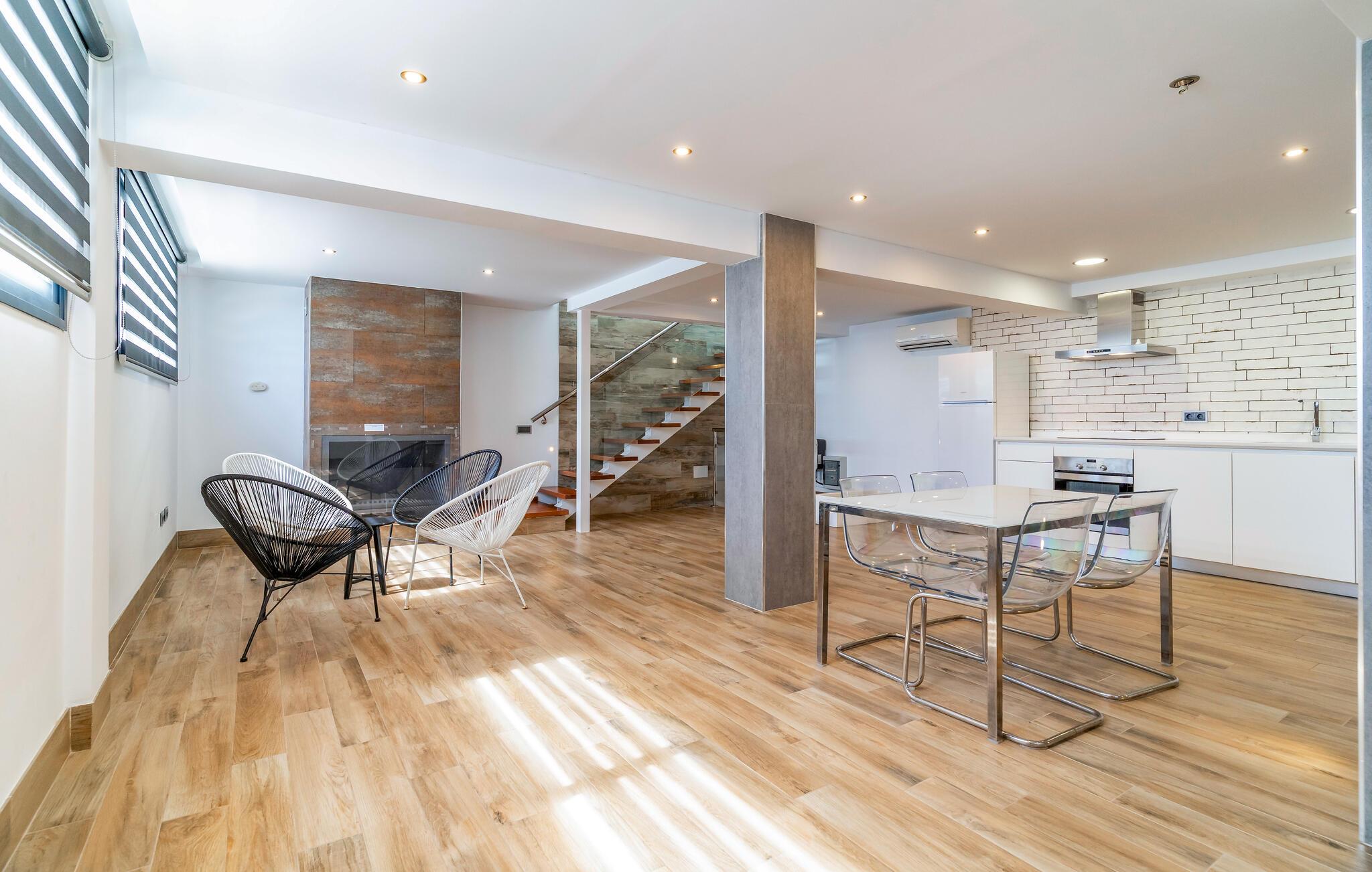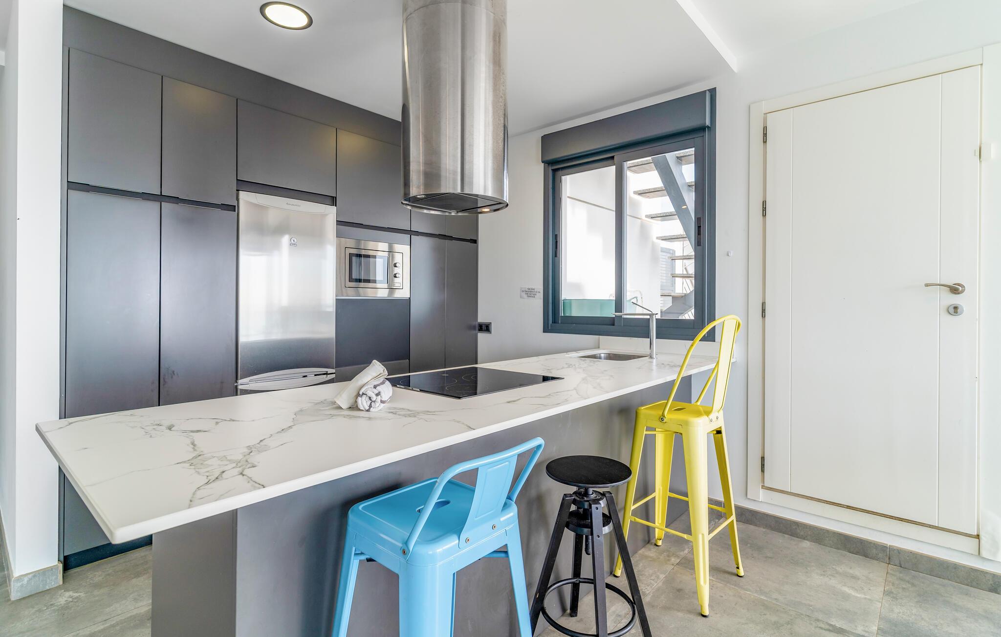 Dette moderne rækkehus af høj kvalitet tilbyder masser af plads til at nyde en hyggelig ferie med en stor familie eller en gruppe venner. Hold hyggelige madlavningsaftener, snak over lange måltider med udsigt over havet, og efter en lang dag under den blå himmel kan I samles i den luftige stue for at streame en film eller slappe af med en spilleaften.