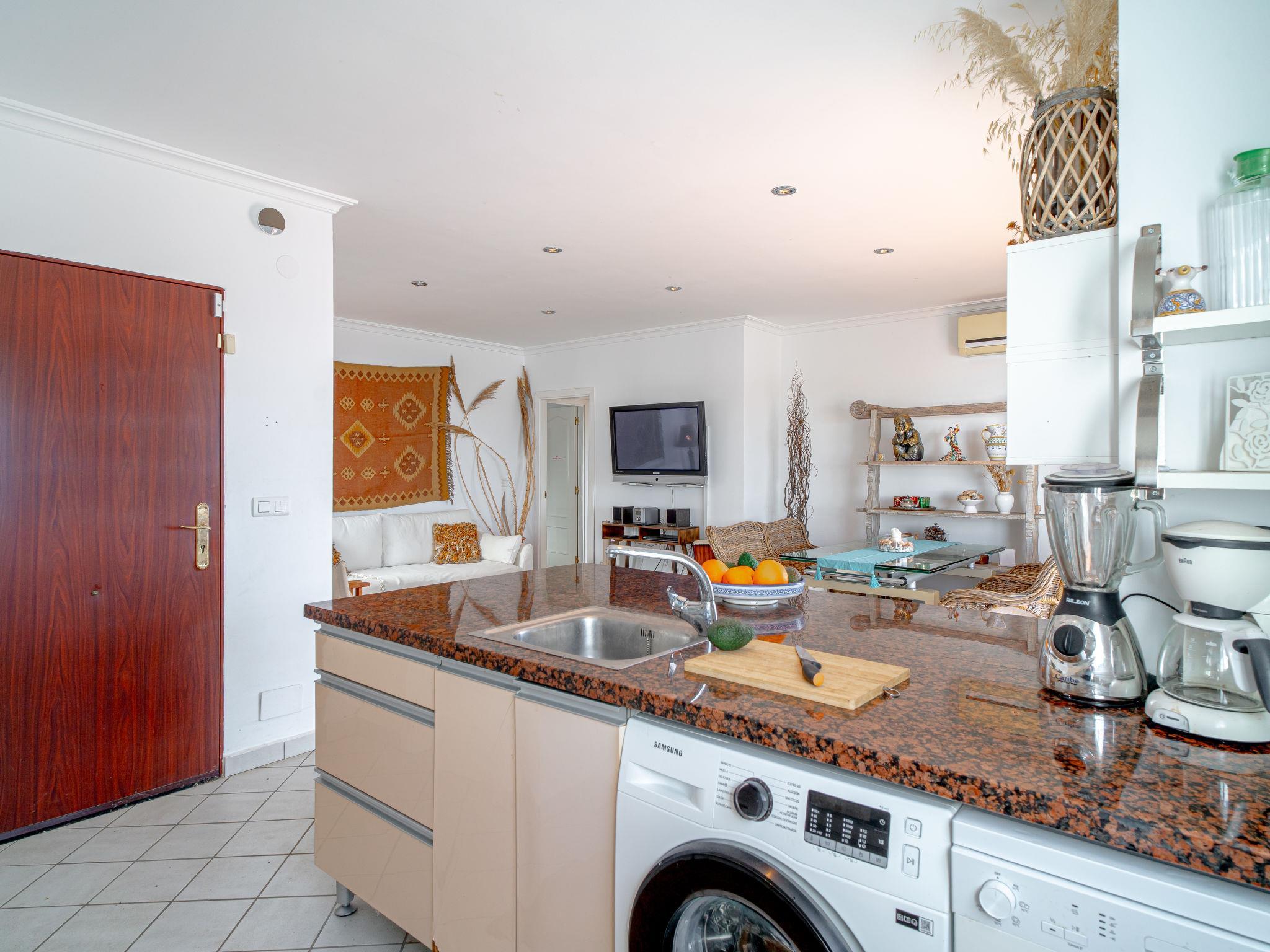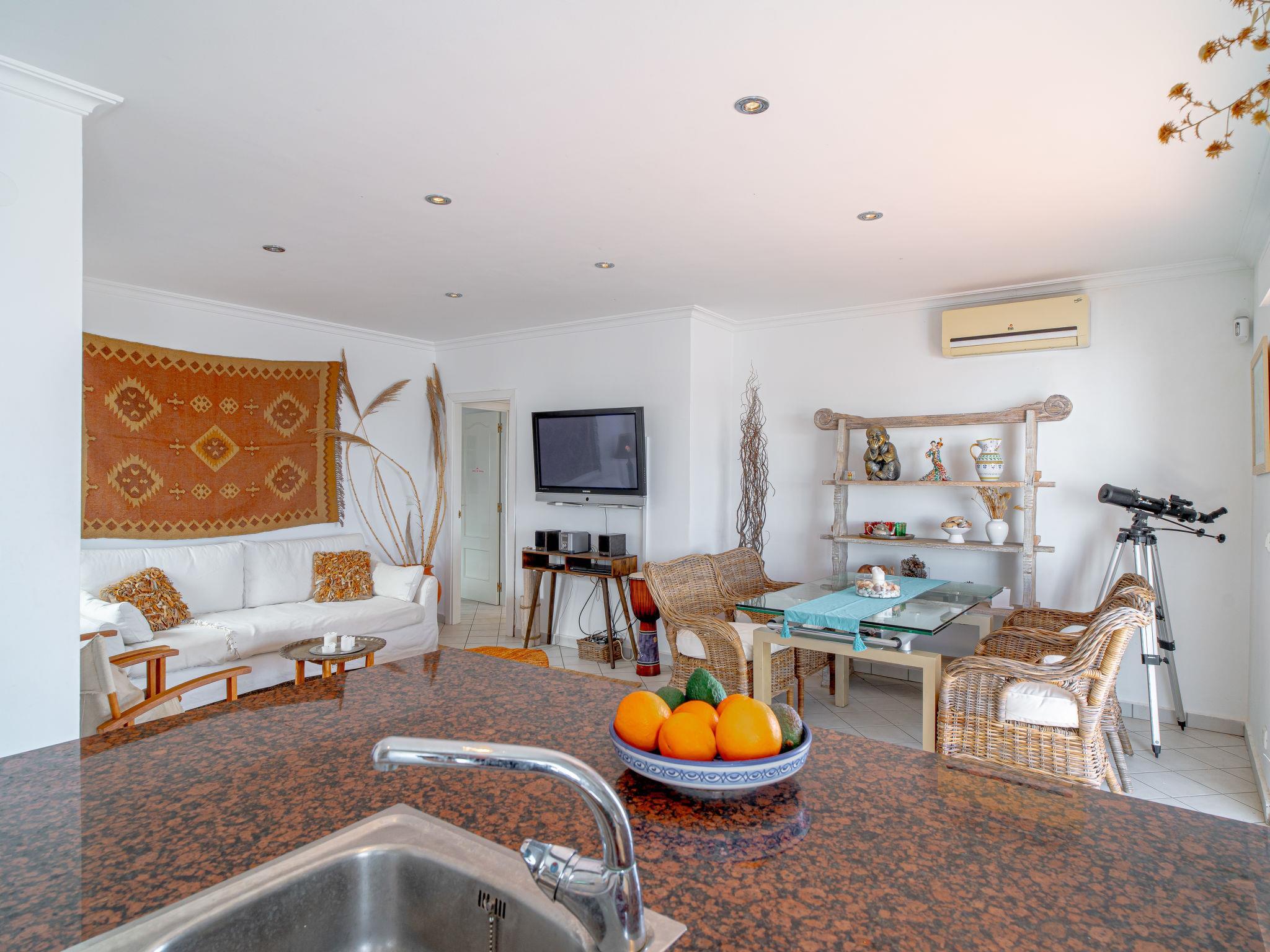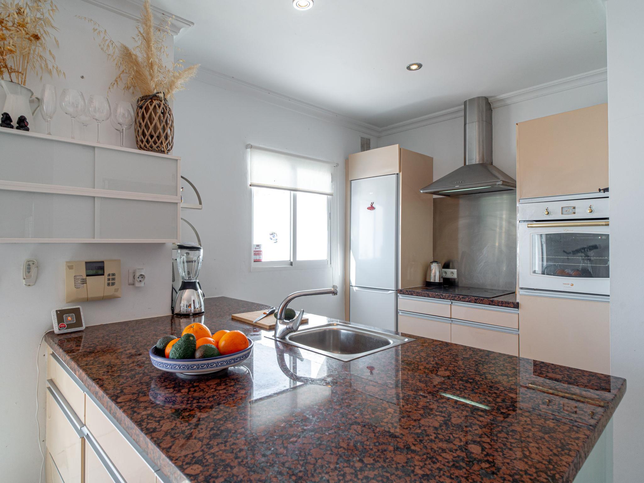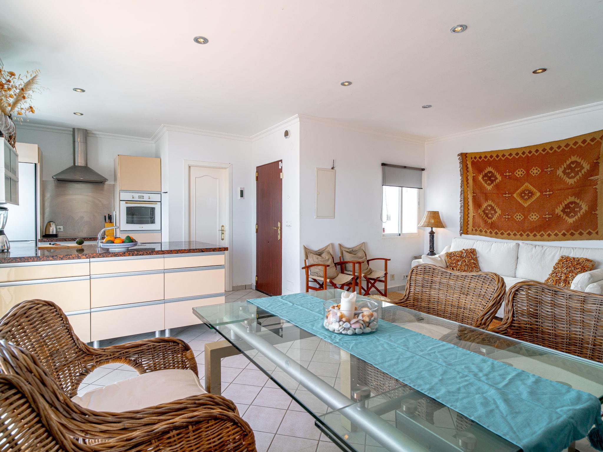"Amor", 3-room apartment 80 m2, south-west facing position. Spacious and bright, practical and comfortable furnishings: living/dining room with TV, air conditioning and forced-air heating. Exit to the terrace. 1 room with 2 beds (90 cm, length 190 cm), shower/WC, air conditioning and forced-air heating. 1 room with 1 french bed (180 cm, length 200 cm), air conditioning and forced-air heating. Exit to the terrace. Open kitchen (oven, dishwasher, 4 ceramic glass hob hotplates, toaster, kettle, microwave, freezer, electric coffee machine, cooking island). Exit to the terrace. Bath/WC. Large terrace. Terrace furniture, barbecue, deck chairs (2). Marvellous view of the resort and the ocean. Facilities: washing machine, iron, children's high chair, baby cot for up to 2 year olds, hair dryer. Internet (WiFi, free). Please note: maximum 1 pet/ dog allowed. Smoke alarm, fire extinguisher, no lift. VUT/MA/732843 // Reg. Nr.: ESFCTU0000290130003435840000000000000000VUT/MA/732843