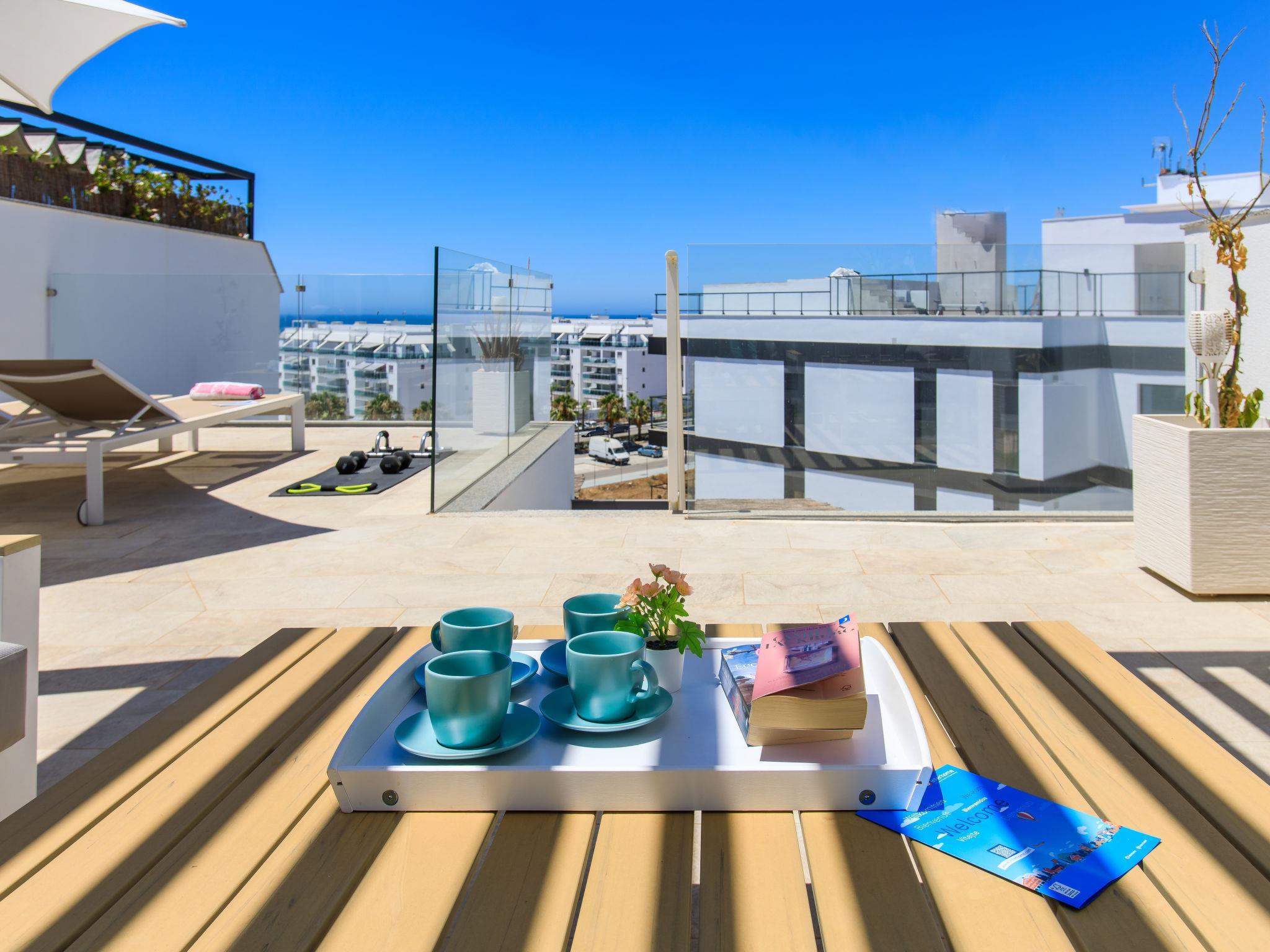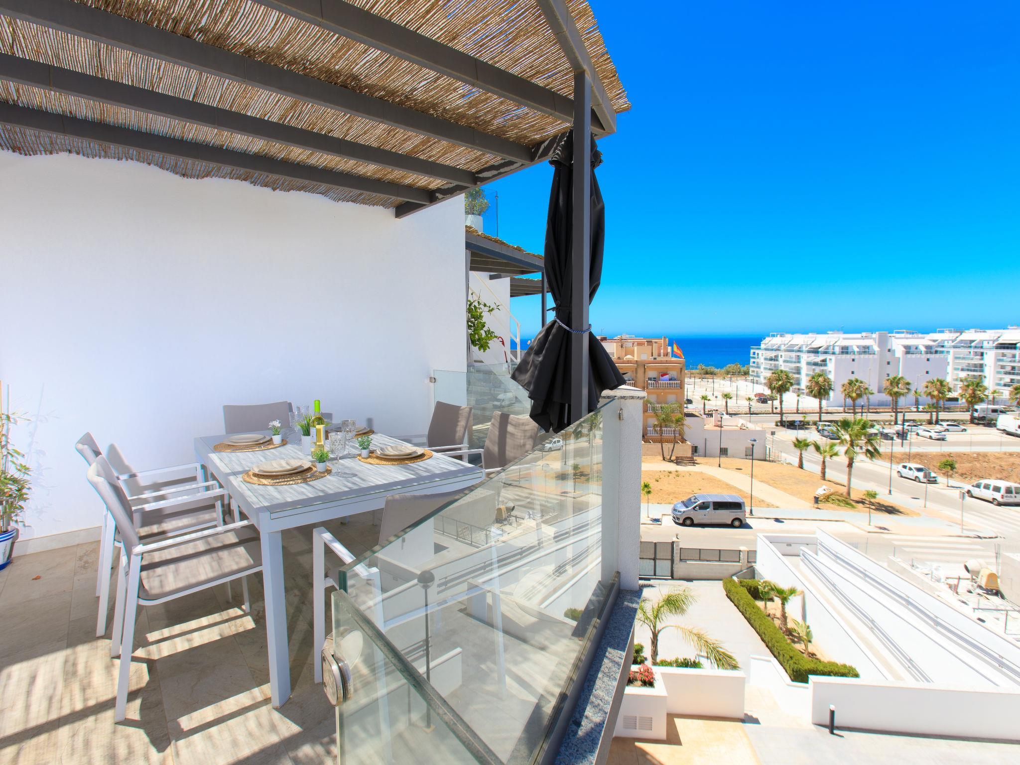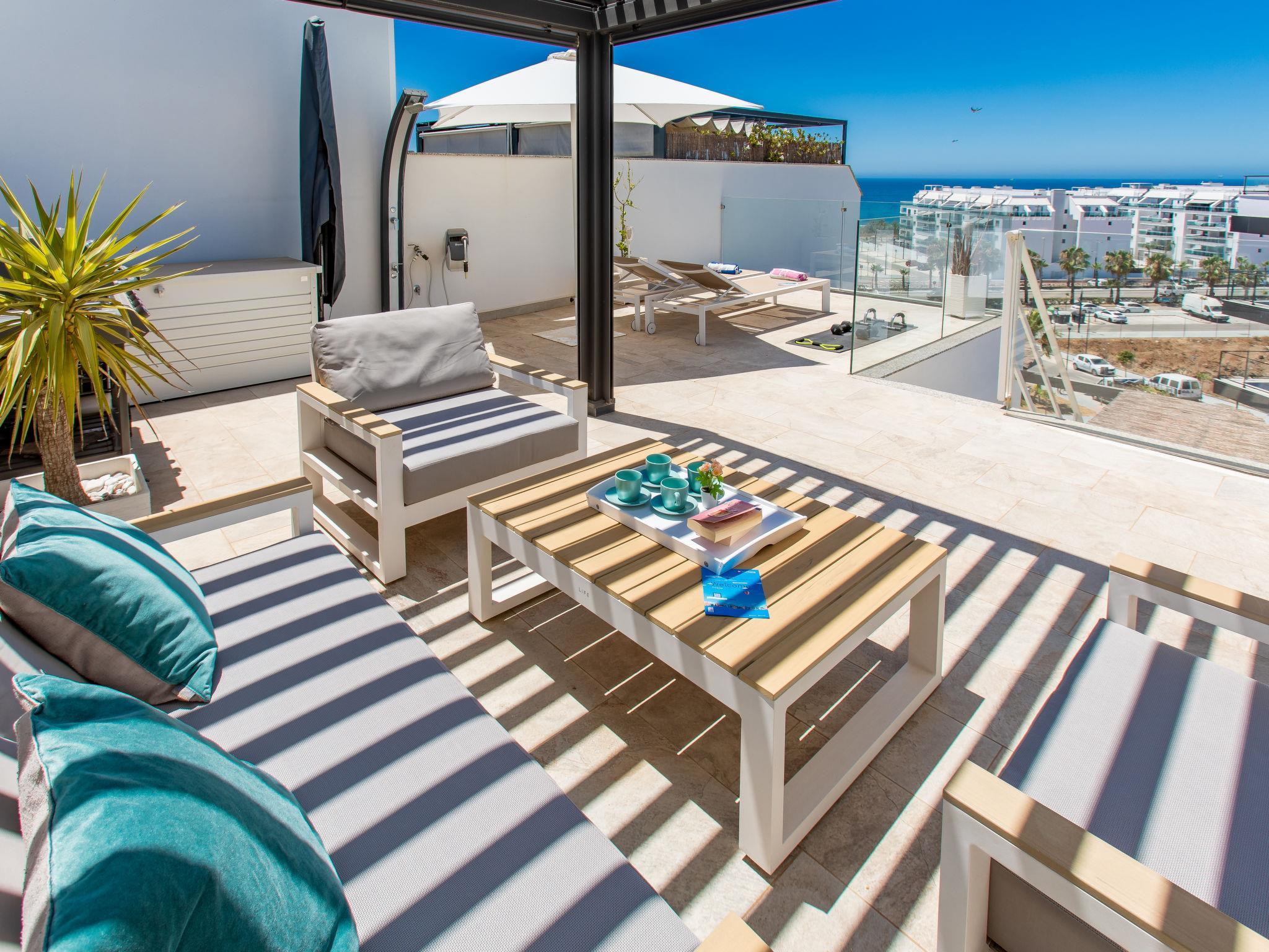 "Marinsa Beach Torrox Costa next to Nerja", 3-room penthouse 83 m2 on 2 levels, south-west facing position. Object suitable for 4 adults. Comfortable and modern furnishings: living/dining room with dining table, digital TV, international TV channels, air conditioning, forced-air heating and electric shutters. Exit to the terrace. 1 room with 2 beds (90 cm, length 200 cm), air conditioning and forced-air heating. 1 room with 1 french bed (160 cm, length 200 cm), shower/WC and double hand-basin (private) air conditioning and forced-air heating. Exit to the terrace. Open kitchen (oven, dishwasher, 3 induction hot plates, toaster, microwave, freezer, electric coffee machine) with dining table. Exit to the terrace. Shower/WC. Large terrace, small terrace. Terrace furniture, barbecue, deck chairs (2), sitting area. Marvellous view of the sea, the mountains and the resort. Facilities: washing machine, dryer, iron, children's high chair, hair dryer. Internet (WiFi, free). Parking space n 15 (roofed). Please note: suitable for families. Smoke alarm, fire extinguisher. 2 terraces (1 large terrace and 1 fantastic roof terrace of 40 m2. Panoramic sea views. A perfect place to enjoy beautiful sunsets. Terrace furniture, including a large lounge sofa, sun loungers, a large pergola and an outdoor shower. VUT/MA/74012 // Reg. Nr.: ESFCTU0000290130010841270000000000000000VUT/MA/740127
