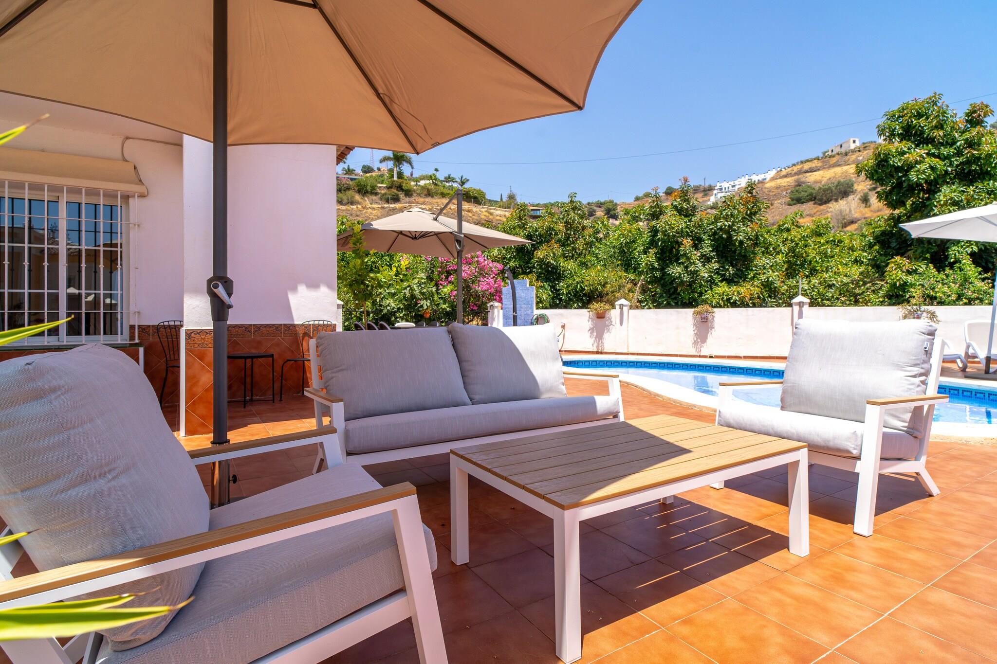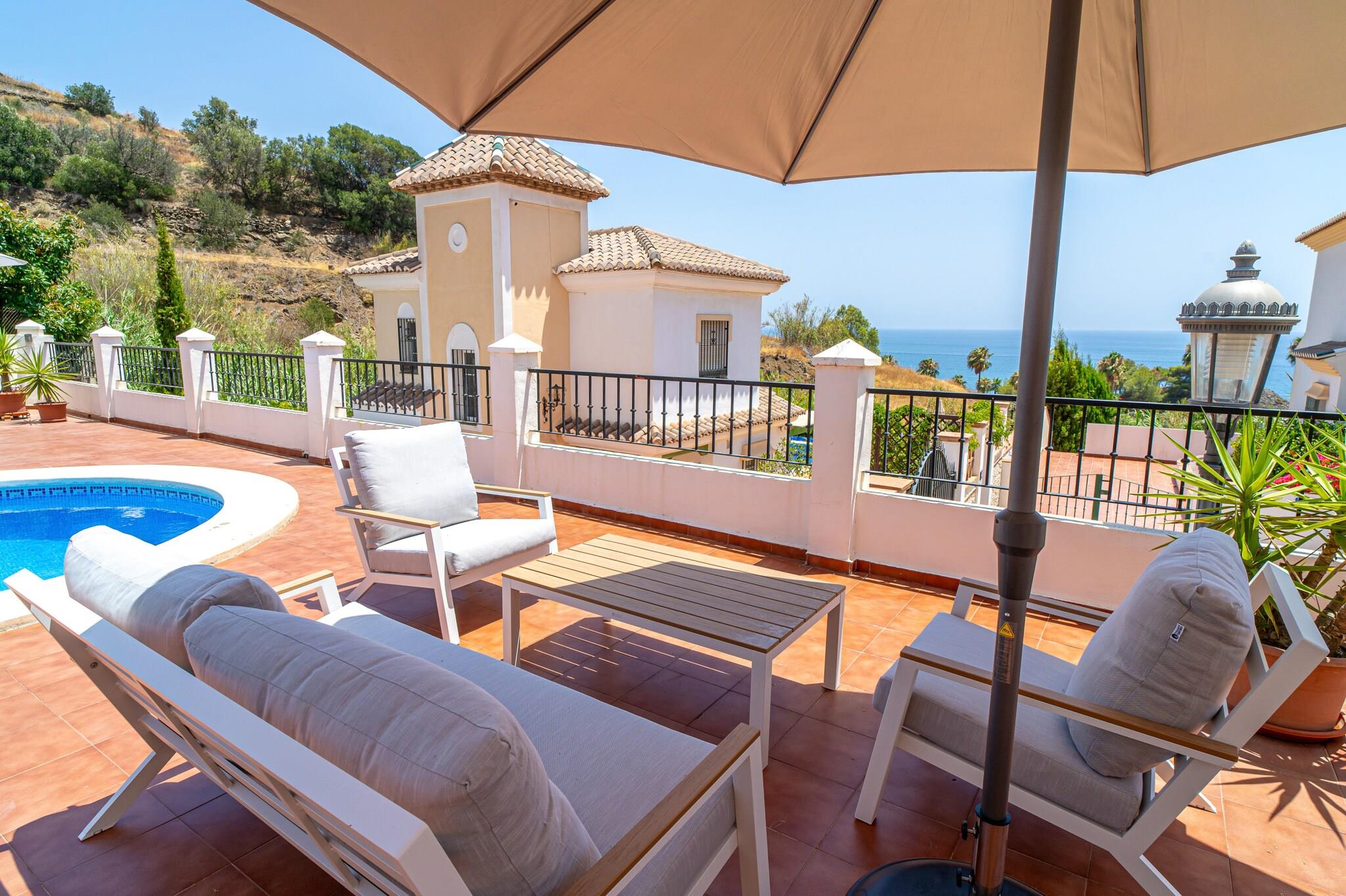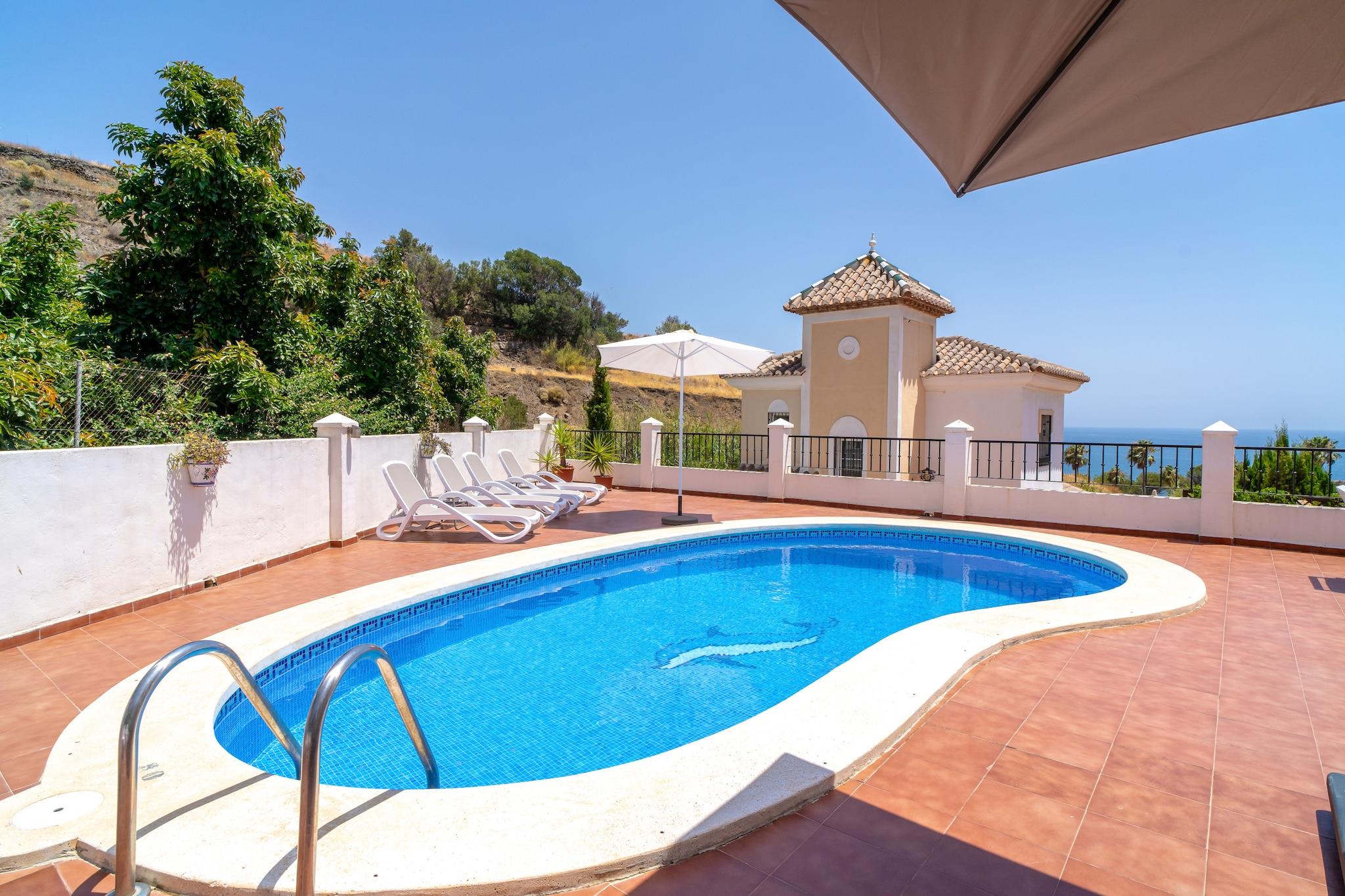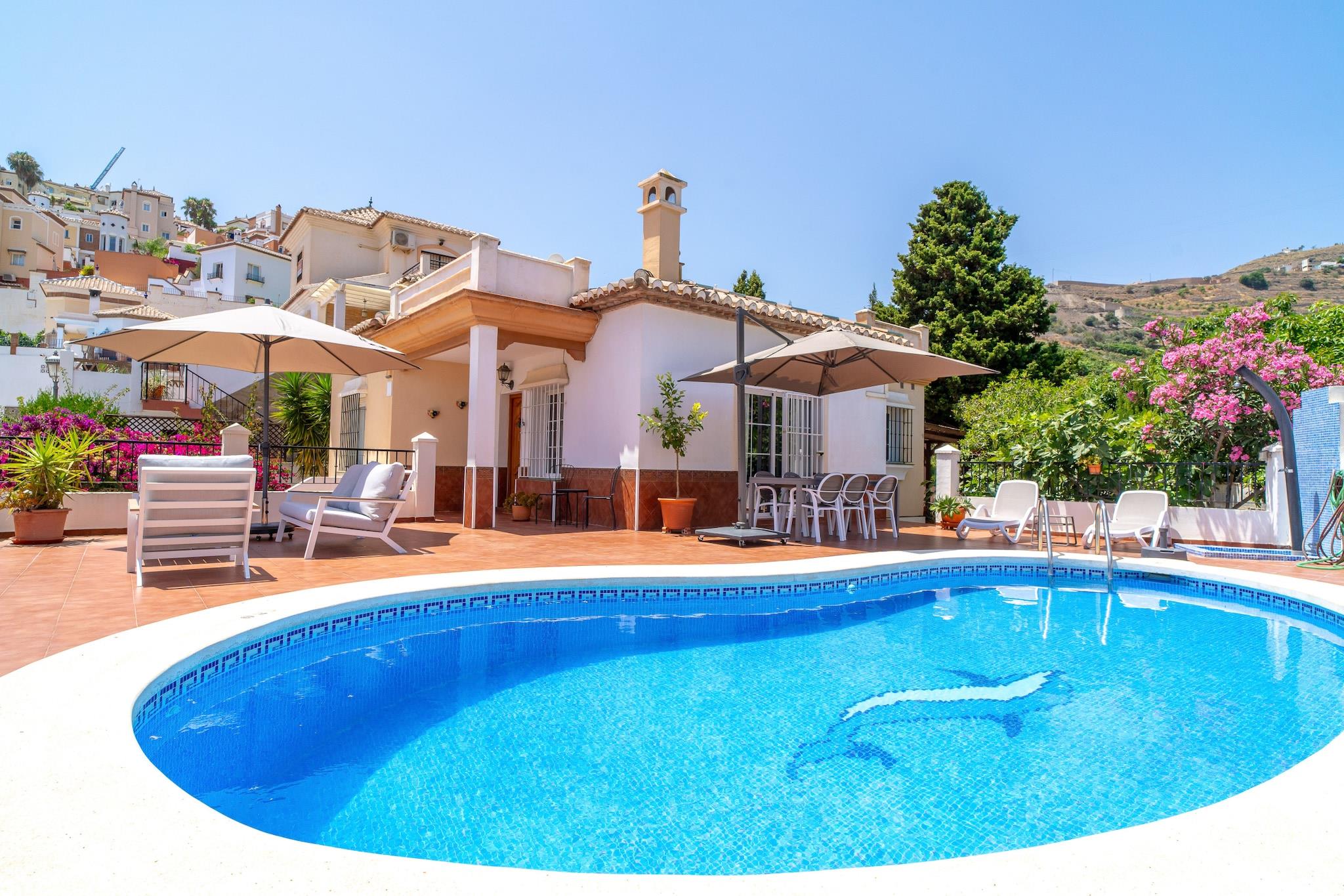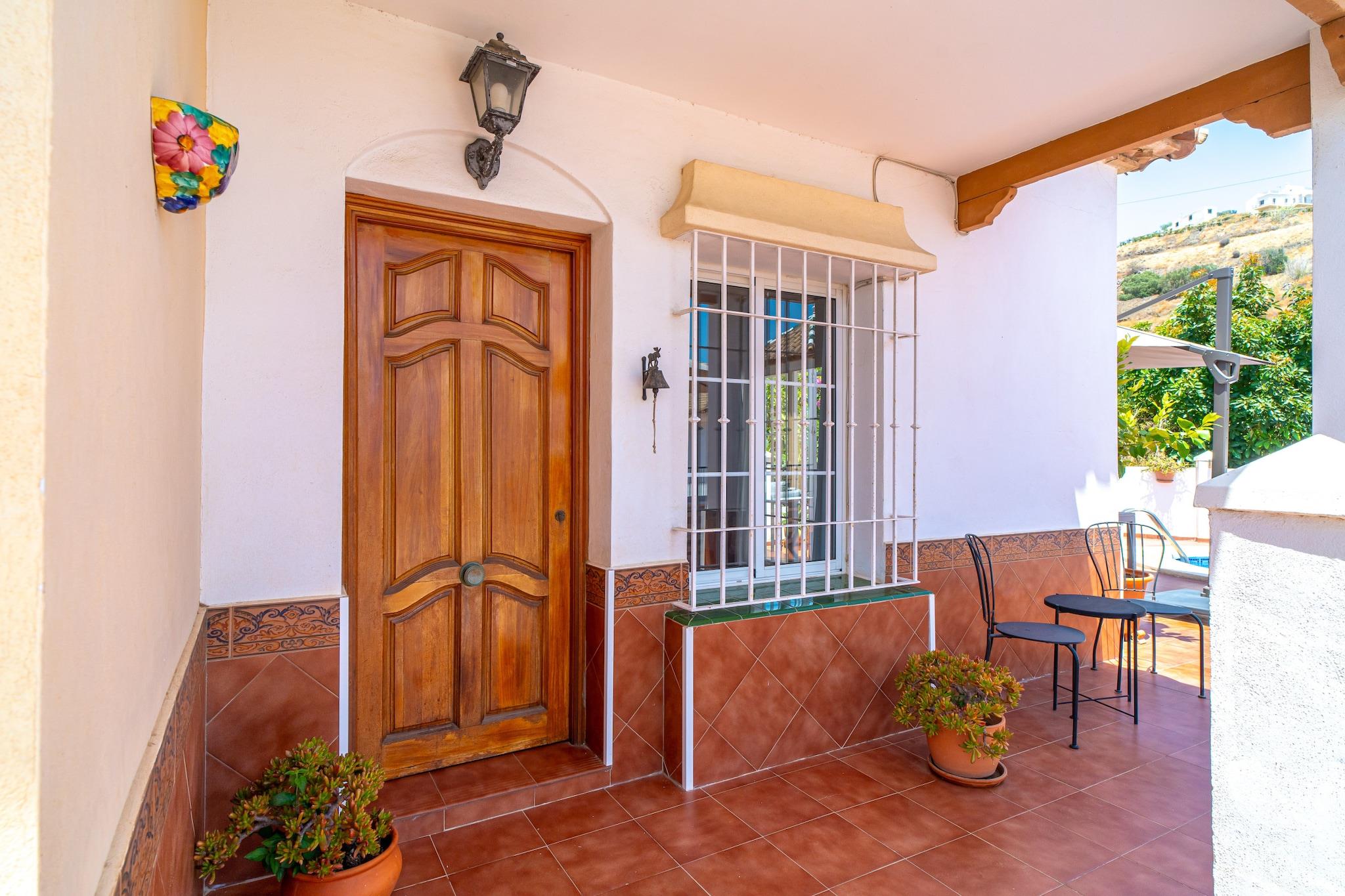 Dette elegante feriehus er en charmerende villa med traditionel spansk karakter og har tre soveværelser - et soveværelse med en kingsize-seng og eget badeværelse, et andet med to enkeltsenge og et tredje værelse med en dobbelt sovesofa, hvilket gør det ideelt til op til seks gæster. Ejendommen inkluderer en privat swimmingpool, eksklusive havemøbler, en middelhavsinspireret terrasse med grillplads og en terrasse med havudsigt til udendørs spisning og afslapning. Det er ikke kæledyrsvenligt, men tilbyder privat parkering og en rolig have. Der tilbydes valgfrie velkomstpakker og lufthavnstransport, men der er ingen gratis aktiviteter inkluderet. Villaen ligger i det fredelige Tamango Hill-område mellem Nerja og Torrox Costa og ligger tæt på nogle af de bedste strande på den østlige Costa del Sol. Playa Güilche, en rolig lokal perle, ligger kun 500 meter væk, mens El Peñoncillo-stranden og Playazo-stranden - ideel for familier - kan nås inden for en kort køretur. Det lokale busstoppested, kun 800 meter fra villaen, forbinder dig med Nerjas landsbycentrum, Burriana-stranden og byens marked. Taxaer og billeje er også bekvemme muligheder, og ejendommen har en privat parkeringsplads, selvom den kan være trang for store køretøjer. Indenfor finder gæsterne et fuldt udstyret køkken med opvaskemaskine og moderne apparater, to badeværelser med moderne inventar og en rummelig stue med tv og internetadgang. Faciliteter som strygejern, hårtørrer og basale toiletartikler leveres ved ankomsten. Ejendommen er designet til komfort og bekvemmelighed med en skyggefuld havekrog, der er perfekt til afslapning.