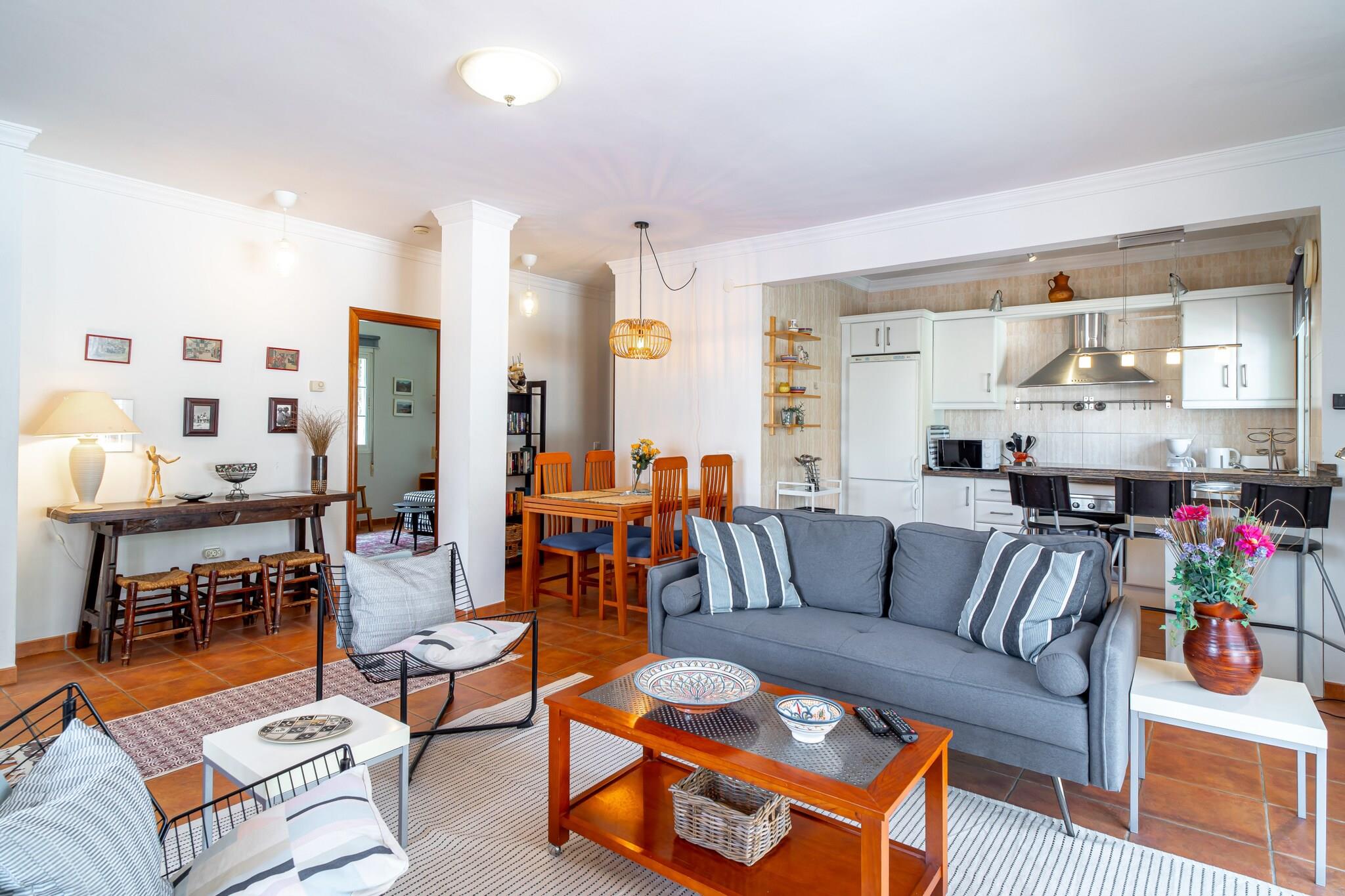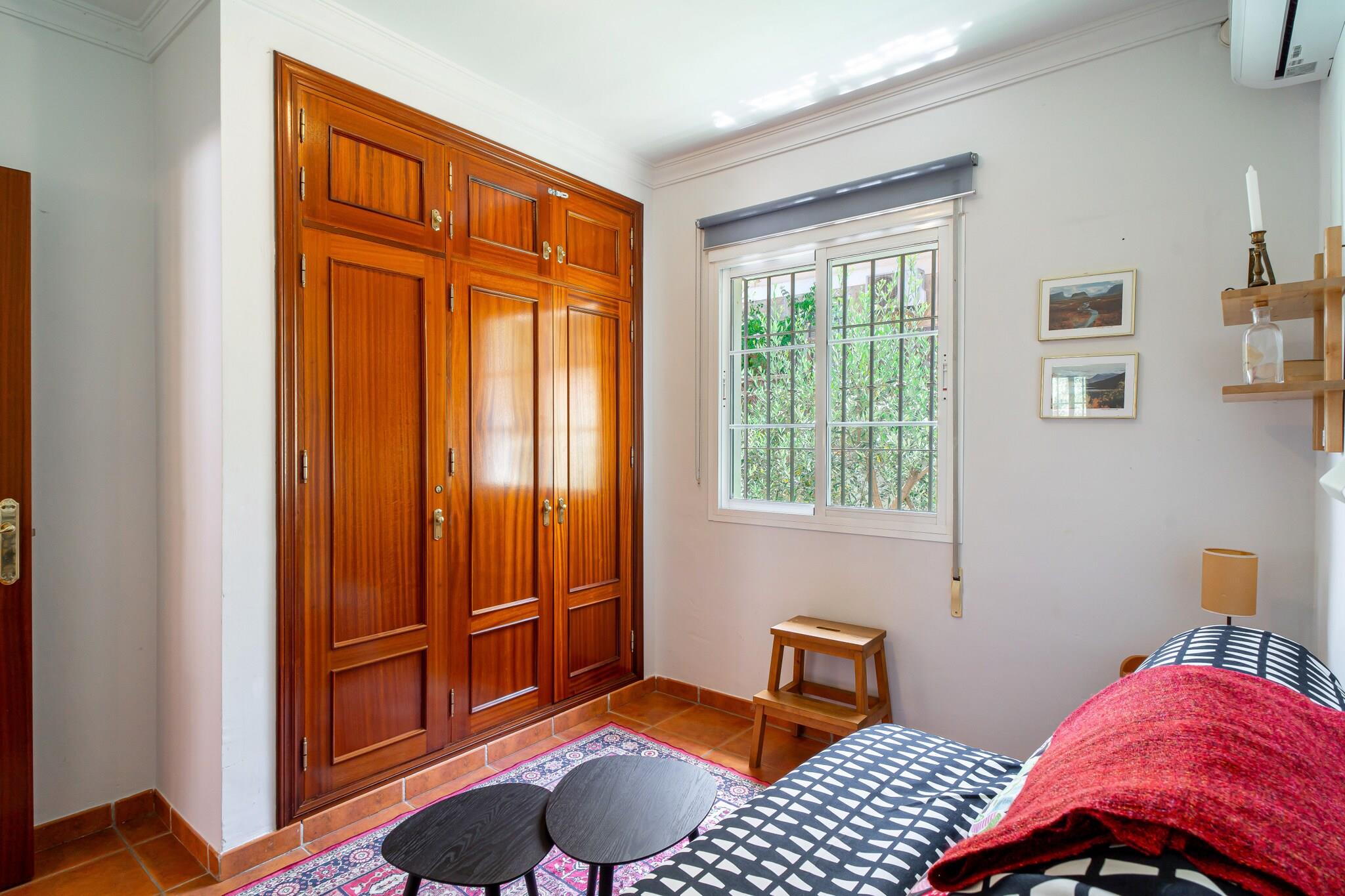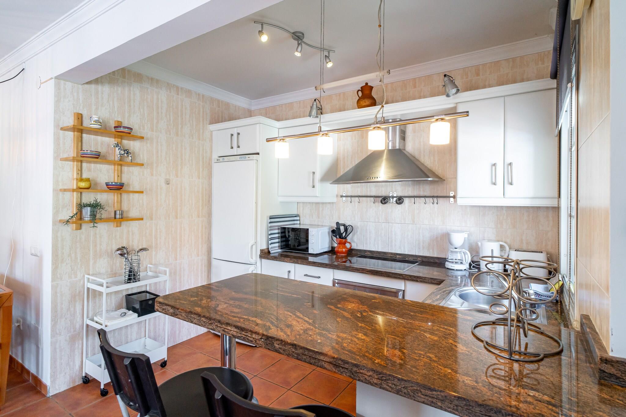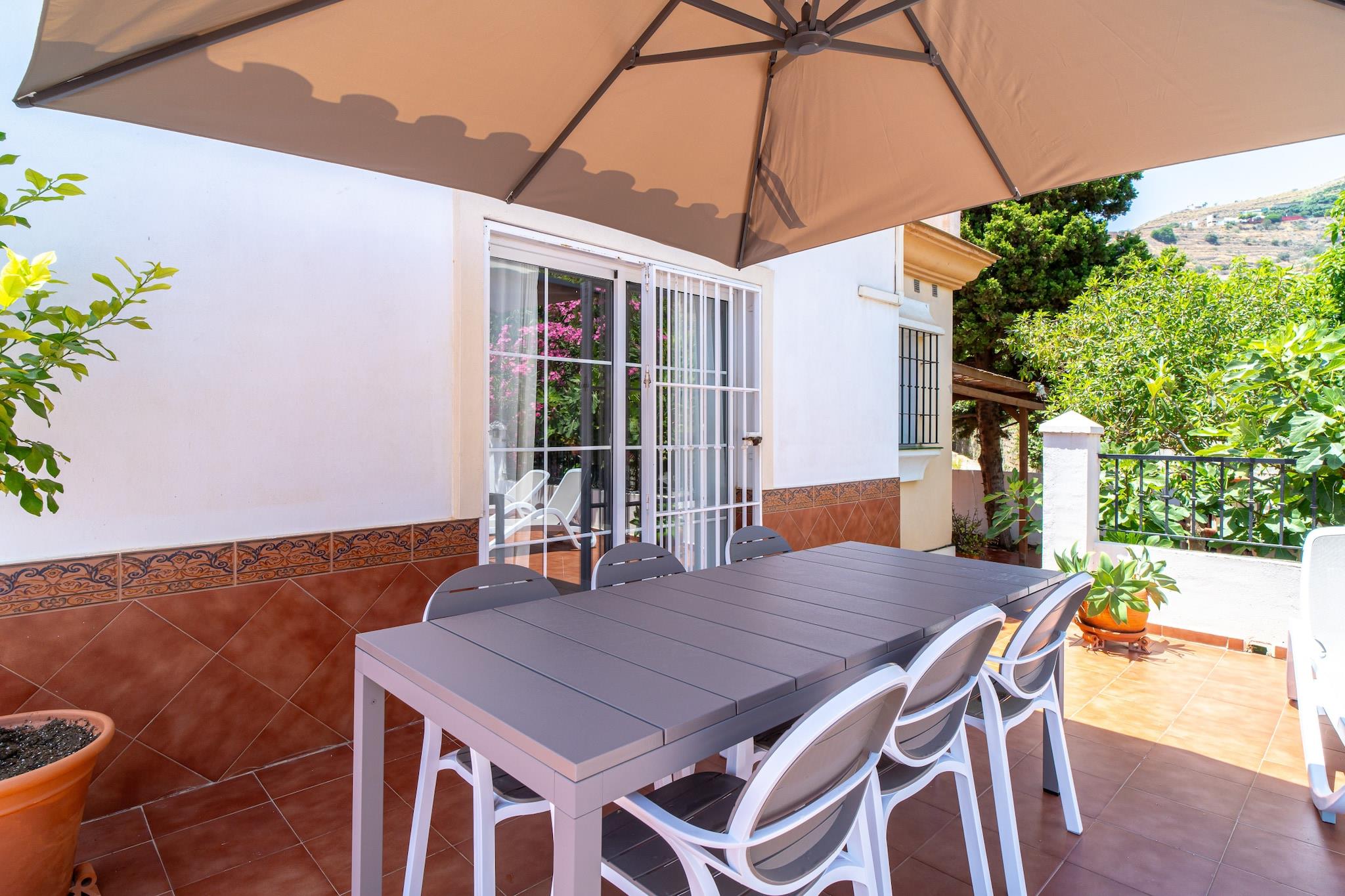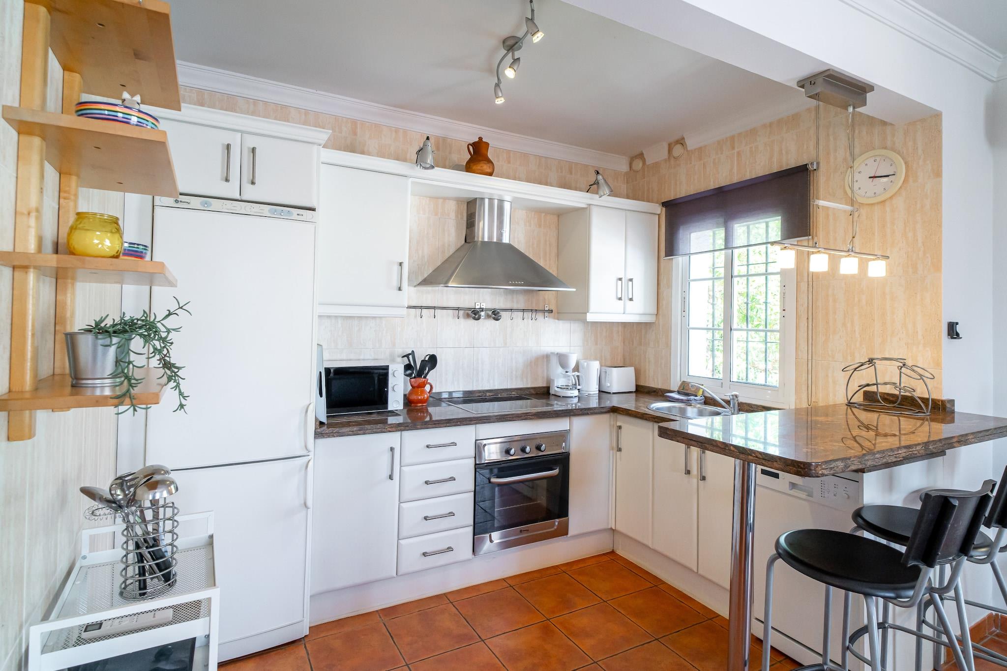 Dette elegante feriehus er en charmerende villa med traditionel spansk karakter og har tre soveværelser - et soveværelse med en kingsize-seng og eget badeværelse, et andet med to enkeltsenge og et tredje værelse med en dobbelt sovesofa, hvilket gør det ideelt til op til seks gæster. Ejendommen inkluderer en privat swimmingpool, eksklusive havemøbler, en middelhavsinspireret terrasse med grillplads og en terrasse med havudsigt til udendørs spisning og afslapning. Det er ikke kæledyrsvenligt, men tilbyder privat parkering og en rolig have. Der tilbydes valgfrie velkomstpakker og lufthavnstransport, men der er ingen gratis aktiviteter inkluderet. Villaen ligger i det fredelige Tamango Hill-område mellem Nerja og Torrox Costa og ligger tæt på nogle af de bedste strande på den østlige Costa del Sol. Playa Güilche, en rolig lokal perle, ligger kun 500 meter væk, mens El Peñoncillo-stranden og Playazo-stranden - ideel for familier - kan nås inden for en kort køretur. Det lokale busstoppested, kun 800 meter fra villaen, forbinder dig med Nerjas landsbycentrum, Burriana-stranden og byens marked. Taxaer og billeje er også bekvemme muligheder, og ejendommen har en privat parkeringsplads, selvom den kan være trang for store køretøjer. Indenfor finder gæsterne et fuldt udstyret køkken med opvaskemaskine og moderne apparater, to badeværelser med moderne inventar og en rummelig stue med tv og internetadgang. Faciliteter som strygejern, hårtørrer og basale toiletartikler leveres ved ankomsten. Ejendommen er designet til komfort og bekvemmelighed med en skyggefuld havekrog, der er perfekt til afslapning.