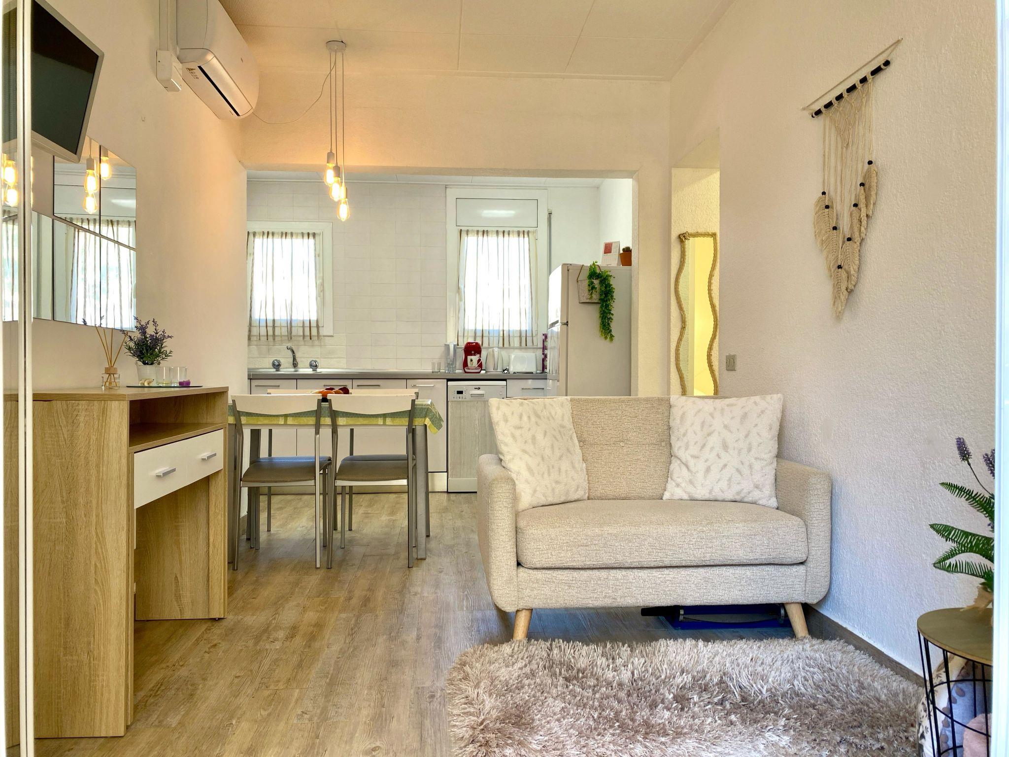 "Aquarius", 3-room apartment 58 m2 on 1st floor. Bright, partly renovated in 2025, very comfortable and cosy furnishings: living/dining room with dining nook, kitchen corner, digital TV and air conditioning. Exit to the balcony. 1 double bedroom with 1 french bed (140 cm, length 190 cm), fan. 1 double bedroom with 2 beds (90 cm, length 190 cm), fan. Kitchen (2 hot plates, dishwasher, microwave, freezer). Bath/WC. No heating option. Small terrace 10 m2. Balcony furniture. View of the garden and the resort. Facilities: washing machine, iron, hair dryer. Internet (WiFi, free). Parking space n 41 (5 minuts) (roofed) at 500 m. Please note: suitable for families. TV only ES. No lift. HUTG-001729 // Reg. Nr.: ESFCTU00001702100043269100000000000000000HUTG-0017292