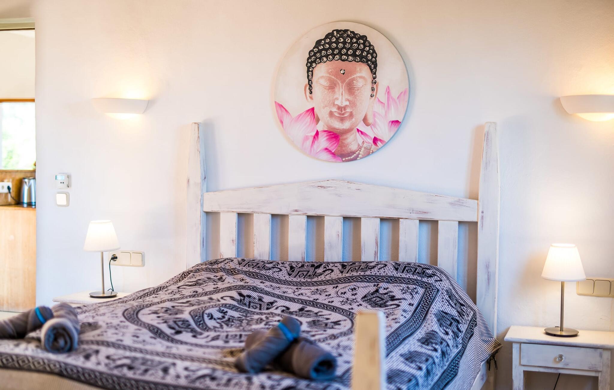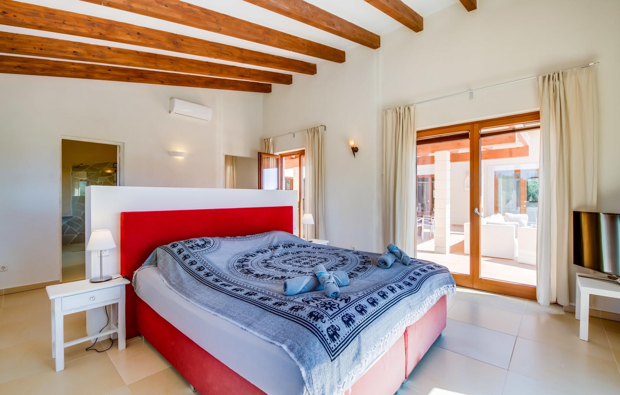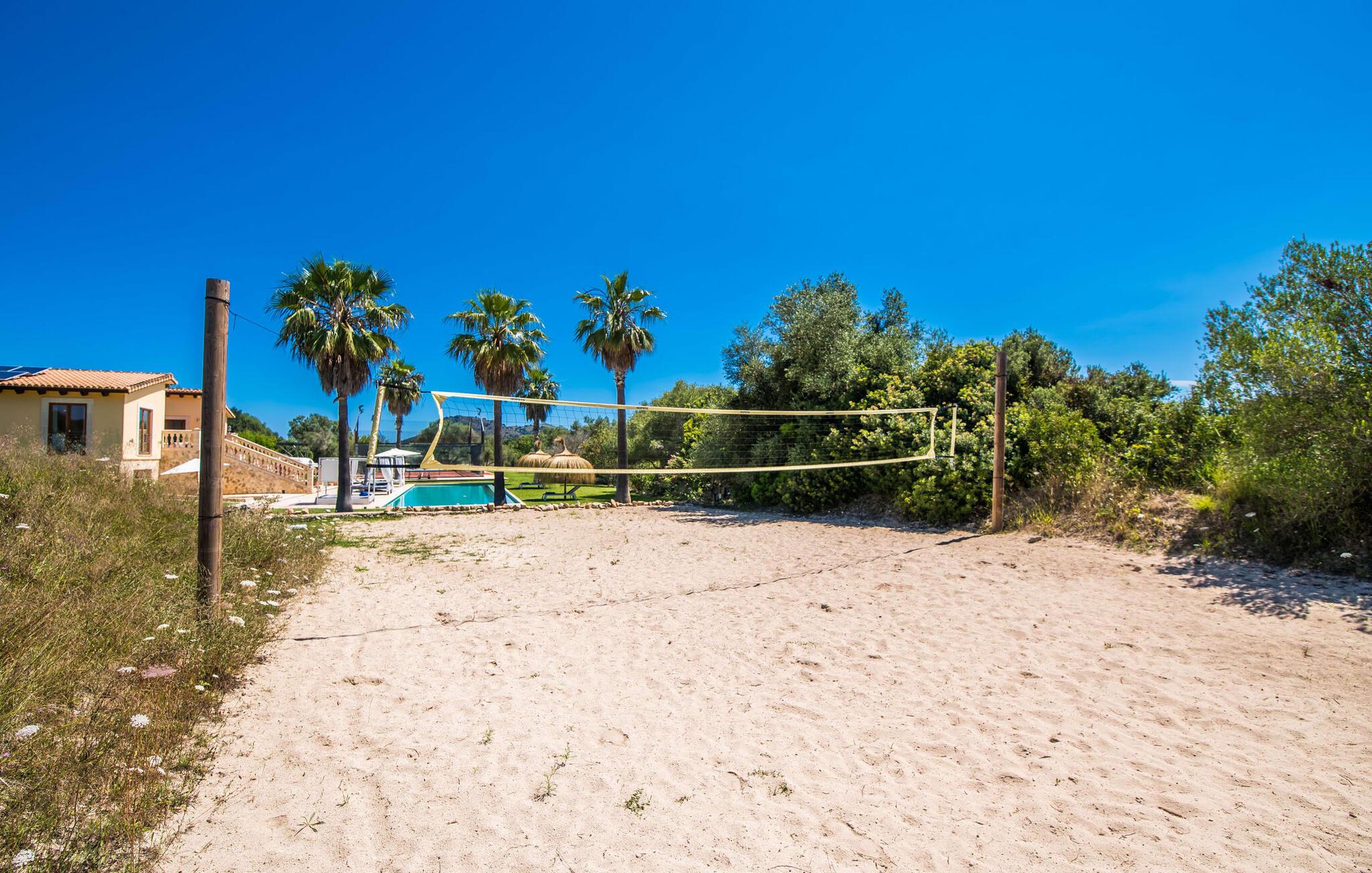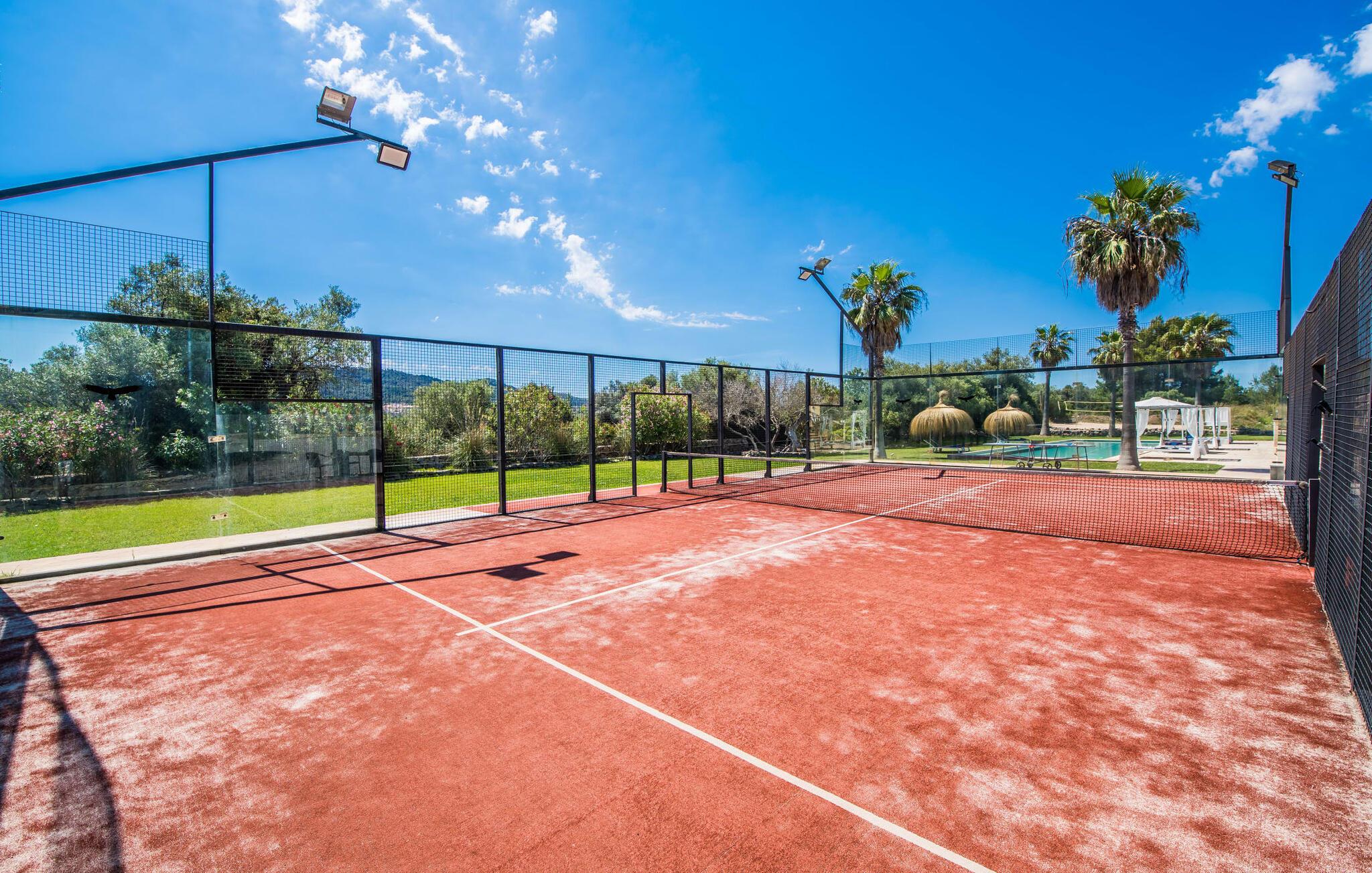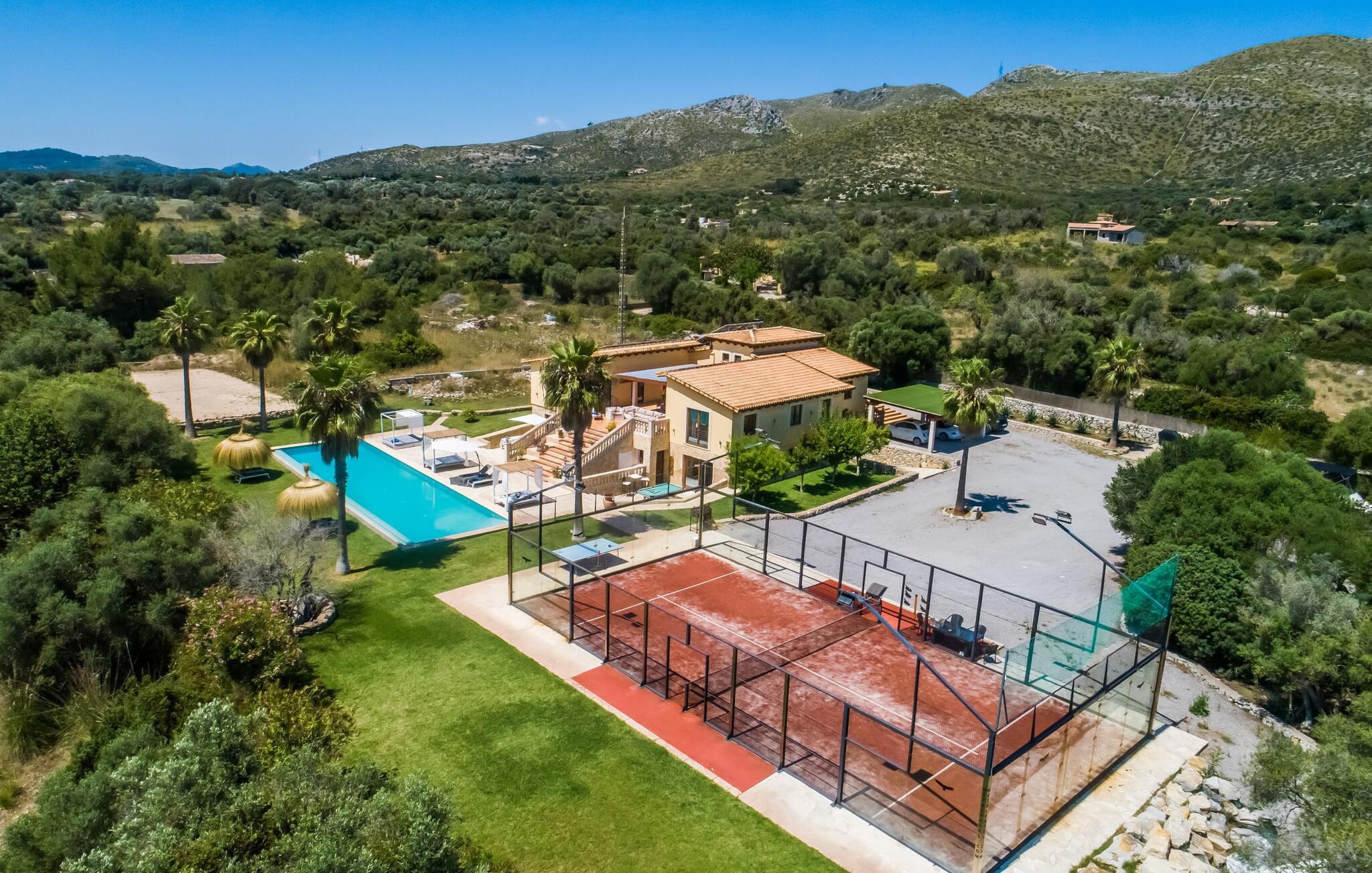 Nej, denne bondegård på Mallorca er ikke almindelig. Ikke let. Ikke trivielt. Det er en allrounder. Ikke alene er dens overdådighed utroligt fortryllende, men den er også lidt af en konflikt, for her ved man simpelthen ikke, hvor man skal starte med en præsentation, der passer til ejendommens kvalitet. Lad os starte med det fantastiske ydre af dette drømmende hjem, malerisk indlejret i de grønne bakker mellem Cala Ratjada og Cala Mesquida. Husets originale udformning dikterer terrassearrangementet, som passer særligt harmonisk ind i både bygningen og udearealet. En slags gårdhave, for det meste overdækket, er forhøjet på 1. sal og rummer både et stort spisebord og en grill samt et super lækkert loungeområde med en enestående udsigt til haven, især den kæmpe pool beklædt med græsplæner og palmer. som kan nås via en imponerende bred trappe. Komfortable liggestole og balinesiske senge sikrer, at timerne udendørs er ren fornøjelse. Lyder det hele ekstremt praktisk? Men det er ikke alt! Som I kan se på billederne, er der en volleyballbane og en padelbane (sidstnævnte med projektører!) - holdsport er meget vigtigt her. Et poolbord og et bordtennisbord afrunder det omfattende udvalg af udendørs aktiviteter, der er tilgængelige sammen. Nu tror I måske, at denne bolig allerede har brugt alt sit krudt på udendørsområdet - men det er langt fra tilfældet! En rummelig stue/spisestue med tilhørende åbent køkken er placeret direkte på den øverste terrasse og indbyder til hyggestunder indendørs. Uanset om I slapper af i sofaen, sidder sammen ved bordet eller hakker ingredienser til en solid middag i det veludstyrede køkken: fællesskabet er meget vigtigt her. De delvist gulv-til-loft vinduer og den åbne arkitektur med generøs rumhøjde og synlige træbjælker, i kombination med stilfulde møbler af høj kvalitet, naturstenselementer og harmoniske farvetoner, skaber en æstetisk alsidig boligstemning. Særligt smagfulde soveværelser er spredt ud over stueetagen og de øverste etager, hvoraf nogle kun er tilgængelige eller tilgængelige udefra, så enhver gæst kan nyde et særligt niveau af privatliv, hvilket yderligere understreges af den rummelige stue, og hvoraf nogle har deres egne terrasser. I alt seks badeværelser giver maksimal komfort, selv når huset er fyldt. Et enormt yoga- eller konferenceområde på øverste etage udvider underholdnings- og sportsudbuddet i dette enestående feriehus på Mallorca. Vi giver "Drømmegården Son Terrassa" vores uforbeholdne anbefaling, især for dem, der ønsker at komme til øen med en sportsorienteret feriefamilie eller gruppe. Placeringen er også perfekt til bryllupper, fødselsdage, seminarer, firma- og forretningsarrangementer. Mellem Cala Ratjada og Cala Mesquida ligger "drømmegården Son Terrassa", som scorer med sine absolut fremragende indendørs og udendørs arealer. Både sporty og afslapningssøgende gæster vil få noget for pengene på dette særlige, vidunderligt idylliske og rolige sted. Capdepera med sit gode udvalg af supermarkeder, restauranter osv. ligger kun få kilometer væk, ligesom forskellige smukke strande som Platja Son Moll, Cala Agulla eller Cala Mesquida.