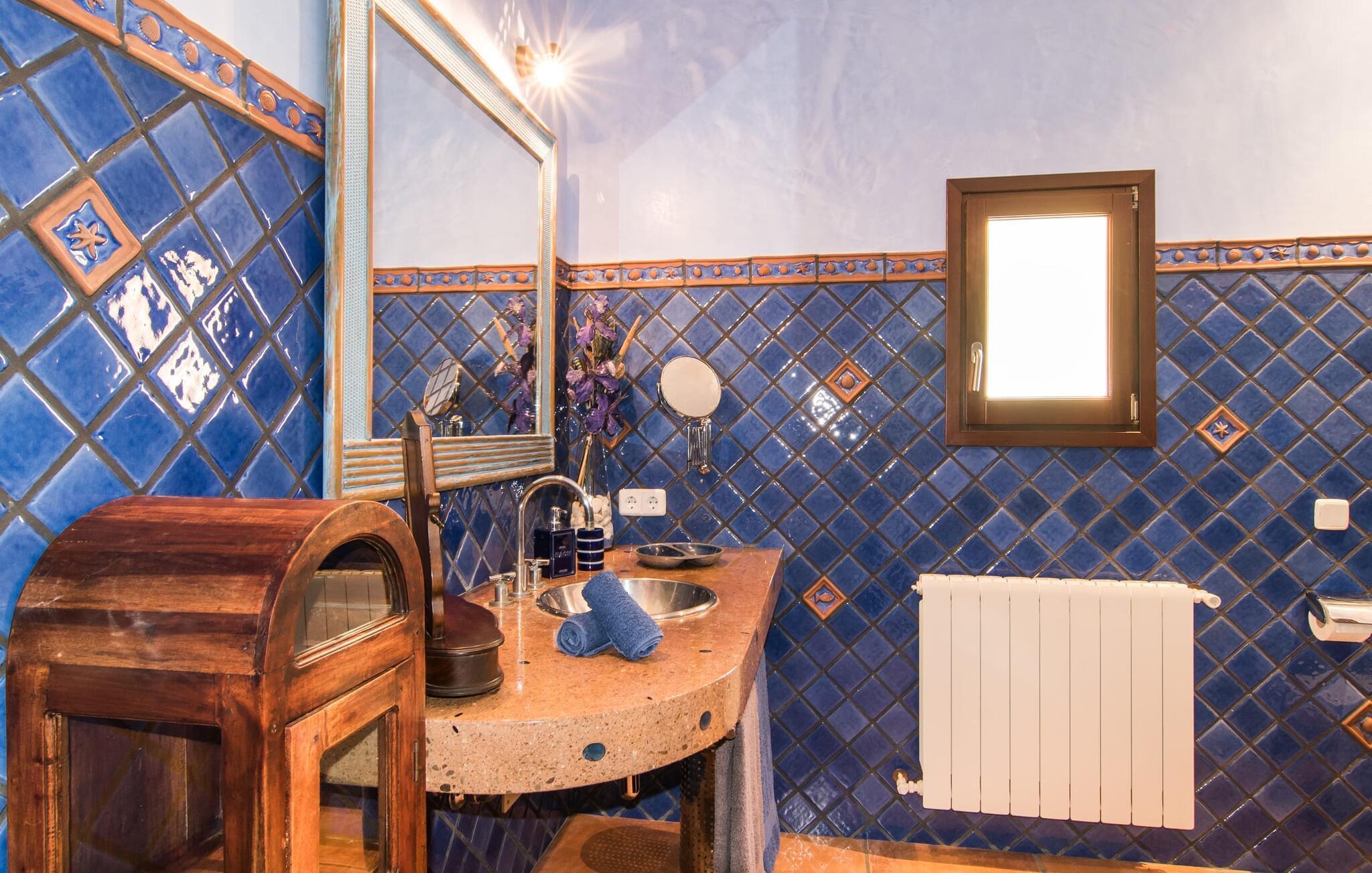 Den smukke finca "Turonet", beliggende på østsiden af øen, tilbyder dig det perfekte hjem til en ferie med venner eller familie. Det ligger på en 16.000 m² stor grund med en smuk have ved siden af huset. Med næsten 400 m² byder dette imponerende hus på plads til op til 10 personer. Både den bekvemme beliggenhed og den rolige beliggenhed gør denne ejendom til det perfekte udgangspunkt for en afslappende og om ønsket afvekslende ferie. Der er en stor, delvist overdækket terrasse foran huset, som giver tiltrængt skygge om sommeren. Foran den er der en utrolig 15 m pool, der indbyder til at spille mange omgange i den. Den har en behagelig trinindgang. Det er sensationelt at iagttage uendelighedseffekten, der breder sig fra kulissen til landskabet, der ligger for dine fødder. Da udsynet herfra ikke er spærret af et hegn, mur eller andre genstande, er følelsen af frihed virkelig imponerende. Der er komfortable liggestole på poolterrassen til at slappe af i den lyse middelhavssol. Børn vil helt sikkert have det sjovt med at lege og løbe rundt på de smukke græsplæner på siden af huset. Her kaster palmerne en naturlig skygge på alle tider af døgnet. Gæsterne sætter pris på de delvise nicher og kærligt beplantede terrassearealer omkring huset. Skulle nogen nogensinde føle behov for at trække sig tilbage, vil der ikke være nogen problemer med at finde et hyggeligt sted. Så snart du træder ind i bygningen, vil du ved første øjekast bemærke indretningen af høj kvalitet. I stuen er der to yderst behagelige sofaer og et satellit-tv. På køligere aftener kan du endda slappe af ved pejsen og varmen fra en ild. Den rustikke naturstensvæg foran i denne stue understreger dygtigt den eksklusive atmosfære. Udvalgte dekorationer og de runde loftsbjælker bidrager også til dette. Det generøst store og meget moderne køkken byder på et rundt spisebord, et rustfrit stål køleskab med fryser, en praktisk ø-enhed og en opvaskemaskine. Der er også en lille disk at sidde på. Værelserne med aircondition er rummelige, udstyret med møbler af høj kvalitet og har et meget elegant design. Fraværet af irriterende rod giver disse rum en lys og elegant atmosfære. Soveværelsets højkvalitetsdesign kommer også til sin ret på badeværelserne. Disse er kendetegnet ved en meget individuel, generøs og bestemt altid original, til tider farverig stil. Manacors centrum ligger kun 10 minutter væk i bil. Besøger du Porto Cristo, som kun ligger 10 km væk, anbefaler vi en gåtur langs promenaden ved siden af havnen og en smagsprøve på den baleariske livsstil. Det populære Calas de Mallorca, øens smukkeste strande, er nemt at nå fra villaen. Rafa Nadal Academy ligger kun 8 minutter væk. Efter en anstrengende dag fuld af aktiviteter kan du nyde lidt fred og ro om aftenen, svømme et par strækninger og måske afslutte aftenen med en kulinarisk grill. Komfort med et fremragende pris-ydelsesforhold venter dig i villaen "Turonet". Villa "Turonet" er et usædvanligt luksuriøst feriehus i landlige omgivelser ved siden af Manacor. Panoramaudsigten, som du kan nyde herfra, er simpelthen fantastisk. Den bekvemme beliggenhed gør, at hverdagens indkøb kan klares hurtigt. Der er et ugentligt marked i Manacor hver mandag. De smukke sandstrande på østkysten, Calas de Mallorca, er let tilgængelige med bil. Dette er et Fincallorca feriehus.