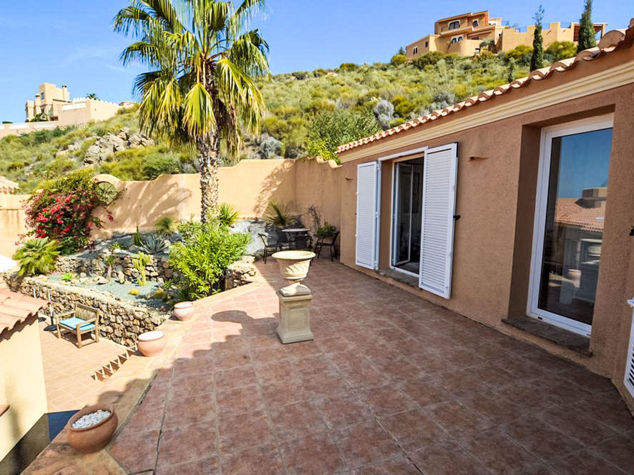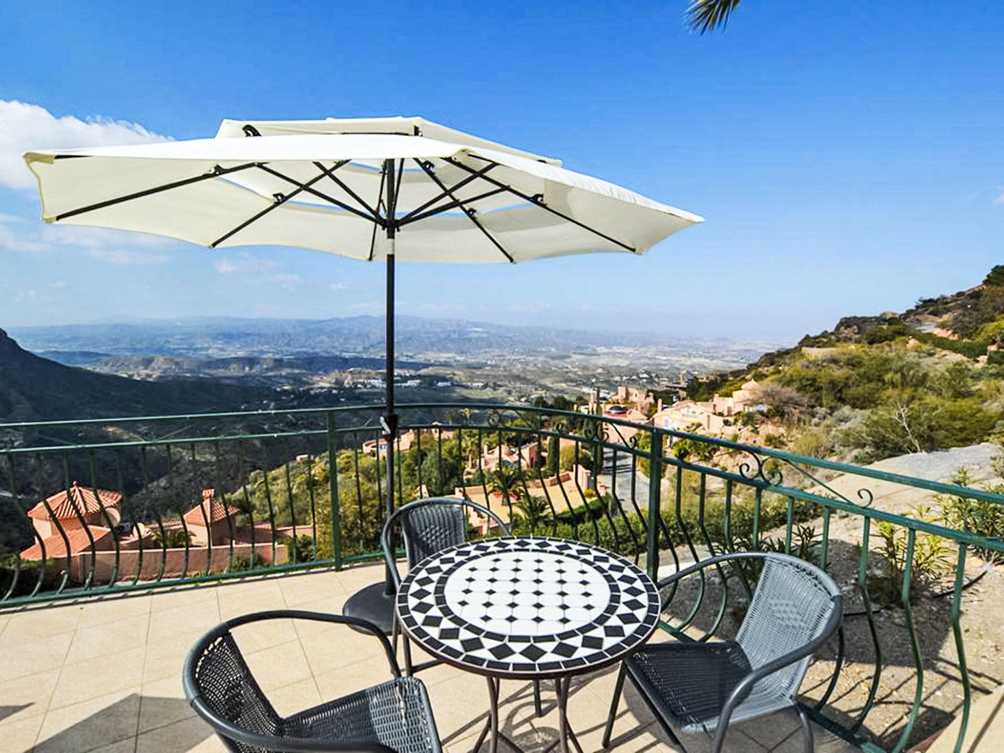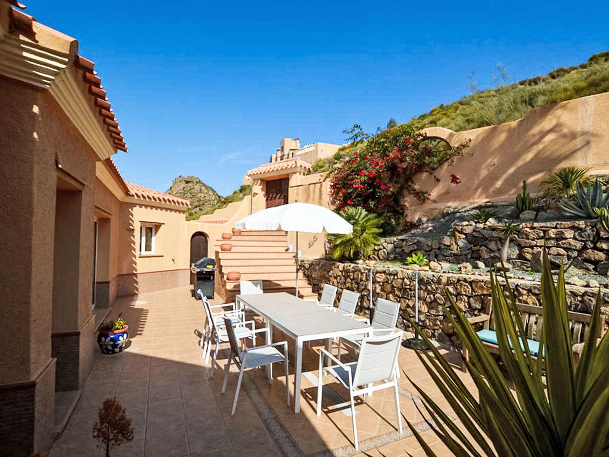 Comfortable villa "Cortijo Cabrera". In the district of Sierra Cabrera, in a secluded, sunny position, 14 km from the sea. Private: property 2'000 m2, terraced garden with flowers, swimming pool (26 m2, seasonal availability: 01.Jan. - 31.Dec.). Outdoor shower, parking (for 4 cars) at the house. Grocery 7 km, supermarket 7 km, restaurant 3 km, bar 3 km, café 3 km, bus stop 7 km. Sports harbour 14 km, golf course (18 hole) 14 km. Nearby attractions: Almería 60 km. Hiking paths: Sierre Cabrera. The owner does not accept any youth groups.