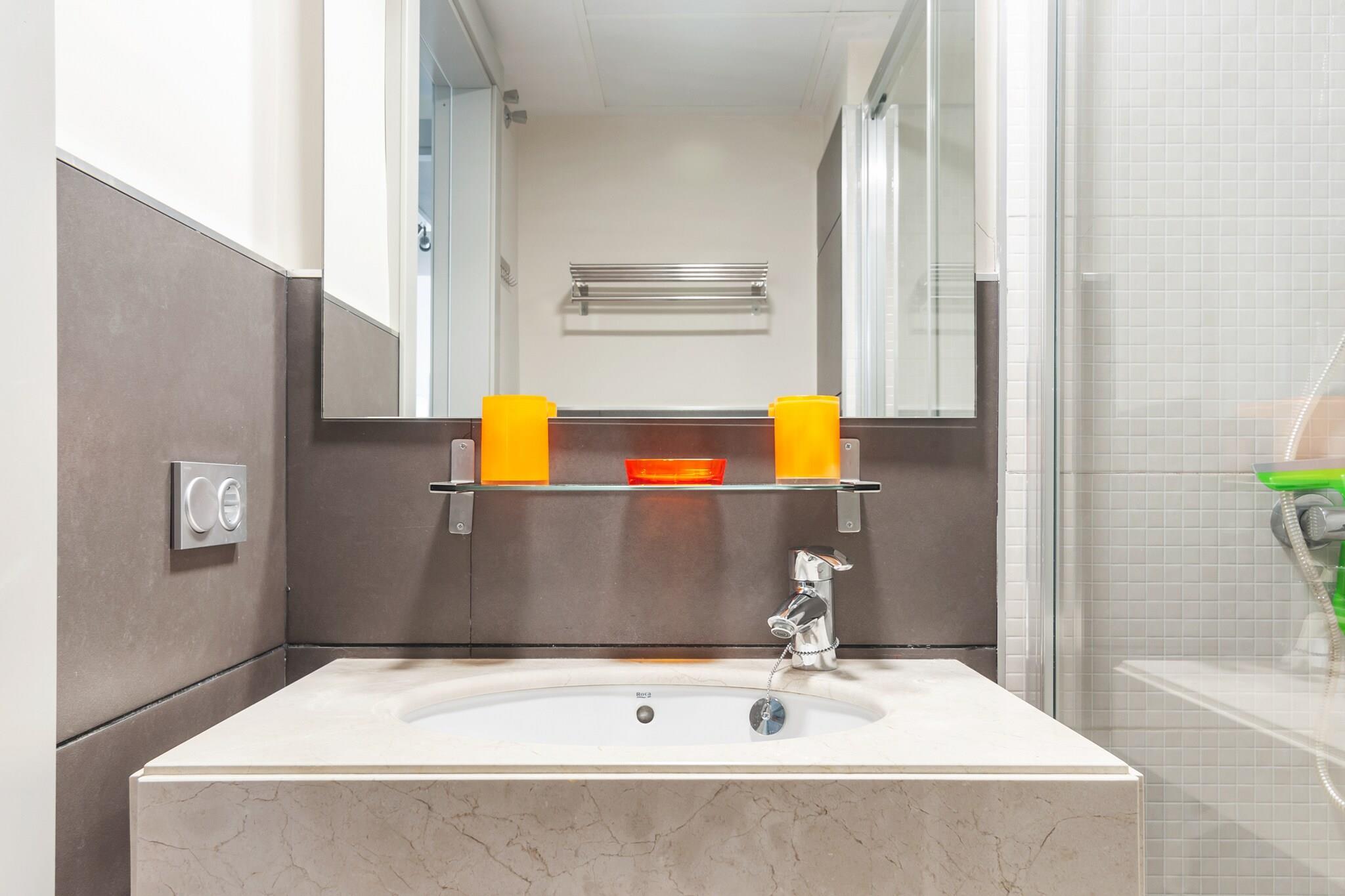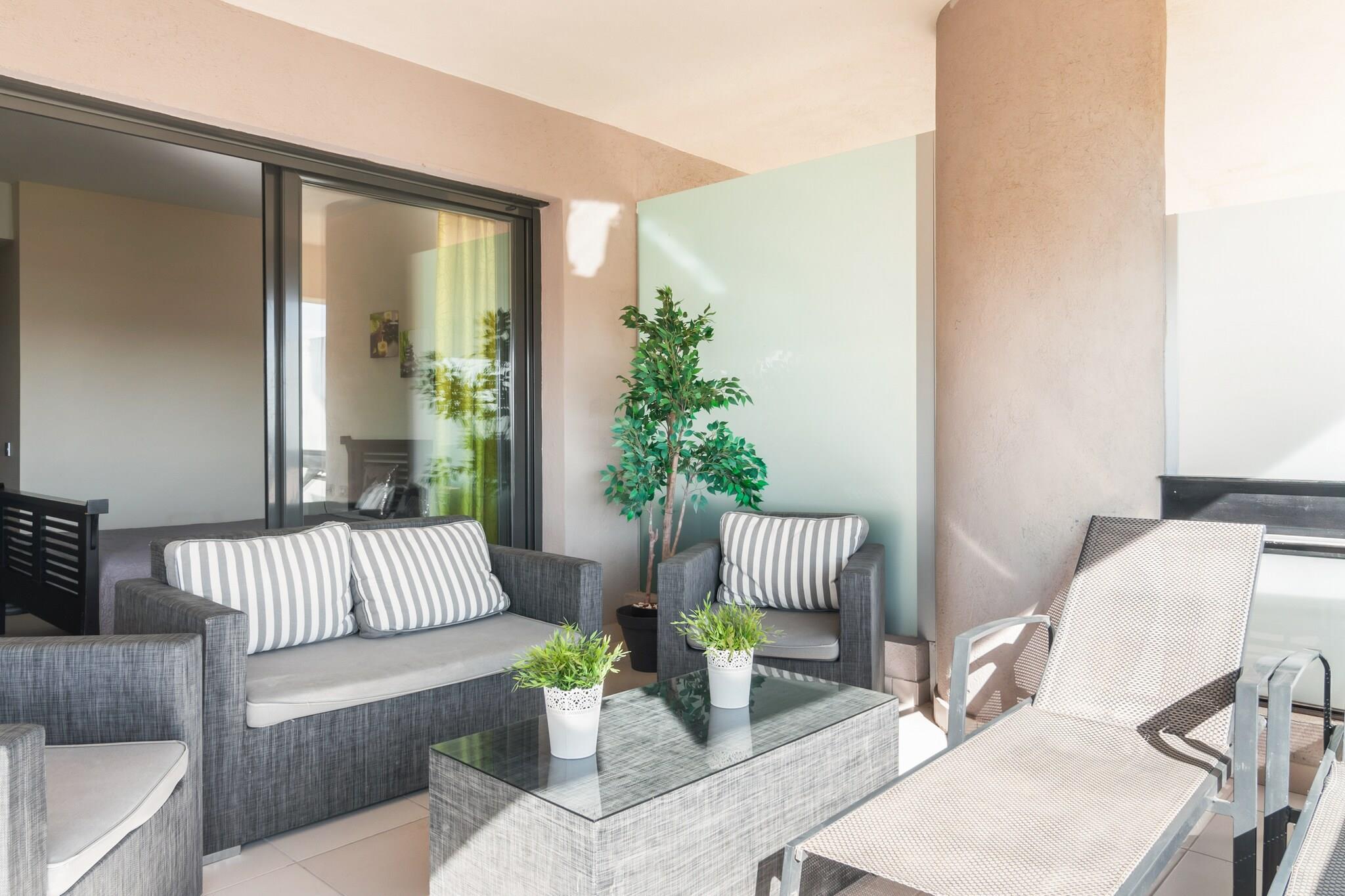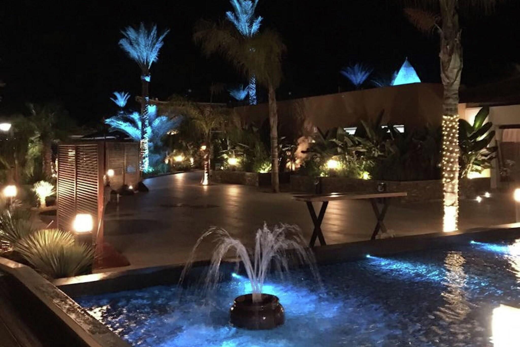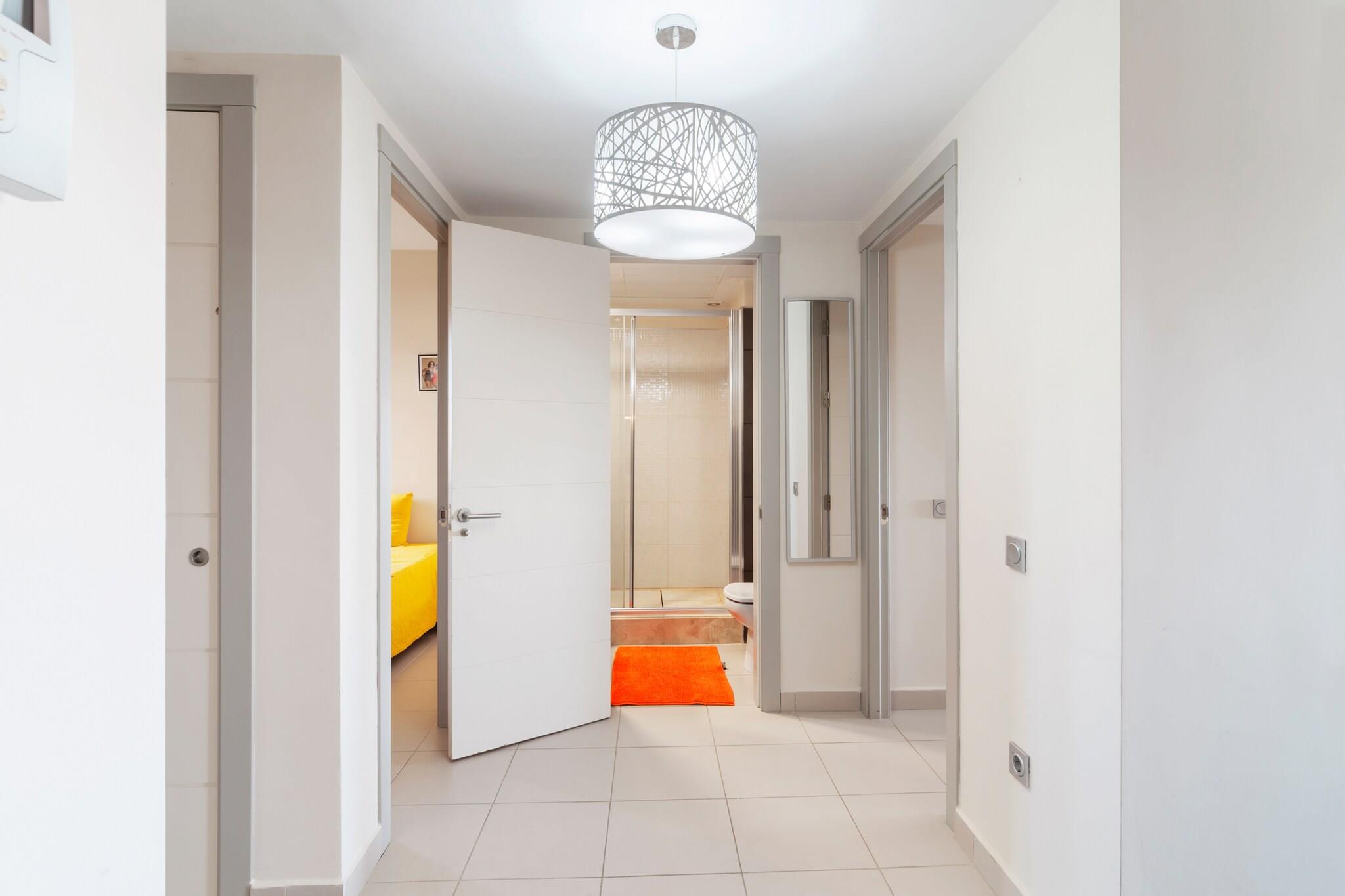Stueetage: (entre, Køkken(komfur(Komfur med tre kogeplader, glaskeramisk), kaffemaskine, ovn, mikrobølgeovn, opvaskemaskine , køle-fryseskab), stue / spisestue(Fjernsyn(fladskærm, digital, Internationale TV-kanaler), spisebord(6 personer), sofahjørne), soveværelse(2x enkeltseng), Soveværelse med badeværelse(dobbeltseng, badekar med bruser, håndvask, toilet), badeværelse(bruser, håndvask, toilet), pulterkammer(vaskemaskine), havedøre, varme(gennem aircondition), klimaanlæg, terrasse(30 m2), havemøbler, liggestole) have(deles med andre gæster), parkering, swimmingpool(deles med andre gæster)