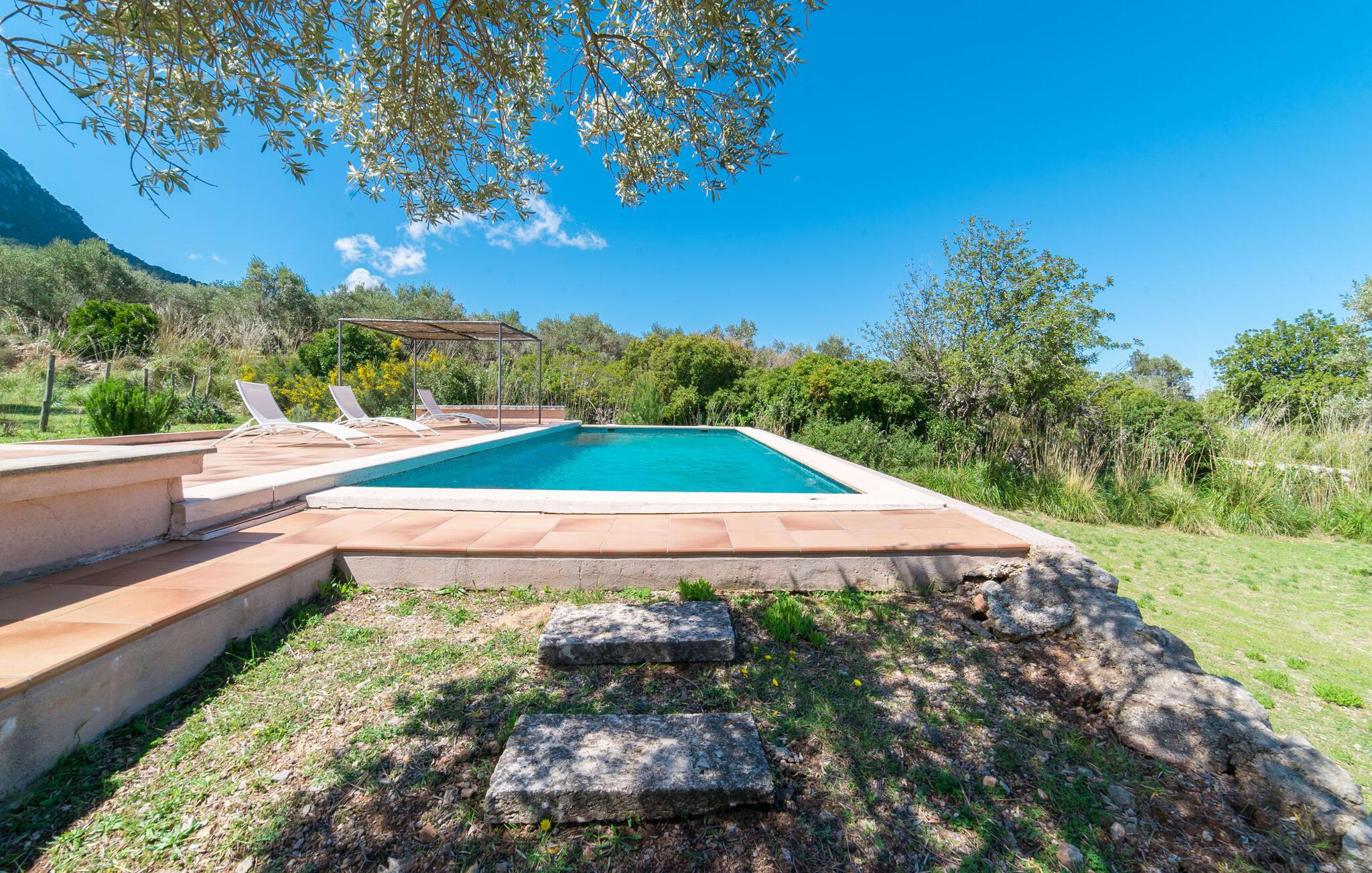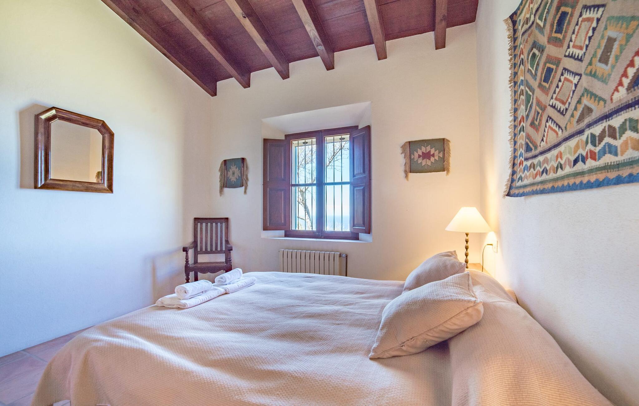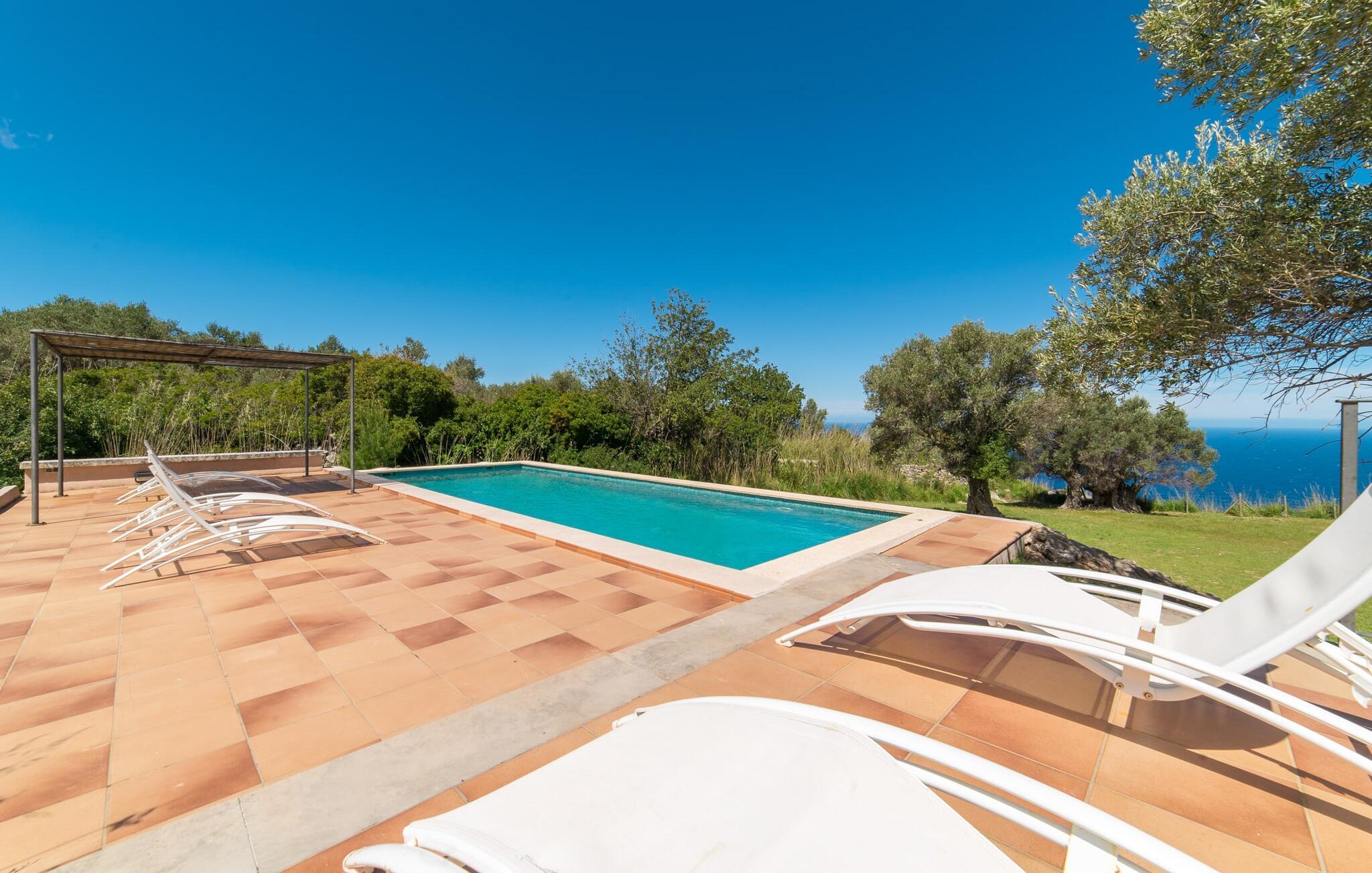 Når I træder ind på Villa Vidals grund, vil I straks fornemme den autentiske atmosfære, der omgiver denne ejendom. Gamle oliventræer hviler op ad huset, som delvist er bygget med natursten, og formidler straks en hyggelig atmosfære. Den rustikke karakter bekræftes, når I går gennem den labyrintlignende villa. Forskellige delvist overdækkede terrasseområder lægger op til at slappe af og nyde den storslåede udsigt. Der er også forskellige komfortable siddepladser og et solidt spisebord, hvor I også kan nyde morgenmaden under åben himmel, hvis I ønsker det. nogle få skridt fra huset, let hævet, ligger en rektangulær pool med en tilstødende, delvist overdækket, flisebelagt terrasse med liggestole. Herfra kan jeres blik feje langt ud over det dybblå hav - eller i en anden retning, til de omkringliggende, imponerende, stort set skovklædte bjerge. Da det ikke er muligt at se ejendommen udefra, kan I bevæge jer helt uforstyrret rundt og nyde den smukkeste tid på året, som I finder det passende.