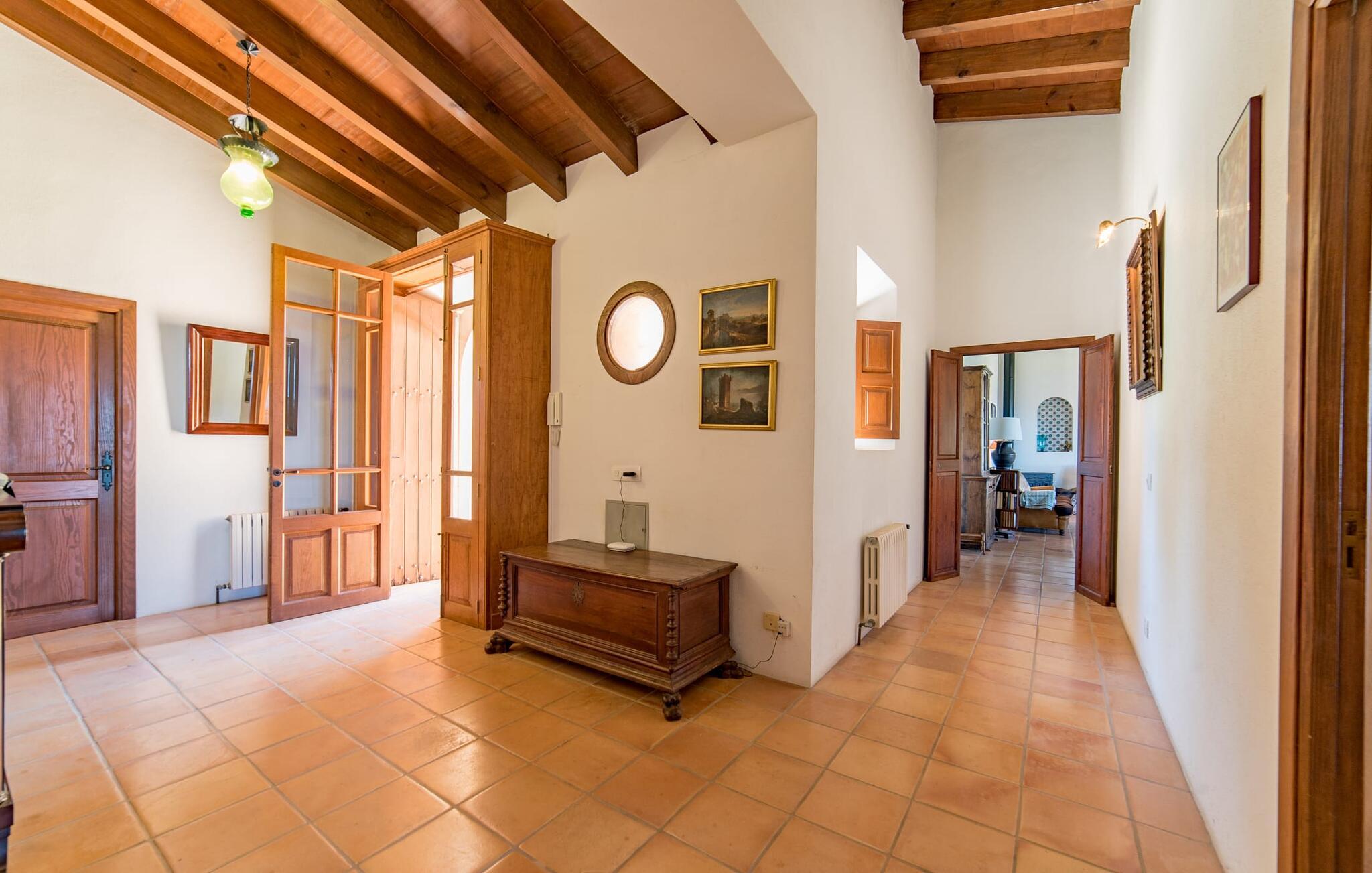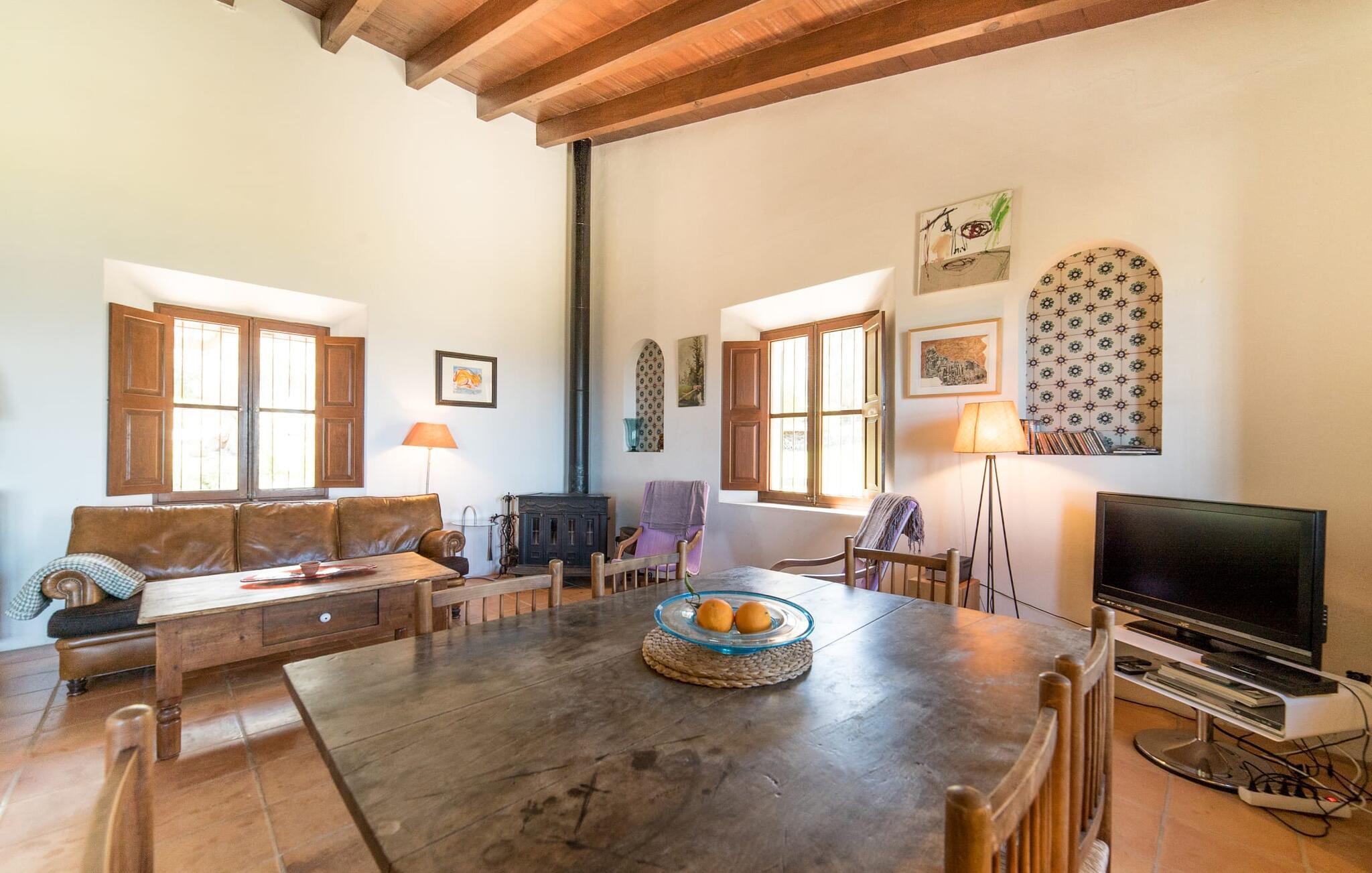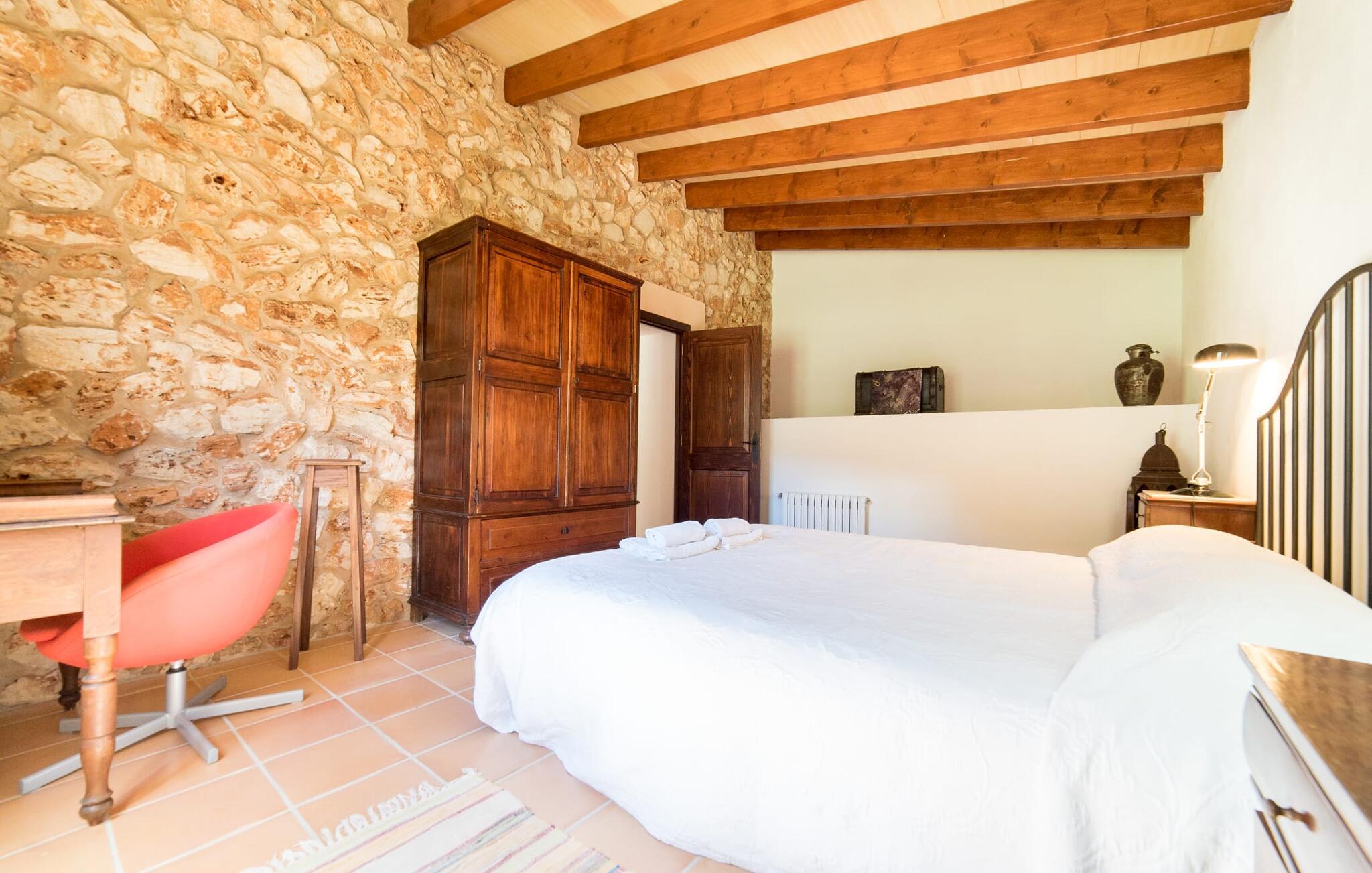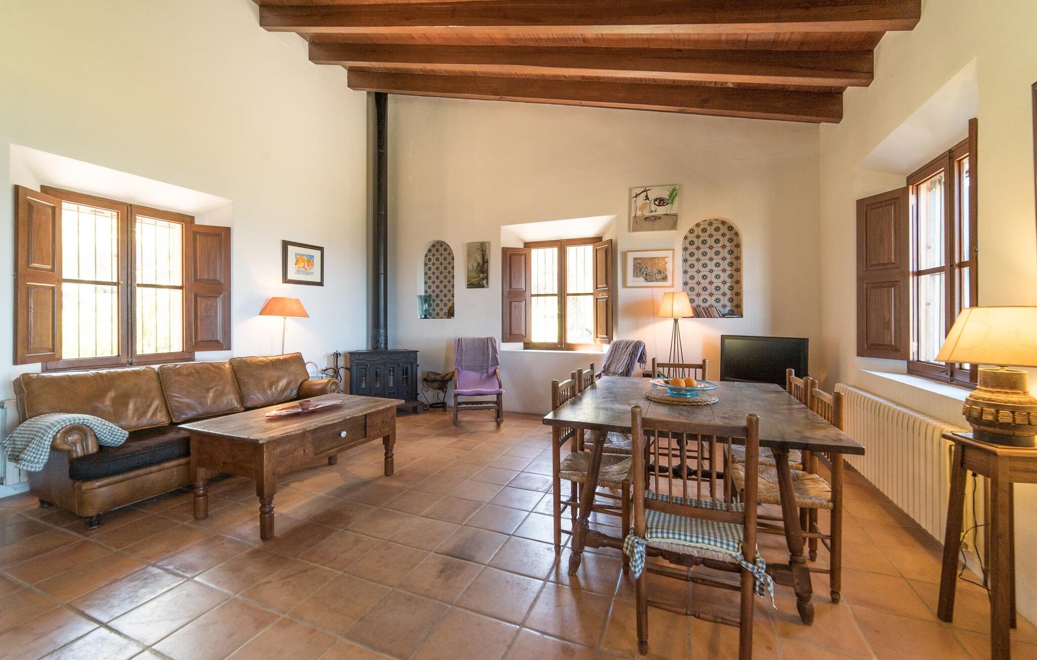Husets interiør er komfortabelt og tilbyder et personligt præg. Møbler af høj kvalitet og stilfulde detaljer venter jer i gangen. Den lyse stue/spisestue med højt til loftet kombinerer smagfuldt funktionalitet med komfort og charme. Den har et tv med dvd- og cd-afspiller, komfortable sofaer, gyngestole og et spisebord. Udvalgte elementer som den klassiske ovn, det elegante sofabord og træklaveret forstærker hyggefaktoren i dette centrale rum. De massive træbjælker i lofterne fuldender den hjemlige atmosfære. Køkkenet er rummeligt og fuldt udstyret. Ud over basale apparater som ovn og keramisk kogeplade er der også en kaffemaskine, elkedel og brødrister. Et særligt træk ved huset er det stemningsfulde, lille bibliotek med bogreoler. De meget smagfulde soveværelser tilbyder en afslappende oase i dette hjørne af verden. I et af de tre soveværelser har sengen udsigt over en naturstensvæg, som er imponerende oplyst og skaber en særlig behagelig effekt. Der er i alt fire senge til rådighed, der måler 0,90 x 1,90 m og en, der måler 1,50 x 1,90 m. Badeværelserne er enkle og funktionelle.
