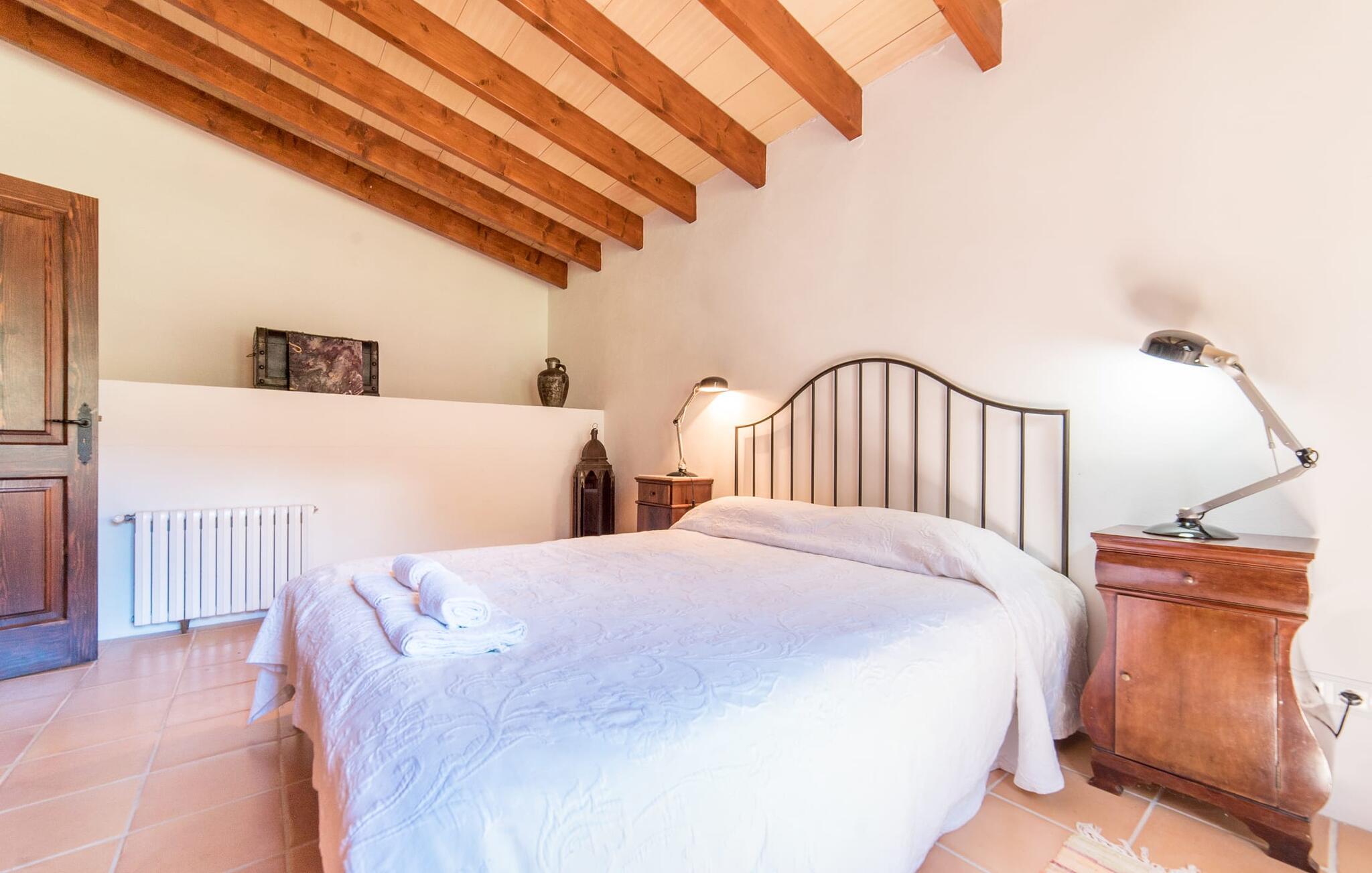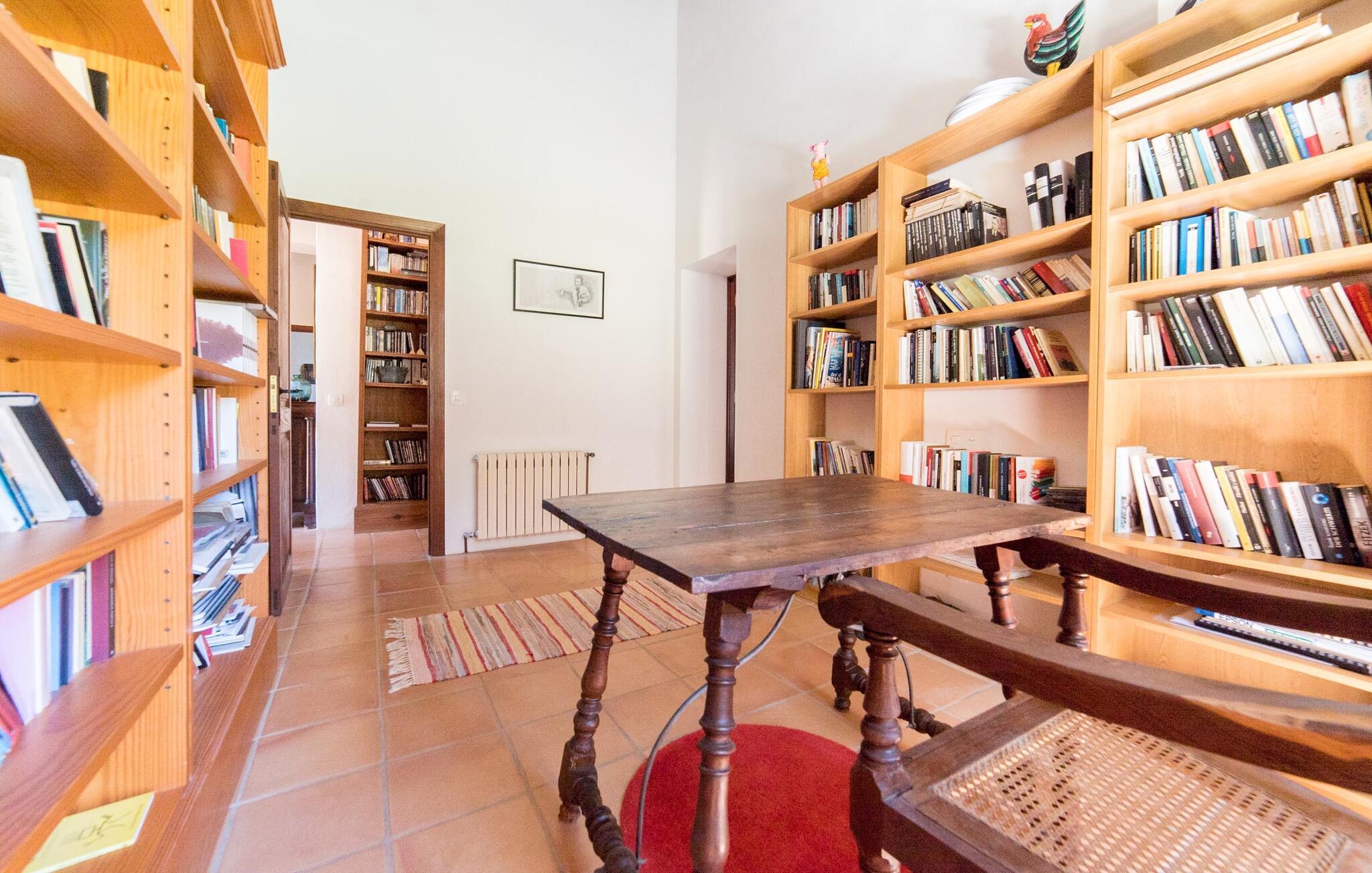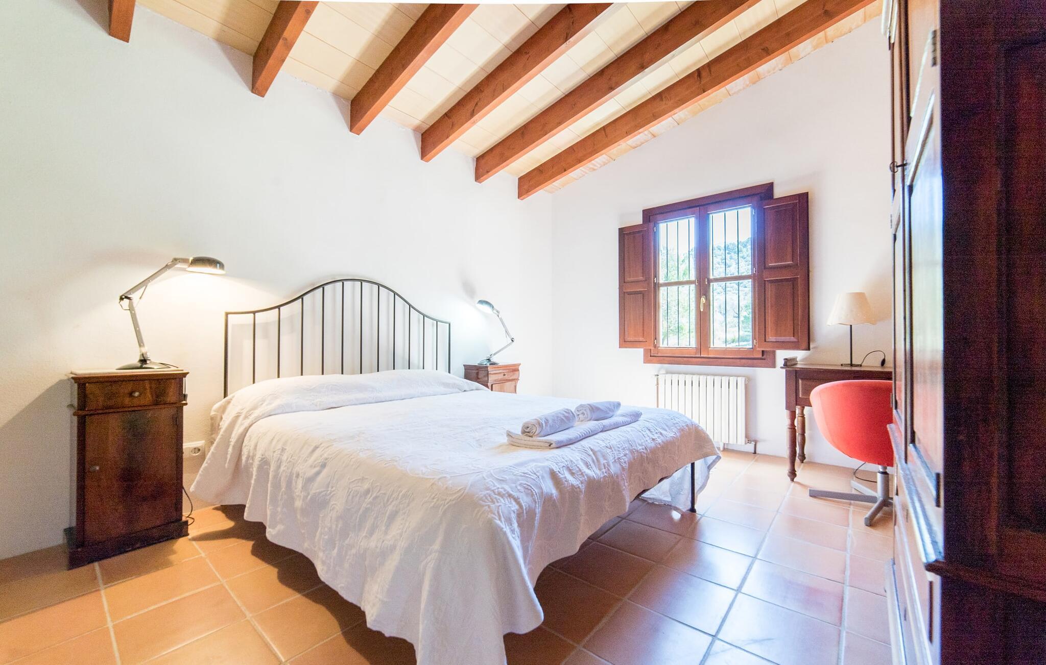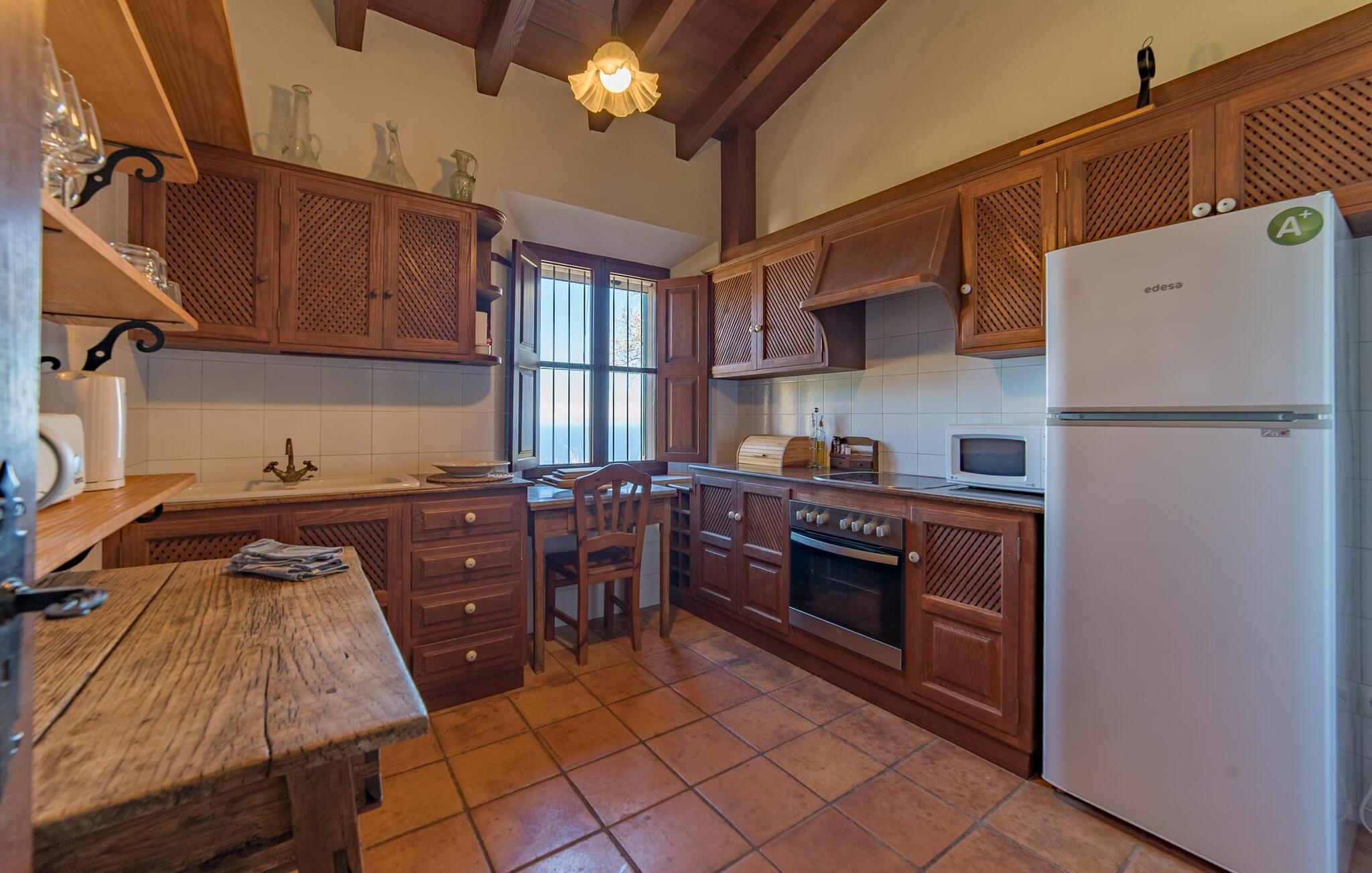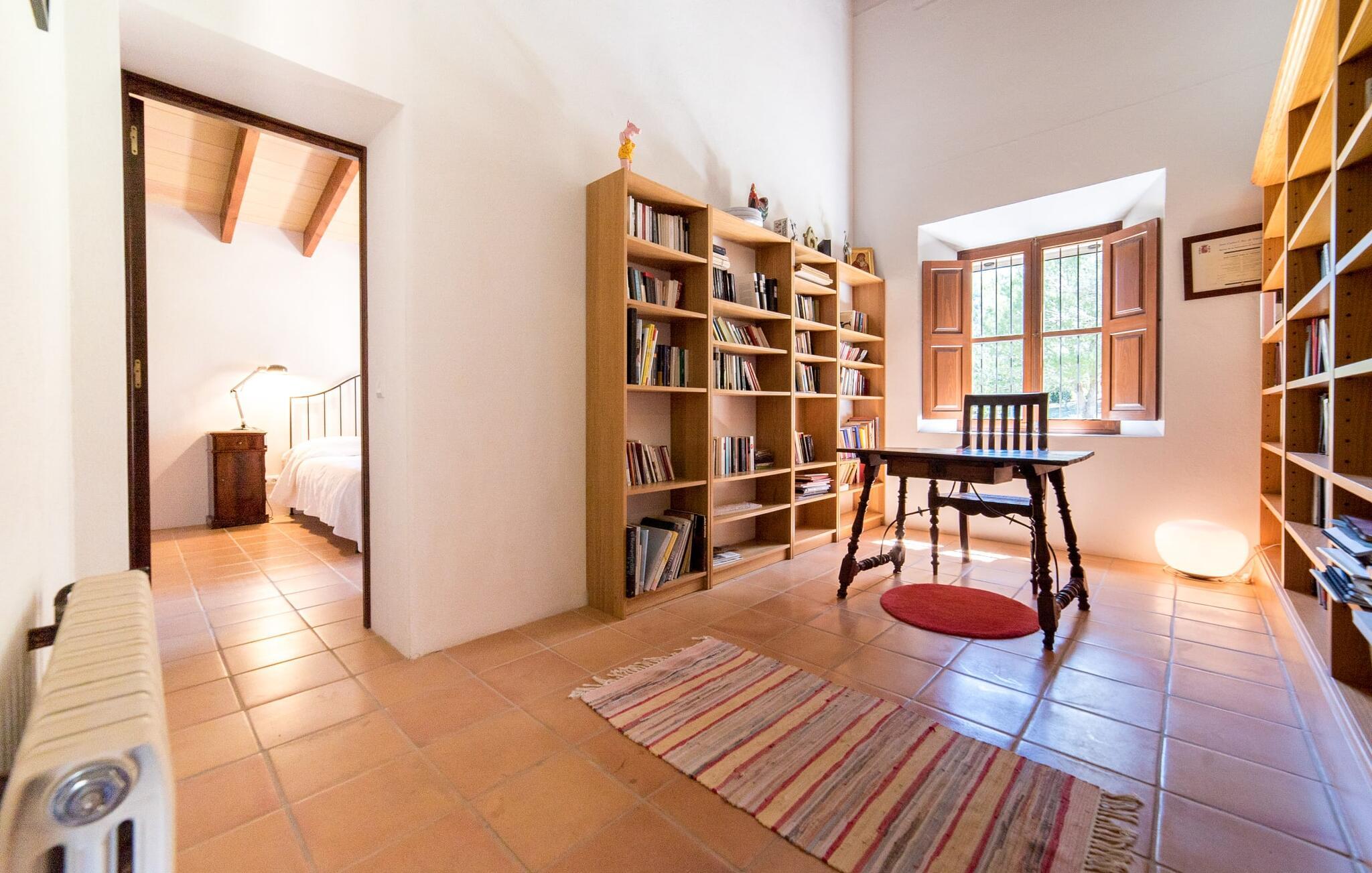 Husets interiør er komfortabelt og tilbyder et personligt præg. Møbler af høj kvalitet og stilfulde detaljer venter jer i gangen. Den lyse stue/spisestue med højt til loftet kombinerer smagfuldt funktionalitet med komfort og charme. Den har et tv med dvd- og cd-afspiller, komfortable sofaer, gyngestole og et spisebord. Udvalgte elementer som den klassiske ovn, det elegante sofabord og træklaveret forstærker hyggefaktoren i dette centrale rum. De massive træbjælker i lofterne fuldender den hjemlige atmosfære. Køkkenet er rummeligt og fuldt udstyret. Ud over basale apparater som ovn og keramisk kogeplade er der også en kaffemaskine, elkedel og brødrister. Et særligt træk ved huset er det stemningsfulde, lille bibliotek med bogreoler. De meget smagfulde soveværelser tilbyder en afslappende oase i dette hjørne af verden. I et af de tre soveværelser har sengen udsigt over en naturstensvæg, som er imponerende oplyst og skaber en særlig behagelig effekt. Der er i alt fire senge til rådighed, der måler 0,90 x 1,90 m og en, der måler 1,50 x 1,90 m. Badeværelserne er enkle og funktionelle.