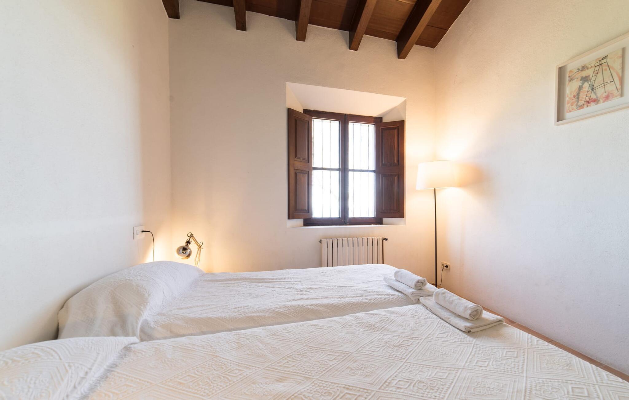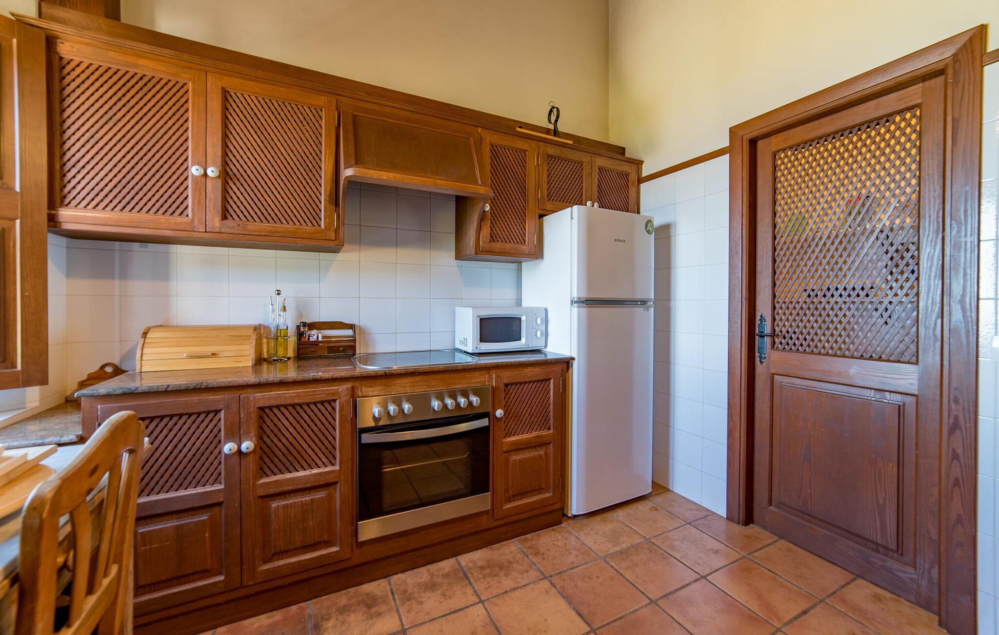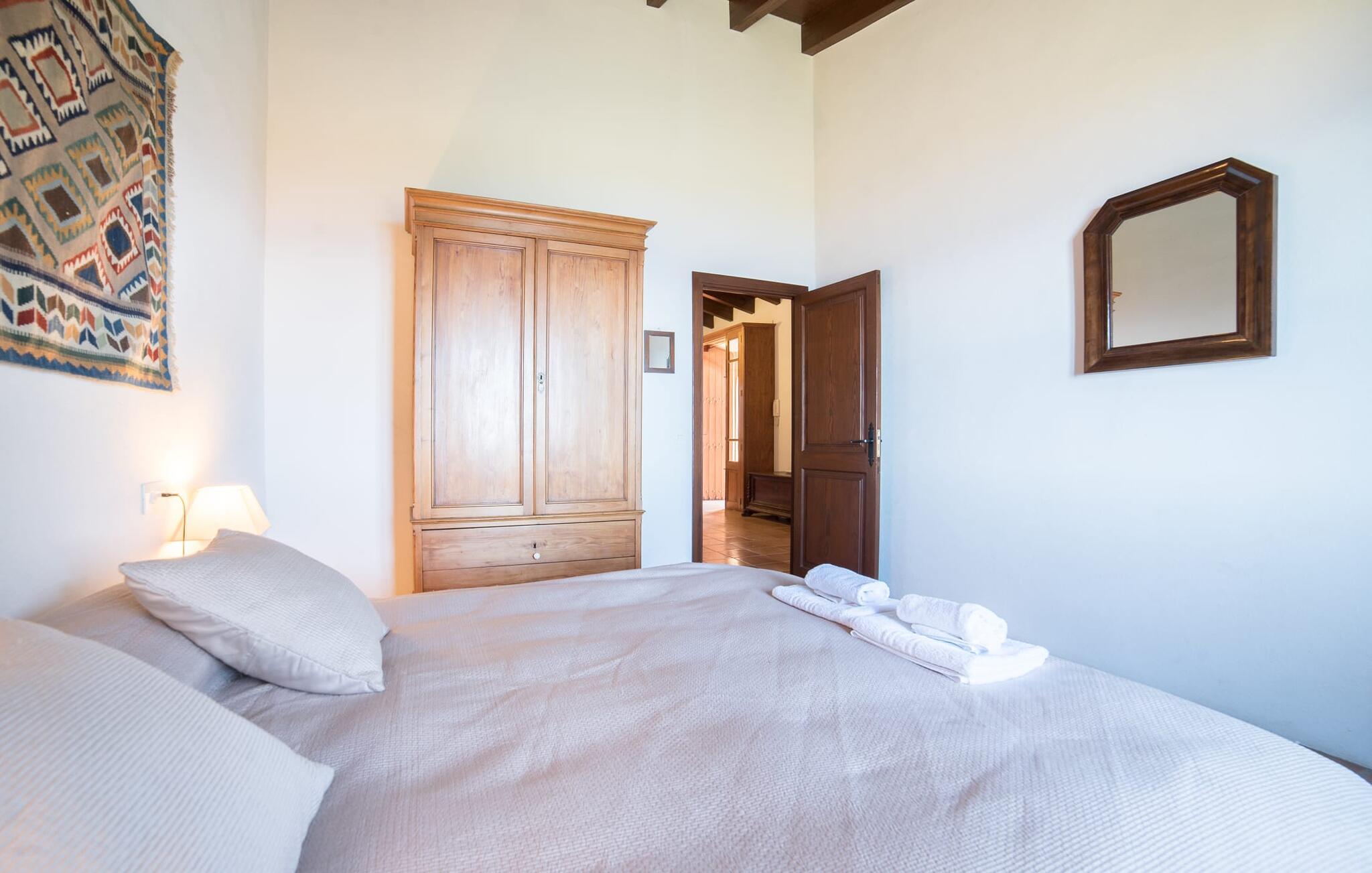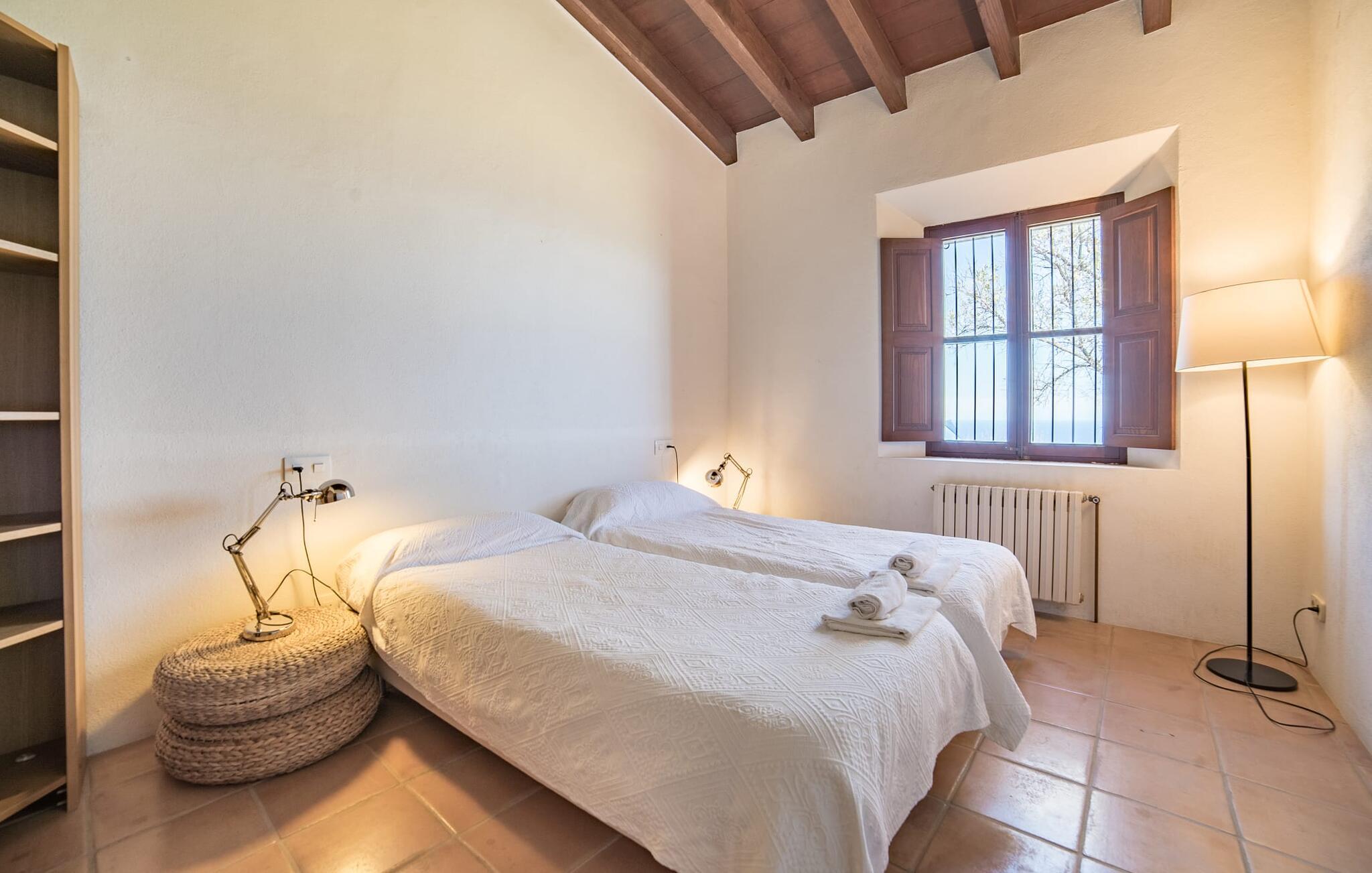 Husets interiør er komfortabelt og tilbyder et personligt præg. Møbler af høj kvalitet og stilfulde detaljer venter jer i gangen. Den lyse stue/spisestue med højt til loftet kombinerer smagfuldt funktionalitet med komfort og charme. Den har et tv med dvd- og cd-afspiller, komfortable sofaer, gyngestole og et spisebord. Udvalgte elementer som den klassiske ovn, det elegante sofabord og træklaveret forstærker hyggefaktoren i dette centrale rum. De massive træbjælker i lofterne fuldender den hjemlige atmosfære. Køkkenet er rummeligt og fuldt udstyret. Ud over basale apparater som ovn og keramisk kogeplade er der også en kaffemaskine, elkedel og brødrister. Et særligt træk ved huset er det stemningsfulde, lille bibliotek med bogreoler. De meget smagfulde soveværelser tilbyder en afslappende oase i dette hjørne af verden. I et af de tre soveværelser har sengen udsigt over en naturstensvæg, som er imponerende oplyst og skaber en særlig behagelig effekt. Der er i alt fire senge til rådighed, der måler 0,90 x 1,90 m og en, der måler 1,50 x 1,90 m. Badeværelserne er enkle og funktionelle.