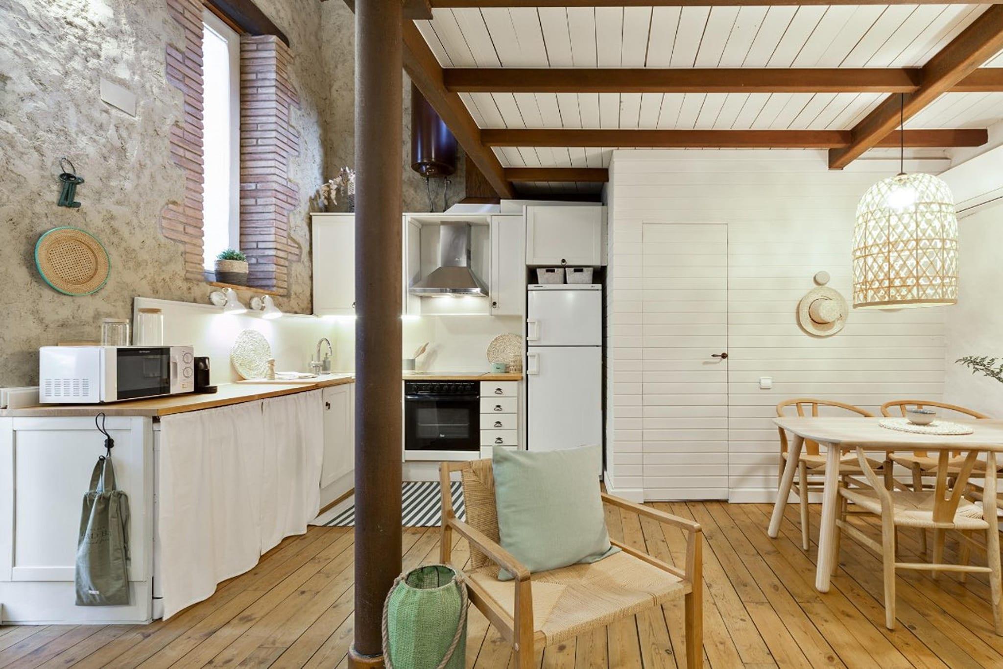 Træd ind i dette charmerende to-etagers hus, der er adgang til via en privat terrasse med et hyggeligt bord og to stole, perfekt til at nyde en morgenkaffe eller aftenafslapning. Dette indbydende hjem strækker sig over cirka 70 m² og har en velindrettet stueetage, der omfatter en hyggelig opholds-/spisestue med en dobbelt sovesofa, et fjernsyn og et spisebord med stole. Det fuldt udstyrede køkken har moderne apparater, herunder en keramisk kogeplade, ovn, mikroovn, opvaskemaskine, vaskemaskine, kaffemaskine og alle de nødvendige redskaber til dine kulinariske behov. Et stilfuldt badeværelse med bruser og friske håndklæder fuldender stueplan. Havstranden ligger 18 km fra stenhuset. Og supermarkederne ligger en kort køretur fra, hvor du kan købe det nødvendige til opholdet. Der er mange andre turistattraktioner, der er et besøg værd. Gå op ad den elegante spiralformede smedejernstrappe til øverste etage, hvor du finder et komfortabelt soveværelse med dobbeltseng og et arbejdsbord under et charmerende mansardtag. Begge etager er udstyret med aircondition for at sikre din komfort året rundt. Dejligt hus kombinerer bekvemmelighed med et strejf af sofistikering og tilbyder et perfekt tilflugtssted for ethvert ophold.