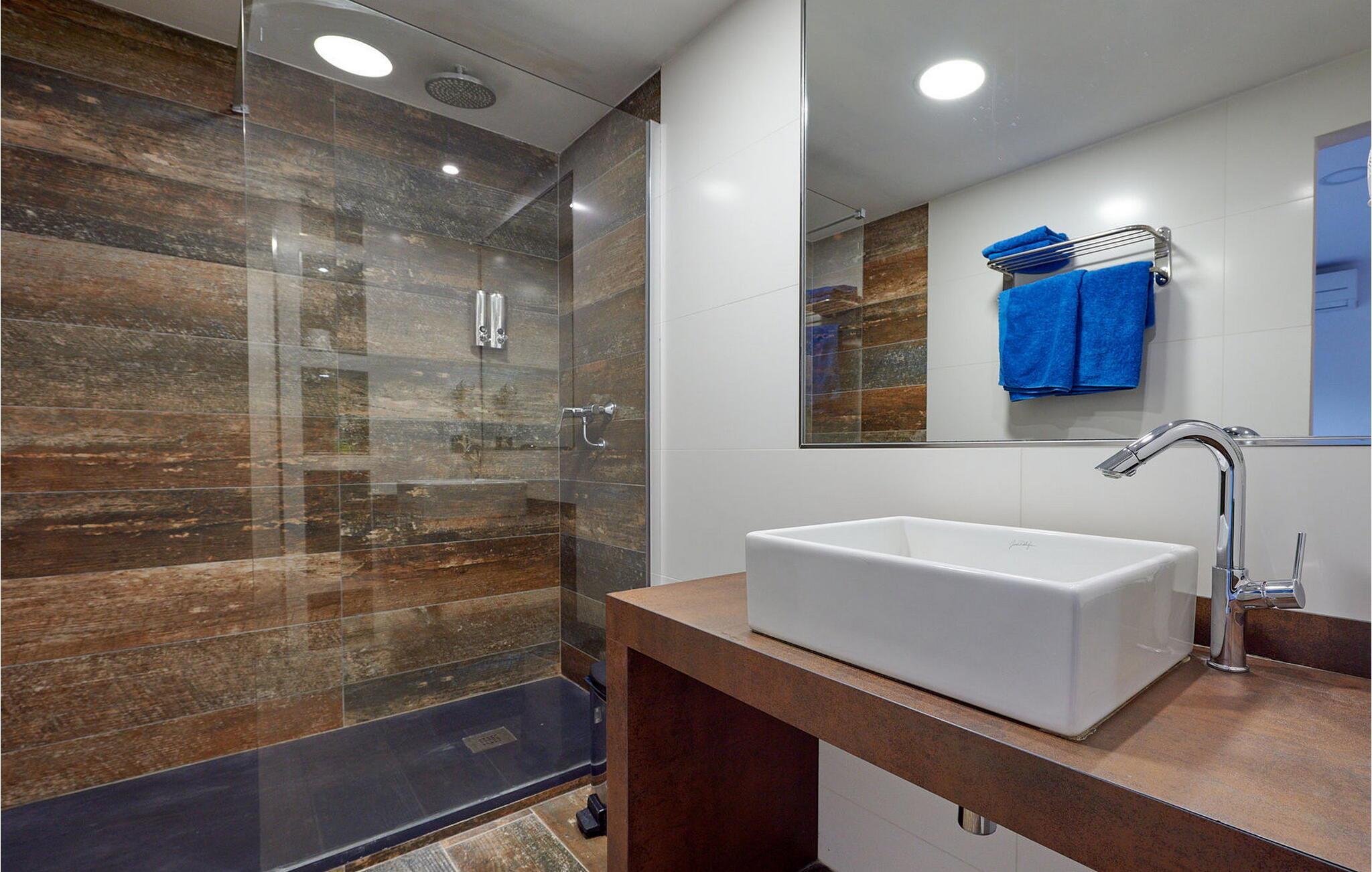 Storslået finca i Ibiza-stil, der dominerer en storslået dal og ligger mellem San Rafael og San Mateo. Dette er et Fincallorca feriehus. Villaen har en stor stue/spisestue i 2 plan med pejs og en stor overdækket terrasse, stort TV og stereoanlæg og et stort fuldt udstyret køkken med spisekammer. Der er 6 soveværelser med dobbeltsenge og 5 badeværelser. 1 master suite med badeværelse med hydromassage bruser og overdækket terrasse, 4 soveværelser med dobbeltsenge. 1 badeværelse med badekar-jacuzzi, 1 badeværelse med hydromassage-bruser, 1 selvstændigt dobbeltværelse med privat badeværelse med badekar, på nederste etage, på have- og poolniveau. Der er kun to værelser med dobbeltsenge (disse senge kan ikke adskilles). Resten er enkeltsenge, der kan sættes sammen som dobbeltseng eller adskilles. Der er tv på alle værelser, aircondition i hele huset og WiFi. Den smukke, fuldt oplyste have har en 13 x 6 m swimmingpool med infinity og farvet belysning. Der er også spabad og udendørs bruser. På samme niveau: overdækket grill/spisestue og badeværelse med bruser. I den anden ende af haven og på et højere niveau er den udendørs spiseplads på en overdækket terrasse med grill, paellaovn og brændeovn. Et stort bord, en bar og et køleskab. Villaen har også en elektrisk port med fjernbetjening og et fitnesscenter. Adgang 200 meter fra gaden. 15 minutter fra Ibiza, 10 minutter fra San Rafael og 7 minutter fra San Antonio. Nærliggende strande: Cala Salada, Punta Galera, Port des Torrent.