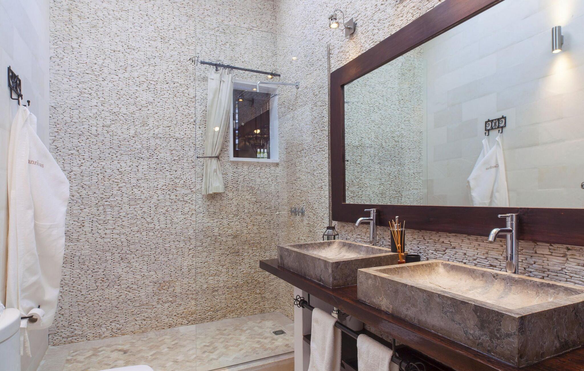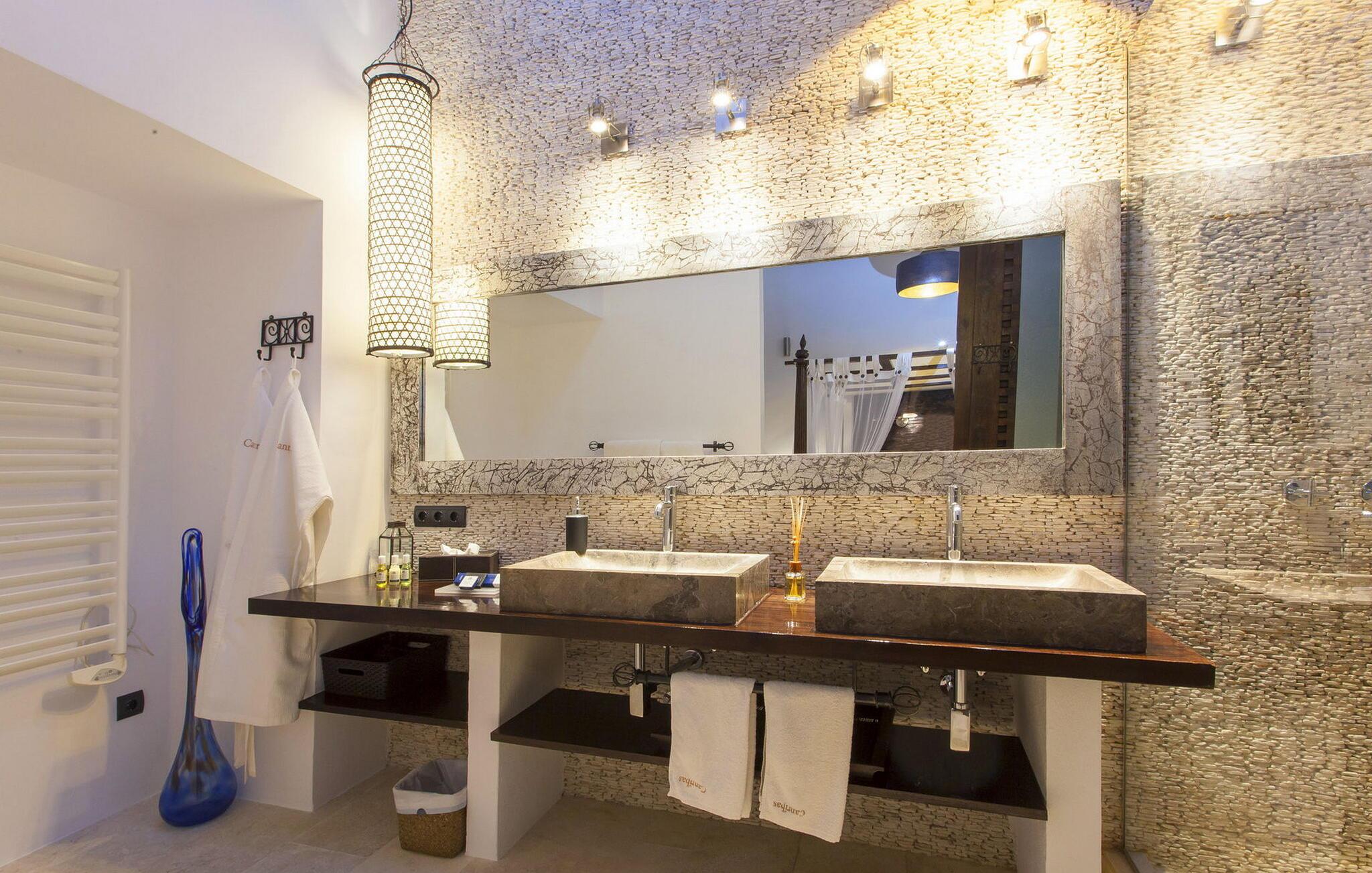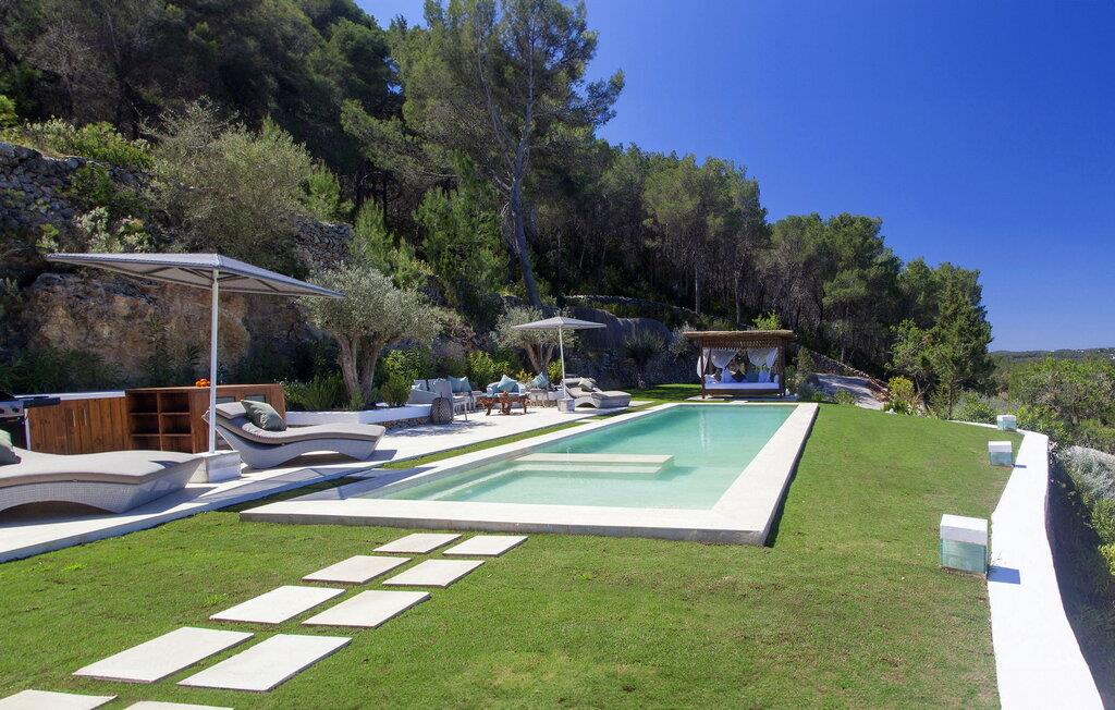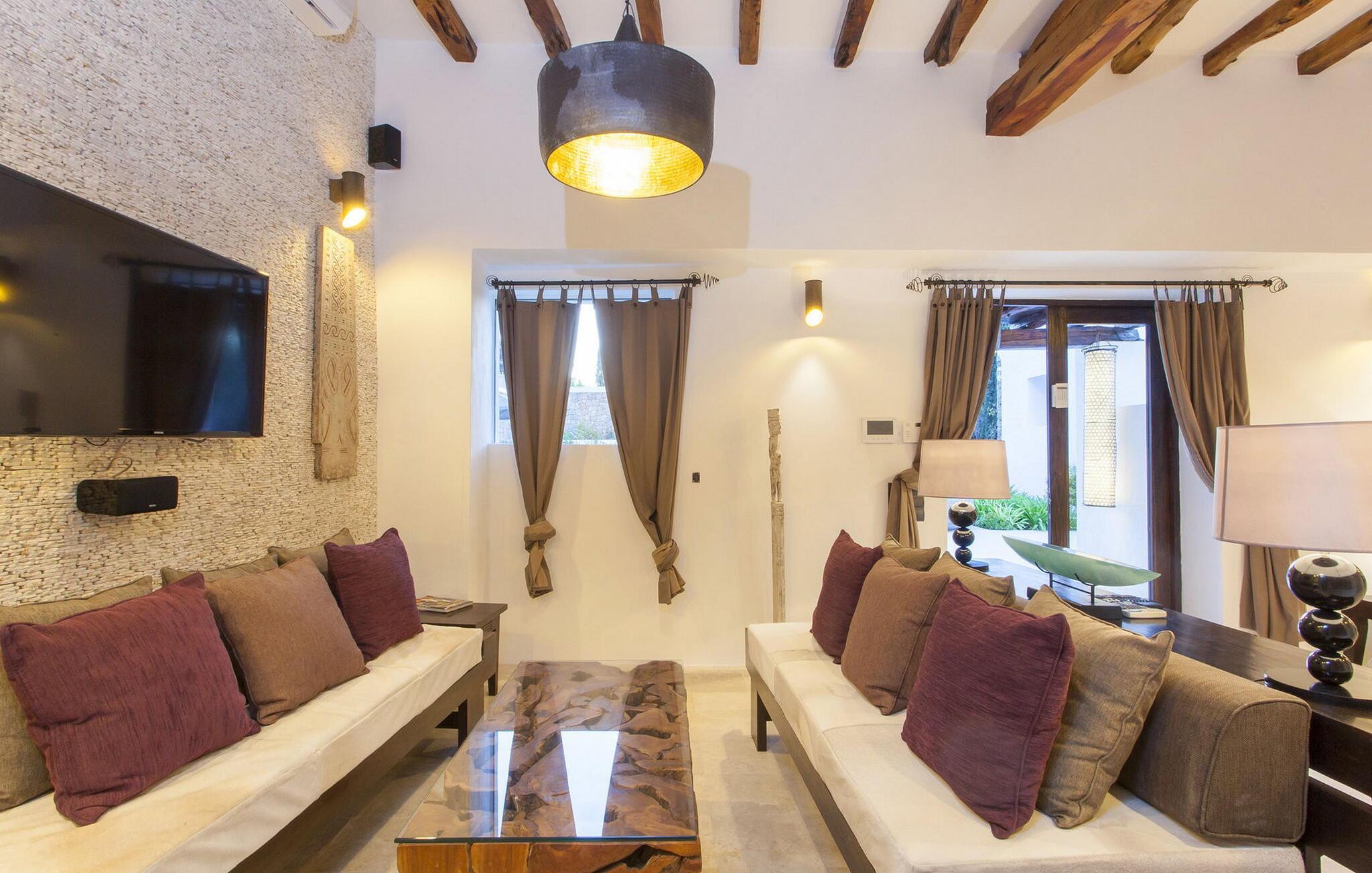Smukt luksushus i Ibiza-stil på 300 m2 på en grund på ca. 17.500m2 i den nordlige del af øen, meget tæt på Agroturismo Atzaró. I et meget roligt og unikt område på Ibiza. Fantastisk panoramaudsigt over Morna-dalen fra poolområdet. Santa Eulalia ligger 10 minutters kørsel derfra. Villaen har 4 soveværelser med dobbeltsenge med eget badeværelse, alle med bruser. Der er aircondition i hele villaen, WiFi og satellit-tv i 2 soveværelser og stuen. Villaen består af: Hovedhus: stue med fuldt udstyret køkken og 2 soveværelser med dobbeltsenge med eget badeværelse. Udhus: I stueetagen er der et soveværelse med dobbeltseng med badeværelse en-suite og en lille terrasse. På øverste etage er der endnu et soveværelse med dobbeltseng med en-suite badeværelse. Der er pengeskab på alle værelser. Villaen byder på omfattende terrasseområder til afslapning med bede, have, dam og vandfald. Det har også en stor parkeringsplads. Minimum ophold 7 nætter. Rengøring: fuldføres hver 7. dag og grundlæggende midlertidig rengøring en gang om ugen.