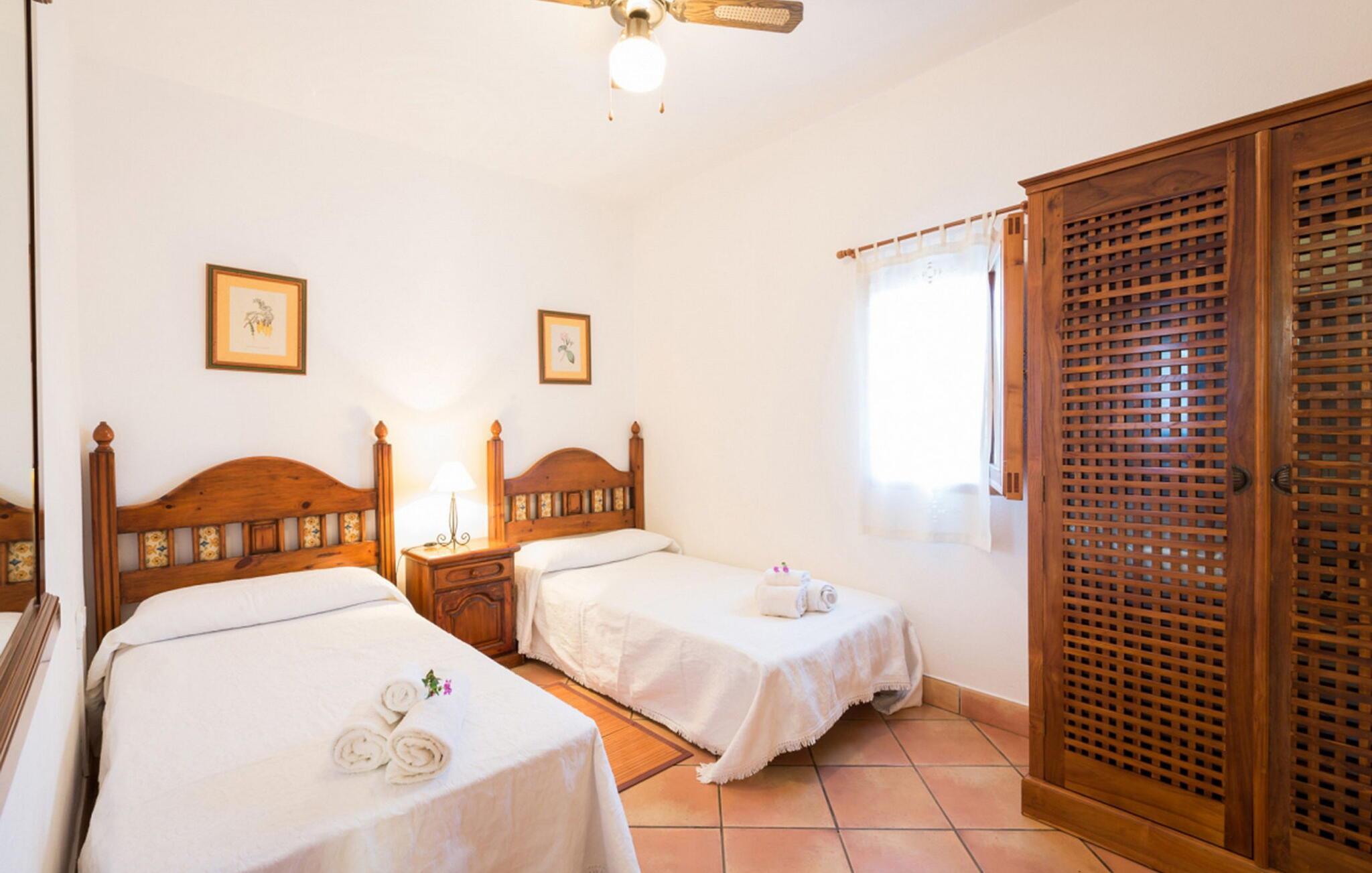 Denne smukke gård, kun 3,5 km fra Santa Eulalia og 4 km fra strandene i Cala Pada, S'Argamassa, Es Canar og Santa Eulalia, ligger i rummelige landlige omgivelser. Ejendommen består af to selvstændige huse, hvilket gør den ideel til grupper eller flere familier. Dette er et Fincallorca feriehus. Det første hus, renoveret i 2006, byder på 4 soveværelser. Der er en charmerende Ibiza-veranda, der fungerer som en stue med satellit-tv og fører til et fuldt udstyret køkken med moderne apparater såsom en opvaskemaskine og en mikrobølgeovn. I stueetagen er der et soveværelse med dobbeltseng med påklædningsværelse og en-suite badeværelse, et andet soveværelse med dobbeltseng med påklædningsværelse og en-suite badeværelse med bruser og et tredje soveværelse med 2 enkeltsenge, der deler et komplet badeværelse. På øverste etage er der soveværelse med dobbeltseng. Det andet hus er en mindre, selvstændig enhed til 5 personer. Det har en rummelig stue med åbent køkken, et soveværelse med dobbeltseng med eget badeværelse, en bryllupssuite, et enkelt soveværelse og et badeværelse med bruser. Udenfor er der flere udendørs opholdsarealer, herunder en veranda med grill ved siden af et århundrede gammelt landsted (afventer renovering), samt et område med indbyggede siddepladser, planter og havemøbler. Poolområdet, der ligger på et højere niveau, har liggestole, en parasol og en 11 x 5,5 meter fælles pool. Ejendommen har også to grillpladser, store udendørsarealer, en multisportsbane og et bordtennisbord til yderligere rekreation.