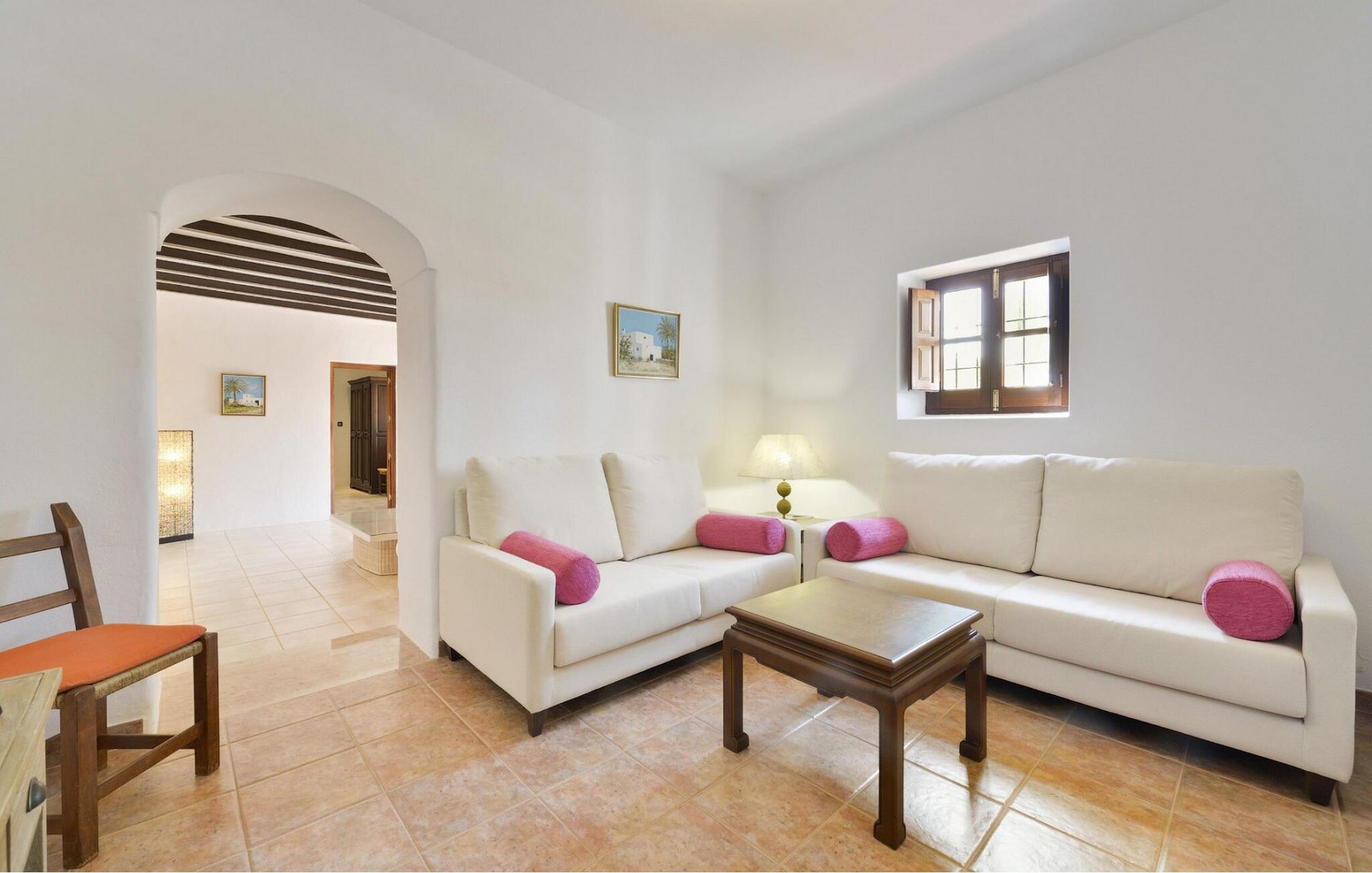 Denne fantastiske landvilla i feriestedstil er beliggende på Ibizas østkyst, tæt på Santa Eulalia, San Carlos og Santa Gertrudis, med nærliggende strande som Cala Pada, Cala Llonga og den smukke Aguas Blancas. Ejendommen tilbyder et luksuriøst tilflugtssted omgivet af omfattende palmehaver, hvilket giver et roligt og rummeligt miljø, hvor I kan slappe af. Dette er et Fincallorca feriehus. Villaen strækker sig over 400 m² og har en massiv 20 x 13,5 m swimmingpool, store græsplæner, vandfunktioner, en fiskedam og flere overdækkede sidde-, loungings- og spisepladser. Det er et ideelt sted at nyde naturen og nyde de rolige omgivelser. Villaen har værelser med aircondition for maksimal komfort. Ovenpå er der to soveværelser: det ene med en dobbeltseng (180x200), der kan laves om til to enkeltsenge efter anmodning og det andet med en dobbeltseng (180x200), et påklædningsværelse og et privat badeværelse med bruser. I stueetagen er der yderligere to soveværelser: et med en dobbeltseng (180x200) og et en-suite badeværelse med badekar og et andet med en dobbelt himmelseng (160x200) og et en-suite badeværelse med et badekar. En komplet rengøringsservice tilbydes hver syvende dag, inklusive skift af sengelinned og håndklæder, for at sikre et problemfrit ophold.