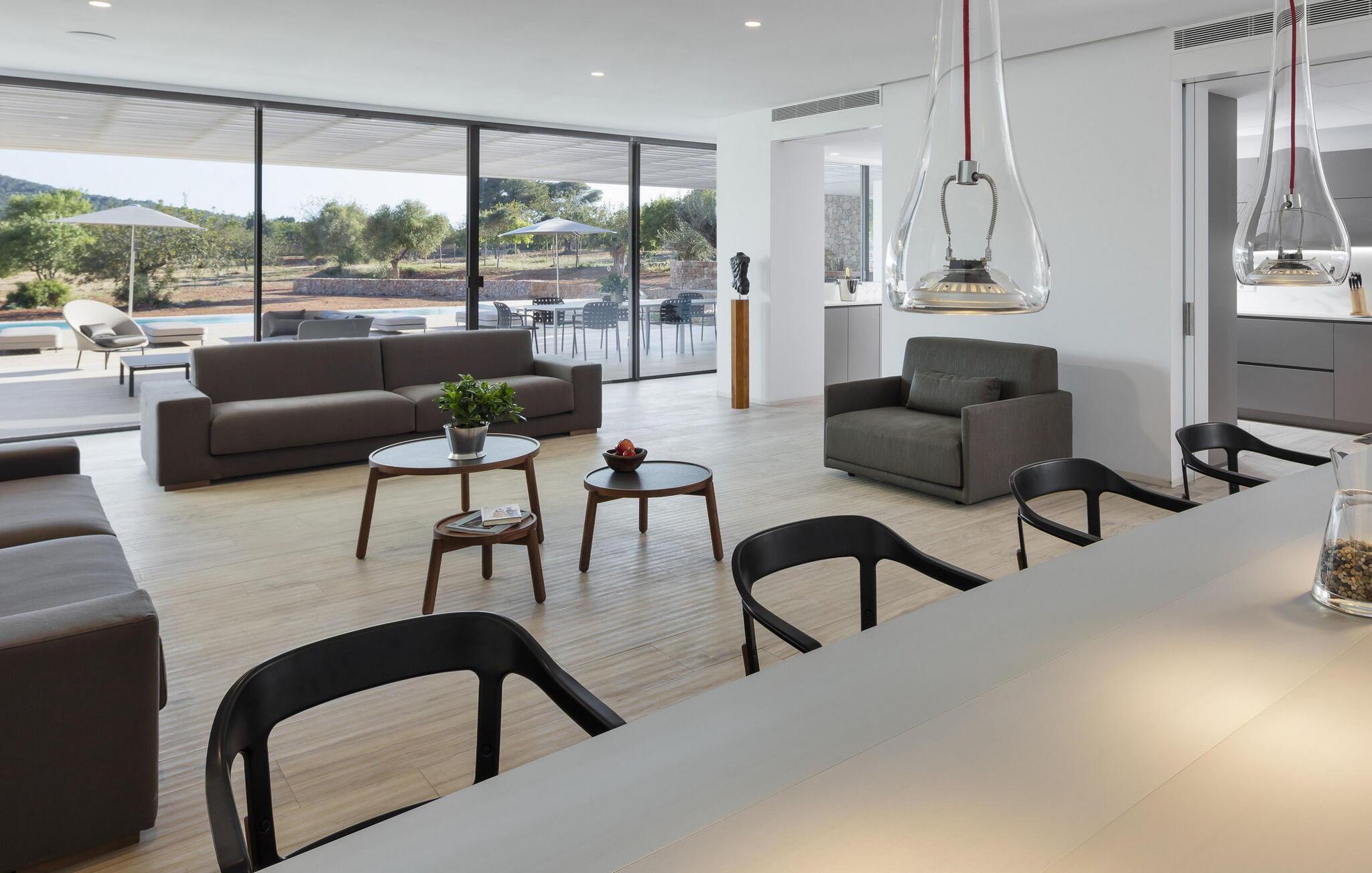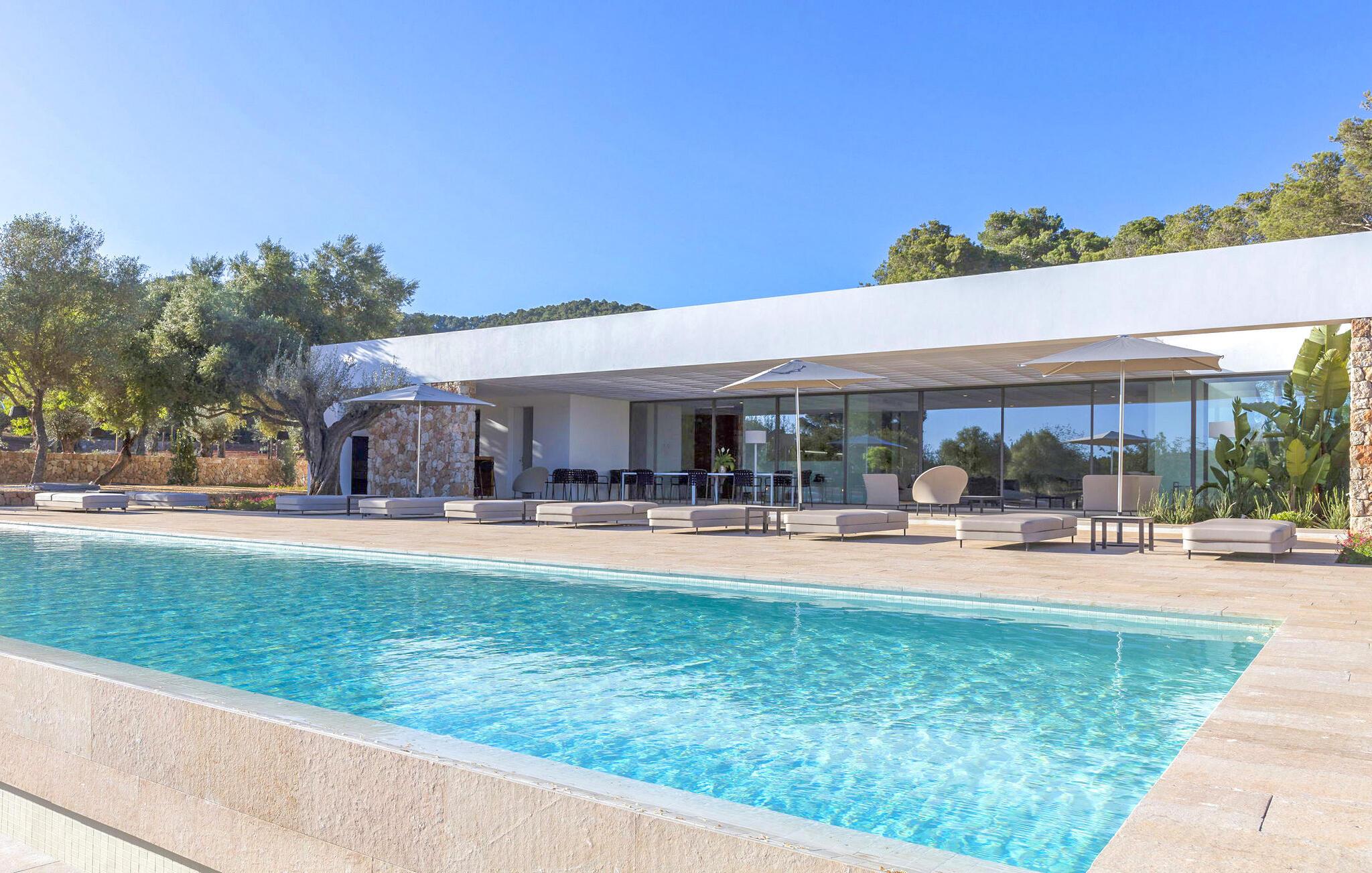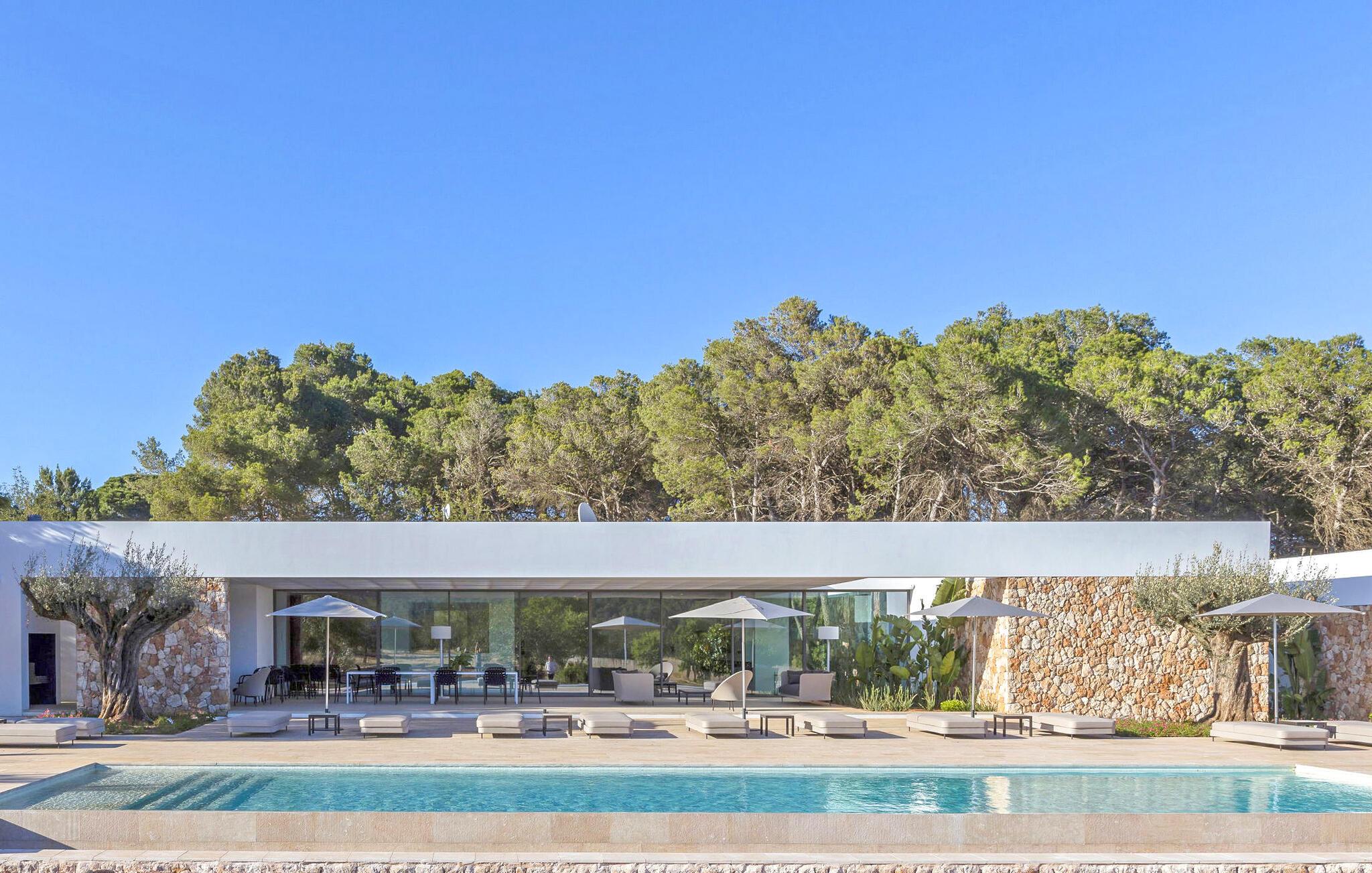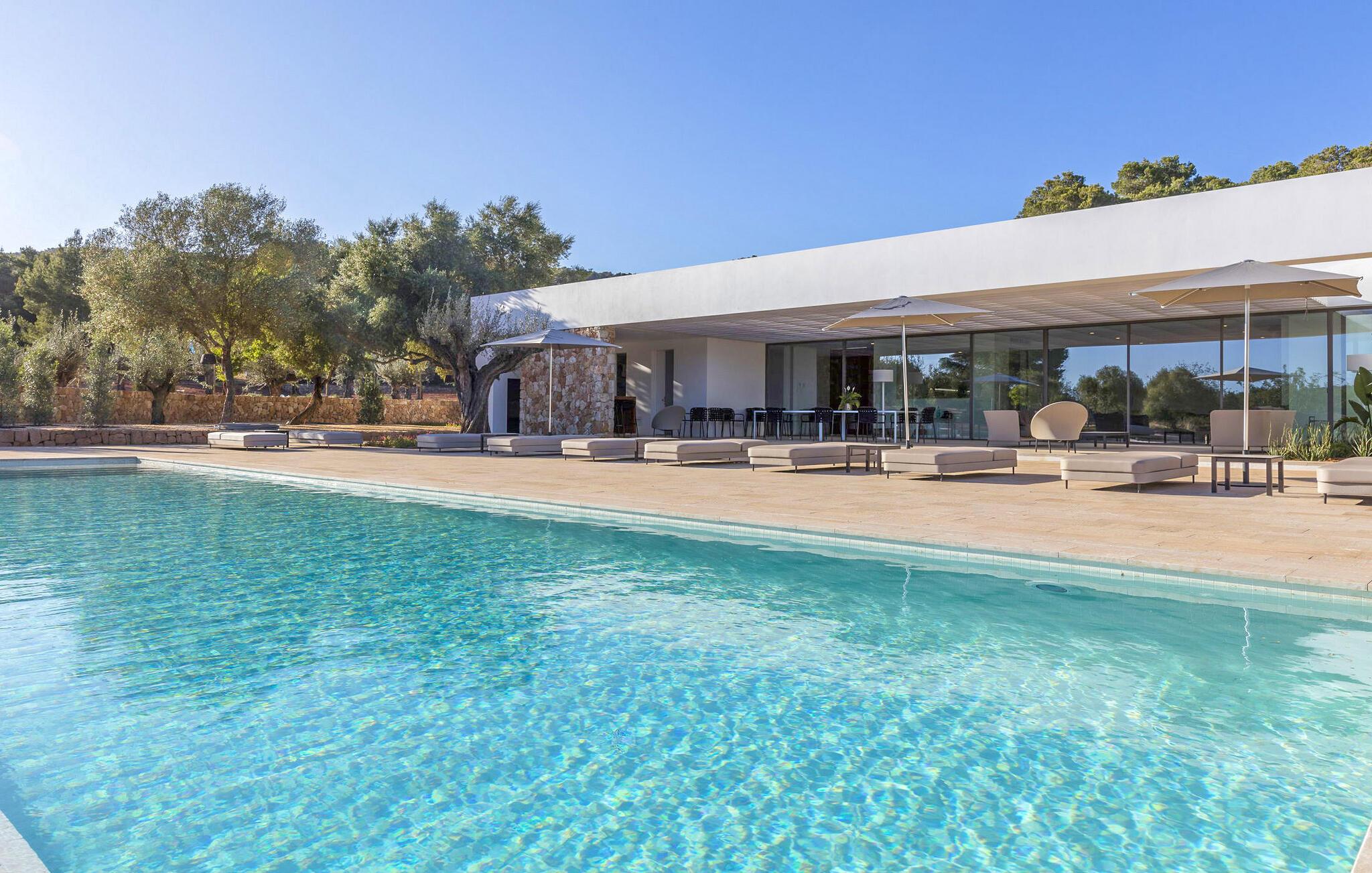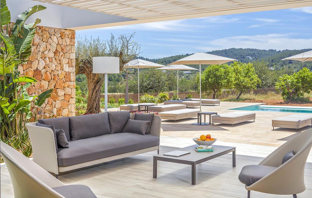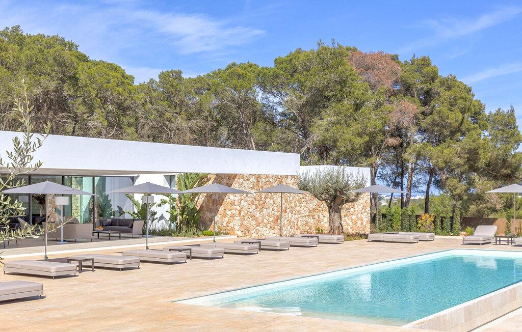 Spektakulær 480 m2 ejendom, der følger den moderne Ibiza-arkitektoniske stil, der kombinerer sten og hvide vægge med luksuriøse kvaliteter og komfort på ét niveau. Det er beliggende i et roligt landområde på en 20.000 m2 stor grund. Villaen har en stor stue-spisestue med TV og udsigt over poolen. Fuldt udstyret køkken med dobbelt køleskab, fryser, opvaskemaskine, ovn, Nespresso kaffemaskine. Toilet på gangen. I alt 7 suiter, 6 af soveværelserne er i hovedhuset, og en af dem er i et separat anneks nær indgangen. Alle har tv, aircondition, pengeskab og eget badeværelse med bruser. Alle senge kan skubbes sammen eller adskilles. Stor infinity-pool med liggestole og parasoller. Sofaområde, udendørs spiseplads og kulgrill. Vaskerum med vaskemaskine og tørretumbler. WiFi (ikke højhastighed), parkering til mindst 5 køretøjer. Rengøring inkluderet i prisen: 4 timer om dagen fra mandag til lørdag og 1 skift af håndklæder i løbet af ugen og slutrengøring.