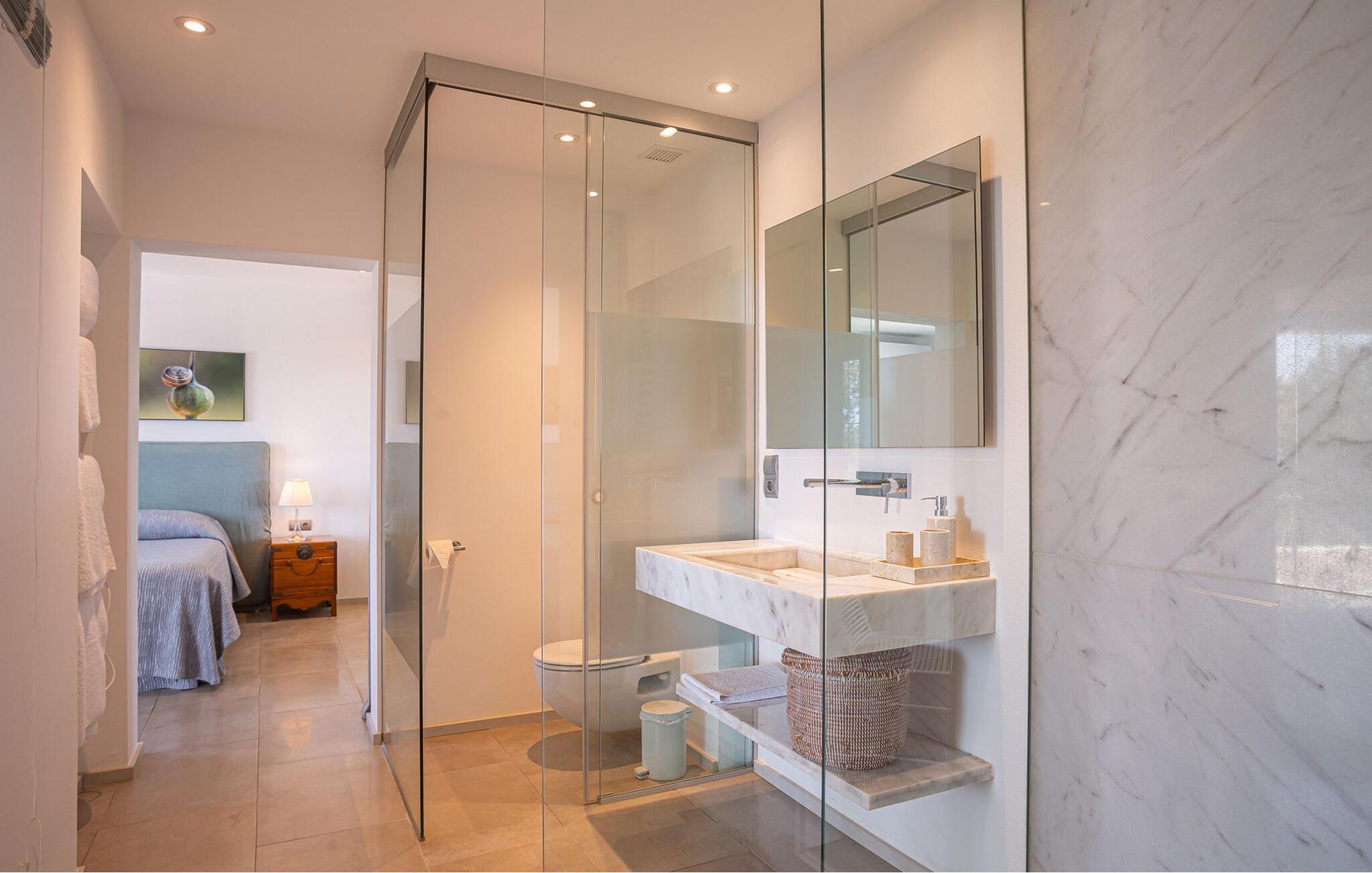 Denne fantastiske moderne villa er designet til at tilbyde både luksus og komfort, med en fantastisk havudsigt fra næsten alle værelser. Hovedetagen har en åben grundplan med en rummelig stue med pejs og Sonos stereoanlæg, en spiseplads til 12 og et fuldt udstyret køkken - alt sammen fører ud til en terrasse med panoramaudsigt over havet. Dette er et Fincallorca feriehus. På det nederste niveau er der fire smukt møblerede soveværelser, hver med aircondition, tv og en-suite badeværelse, med direkte adgang til en smart overdækket terrasse, et perfekt sted for alle at samles på de komfortable siddepladser. På pooletagen er der yderligere to king-size soveværelser med direkte adgang til terrassen, hvor I kan slappe af ved den 8m x 5m pool, komplet med liggestole og en udendørs spiseplads til udendørs spisning. Den øverste etage af villaen er en rolig solterrasse, perfekt til solbadning, mens I nyder det fantastiske kystlandskab. Med faciliteter såsom WiFi, satellit-tv, pengeskab og dedikeret rengøring er denne villa indbegrebet af et luksuriøst tilflugtssted tæt på stranden. Rengøring 2 gange om ugen: tirsdag og torsdag 4 timer/dag. Fuldstændig rengøring hver 7. nat, med skift af sengelinned og håndklæder.