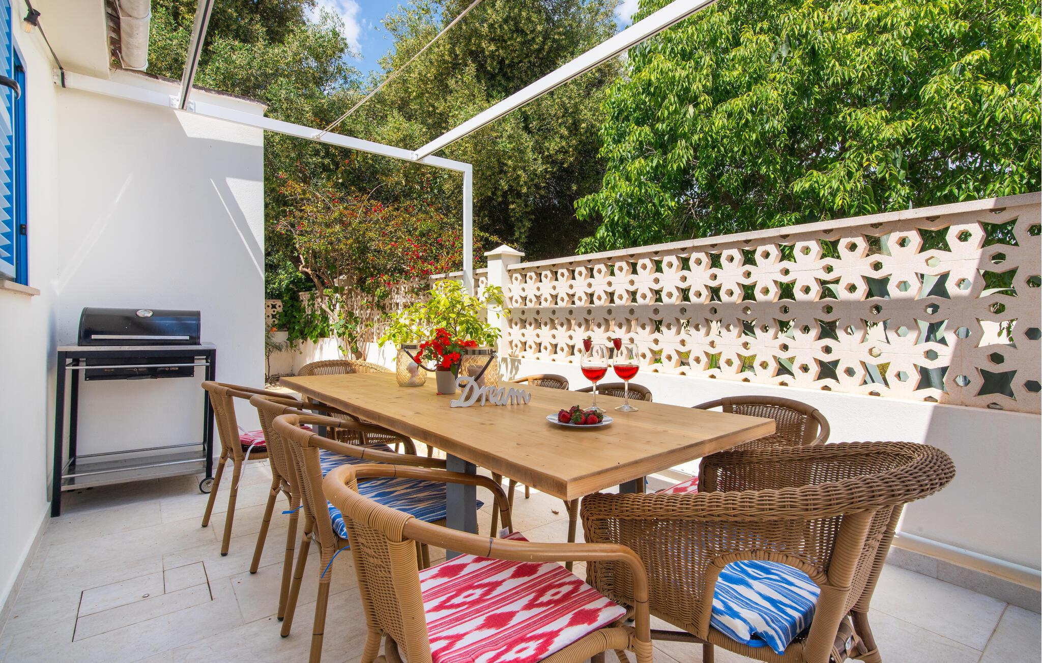 Dette feriehus er en vidunderlig base for solrige dage med udforskning af havet, kulturen og den mallorcanske livsglæde. Oplev en afslappende ferie i dette charmerende og rummelige hus. Huset kombinerer mallorcansk atmosfære med moderne komfort og tilbyder alt, hvad I behøver for et afslappende ophold. Opholdsstuen med sit åbne trætag og store vinduer er lys og indbydende. Sæt jer godt til rette i den komfortable sofa, nyd udsigten over haven, eller slap af med en film. Det smagfuldt indrettede køkken med træmøbler, farverige fliser og stort spisebord er perfekt til at lave mad sammen og nyde afslappede måltider. Et separat område tilbyder også et lille andet tekøkken med siddepladser – ideelt til familier eller venner, der ønsker lidt mere plads. Gå udenfor og nyd den mallorcanske sol. Slap af på terrassen i skyggen af pergolaen eller tag en forfriskende dukkert i poolen. I haven finder I komfortable siddeområder, liggestole og middelhavsplanter, der skaber en følelse af fred og ro. Udforsk området omkring Sa Coma. Tag en slentretur til den fine sandstrand, tag på udflugter til naturreservatet Punta de n'Amer, eller besøg de nærliggende byer Porto Cristo og Cala Millor med deres promenader og restauranter.