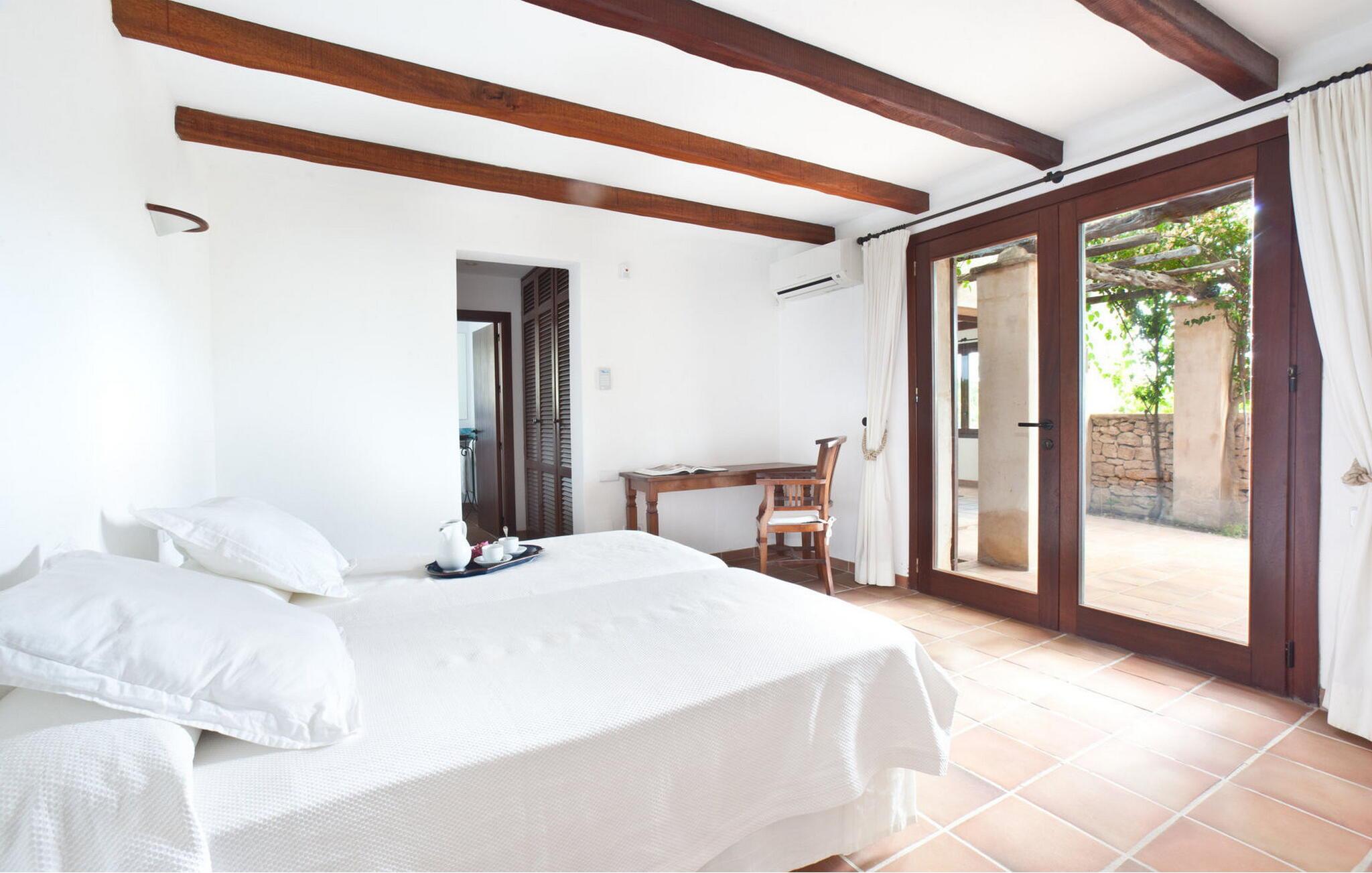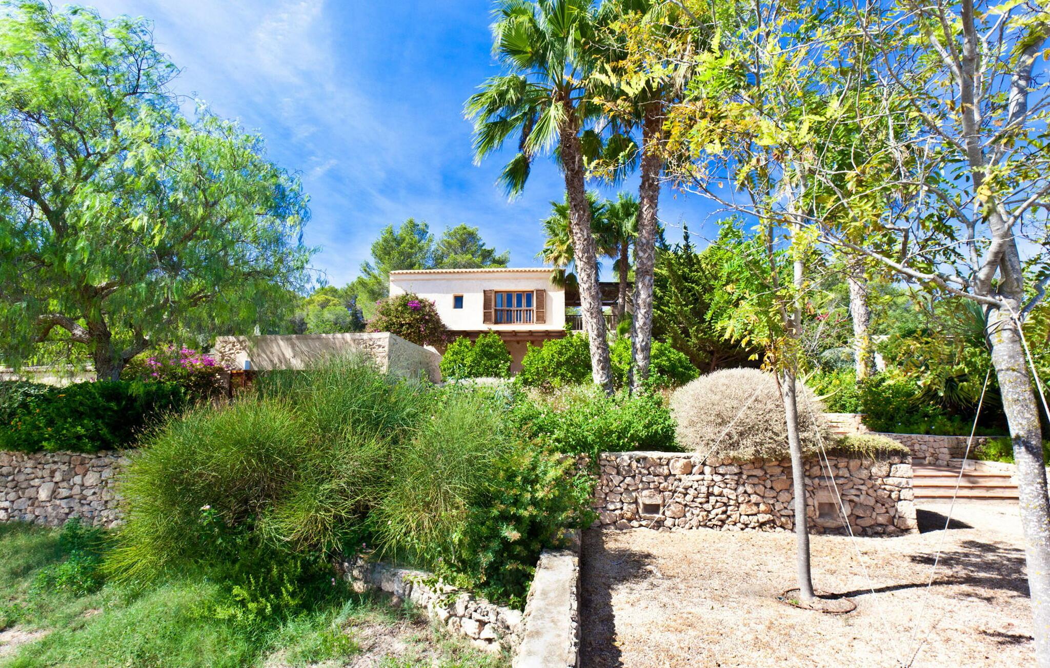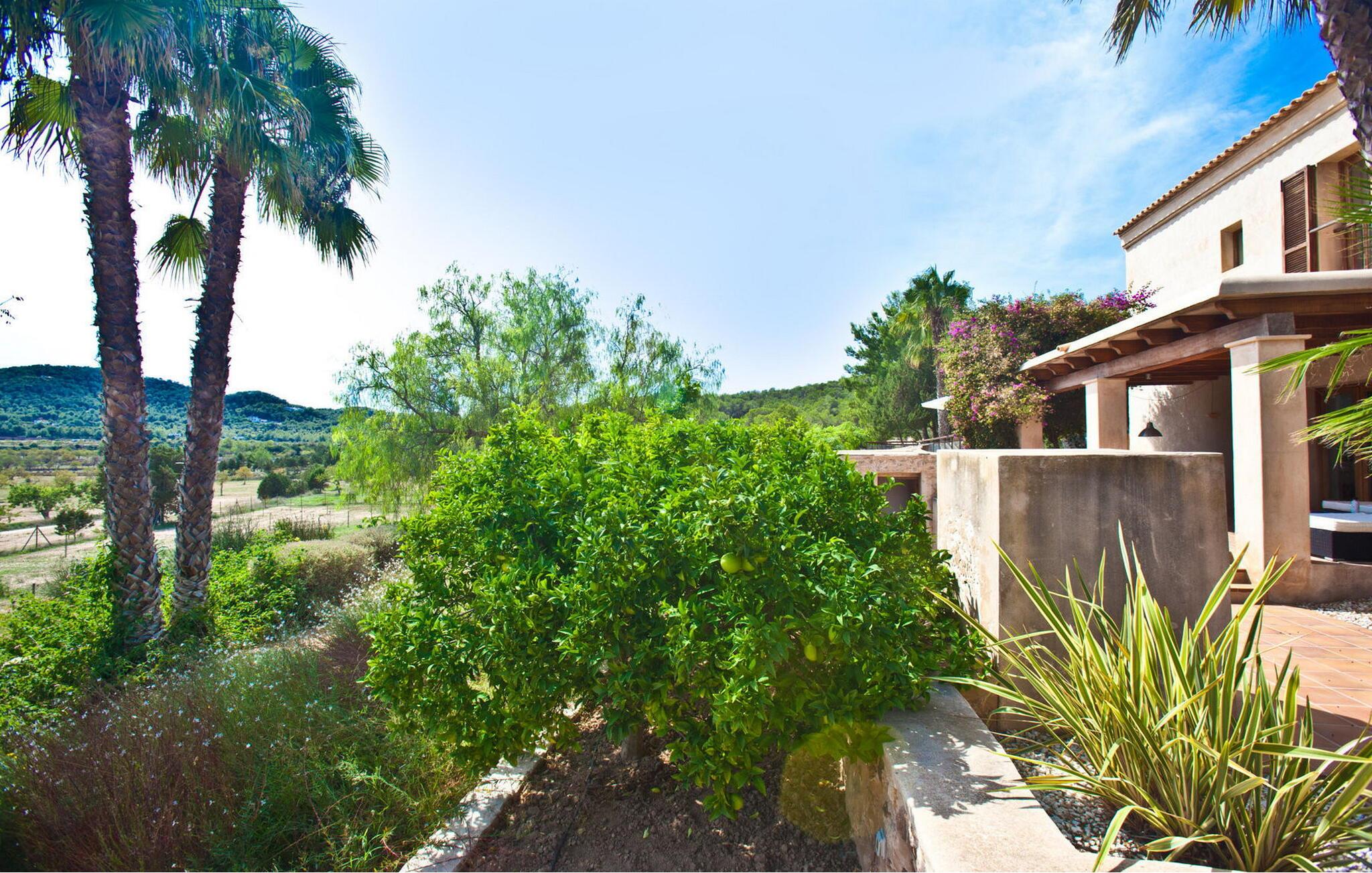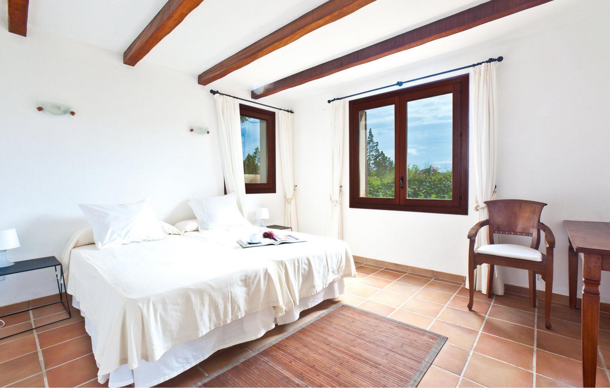 Smuk 430 m2 fuldt indhegnet villa bygget på en 10.000 m2 grund i reneste Ibiza-stil, få kilometer fra stranden i Cala Bassa og tæt på strandene i Cala Conta, Cala Tarida og Port des Torrent. Dette er et Fincallorca feriehus. Huset har 5 soveværelser med dobbeltsenge med private badeværelser og 1 enkeltværelse. Huset har to bungalows på ydersiden med en fælles terrasse. Hver bungalow har to 90x190 senge og et komplet badeværelse med bruser. Også uden for huset er der en tredje selvstændig bungalow med to 90x190 senge, en lille terrasse med udsigt, badeværelse med bruser. Vaskerum med vaskemaskine og tørretumbler. Hele forsiden af huset har en stor veranda med møbler til spisning eller bare nyde udsigten eller roen. Herfra har I adgang til det rummelige poolområde og grillpladsen. Ved indgangen til villaen er der et komplet badeværelse, en rummelig stue med Sonos-system og flere udgangsdøre til verandaen og poolområdet. Herfra fører en trappe til det store køkkenalrum, som er helt glaseret og har spiseplads. Ligeledes fra stuen er der adgang til to soveværelser, det ene med dobbeltseng og to enkeltsenge 90x190 og det andet med en seng på 90x190. En trappe fører jer til master-dobbeltværelset ovenpå med en 180x190 seng og et badeværelse med badekar, et påklædningsværelse og en stor terrasse med smuk havudsigt. Rengøring: Daglig rengøring på cirka 3 eller 4 timer (undtagen søn- og helligdage). En sikkerhedsvagt er inkluderet i prisen.