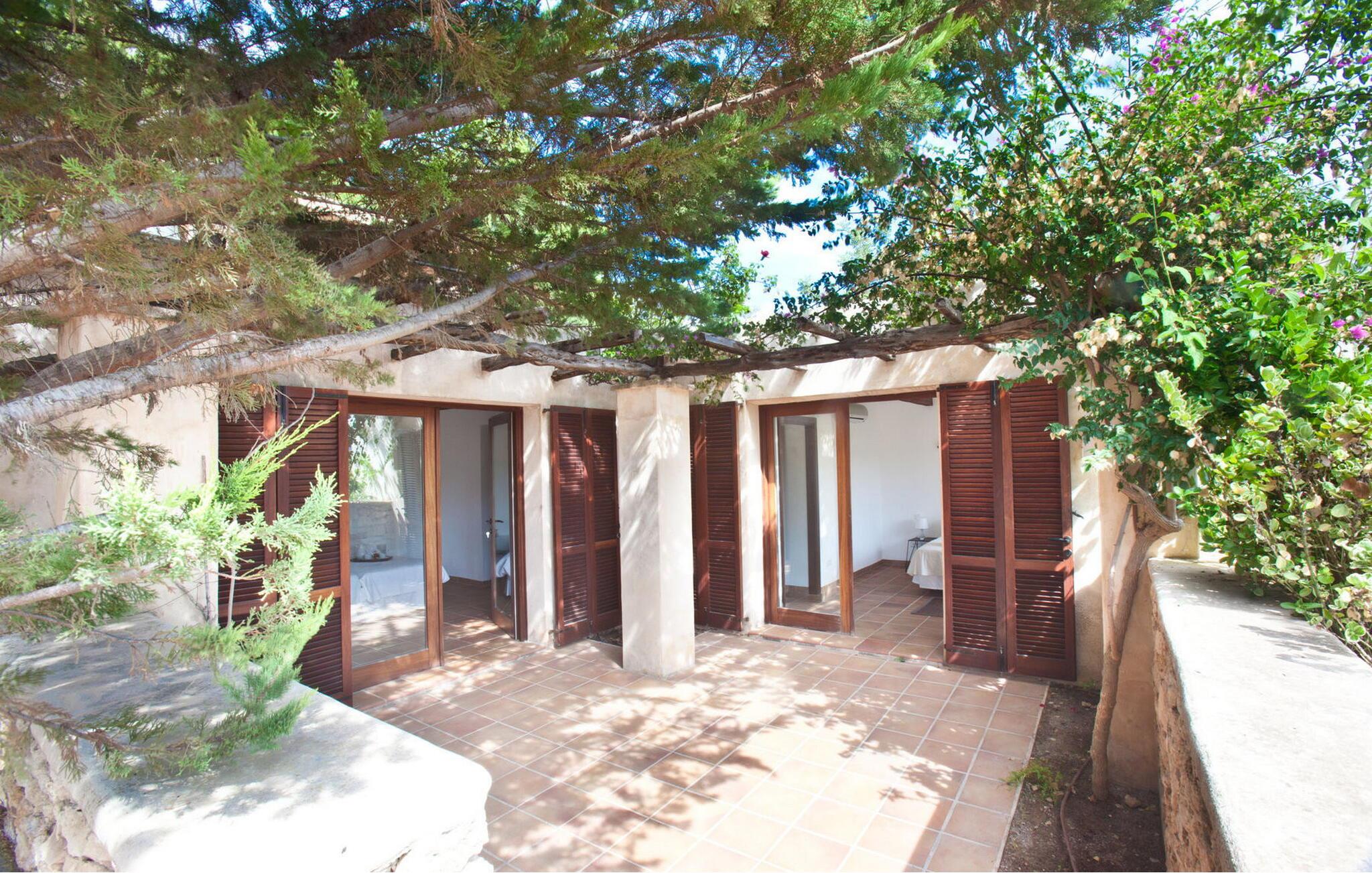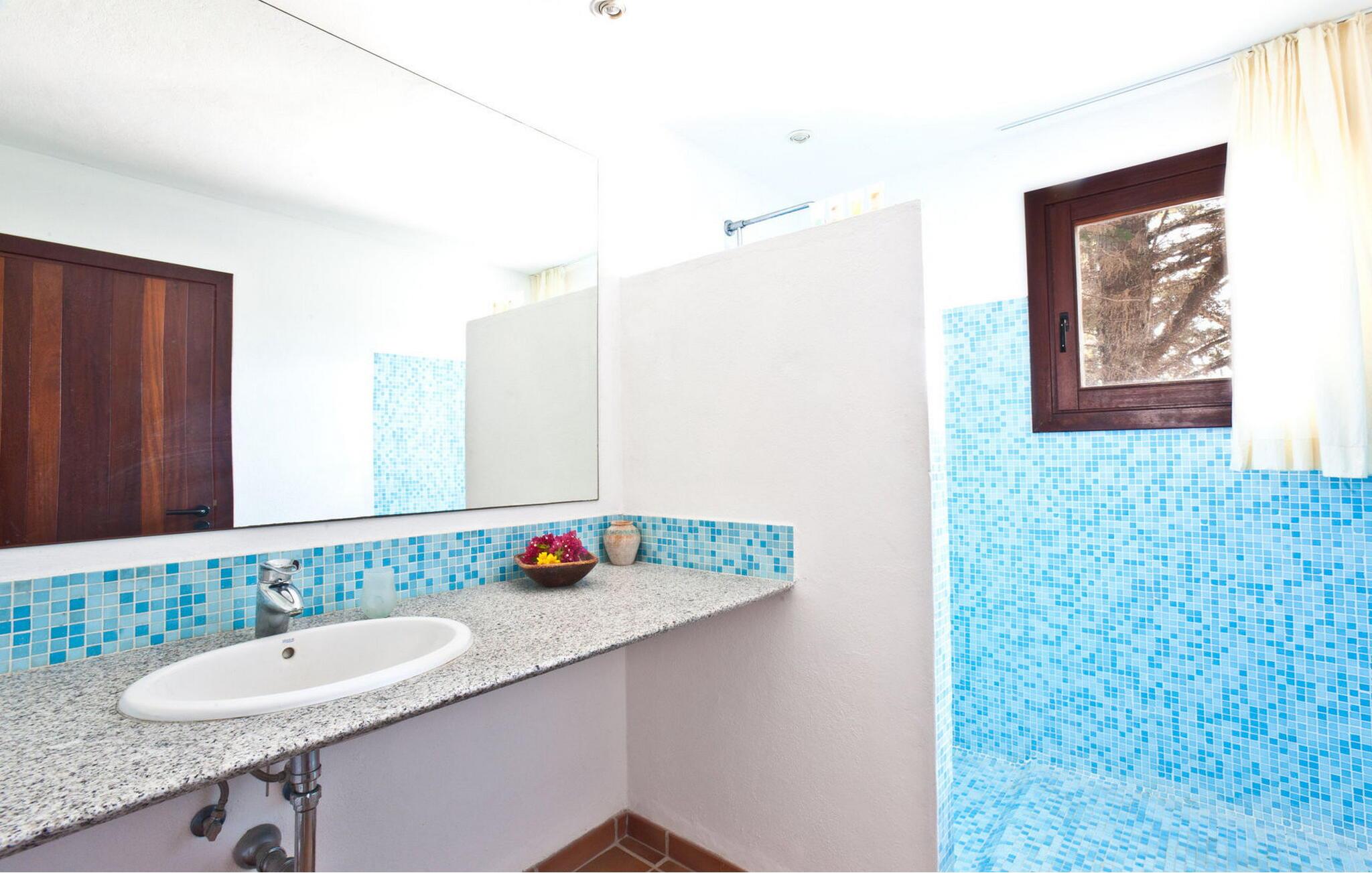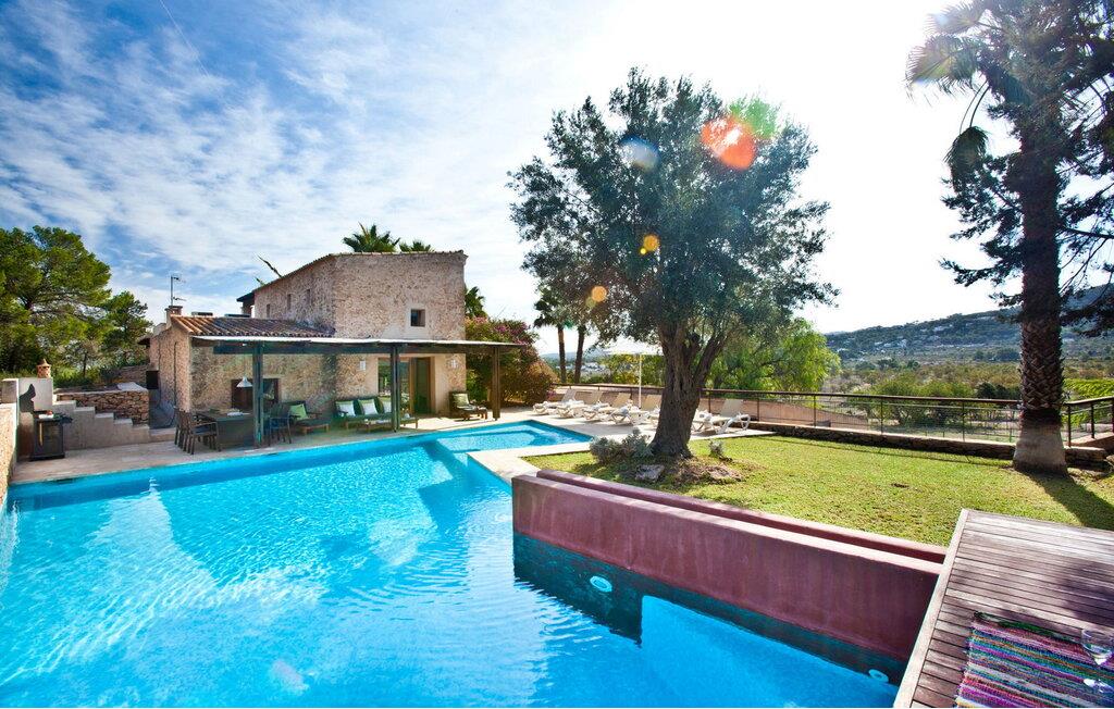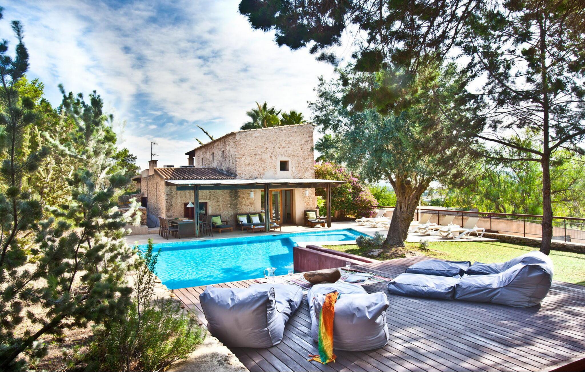 Smuk 430 m2 fuldt indhegnet villa bygget på en 10.000 m2 grund i reneste Ibiza-stil, få kilometer fra stranden i Cala Bassa og tæt på strandene i Cala Conta, Cala Tarida og Port des Torrent. Dette er et Fincallorca feriehus. Huset har 5 soveværelser med dobbeltsenge med private badeværelser og 1 enkeltværelse. Huset har to bungalows på ydersiden med en fælles terrasse. Hver bungalow har to 90x190 senge og et komplet badeværelse med bruser. Også uden for huset er der en tredje selvstændig bungalow med to 90x190 senge, en lille terrasse med udsigt, badeværelse med bruser. Vaskerum med vaskemaskine og tørretumbler. Hele forsiden af huset har en stor veranda med møbler til spisning eller bare nyde udsigten eller roen. Herfra har I adgang til det rummelige poolområde og grillpladsen. Ved indgangen til villaen er der et komplet badeværelse, en rummelig stue med Sonos-system og flere udgangsdøre til verandaen og poolområdet. Herfra fører en trappe til det store køkkenalrum, som er helt glaseret og har spiseplads. Ligeledes fra stuen er der adgang til to soveværelser, det ene med dobbeltseng og to enkeltsenge 90x190 og det andet med en seng på 90x190. En trappe fører jer til master-dobbeltværelset ovenpå med en 180x190 seng og et badeværelse med badekar, et påklædningsværelse og en stor terrasse med smuk havudsigt. Rengøring: Daglig rengøring på cirka 3 eller 4 timer (undtagen søn- og helligdage). En sikkerhedsvagt er inkluderet i prisen.