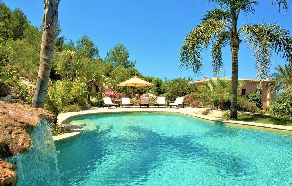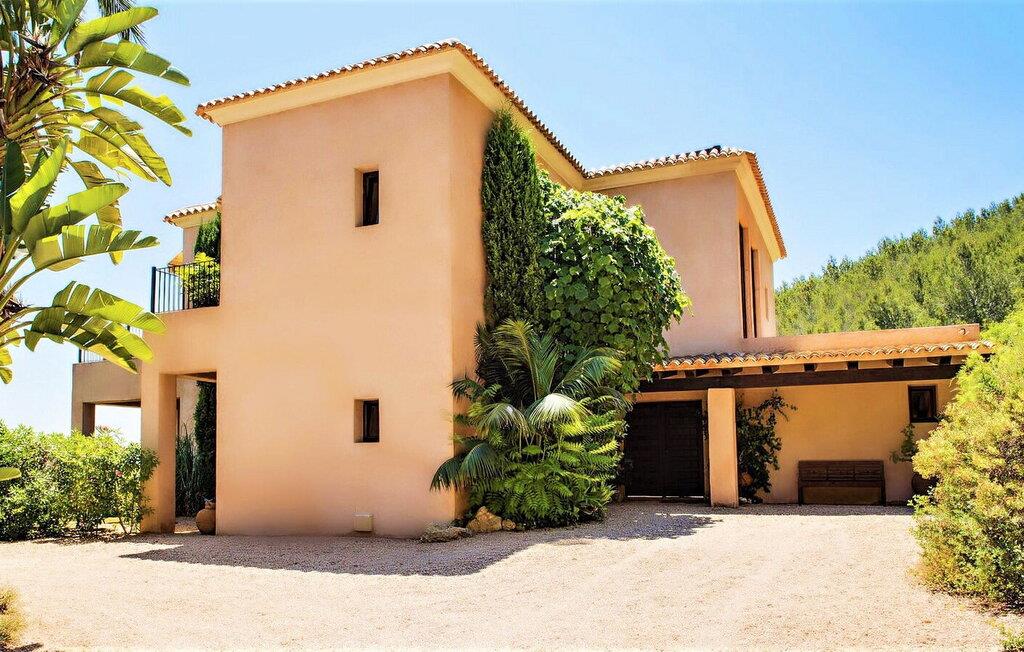 Denne fortryllende villa, beliggende på en stille bjergskråning og omgivet af 35.000 m² privat skov, tilbyder en betagende udsigt over landskabet og østkysten af Ibiza. På trods af sin rolige beliggenhed er det kun fem minutters kørsel fra den pulserende by og promenaden Santa Eulalia. Dette er et Fincallorca feriehus. En stor entré med et to-etagers glasloft byder jer velkommen i villaen og oversvømmer rummet med naturligt lys. Til højre tilbyder et arbejdsværelse med fiberoptisk internet, sofa og adgang til terrasse et roligt tilflugtssted. Til venstre er stuen med skydedøre, komfortable siddepladser, pejs, fjernsyn og stereoanlæg. Spisepladsen forbinder til et fuldt udstyret køkken med spisekammer, vaskemaskine og tørretumbler og åbner til en terrasse med have-, landskabs- og havudsigt. På denne etage er der også et soveværelse med dobbeltseng med en 160x200 cm seng, hydromassagebruser, aircondition og udgang til terrasse med havudsigt, samt et gæstetoilet. Det store soveværelse på første sal er en oase af luksus og har en 180x200 cm seng, en sofa, aircondition, et stort badeværelse med badekar, separat bruser og udgang til terrassen med vidunderlig havudsigt. Et andet soveværelse byder på en 160x200 cm seng, privat bruser, aircondition og adgang til terrassen. Et tredje soveværelse har en 160x200 cm seng, et en-suite badeværelse med bruser over badekarret, aircondition og en terrasse med vidunderlig udsigt. Udenfor skaber villaens smukt anlagte have et idyllisk uderum med frodige græsplæner, der omgiver store dele af huset. Slap af på terrassen, spis al fresco eller nyd den store pool omgivet af et soldæk med hængekøjer, mens I nyder den spektakulære landskab og havudsigt. Med en grundlæggende rengøring to gange om ugen, sikrer denne villa komfort, hvilket gør den til et perfekt tilflugtssted for dem, der søger privatliv og naturlig skønhed uden at gå på kompromis med nærheden til Ibizas attraktioner.