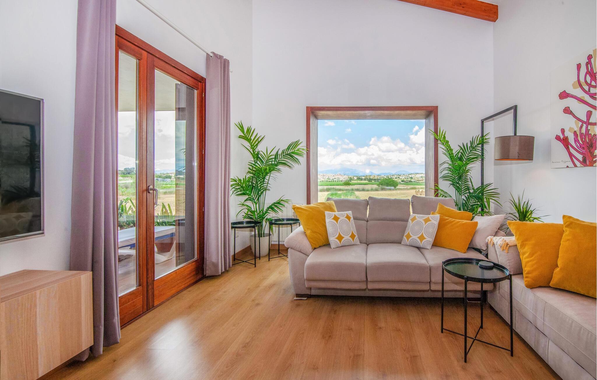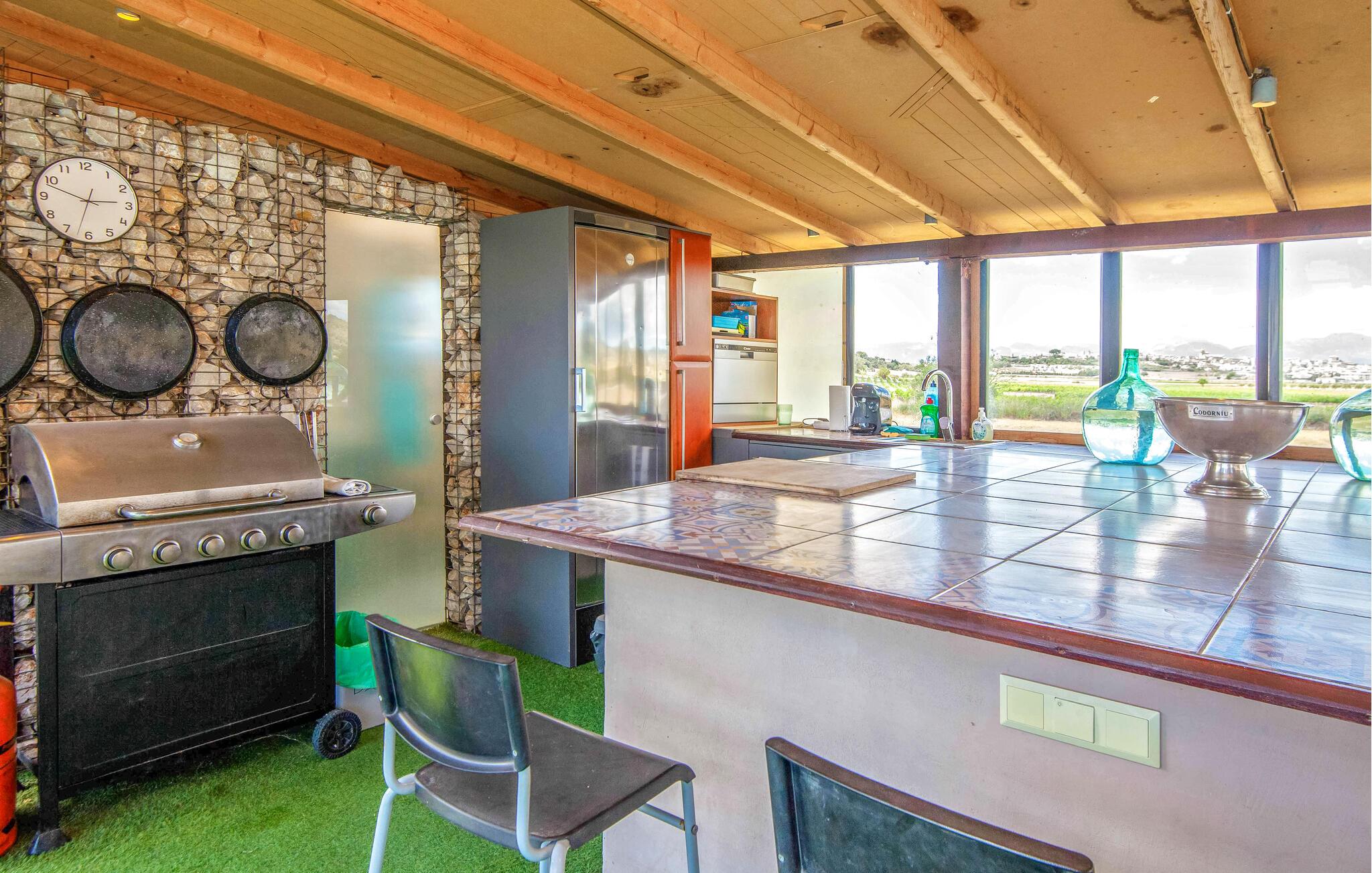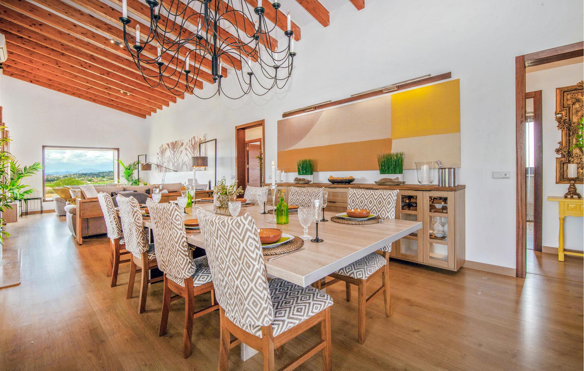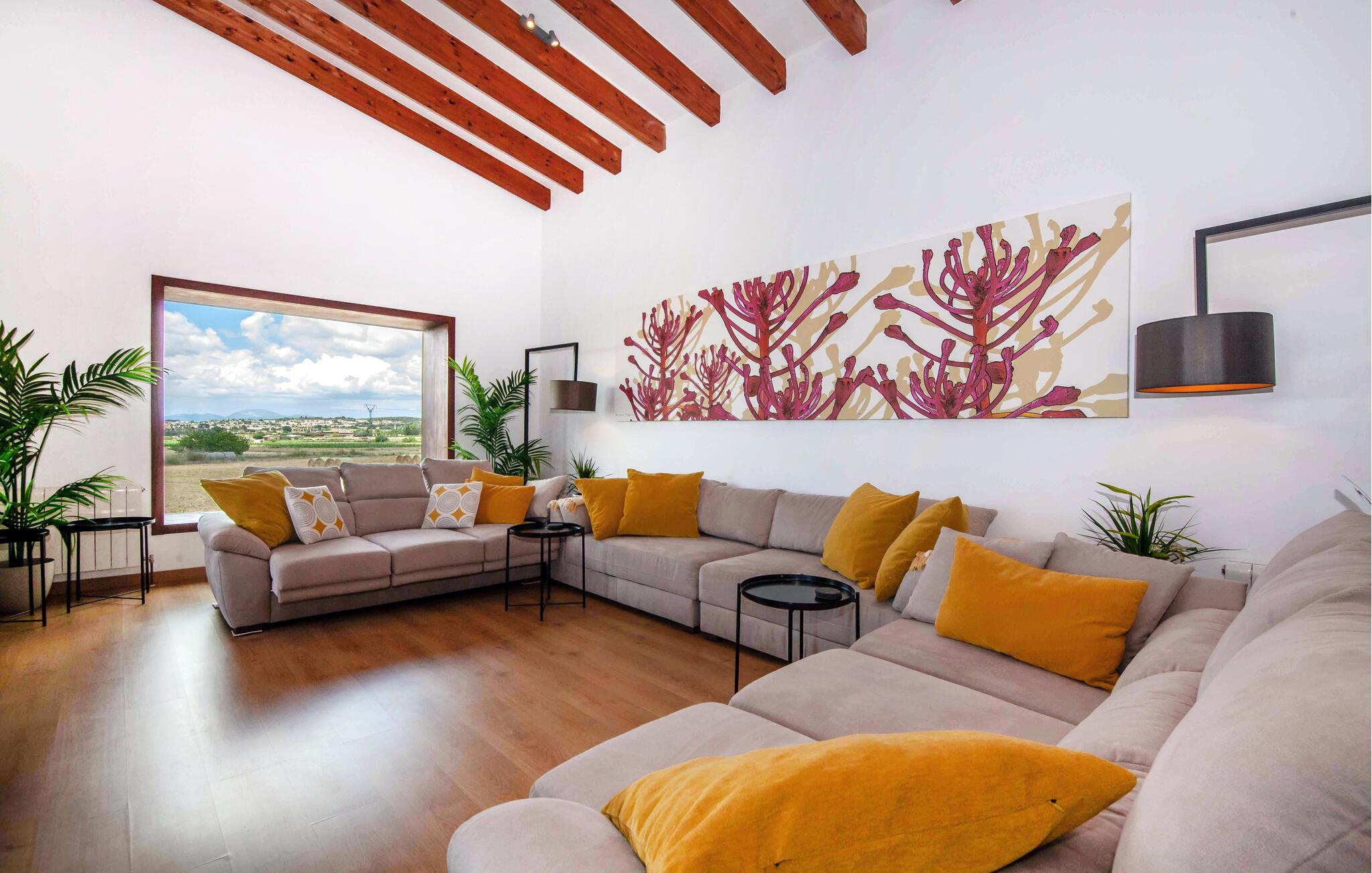 Den ultramoderne "Villa Son Gat de Mallorca", ideel til familier og familiegrupper, er overbevisende over hele linjen. Disse omfatter en oase af kunstgræs, en forfriskende saltvandspool og smukt anlagte kroge i haven, der tilføjer en ny dimension til begrebet afslapning. I kan slappe af på liggestolene eller i skyggen af det maritime fortelt eller ekstra parasoller. Ved siden af poolen ligger det overdækkede udekøkken med dets duftende håndklæder, der ligesom på verandaen ved siden af huset giver beskyttelse mod sol og vind - og bare ser pænt ud. Det udendørs køkken byder på et fantastisk spiseområde til en snack ved poolen eller en forfriskende is i baren. Dette område konkurrerer med den skyggefulde veranda, da der også er en hyggelig spiseplads og lounge, der giver jer et afsondret sted og et afslappende tilflugtssted til sent på aftenen. Spændingen kan kun stige – det eneste I skal gøre er at træde ind i det spændende stuehus. Et åbent område venter på jer, oversvømmet med lys gennem talrige vinduer og med et luftigt loft. Det huser de funktionelle områder køkken, spisestue og stue. En absolut drøm for to familier. Udover den behagelige rummelige fornemmelse kan I også forvente teknisk innovativt udstyr med et komfortabelt udstyret køkken, pilleovn, LCD-tv og Bluetooth-højttaler. Komforten er parret med en chik, tidløs indretningsstil, der ligger et sted mellem design og boheme. Atmosfæren er afslappet og alle møbler er funktionelle. Men det er de små detaljer, der har stor betydning og gør den subtile forskel i de fire hyggelige soveværelser med dobbeltsenge eller to enkeltsenge hver for op til otte personer. De luksuriøse badeværelser med brusekabiner i et cool design er prikken over i'et på "Villa Son Gat Mallorca", som skal leve op til jeres forventninger på alle områder. Den vidunderligt rolige bondegård "Villa Son Gat Mallorca", perfekt til familier med børn, har en stor have med pool og udendørs køkken. Det tilbyder også et bredt panorama over den flade slette i midten af øen op til de majestætiske Tramuntana-bjerge. Ferieboligen ligger tæt på landsbyen Montuïri, hvor I kan shoppe og finde lokale restauranter. Beliggenheden er også ideel med 20 minutters kørsel til Palma og 30 minutter til sydens drømmestrande. Bemærk venligst, at denne ejendom ikke accepterer ungdomsgrupper eller polterabender. En ungdomsgruppe på denne ejendom består af personer på 28 år eller derunder. Book ikke denne ejendom, hvis I er en ungdomsgruppe eller polterabend, da jeres reservation vil blive afvist, når den er booket, hvilket også kan være tilfældet ved ankomst til ejendommen eller under jeres ophold, og I vil ikke modtage en refusion