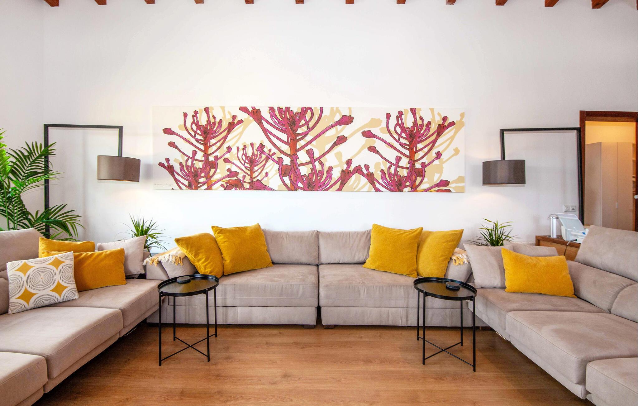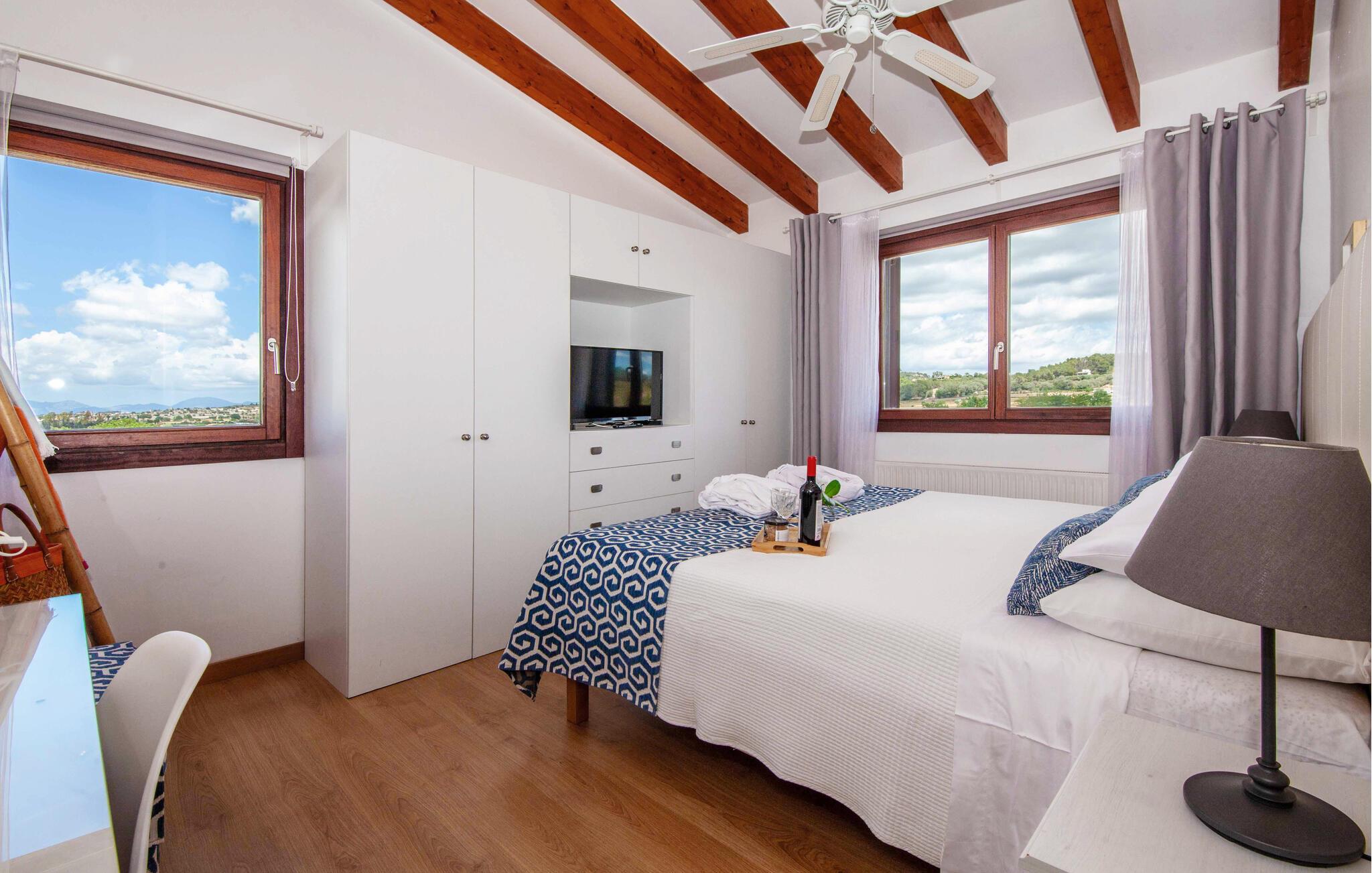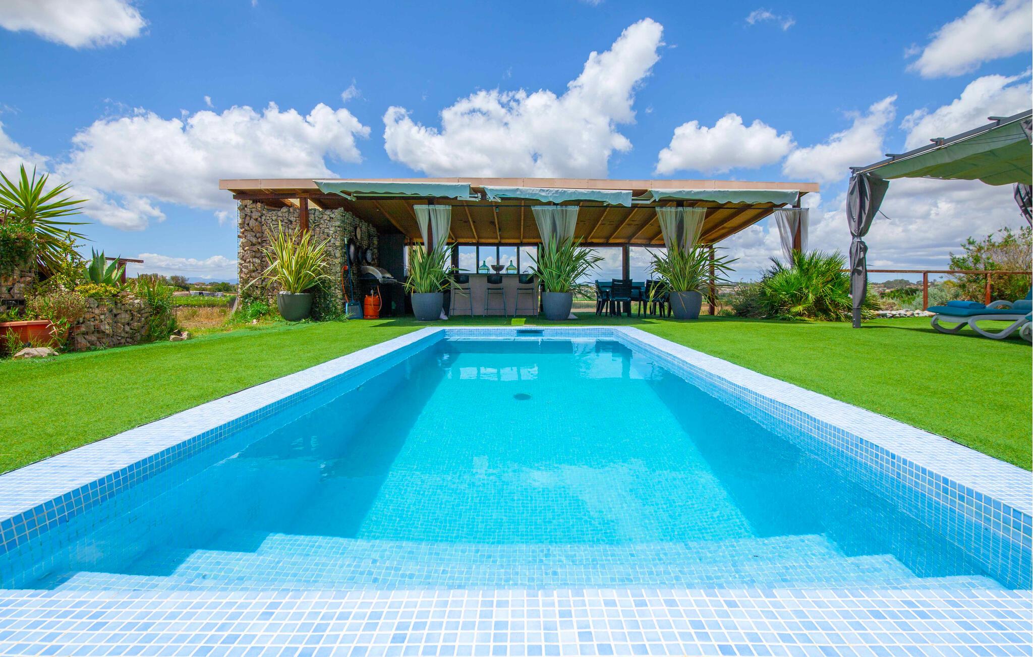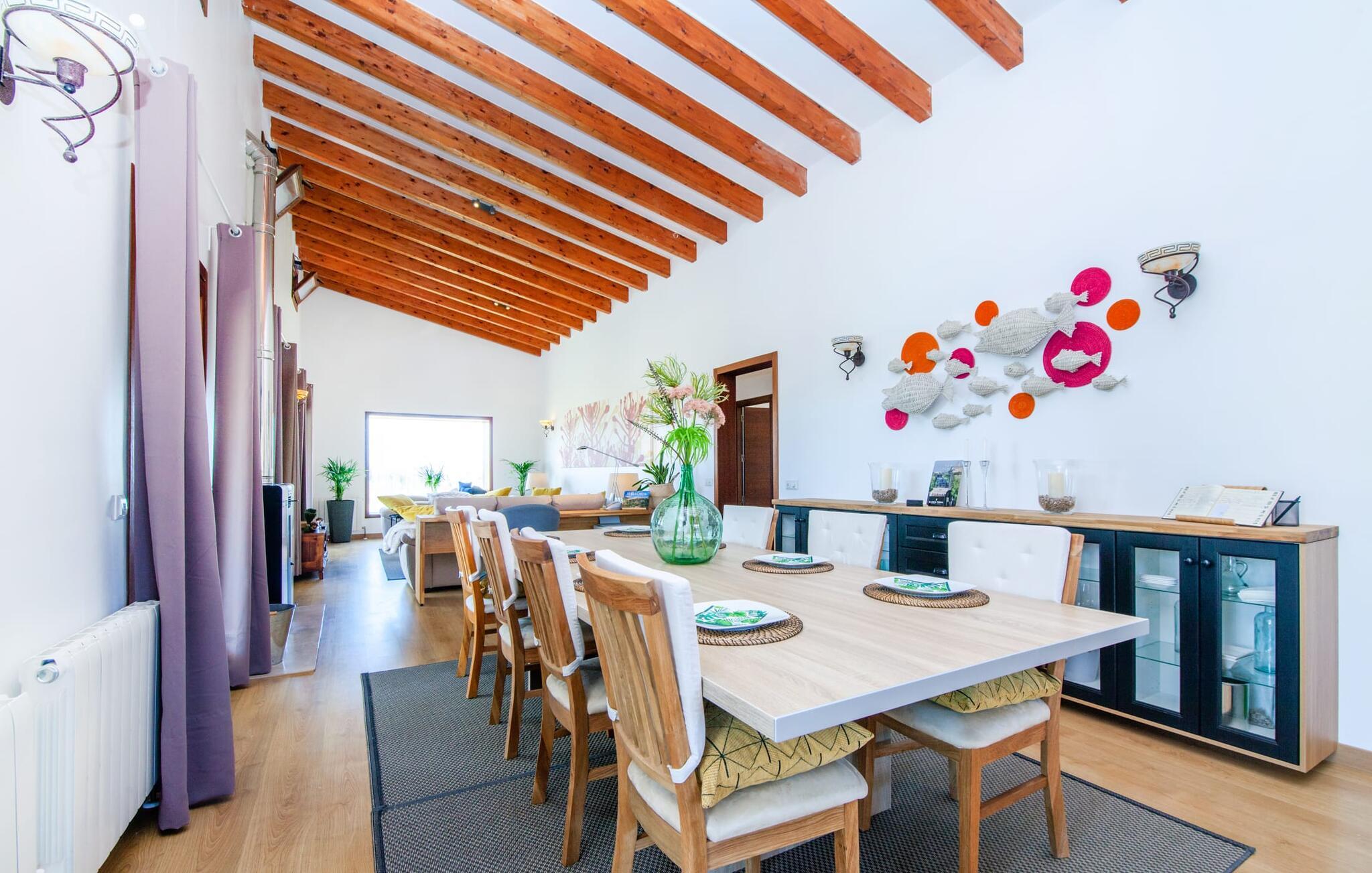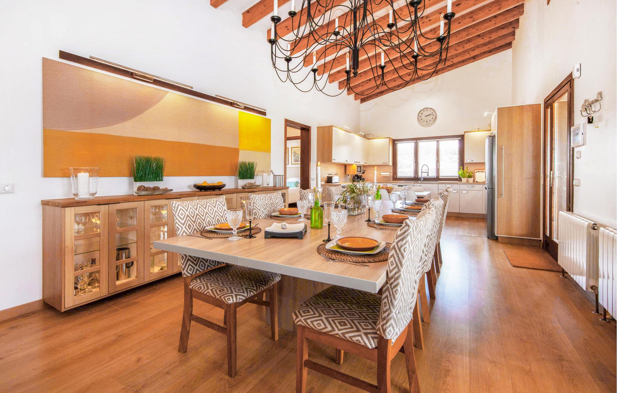 Den ultramoderne "Villa Son Gat de Mallorca", ideel til familier og familiegrupper, er overbevisende over hele linjen. Disse omfatter en oase af kunstgræs, en forfriskende saltvandspool og smukt anlagte kroge i haven, der tilføjer en ny dimension til begrebet afslapning. I kan slappe af på liggestolene eller i skyggen af det maritime fortelt eller ekstra parasoller. Ved siden af poolen ligger det overdækkede udekøkken med dets duftende håndklæder, der ligesom på verandaen ved siden af huset giver beskyttelse mod sol og vind - og bare ser pænt ud. Det udendørs køkken byder på et fantastisk spiseområde til en snack ved poolen eller en forfriskende is i baren. Dette område konkurrerer med den skyggefulde veranda, da der også er en hyggelig spiseplads og lounge, der giver jer et afsondret sted og et afslappende tilflugtssted til sent på aftenen. Spændingen kan kun stige – det eneste I skal gøre er at træde ind i det spændende stuehus. Et åbent område venter på jer, oversvømmet med lys gennem talrige vinduer og med et luftigt loft. Det huser de funktionelle områder køkken, spisestue og stue. En absolut drøm for to familier. Udover den behagelige rummelige fornemmelse kan I også forvente teknisk innovativt udstyr med et komfortabelt udstyret køkken, pilleovn, LCD-tv og Bluetooth-højttaler. Komforten er parret med en chik, tidløs indretningsstil, der ligger et sted mellem design og boheme. Atmosfæren er afslappet og alle møbler er funktionelle. Men det er de små detaljer, der har stor betydning og gør den subtile forskel i de fire hyggelige soveværelser med dobbeltsenge eller to enkeltsenge hver for op til otte personer. De luksuriøse badeværelser med brusekabiner i et cool design er prikken over i'et på "Villa Son Gat Mallorca", som skal leve op til jeres forventninger på alle områder. Den vidunderligt rolige bondegård "Villa Son Gat Mallorca", perfekt til familier med børn, har en stor have med pool og udendørs køkken. Det tilbyder også et bredt panorama over den flade slette i midten af øen op til de majestætiske Tramuntana-bjerge. Ferieboligen ligger tæt på landsbyen Montuïri, hvor I kan shoppe og finde lokale restauranter. Beliggenheden er også ideel med 20 minutters kørsel til Palma og 30 minutter til sydens drømmestrande. Bemærk venligst, at denne ejendom ikke accepterer ungdomsgrupper eller polterabender. En ungdomsgruppe på denne ejendom består af personer på 28 år eller derunder. Book ikke denne ejendom, hvis I er en ungdomsgruppe eller polterabend, da jeres reservation vil blive afvist, når den er booket, hvilket også kan være tilfældet ved ankomst til ejendommen eller under jeres ophold, og I vil ikke modtage en refusion