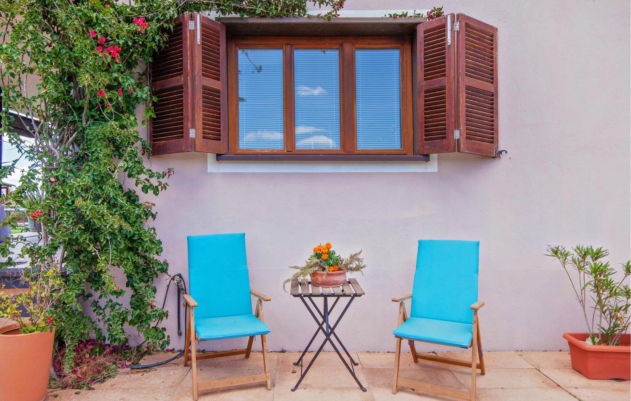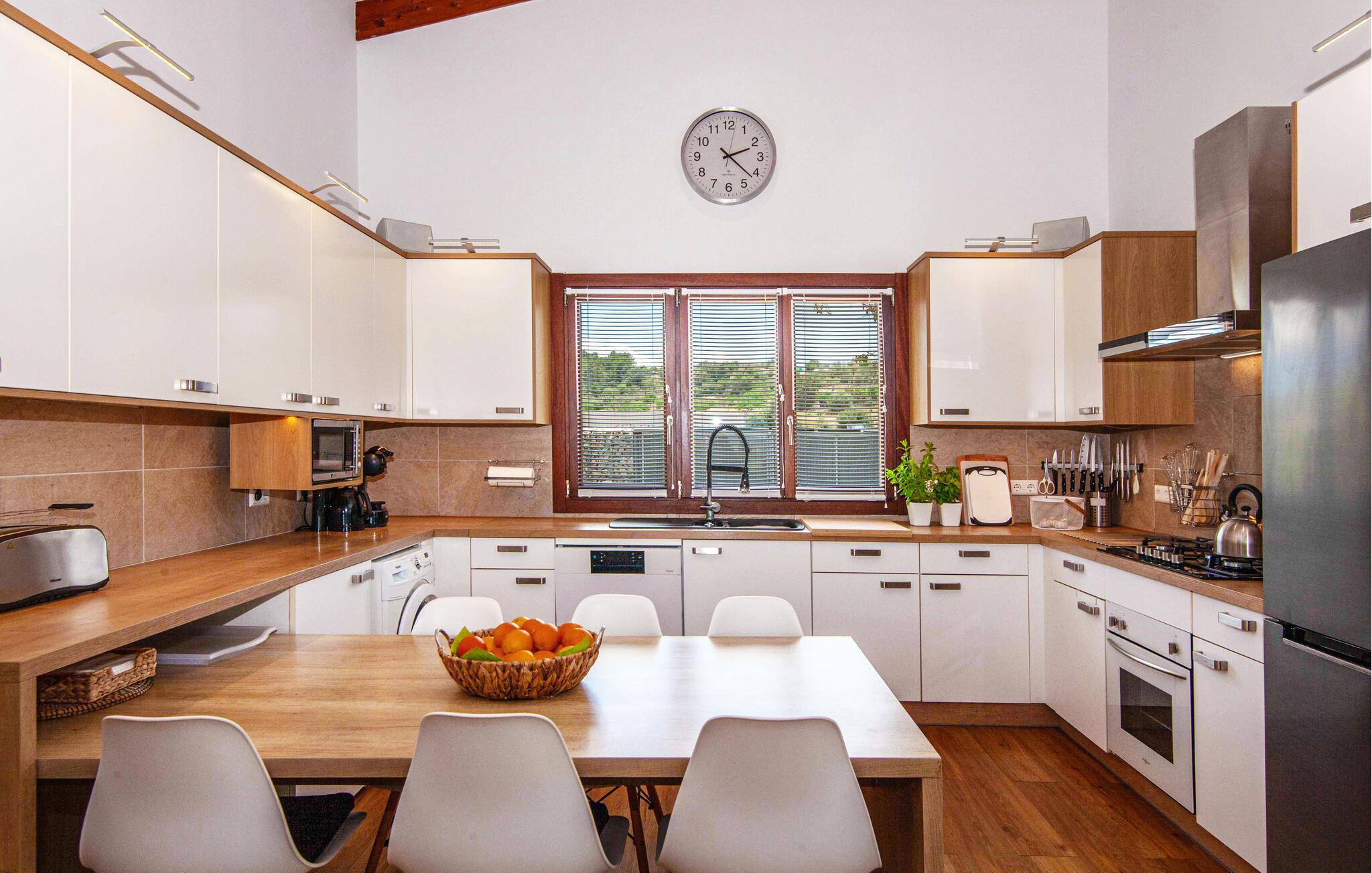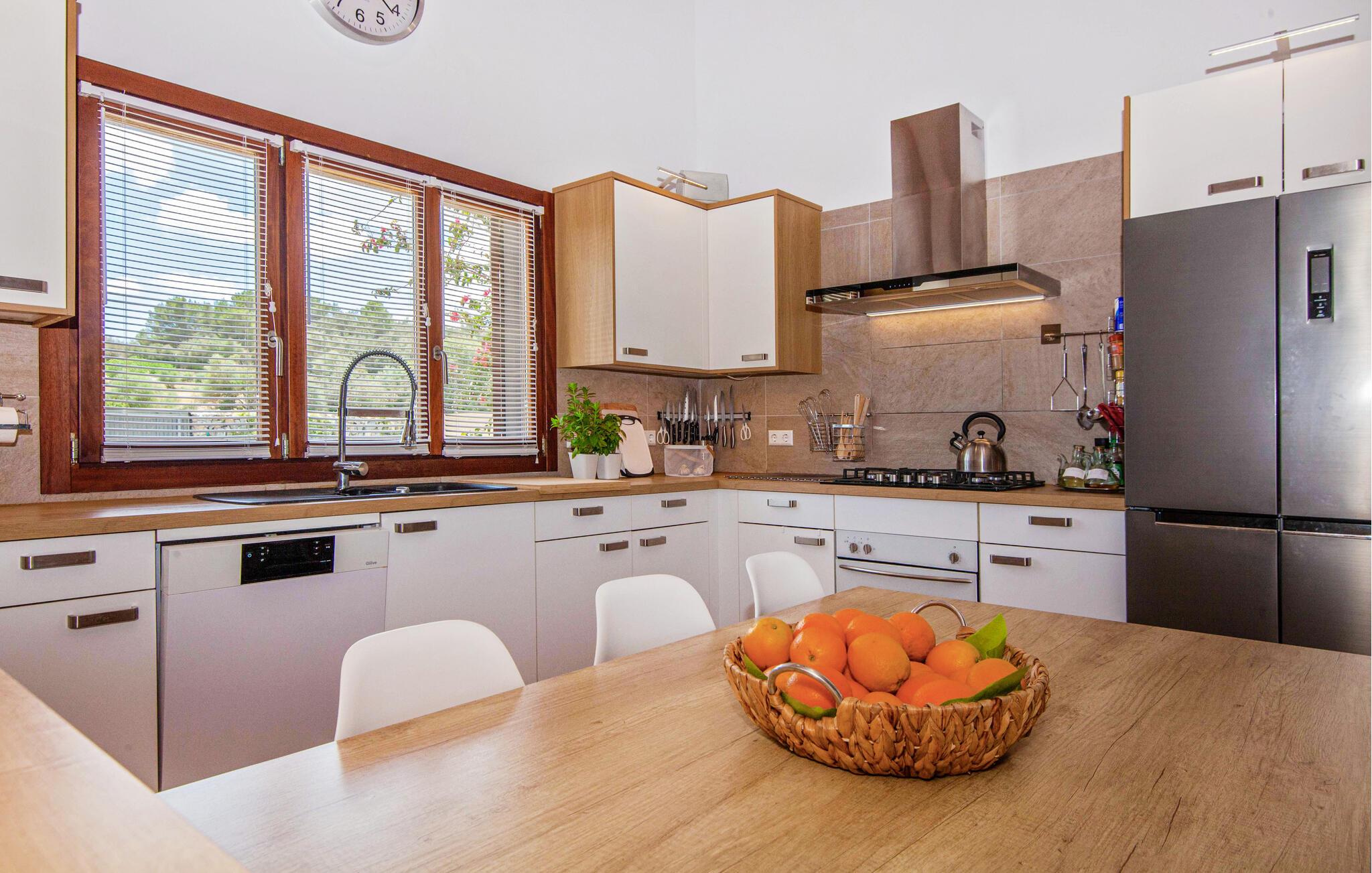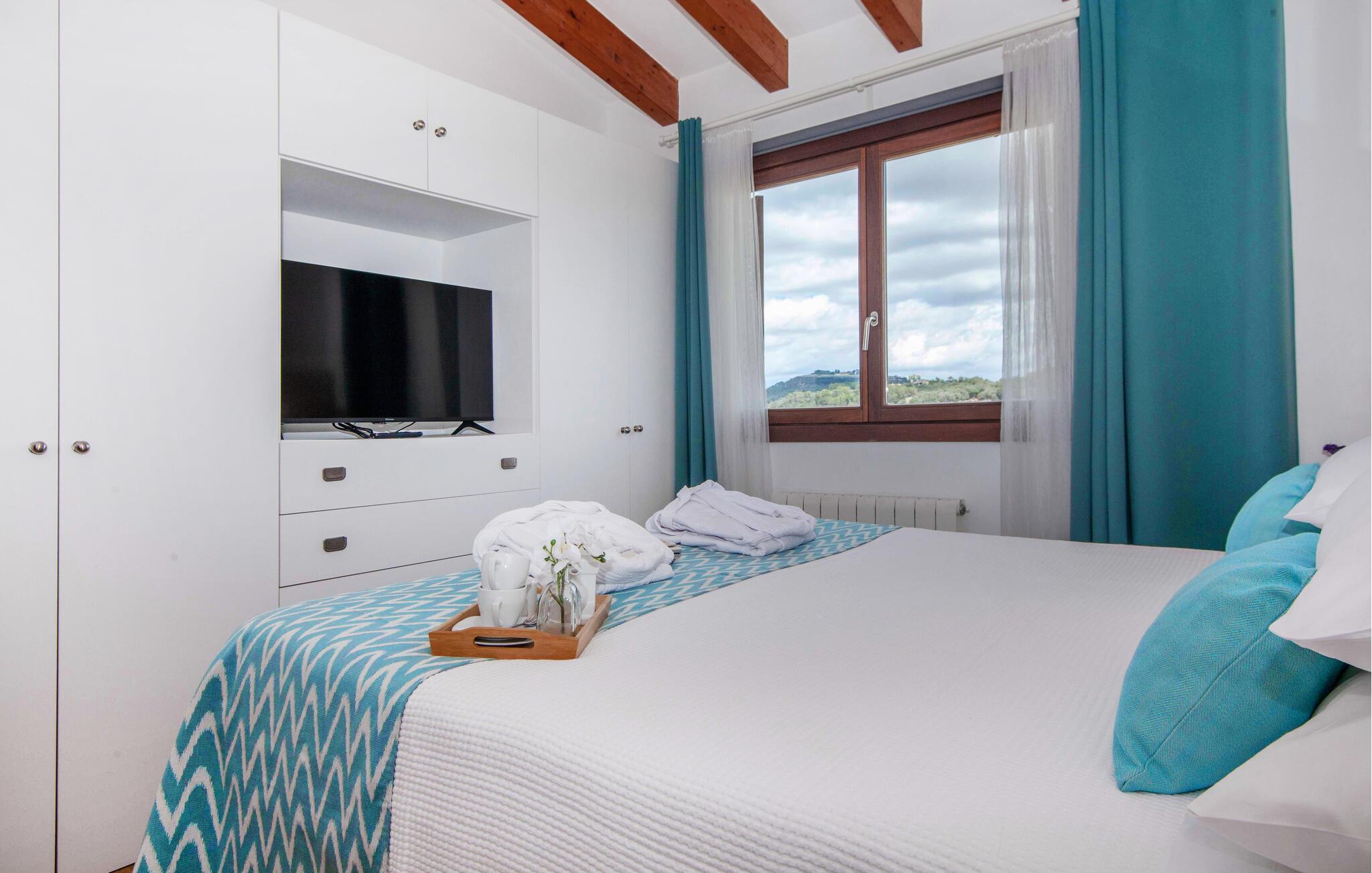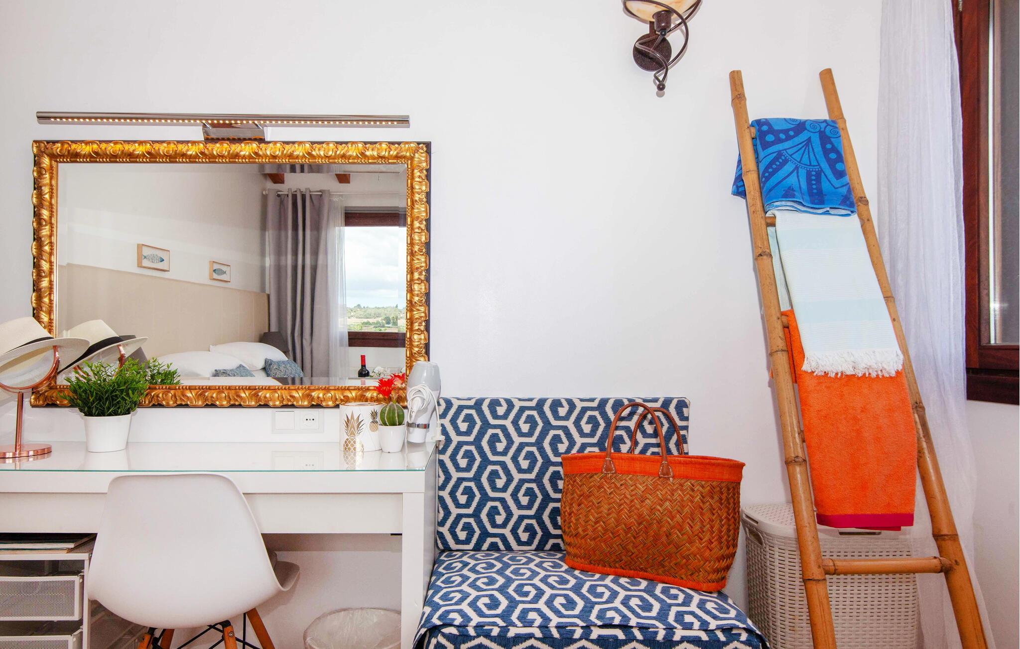 Den ultramoderne "Villa Son Gat de Mallorca", ideel til familier og familiegrupper, er overbevisende over hele linjen. Disse omfatter en oase af kunstgræs, en forfriskende saltvandspool og smukt anlagte kroge i haven, der tilføjer en ny dimension til begrebet afslapning. I kan slappe af på liggestolene eller i skyggen af det maritime fortelt eller ekstra parasoller. Ved siden af poolen ligger det overdækkede udekøkken med dets duftende håndklæder, der ligesom på verandaen ved siden af huset giver beskyttelse mod sol og vind - og bare ser pænt ud. Det udendørs køkken byder på et fantastisk spiseområde til en snack ved poolen eller en forfriskende is i baren. Dette område konkurrerer med den skyggefulde veranda, da der også er en hyggelig spiseplads og lounge, der giver jer et afsondret sted og et afslappende tilflugtssted til sent på aftenen. Spændingen kan kun stige – det eneste I skal gøre er at træde ind i det spændende stuehus. Et åbent område venter på jer, oversvømmet med lys gennem talrige vinduer og med et luftigt loft. Det huser de funktionelle områder køkken, spisestue og stue. En absolut drøm for to familier. Udover den behagelige rummelige fornemmelse kan I også forvente teknisk innovativt udstyr med et komfortabelt udstyret køkken, pilleovn, LCD-tv og Bluetooth-højttaler. Komforten er parret med en chik, tidløs indretningsstil, der ligger et sted mellem design og boheme. Atmosfæren er afslappet og alle møbler er funktionelle. Men det er de små detaljer, der har stor betydning og gør den subtile forskel i de fire hyggelige soveværelser med dobbeltsenge eller to enkeltsenge hver for op til otte personer. De luksuriøse badeværelser med brusekabiner i et cool design er prikken over i'et på "Villa Son Gat Mallorca", som skal leve op til jeres forventninger på alle områder. Den vidunderligt rolige bondegård "Villa Son Gat Mallorca", perfekt til familier med børn, har en stor have med pool og udendørs køkken. Det tilbyder også et bredt panorama over den flade slette i midten af øen op til de majestætiske Tramuntana-bjerge. Ferieboligen ligger tæt på landsbyen Montuïri, hvor I kan shoppe og finde lokale restauranter. Beliggenheden er også ideel med 20 minutters kørsel til Palma og 30 minutter til sydens drømmestrande. Bemærk venligst, at denne ejendom ikke accepterer ungdomsgrupper eller polterabender. En ungdomsgruppe på denne ejendom består af personer på 28 år eller derunder. Book ikke denne ejendom, hvis I er en ungdomsgruppe eller polterabend, da jeres reservation vil blive afvist, når den er booket, hvilket også kan være tilfældet ved ankomst til ejendommen eller under jeres ophold, og I vil ikke modtage en refusion