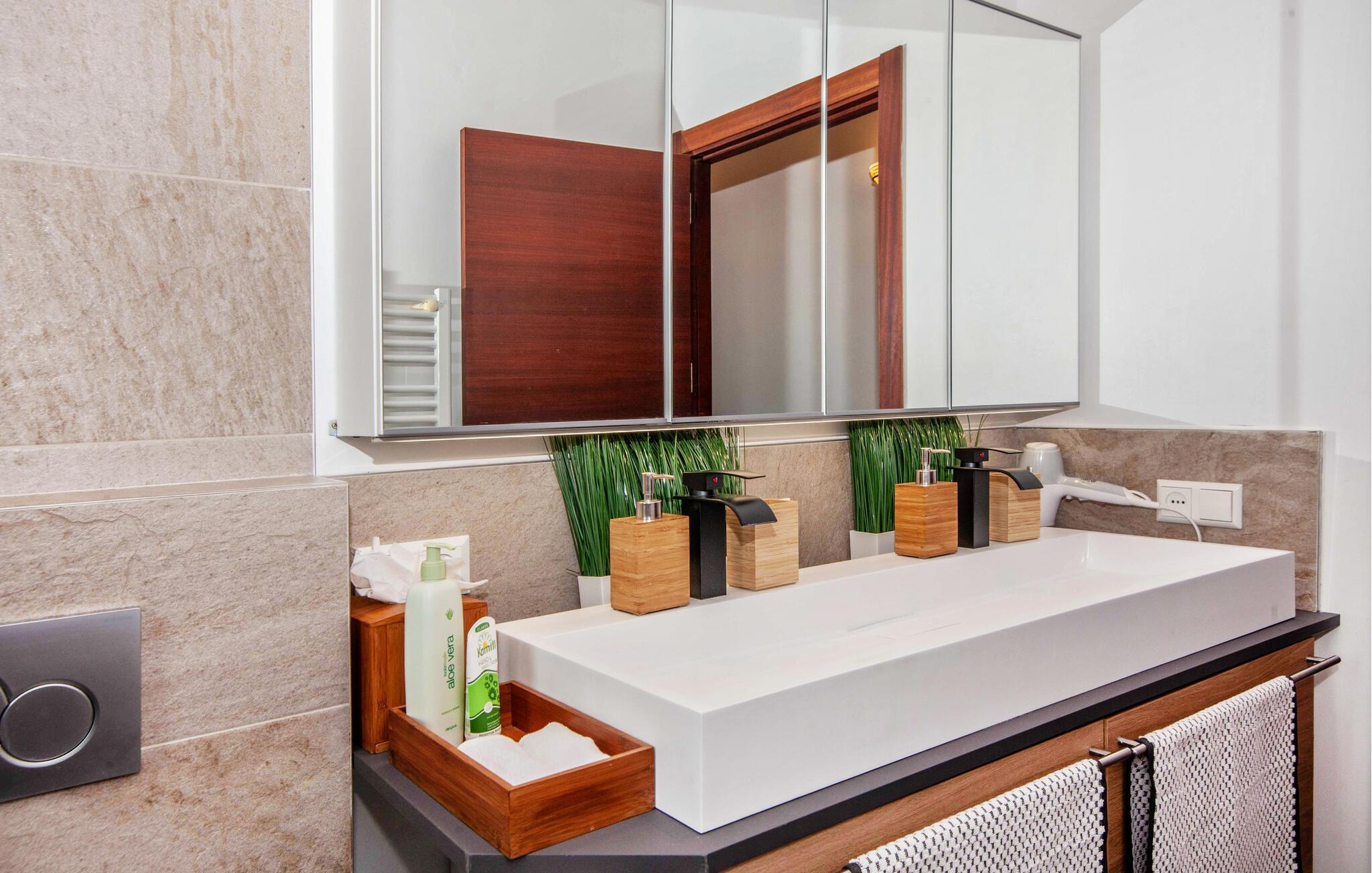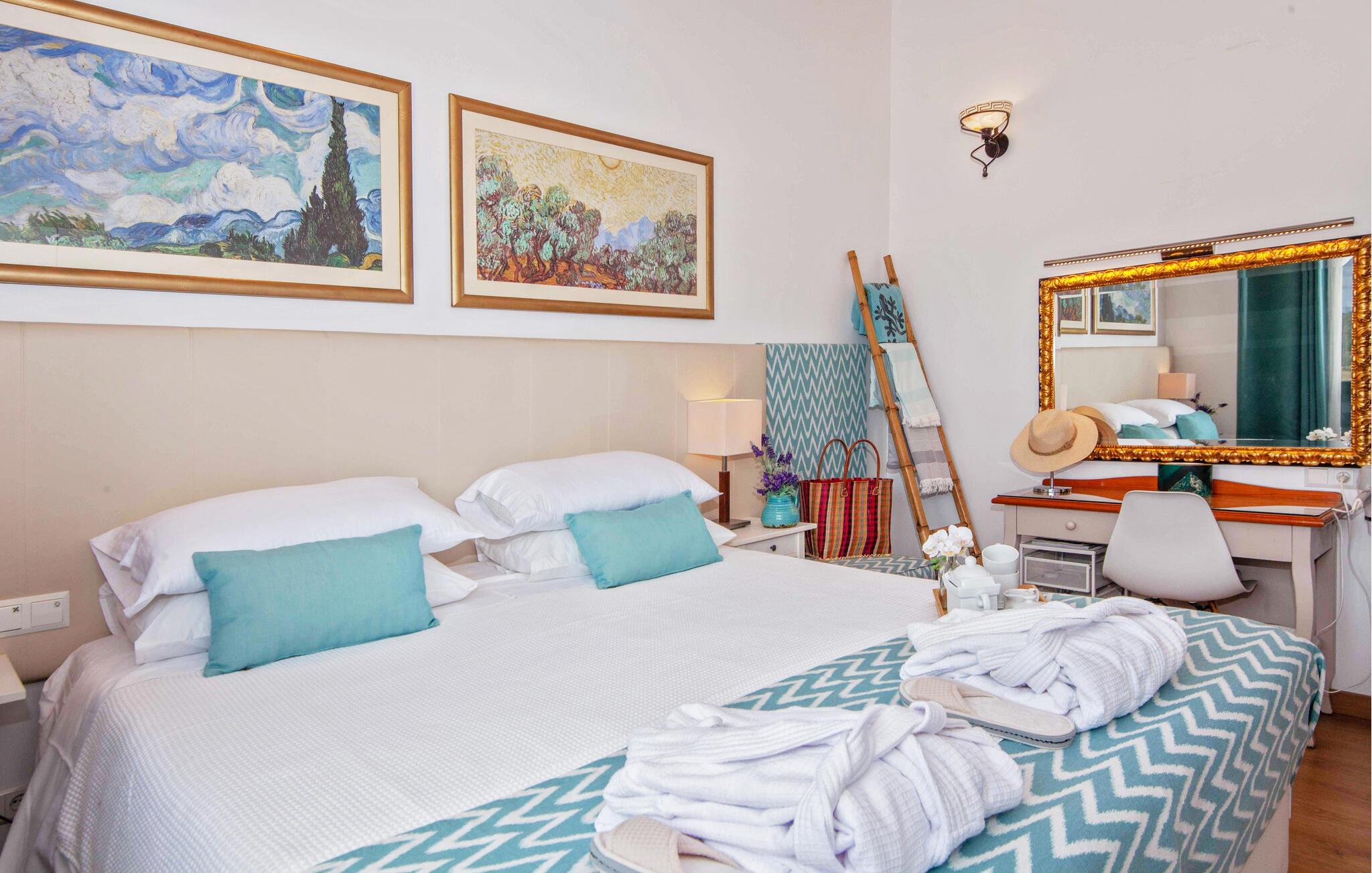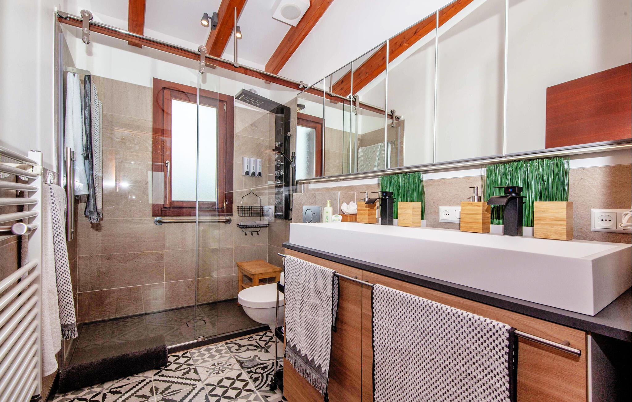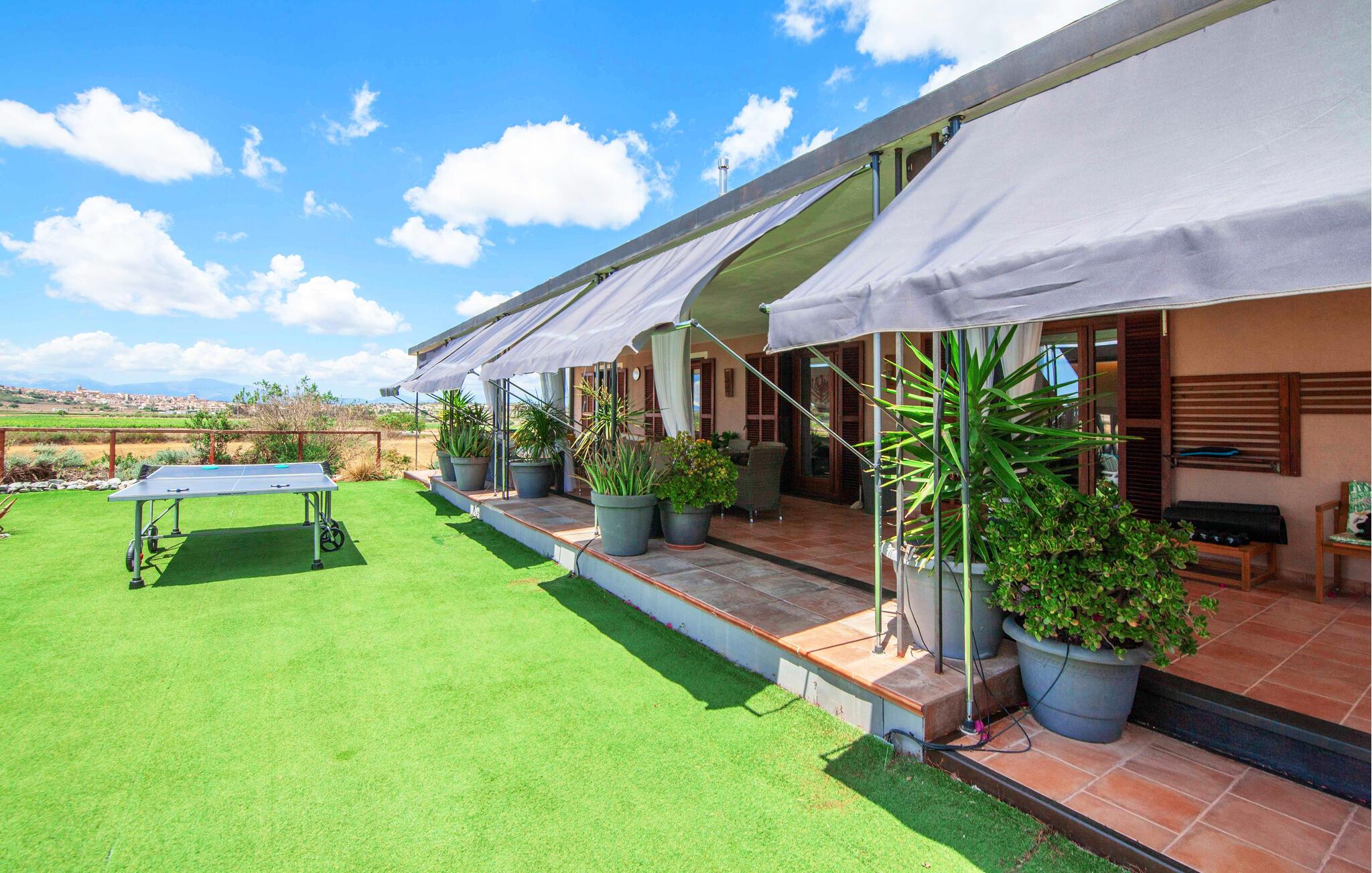 Den ultramoderne "Villa Son Gat de Mallorca", ideel til familier og familiegrupper, er overbevisende over hele linjen. Disse omfatter en oase af kunstgræs, en forfriskende saltvandspool og smukt anlagte kroge i haven, der tilføjer en ny dimension til begrebet afslapning. I kan slappe af på liggestolene eller i skyggen af det maritime fortelt eller ekstra parasoller. Ved siden af poolen ligger det overdækkede udekøkken med dets duftende håndklæder, der ligesom på verandaen ved siden af huset giver beskyttelse mod sol og vind - og bare ser pænt ud. Det udendørs køkken byder på et fantastisk spiseområde til en snack ved poolen eller en forfriskende is i baren. Dette område konkurrerer med den skyggefulde veranda, da der også er en hyggelig spiseplads og lounge, der giver jer et afsondret sted og et afslappende tilflugtssted til sent på aftenen. Spændingen kan kun stige – det eneste I skal gøre er at træde ind i det spændende stuehus. Et åbent område venter på jer, oversvømmet med lys gennem talrige vinduer og med et luftigt loft. Det huser de funktionelle områder køkken, spisestue og stue. En absolut drøm for to familier. Udover den behagelige rummelige fornemmelse kan I også forvente teknisk innovativt udstyr med et komfortabelt udstyret køkken, pilleovn, LCD-tv og Bluetooth-højttaler. Komforten er parret med en chik, tidløs indretningsstil, der ligger et sted mellem design og boheme. Atmosfæren er afslappet og alle møbler er funktionelle. Men det er de små detaljer, der har stor betydning og gør den subtile forskel i de fire hyggelige soveværelser med dobbeltsenge eller to enkeltsenge hver for op til otte personer. De luksuriøse badeværelser med brusekabiner i et cool design er prikken over i'et på "Villa Son Gat Mallorca", som skal leve op til jeres forventninger på alle områder. Den vidunderligt rolige bondegård "Villa Son Gat Mallorca", perfekt til familier med børn, har en stor have med pool og udendørs køkken. Det tilbyder også et bredt panorama over den flade slette i midten af øen op til de majestætiske Tramuntana-bjerge. Ferieboligen ligger tæt på landsbyen Montuïri, hvor I kan shoppe og finde lokale restauranter. Beliggenheden er også ideel med 20 minutters kørsel til Palma og 30 minutter til sydens drømmestrande. Bemærk venligst, at denne ejendom ikke accepterer ungdomsgrupper eller polterabender. En ungdomsgruppe på denne ejendom består af personer på 28 år eller derunder. Book ikke denne ejendom, hvis I er en ungdomsgruppe eller polterabend, da jeres reservation vil blive afvist, når den er booket, hvilket også kan være tilfældet ved ankomst til ejendommen eller under jeres ophold, og I vil ikke modtage en refusion