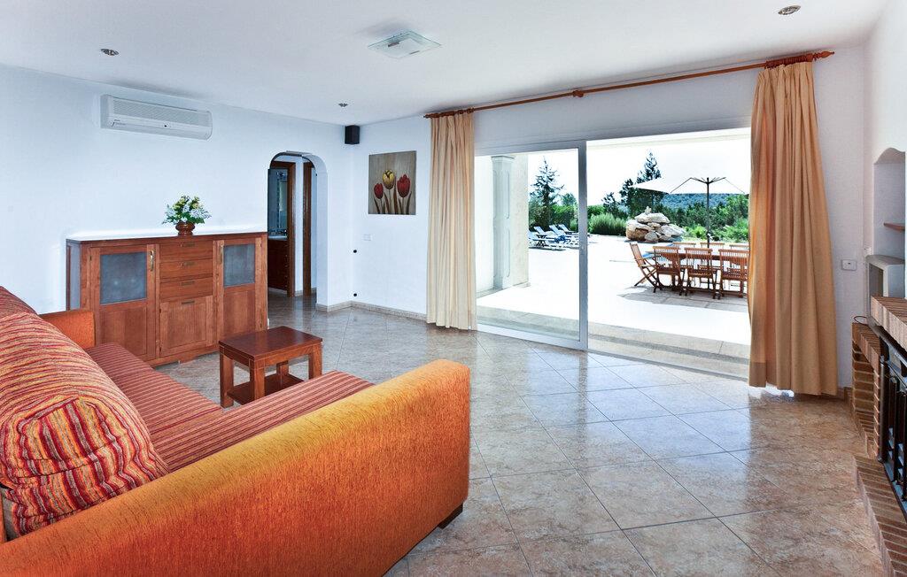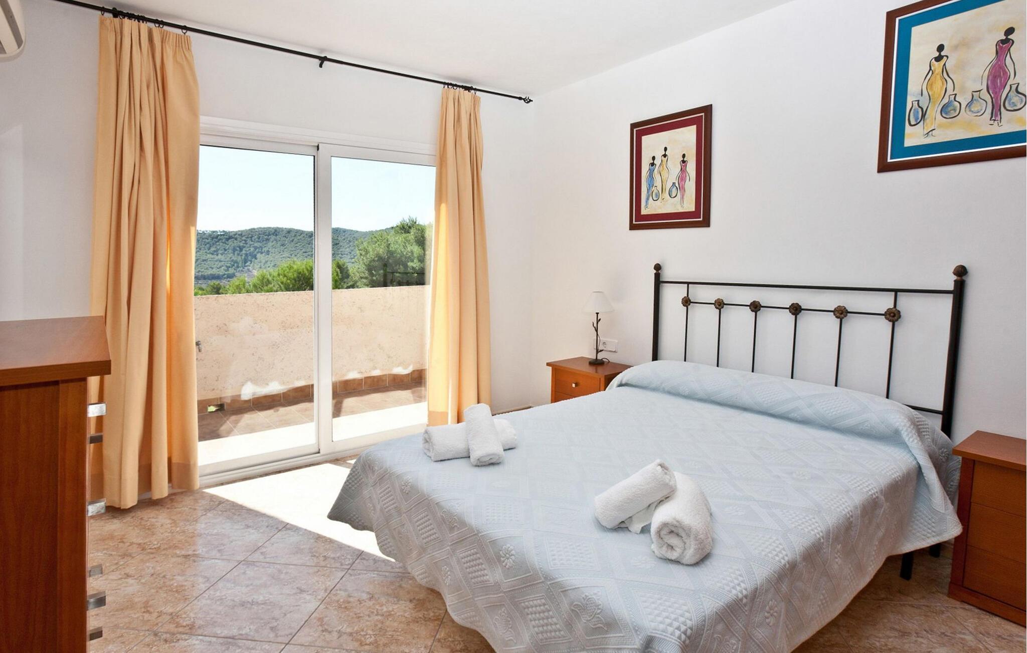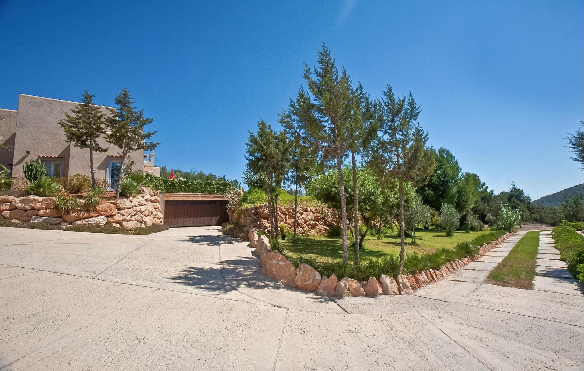 Denne moderne villa er ideelt beliggende mellem Ibiza, San José og Cala Jondal på en 7.000 m² stor grund med elektrisk port. Ejendommen er omgivet af frodige haver og vegetation og tilbyder en rolig atmosfære til at slappe af. Dette er et Fincallorca feriehus. Villaen er fordelt på to plan og har i alt 4 soveværelser og 3 badeværelser inde i villaen og 1 ekstra badeværelse udenfor. I stueetagen finder I to soveværelser med to enkeltsenge, et badeværelse med badekar og et fuldt udstyret køkken med moderne apparater såsom køleskab med fryser, opvaskemaskine, ovn, mikroovn, keramisk kogeplade, brødrister, elkedel, vaskemaskine og tørretumbler. Køkkenet åbner direkte ud i haven og har et bord til fire personer. Stuen med TV, stereoanlæg og gratis WiFi giver direkte adgang til poolen. På øverste etage er der to soveværelser med dobbeltsenge (1,80m & 1,50m) og to badeværelser: et med badekar og et med bruser. Aircondition er tilgængeligt i alle soveværelser og stue for maksimal komfort. Udenfor har villaen en infinity-pool omgivet af en smuk have, en spiseplads med bord til 8 personer, en grill og et ekstra badeværelse med bruser. Der tilbydes fuld rengøring hver 7. nat, inklusive skift af sengelinned og håndklæder.