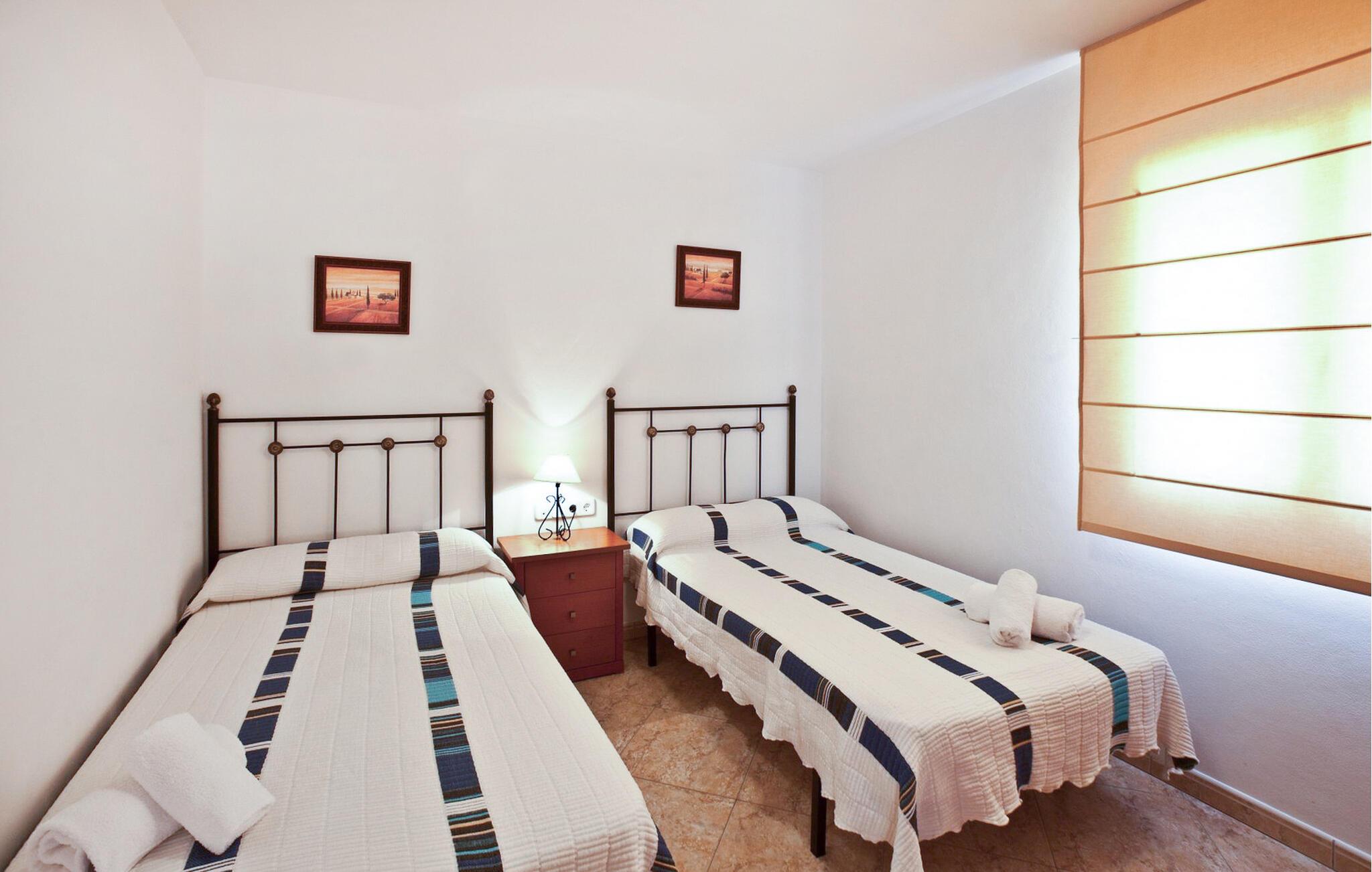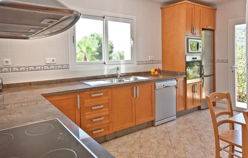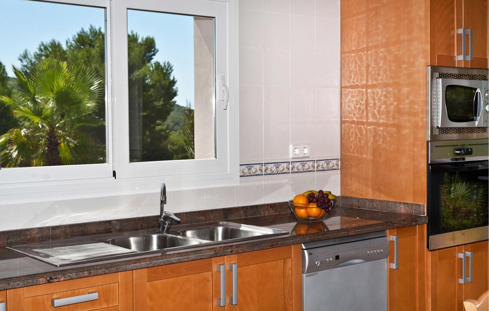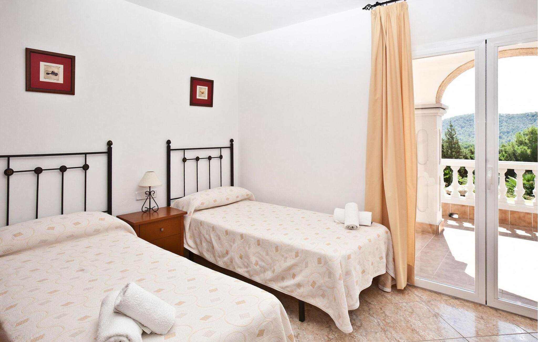 Denne moderne villa er ideelt beliggende mellem Ibiza, San José og Cala Jondal på en 7.000 m² stor grund med elektrisk port. Ejendommen er omgivet af frodige haver og vegetation og tilbyder en rolig atmosfære til at slappe af. Dette er et Fincallorca feriehus. Villaen er fordelt på to plan og har i alt 4 soveværelser og 3 badeværelser inde i villaen og 1 ekstra badeværelse udenfor. I stueetagen finder I to soveværelser med to enkeltsenge, et badeværelse med badekar og et fuldt udstyret køkken med moderne apparater såsom køleskab med fryser, opvaskemaskine, ovn, mikroovn, keramisk kogeplade, brødrister, elkedel, vaskemaskine og tørretumbler. Køkkenet åbner direkte ud i haven og har et bord til fire personer. Stuen med TV, stereoanlæg og gratis WiFi giver direkte adgang til poolen. På øverste etage er der to soveværelser med dobbeltsenge (1,80m & 1,50m) og to badeværelser: et med badekar og et med bruser. Aircondition er tilgængeligt i alle soveværelser og stue for maksimal komfort. Udenfor har villaen en infinity-pool omgivet af en smuk have, en spiseplads med bord til 8 personer, en grill og et ekstra badeværelse med bruser. Der tilbydes fuld rengøring hver 7. nat, inklusive skift af sengelinned og håndklæder.