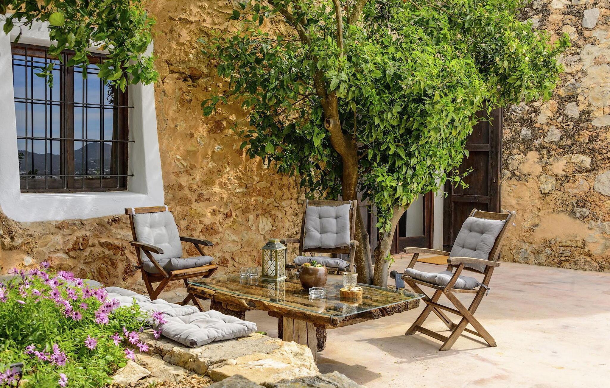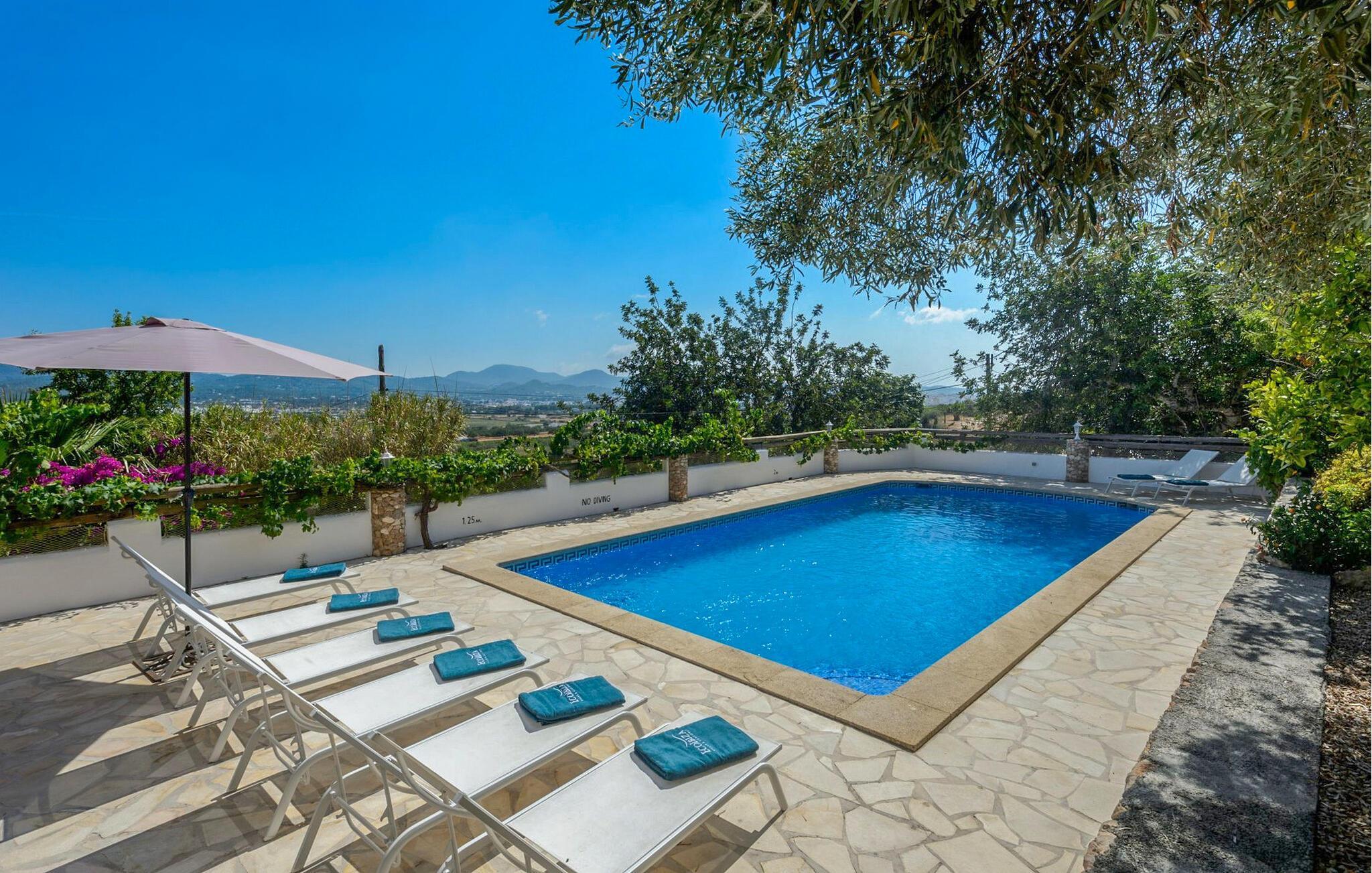 Dette fantastiske, traditionelle ibizaanske bondehus med et landligt forsvarstårn fra det 17. århundrede er et smukt eksempel på autentisk ø-arkitektur. Tykke hvide vægge og højt til loftet lavet af ibizaansk enebærtræ skaber en kølig, rummelig atmosfære. Den nederste etage har en stor stue med satellit-tv og stereoanlæg og giver direkte adgang til terrasse, pool og grillplads. Ved siden af stuen finder I to soveværelser med 2 enkeltsenge, et fuldt udstyret køkken med moderne faciliteter såsom opvaskemaskine og vaskemaskine og to badeværelser - det ene med bruser, det andet med badekar. Der er yderligere to soveværelser ovenpå - det ene med to enkeltsenge og det andet med en dobbeltseng. Øverst har en stor terrasse med chill-out sofaer en fantastisk udsigt over det omkringliggende landskab, perfekt til at nyde både solopgang og solnedgang. Udenfor er det indbydende poolområde udstyret med en udendørs bruser, liggestole og to niveauer af haveområde, herunder en chill-out zone, spiseplads og grill. Med parkering til to biler, aircondition i alle soveværelser og loftsventilatorer for ekstra komfort, tilbyder dette bondehus både charme og bekvemmelighed til et afslappende Ibiza-retræte.