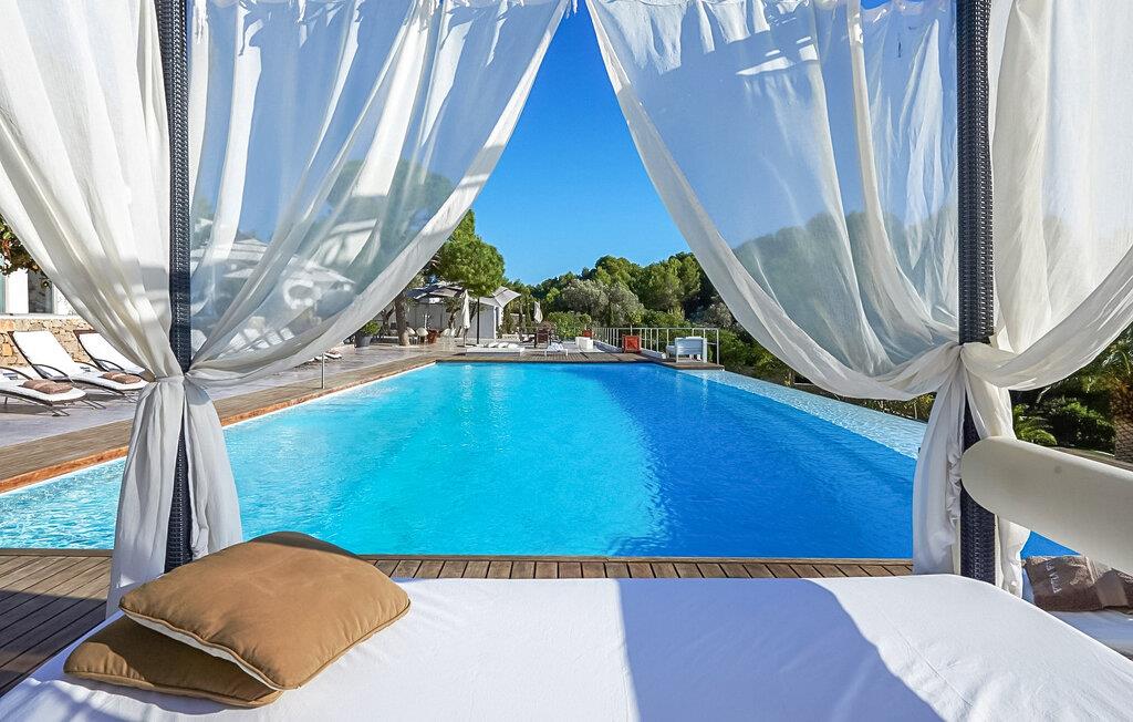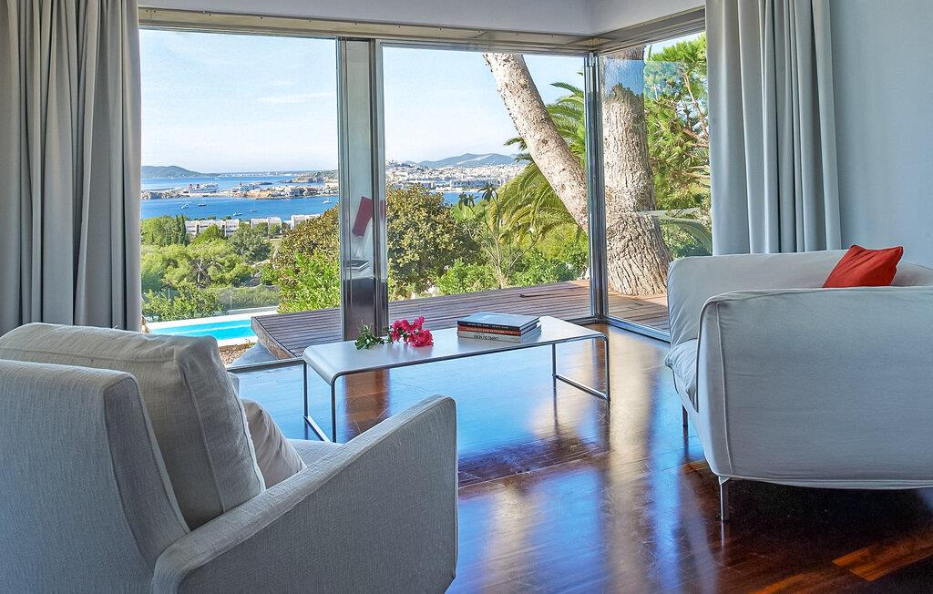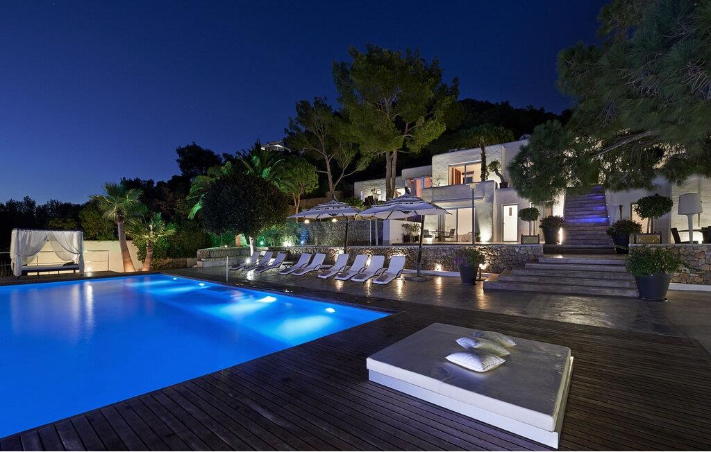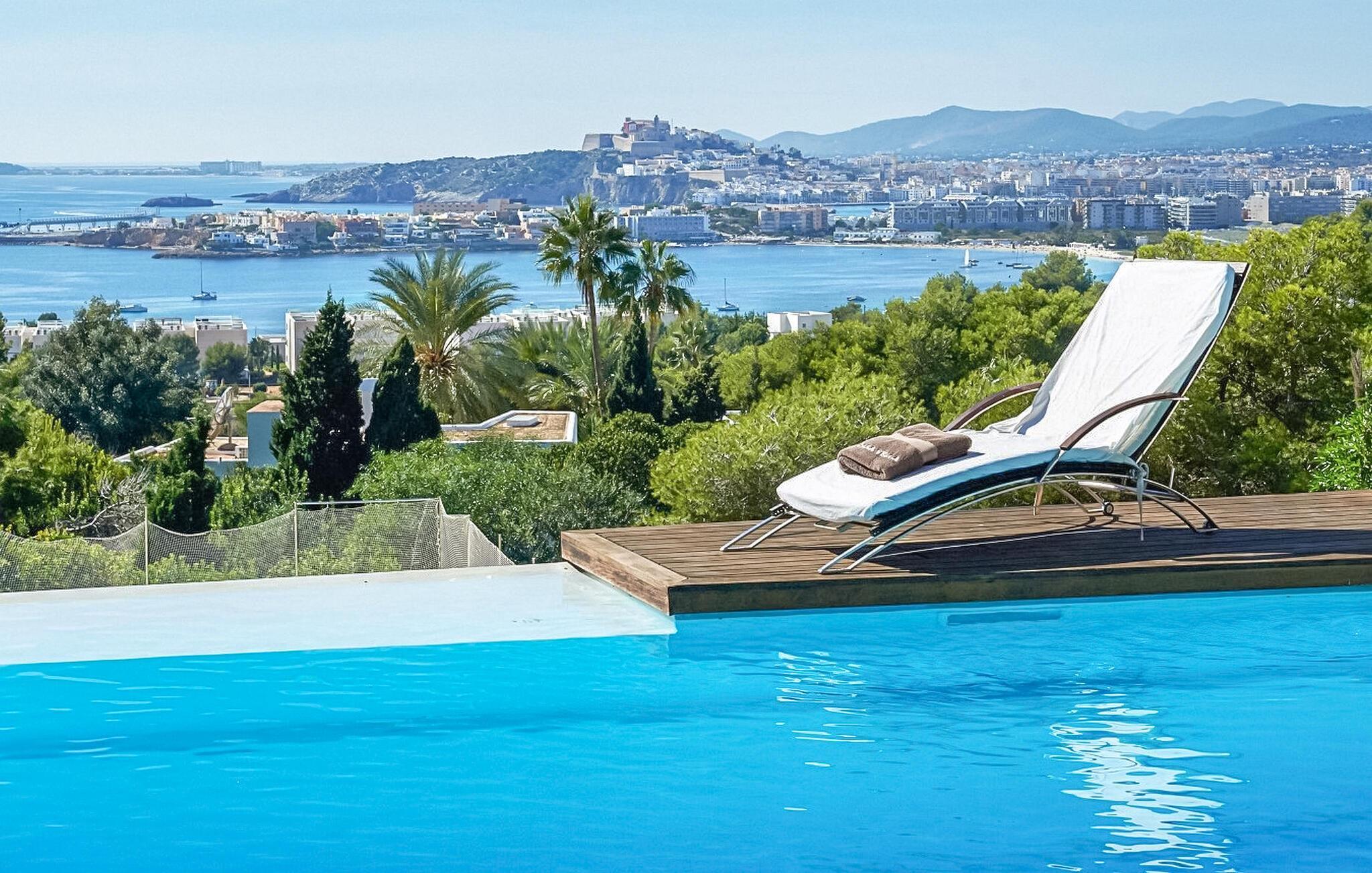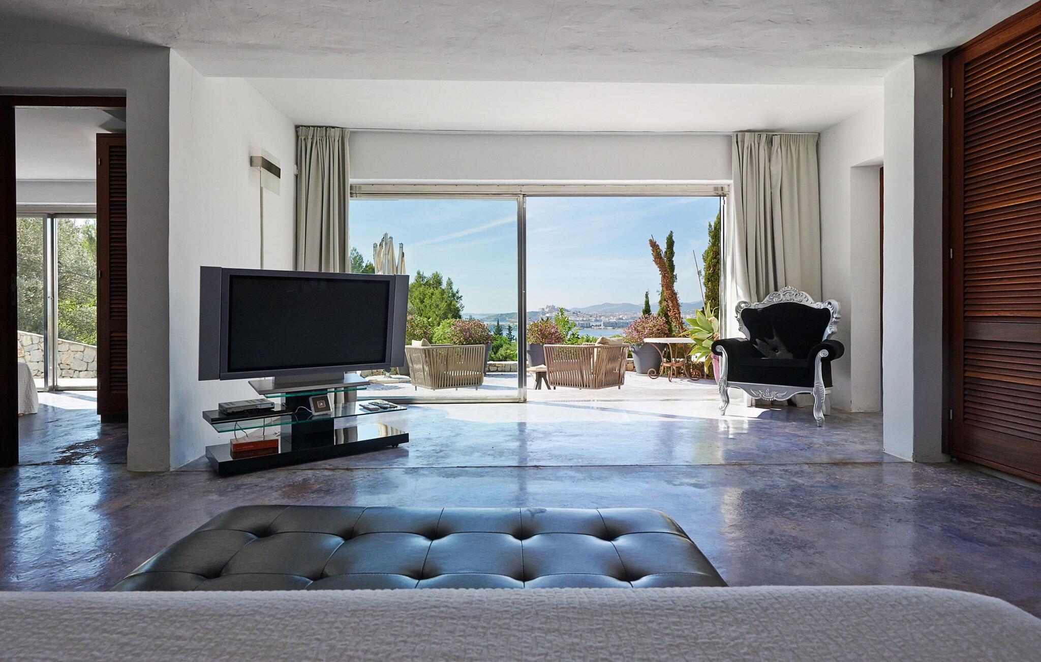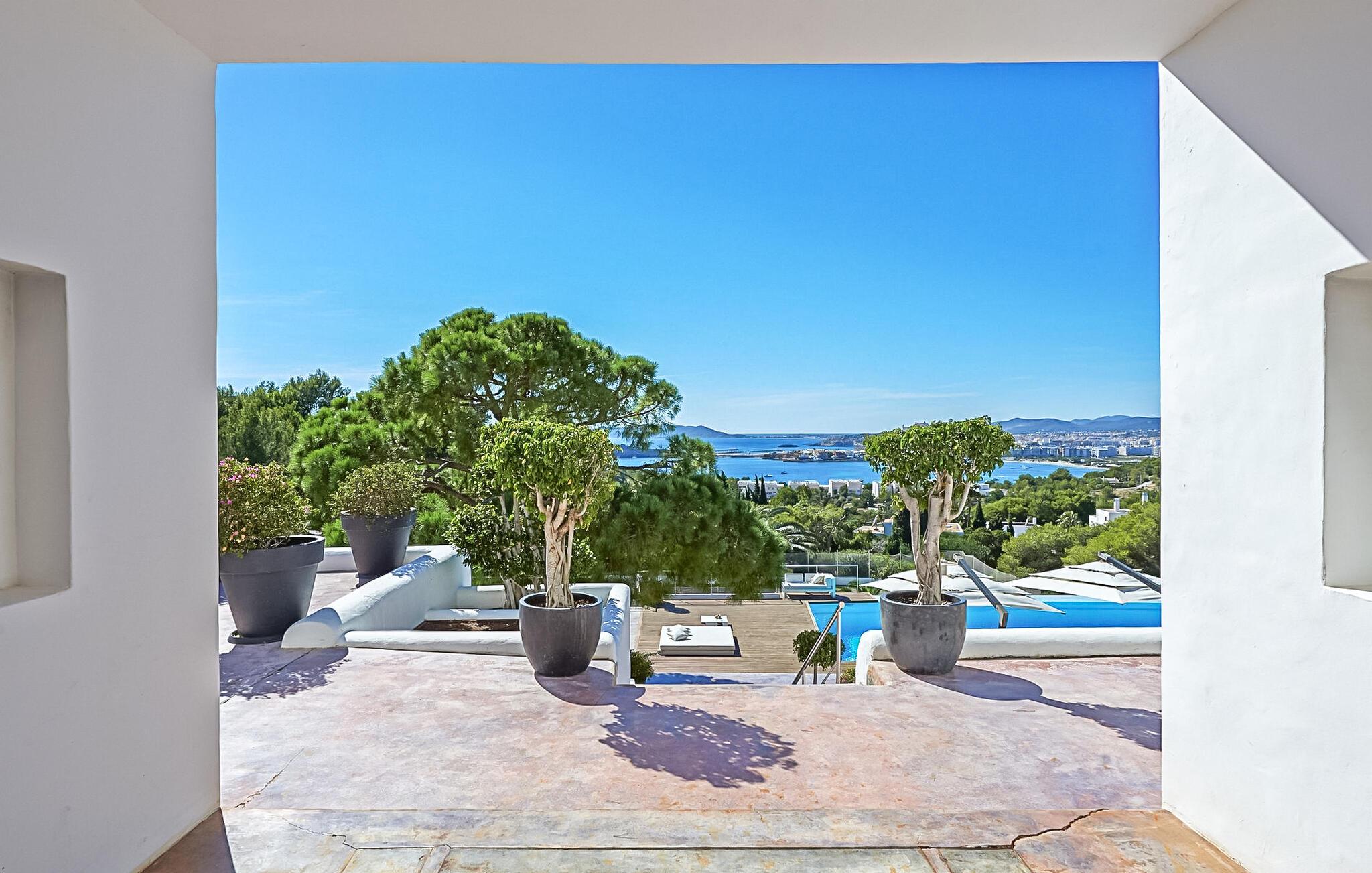 Can Pep Simó urbanisering, 5 minutter i bil fra byens centrum og lystbådehavnene på Ibiza og Marina Botafoch. Villaen i middelhavsstil med moderne detaljer og indretning er sydvendt og byder på en vidunderlig panoramaudsigt over havet, Dalt Vila, Talamanca-bugten og Formentera i baggrunden. De nærmeste strande er Talamanca og S'Estanyol, begge omkring 5-10 minutter væk i bil. Dette er et feriehus i Fincallorca. LAYOUT: En trædør åbner ud til en veranda, hvorfra vi allerede kan betragte den storslåede udsigt. Fra terrassen er der adgang til de forskellige rum, der udgør huset, alle uafhængige af hinanden og fordelt på forskellige niveauer. INDGANG Til højre er der 2 soveværelser med dobbeltsenge (begge med 2 enkeltsenge), det ene med eget badeværelse og det andet med brusebad. Til venstre er der to soveværelser med dobbeltsenge, en master suite og et soveværelse med dobbeltseng med brusebad og tv. LAVERE NIVEAU 2 dobbeltværelser (med enkeltsenge) hver med brusebad. Stor stue med 3 komfortable sofaer og udgang til terrasse. TV-hjørne med indbyggede sofaer og hynder samt pejs. Lille spisestue i forbindelse med køkkenet med udsigt, meget rummelig og udstyret: 5-brænder keramisk kogeplade, 90 cm elektrisk ovn, 2 køleskabe, opvaskemaskine, Nespresso kaffemaskine. Stor åben terrasse med spiseplads i skyggen af en fyrreskov. Privat tennisbane. Rengøring: 2 timer om dagen, 6 dage om ugen.