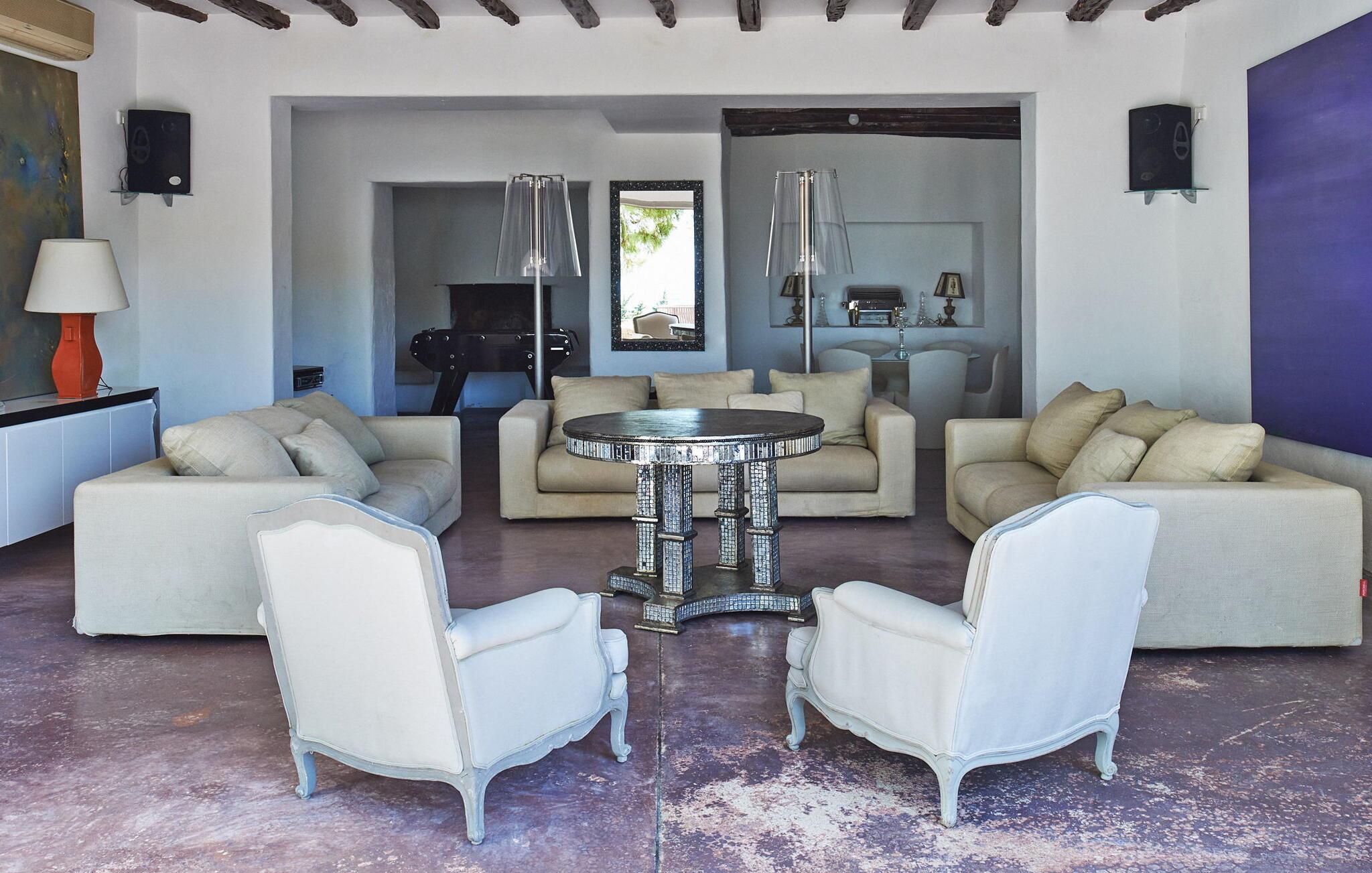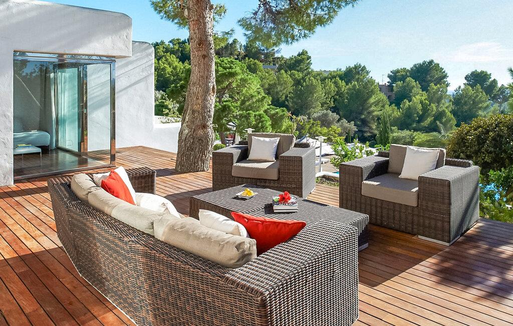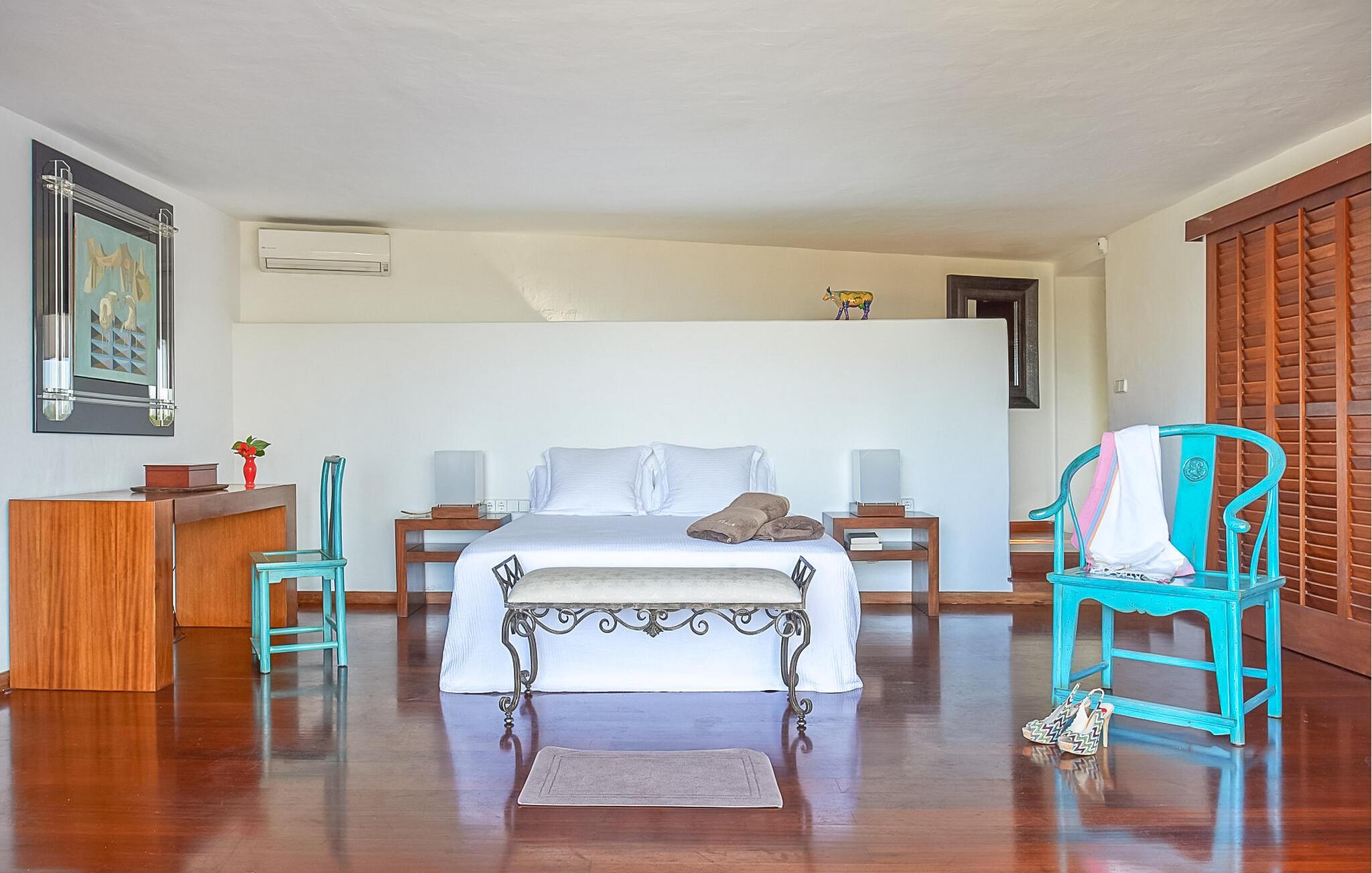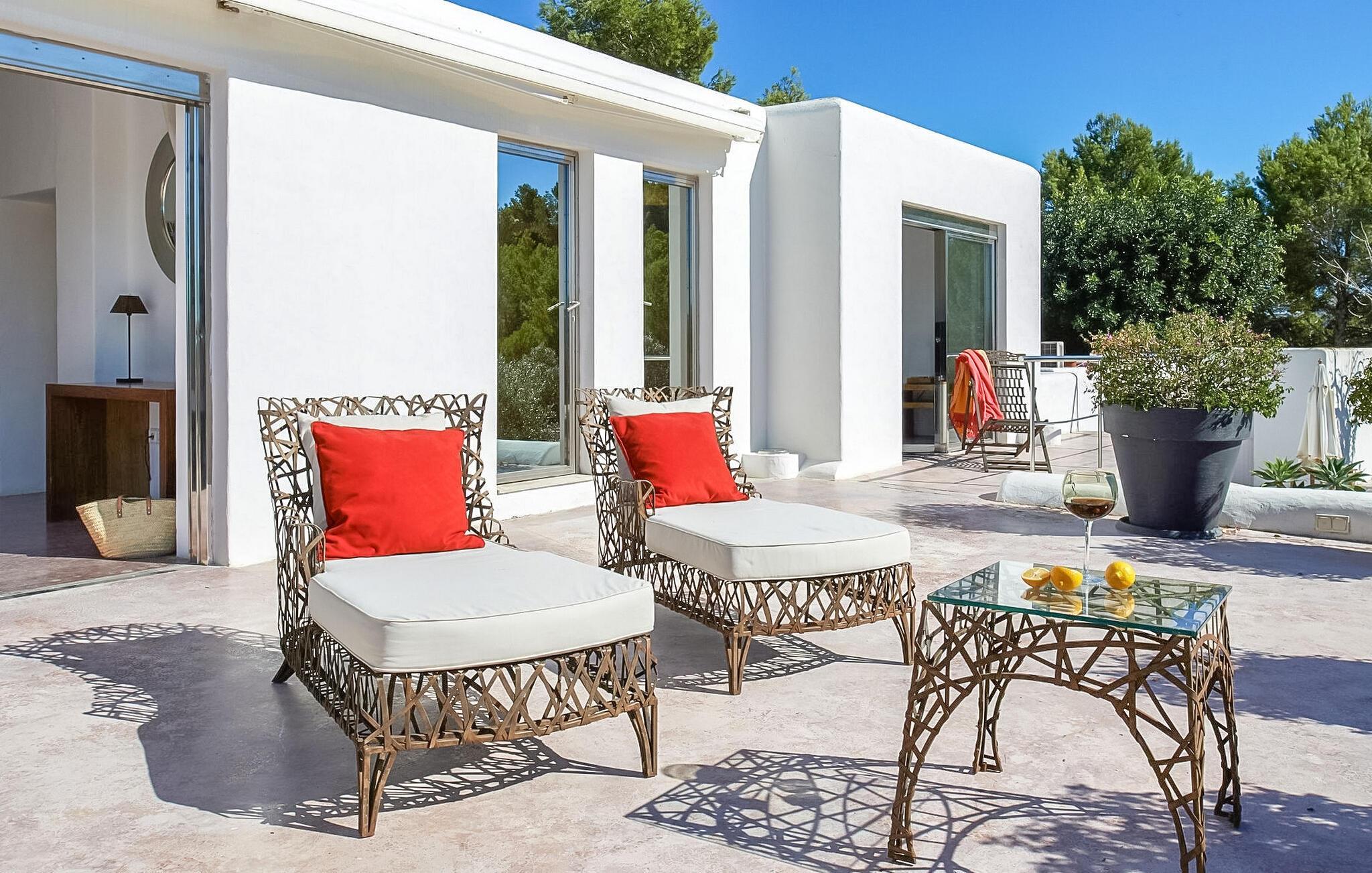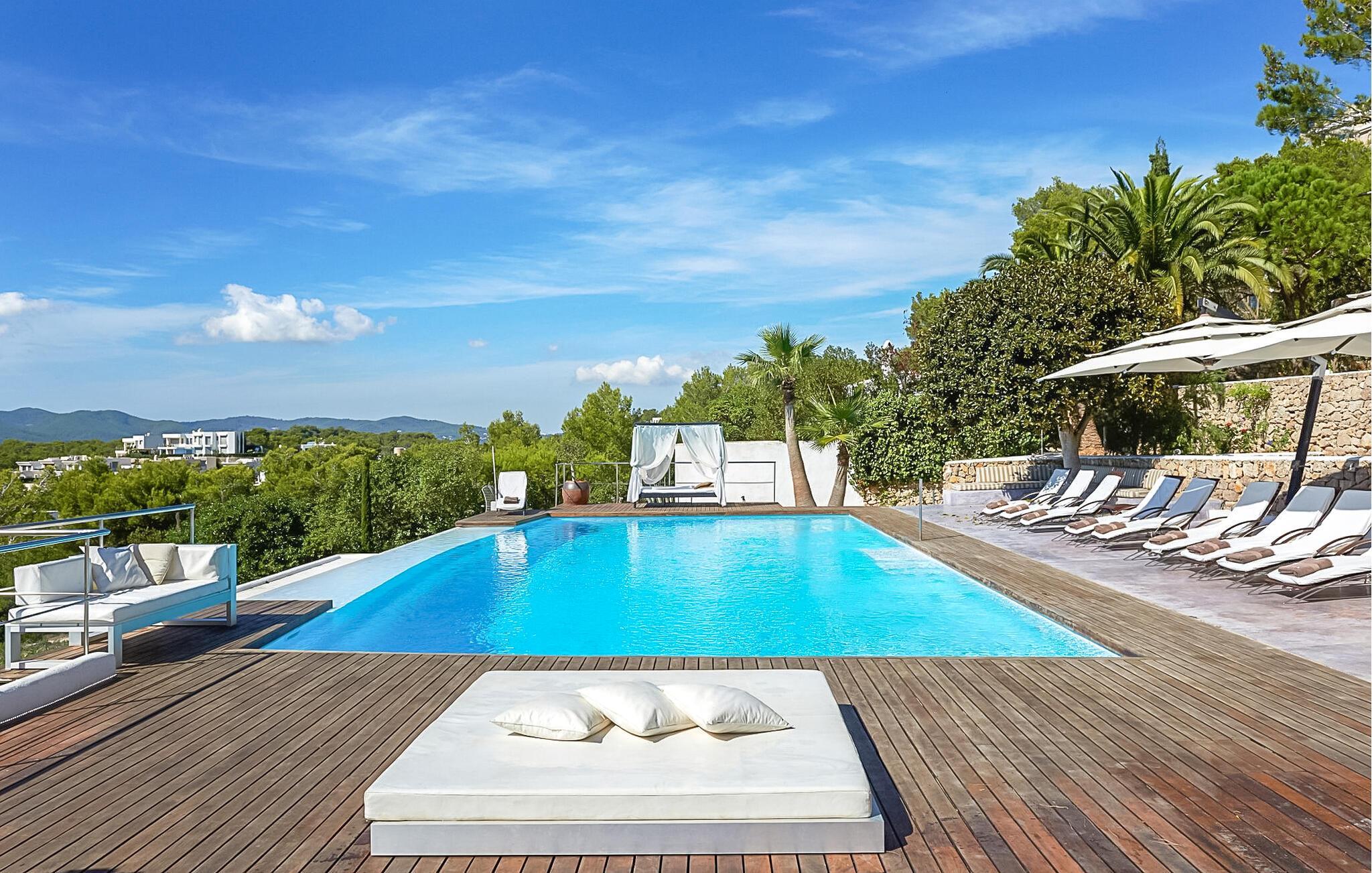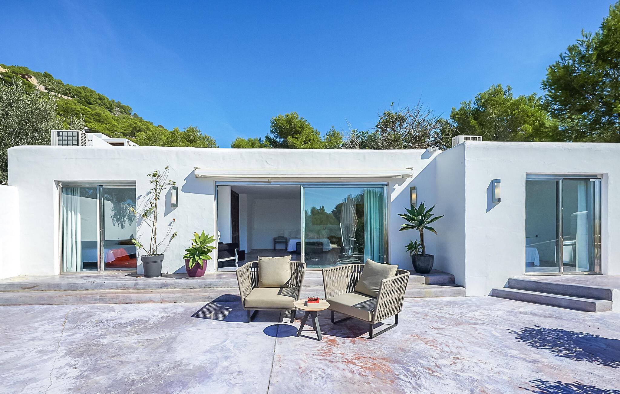 Can Pep Simó urbanisering, 5 minutter i bil fra byens centrum og lystbådehavnene på Ibiza og Marina Botafoch. Villaen i middelhavsstil med moderne detaljer og indretning er sydvendt og byder på en vidunderlig panoramaudsigt over havet, Dalt Vila, Talamanca-bugten og Formentera i baggrunden. De nærmeste strande er Talamanca og S'Estanyol, begge omkring 5-10 minutter væk i bil. Dette er et feriehus i Fincallorca. LAYOUT: En trædør åbner ud til en veranda, hvorfra vi allerede kan betragte den storslåede udsigt. Fra terrassen er der adgang til de forskellige rum, der udgør huset, alle uafhængige af hinanden og fordelt på forskellige niveauer. INDGANG Til højre er der 2 soveværelser med dobbeltsenge (begge med 2 enkeltsenge), det ene med eget badeværelse og det andet med brusebad. Til venstre er der to soveværelser med dobbeltsenge, en master suite og et soveværelse med dobbeltseng med brusebad og tv. LAVERE NIVEAU 2 dobbeltværelser (med enkeltsenge) hver med brusebad. Stor stue med 3 komfortable sofaer og udgang til terrasse. TV-hjørne med indbyggede sofaer og hynder samt pejs. Lille spisestue i forbindelse med køkkenet med udsigt, meget rummelig og udstyret: 5-brænder keramisk kogeplade, 90 cm elektrisk ovn, 2 køleskabe, opvaskemaskine, Nespresso kaffemaskine. Stor åben terrasse med spiseplads i skyggen af en fyrreskov. Privat tennisbane. Rengøring: 2 timer om dagen, 6 dage om ugen.