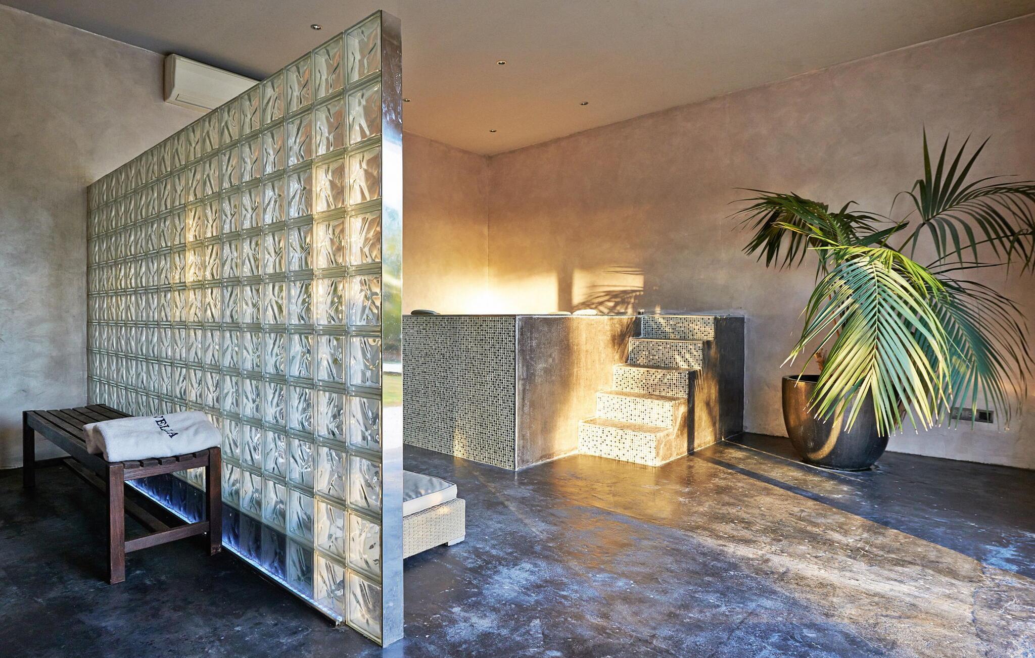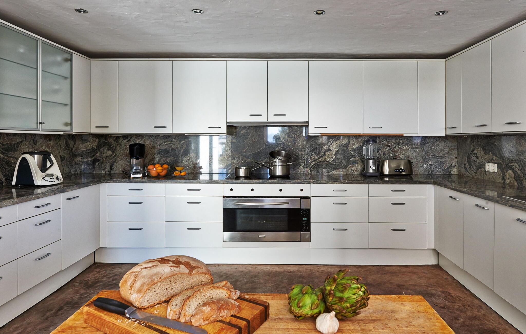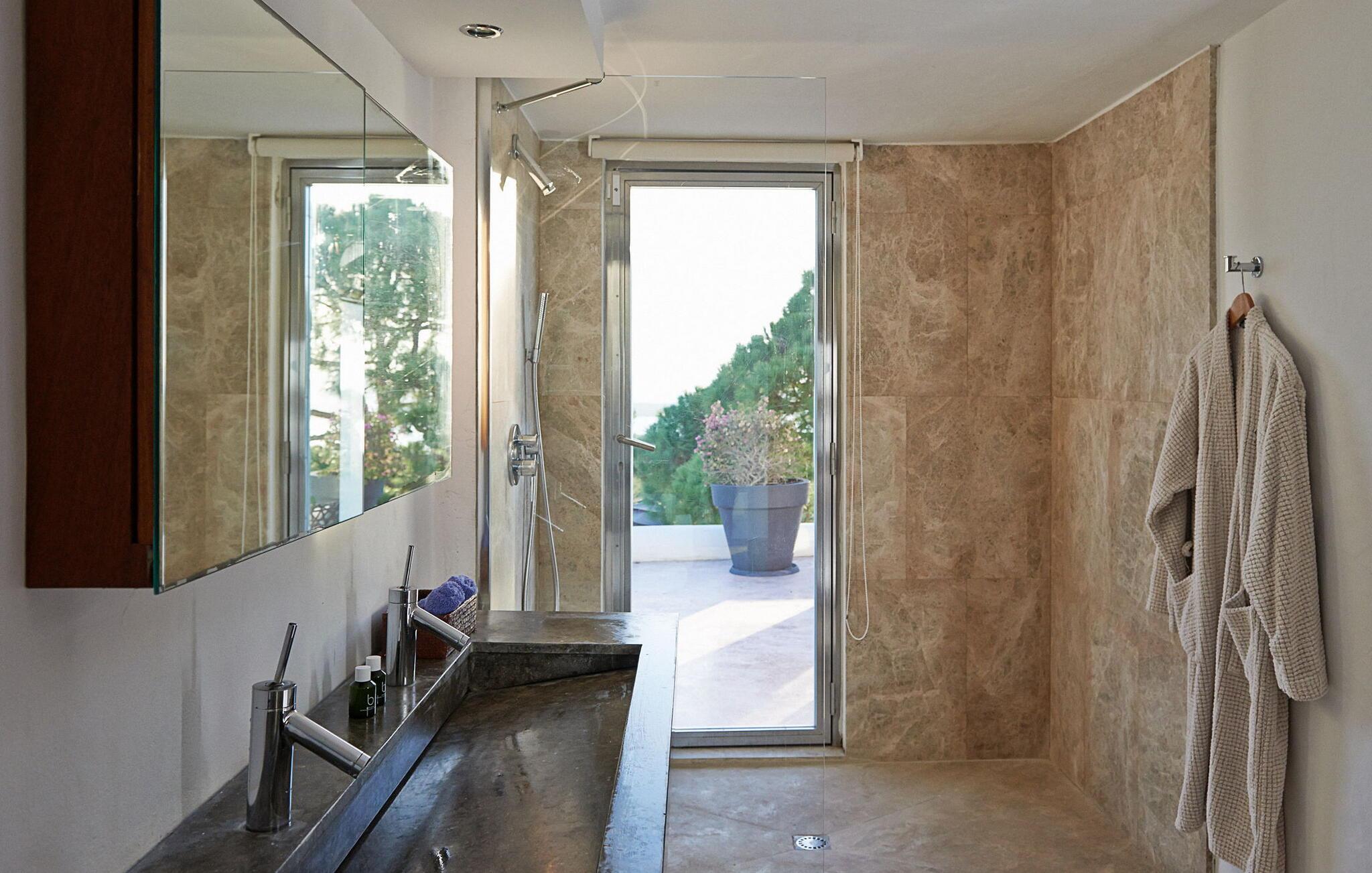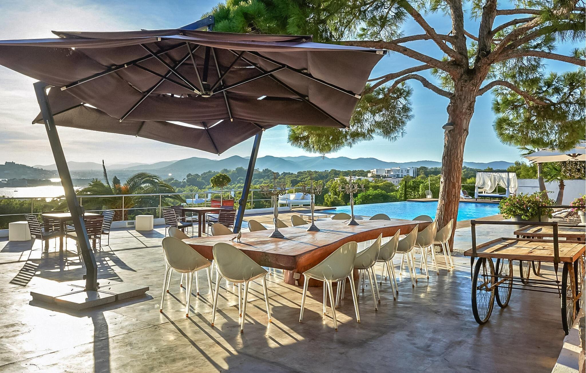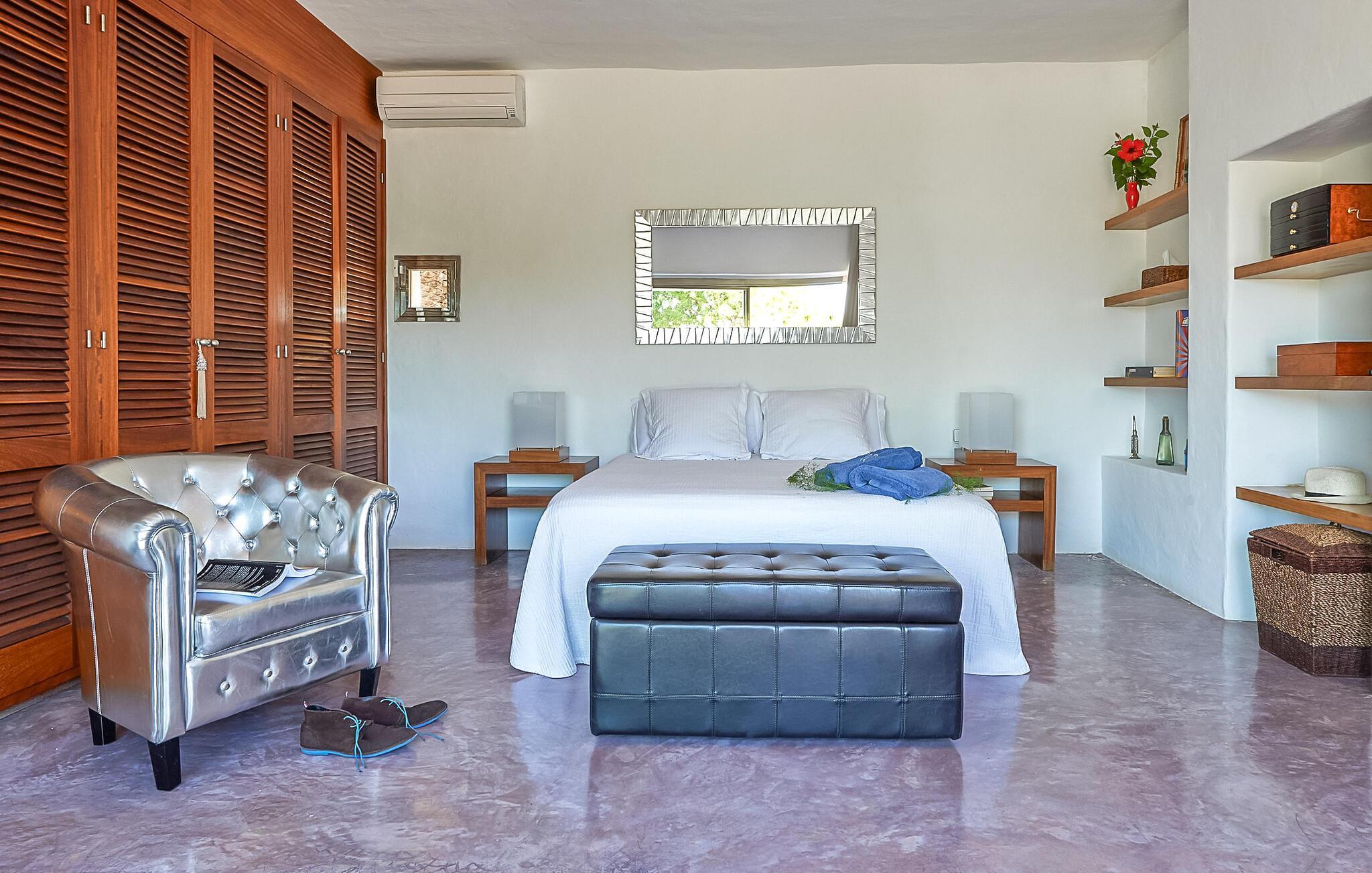 Can Pep Simó urbanisering, 5 minutter i bil fra byens centrum og lystbådehavnene på Ibiza og Marina Botafoch. Villaen i middelhavsstil med moderne detaljer og indretning er sydvendt og byder på en vidunderlig panoramaudsigt over havet, Dalt Vila, Talamanca-bugten og Formentera i baggrunden. De nærmeste strande er Talamanca og S'Estanyol, begge omkring 5-10 minutter væk i bil. Dette er et feriehus i Fincallorca. LAYOUT: En trædør åbner ud til en veranda, hvorfra vi allerede kan betragte den storslåede udsigt. Fra terrassen er der adgang til de forskellige rum, der udgør huset, alle uafhængige af hinanden og fordelt på forskellige niveauer. INDGANG Til højre er der 2 soveværelser med dobbeltsenge (begge med 2 enkeltsenge), det ene med eget badeværelse og det andet med brusebad. Til venstre er der to soveværelser med dobbeltsenge, en master suite og et soveværelse med dobbeltseng med brusebad og tv. LAVERE NIVEAU 2 dobbeltværelser (med enkeltsenge) hver med brusebad. Stor stue med 3 komfortable sofaer og udgang til terrasse. TV-hjørne med indbyggede sofaer og hynder samt pejs. Lille spisestue i forbindelse med køkkenet med udsigt, meget rummelig og udstyret: 5-brænder keramisk kogeplade, 90 cm elektrisk ovn, 2 køleskabe, opvaskemaskine, Nespresso kaffemaskine. Stor åben terrasse med spiseplads i skyggen af en fyrreskov. Privat tennisbane. Rengøring: 2 timer om dagen, 6 dage om ugen.