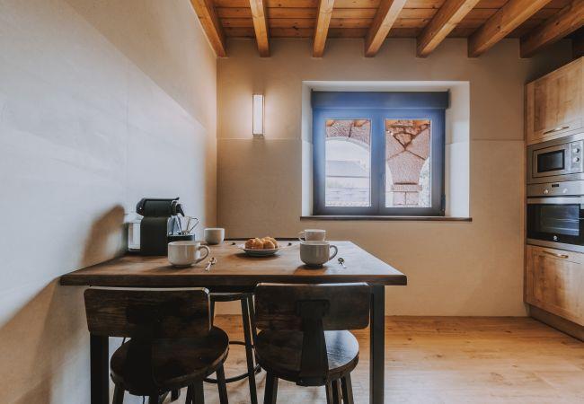 Modern fully equipped kitchen: oven, fridge, microwave, oven. It also has a table, ideal for breakfast.