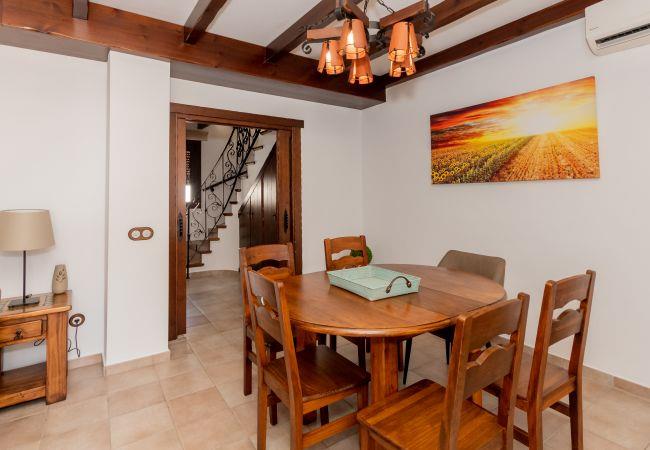 With capacity for 6 people in 4 rooms, the property is spacious and bright, with a design that combines rural elements with modern comforts. On the ground floor, you will find a spacious entrance hall that connects to a cosy dining room equipped with air conditioning and fireplace, perfect for family gatherings and moments of relaxation. The independent kitchen, very bright and with modern appliances such as induction hob, fridge, microwave, oven, dishwasher and coffee maker, has direct access to a covered and very pleasant rear patio, ideal for outdoor lunches or reading afternoons.