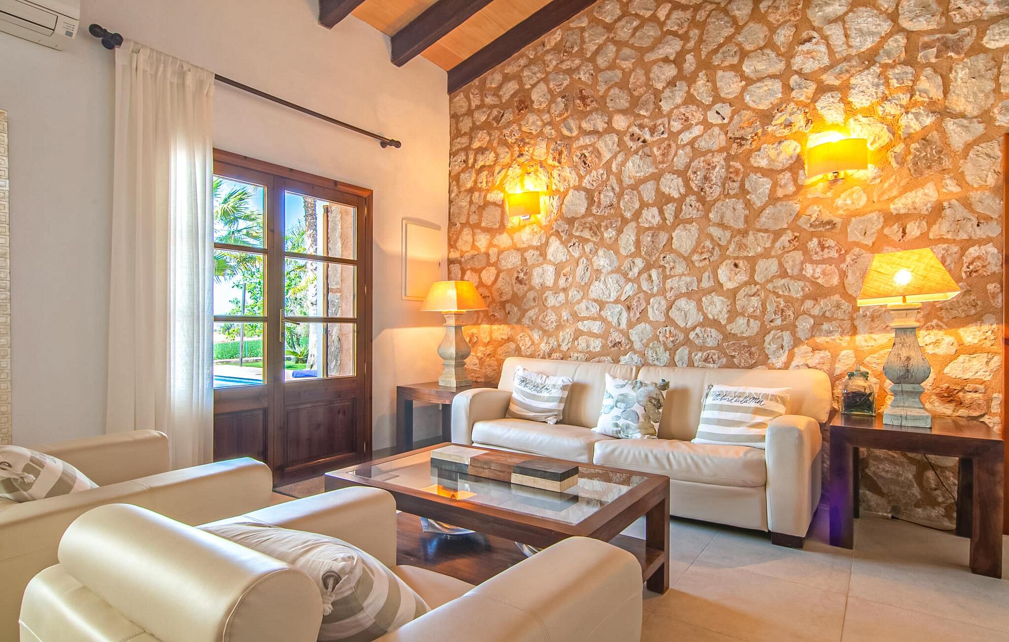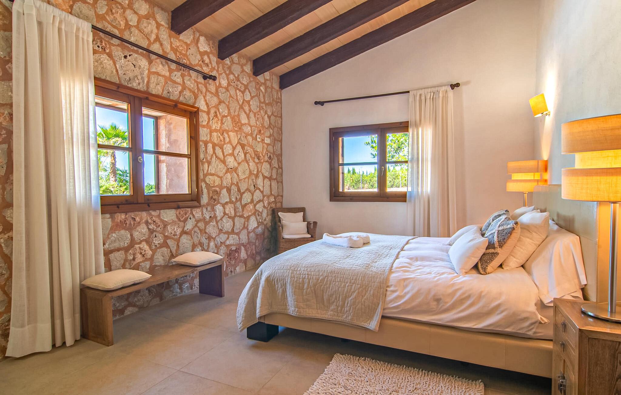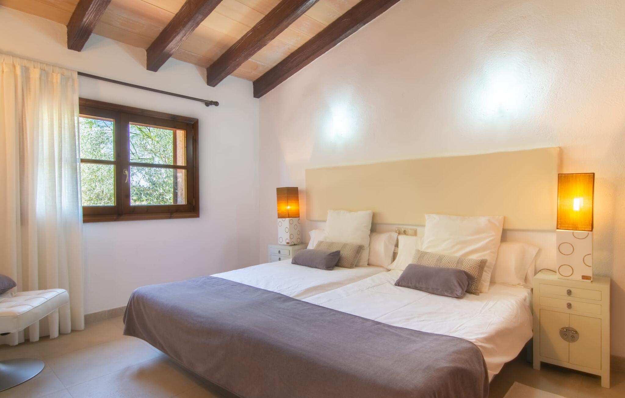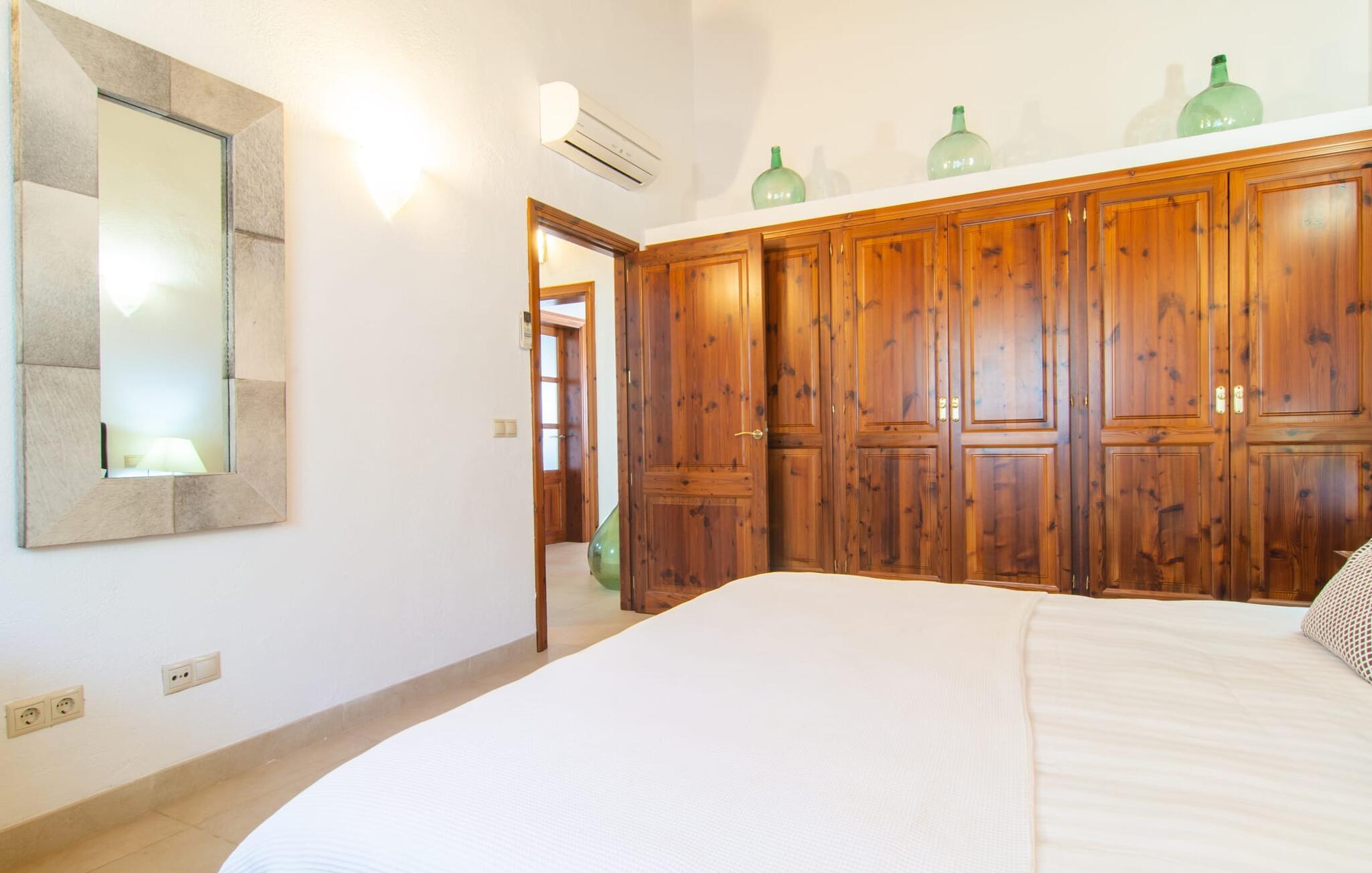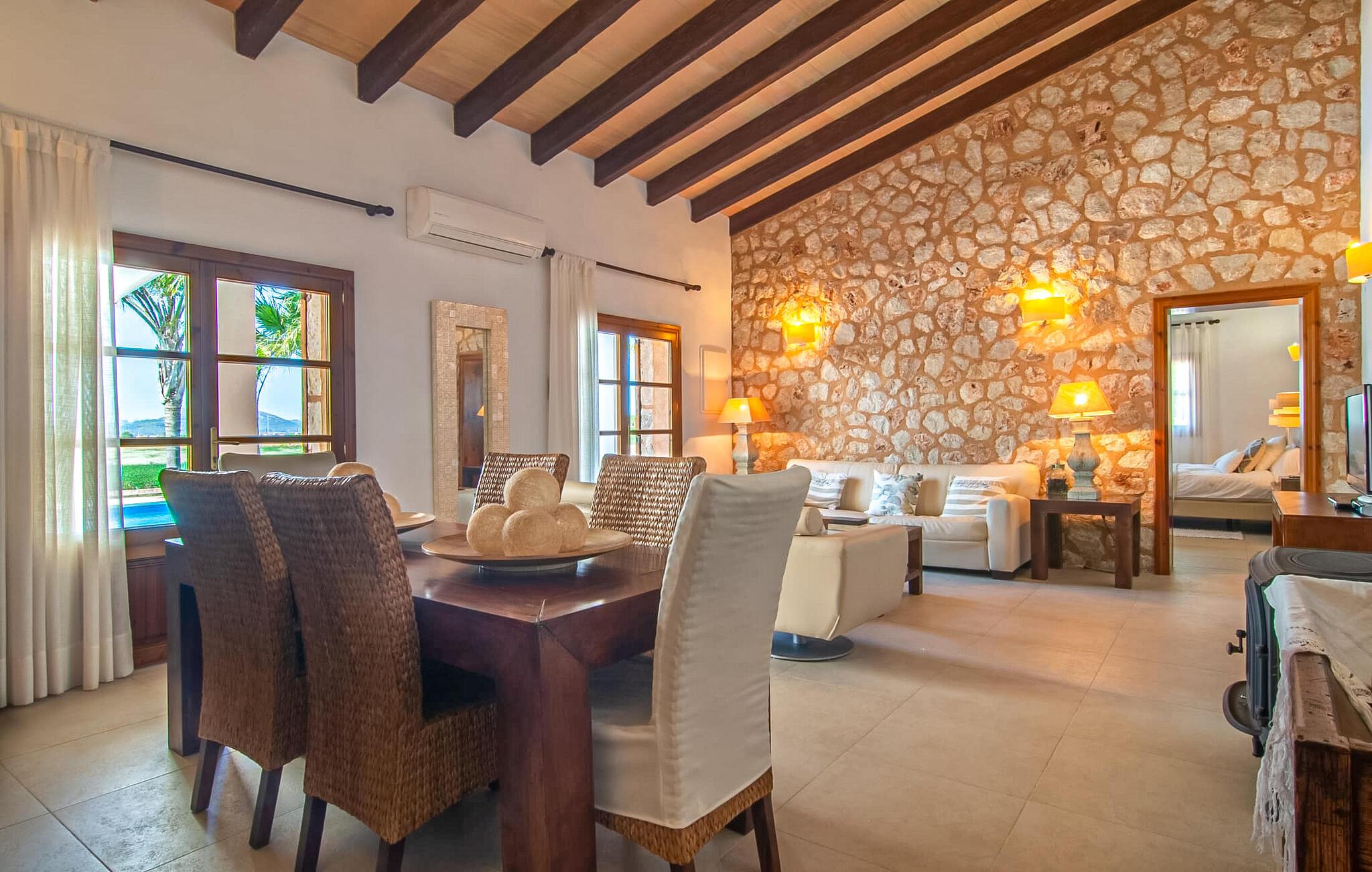 Livet på landet er ikke nødvendigvis fuld af afsavn – tværtimod: Drømmer I om en villaferie tæt på naturen i en rolig, men ikke isoleret beliggenhed med alle bekvemmelighederne i et moderne sommerhus, så er "Vinroma" det perfekte valg for jer ! Naturstenshuset i 1 plan ligger på en smukt anlagt, kærligt anlagt ejendom og byder på en vidunderlig udsigt over de omkringliggende marker og bjerge i det fjerne. Bag huset er der ikke kun en overdækket terrasse med spisebord, stole og komfortable havemøbler, men også en stor, lavvandet pool med integreret spabad og et behageligt lydende stilfuldt vandfald. Her kan I virkelig forkæle jer selv i fuldstændig privatliv og efter en forfriskende svømmetur i det kølige vand nyde en velfortjent siesta på en af de indbydende liggestole. Når I kigger søvnigt over jeres solbriller, kan I kun se de imponerende, høje palmer plantet langs poolens lange side - en drøm! Og det samme gælder indretningen: Kom og føl jer godt er feriemantraet her. Interiøret er gennemgående designet i en lys, frisk og klassisk stil. Hvide og creme vægge veksler med rustikke naturstensvægge, suppleret af smukke mørkebrune træbjælker på lofterne. Et særligt højdepunkt ved den yderst velholdte villa er konstruktionen i et plan. Ingen skal gå op ad trapper her – hvilket kan være en kæmpe lettelse, især med børn, men også for alle andre. I den åbne og rummelige spise- og opholdsstue kan I enten sidde ved det enkle, moderne træbord med smarte stole og nyde et afslappet måltid sammen eller sætte jer ned i de elegante læderlænestole eller den tilhørende sofa og nyde en krimi-thriller på tv med en glas vin. I kan også sidde ved det stilrene glasbord med delvist gennemsigtige stole i køkkenet, som er udstyret med højkvalitets hvidevarer og et stort køleskab. Og når I er træt, kan I bare trække jer tilbage til et af de tre stilfulde dobbeltværelser, hvoraf det ene har eget badeværelse. Beboerne i de to andre soveværelser deler endnu et rummeligt badeværelse. jeres villa "Vinroma" er omgivet af smukke landskaber, der er typiske for den nordlige del af øen. Den ligger midt i den såkaldte "grøntsagskurv" på Mallorca, i en særlig grøn, frugtbar slette. Nyd et par afslappende gåture på opdagelse eller en cykeltur gennem naturen, som altid inkluderer den vidunderlige udsigt over bjergene i det fjerne. Bymidten i Muro er også let tilgængelig til fods - så I har adskillige indkøbsmuligheder, restauranter og caféer lige uden for døren. Muro er blevet skånet for masseturisme og er en rustik lille mallorcansk by i ordets bedste betydning, med smalle gader, smukke sandstenshuse og et museum, der er værd at se, Museo Museu Etnologico de Muro. Her kan I lære en masse om livet på landet på øen gennem århundreder og beundre udstillinger lige fra kunsthåndværk til musikinstrumenter. Foretrækker I at tage til stranden, skal I blot køre cirka 11 km til Alcúdia-bugten, hvor I finder en fin, hvid sandstrand og grønne klitter. Et smukt etplanshus, omgivet af en velholdt have med grøn græsplæne, duftende blomster og en stor pool, indlejret i et fantastisk middelhavslandskab: Dette er villaen "Vinroma" nær Muro på det nordlige Mallorca. Her kan I nyde jeres familieferie i fred - men I kan også gå til byen kun 0,6 km væk, prøve de lokale restauranter og shoppe. Og den nærmeste strand ligger kun omkring 11 km væk og kan hurtigt nås med lejebil.
