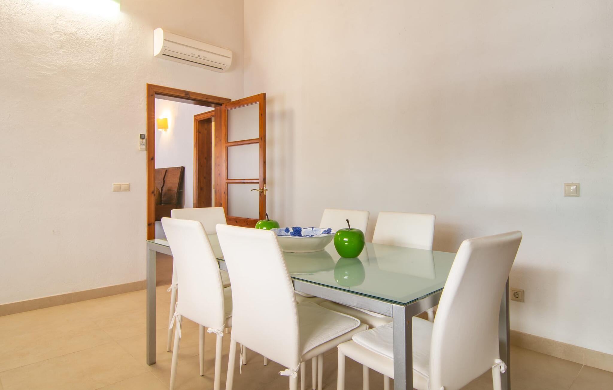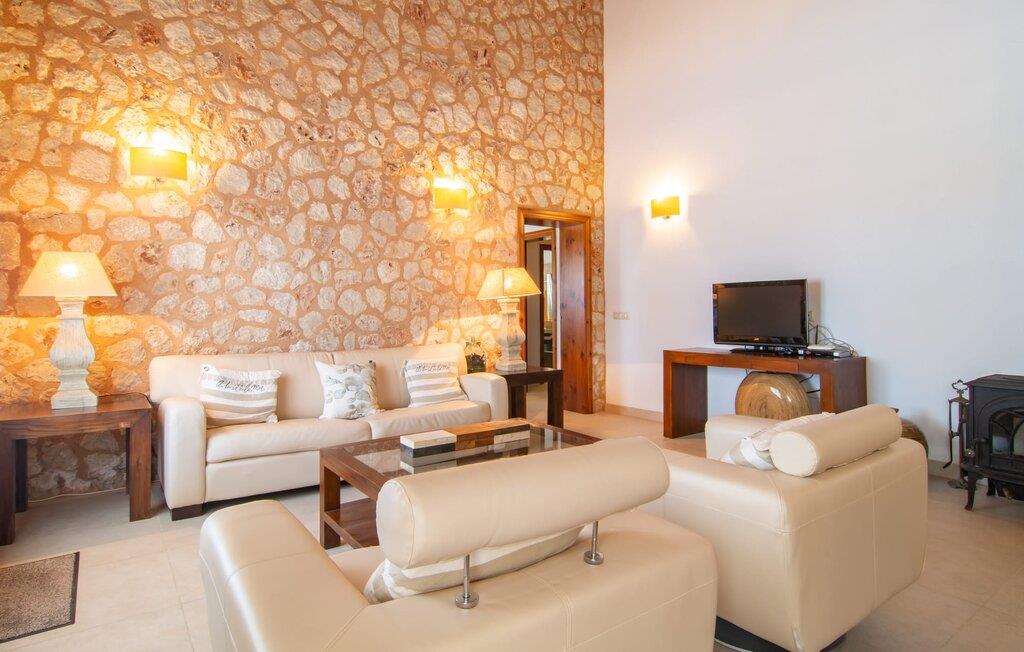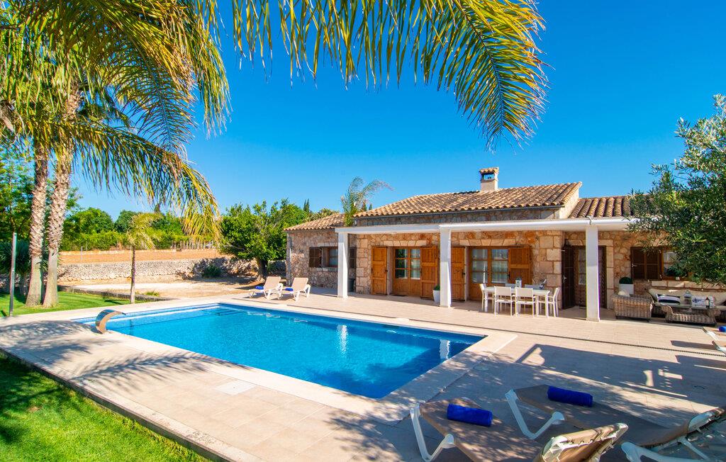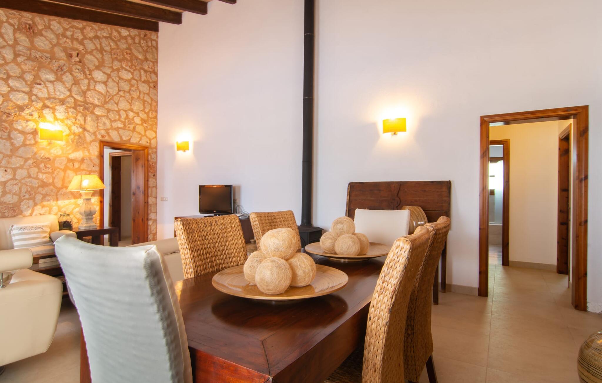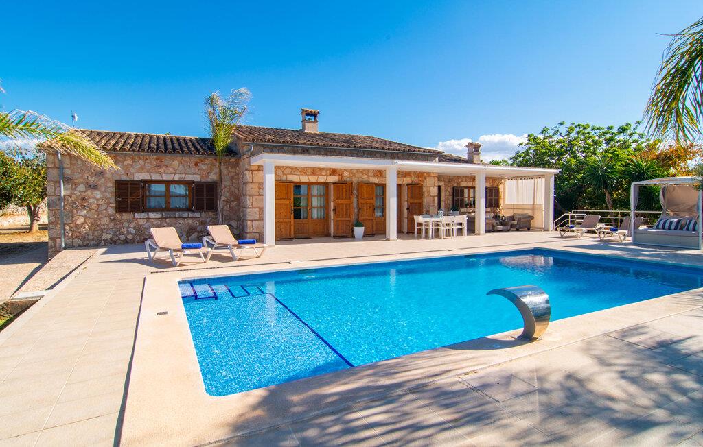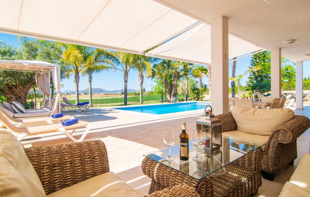 Livet på landet er ikke nødvendigvis fuld af afsavn – tværtimod: Drømmer I om en villaferie tæt på naturen i en rolig, men ikke isoleret beliggenhed med alle bekvemmelighederne i et moderne sommerhus, så er "Vinroma" det perfekte valg for jer ! Naturstenshuset i 1 plan ligger på en smukt anlagt, kærligt anlagt ejendom og byder på en vidunderlig udsigt over de omkringliggende marker og bjerge i det fjerne. Bag huset er der ikke kun en overdækket terrasse med spisebord, stole og komfortable havemøbler, men også en stor, lavvandet pool med integreret spabad og et behageligt lydende stilfuldt vandfald. Her kan I virkelig forkæle jer selv i fuldstændig privatliv og efter en forfriskende svømmetur i det kølige vand nyde en velfortjent siesta på en af de indbydende liggestole. Når I kigger søvnigt over jeres solbriller, kan I kun se de imponerende, høje palmer plantet langs poolens lange side - en drøm! Og det samme gælder indretningen: Kom og føl jer godt er feriemantraet her. Interiøret er gennemgående designet i en lys, frisk og klassisk stil. Hvide og creme vægge veksler med rustikke naturstensvægge, suppleret af smukke mørkebrune træbjælker på lofterne. Et særligt højdepunkt ved den yderst velholdte villa er konstruktionen i et plan. Ingen skal gå op ad trapper her – hvilket kan være en kæmpe lettelse, især med børn, men også for alle andre. I den åbne og rummelige spise- og opholdsstue kan I enten sidde ved det enkle, moderne træbord med smarte stole og nyde et afslappet måltid sammen eller sætte jer ned i de elegante læderlænestole eller den tilhørende sofa og nyde en krimi-thriller på tv med en glas vin. I kan også sidde ved det stilrene glasbord med delvist gennemsigtige stole i køkkenet, som er udstyret med højkvalitets hvidevarer og et stort køleskab. Og når I er træt, kan I bare trække jer tilbage til et af de tre stilfulde dobbeltværelser, hvoraf det ene har eget badeværelse. Beboerne i de to andre soveværelser deler endnu et rummeligt badeværelse. jeres villa "Vinroma" er omgivet af smukke landskaber, der er typiske for den nordlige del af øen. Den ligger midt i den såkaldte "grøntsagskurv" på Mallorca, i en særlig grøn, frugtbar slette. Nyd et par afslappende gåture på opdagelse eller en cykeltur gennem naturen, som altid inkluderer den vidunderlige udsigt over bjergene i det fjerne. Bymidten i Muro er også let tilgængelig til fods - så I har adskillige indkøbsmuligheder, restauranter og caféer lige uden for døren. Muro er blevet skånet for masseturisme og er en rustik lille mallorcansk by i ordets bedste betydning, med smalle gader, smukke sandstenshuse og et museum, der er værd at se, Museo Museu Etnologico de Muro. Her kan I lære en masse om livet på landet på øen gennem århundreder og beundre udstillinger lige fra kunsthåndværk til musikinstrumenter. Foretrækker I at tage til stranden, skal I blot køre cirka 11 km til Alcúdia-bugten, hvor I finder en fin, hvid sandstrand og grønne klitter. Et smukt etplanshus, omgivet af en velholdt have med grøn græsplæne, duftende blomster og en stor pool, indlejret i et fantastisk middelhavslandskab: Dette er villaen "Vinroma" nær Muro på det nordlige Mallorca. Her kan I nyde jeres familieferie i fred - men I kan også gå til byen kun 0,6 km væk, prøve de lokale restauranter og shoppe. Og den nærmeste strand ligger kun omkring 11 km væk og kan hurtigt nås med lejebil.