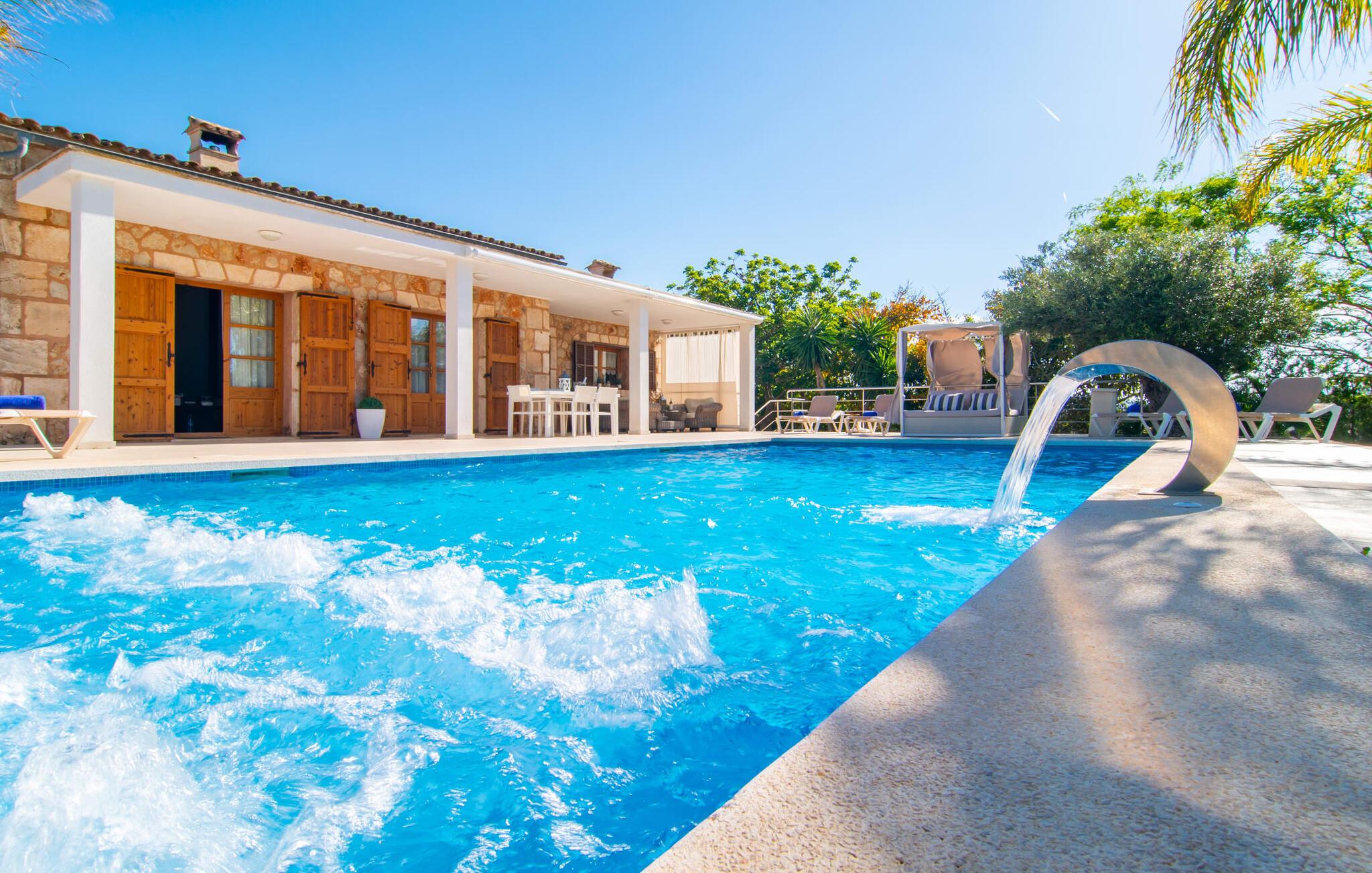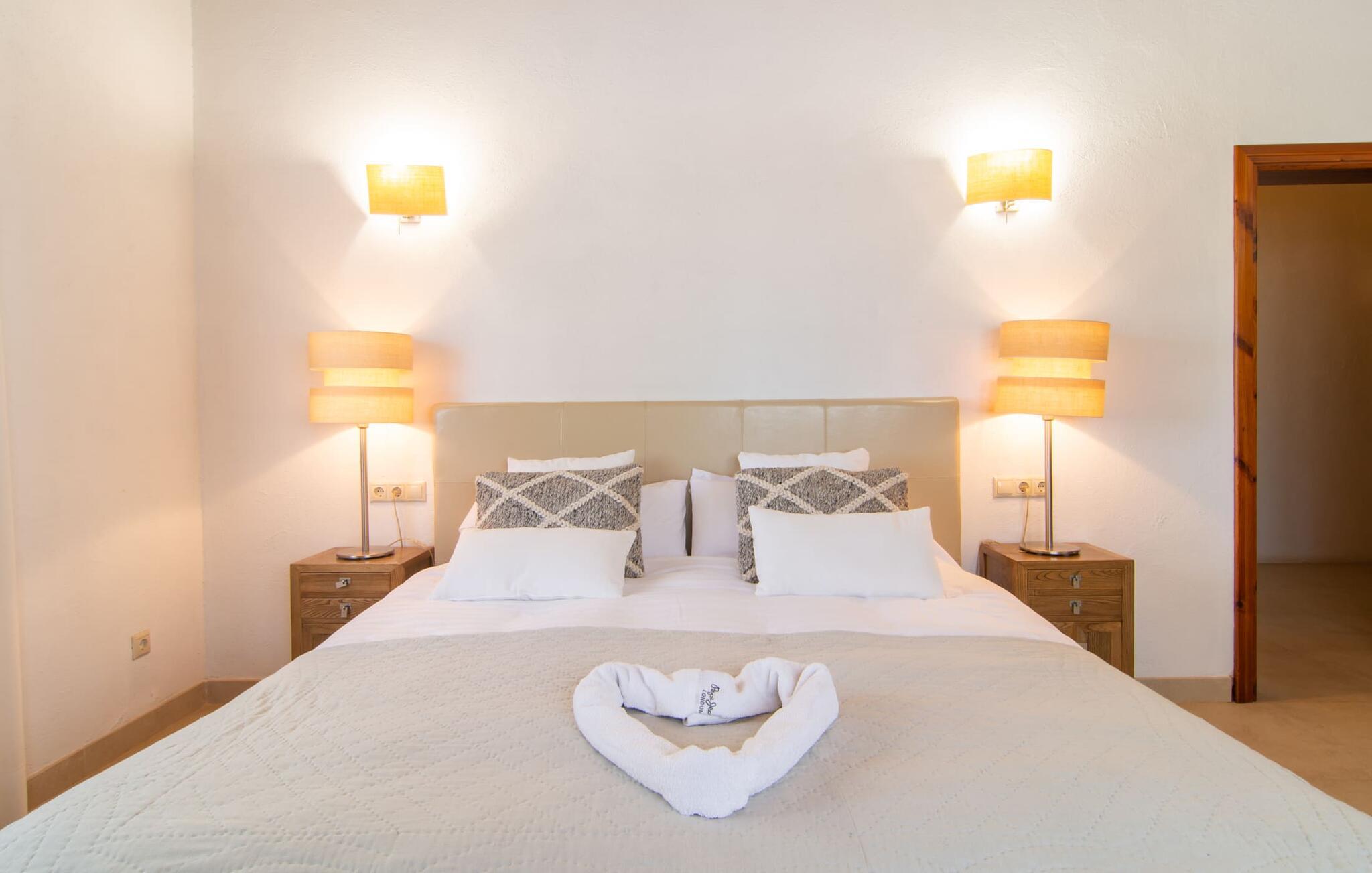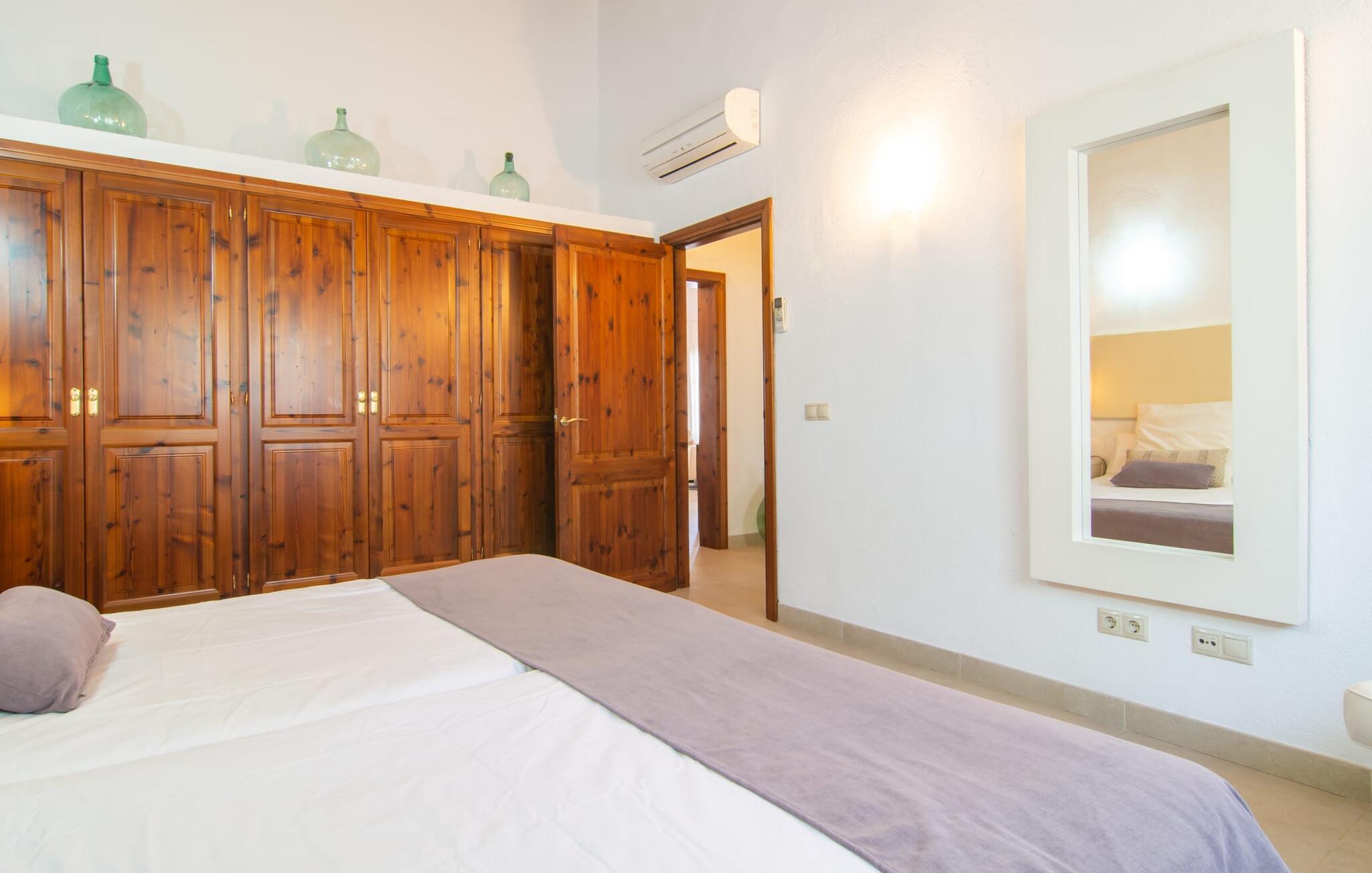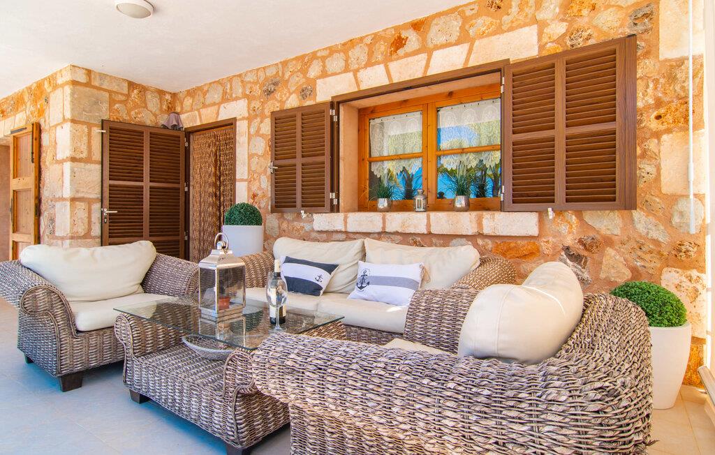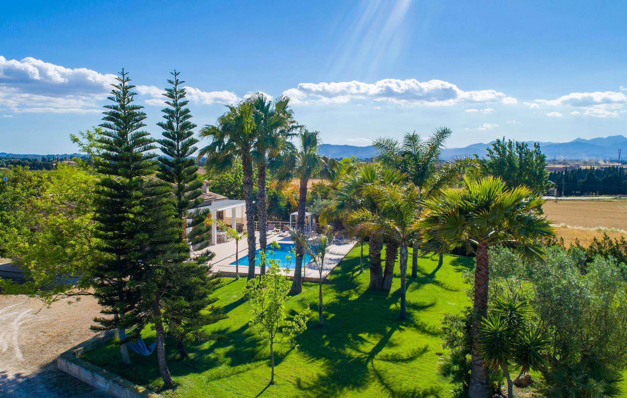 Livet på landet er ikke nødvendigvis fuld af afsavn – tværtimod: Drømmer I om en villaferie tæt på naturen i en rolig, men ikke isoleret beliggenhed med alle bekvemmelighederne i et moderne sommerhus, så er "Vinroma" det perfekte valg for jer ! Naturstenshuset i 1 plan ligger på en smukt anlagt, kærligt anlagt ejendom og byder på en vidunderlig udsigt over de omkringliggende marker og bjerge i det fjerne. Bag huset er der ikke kun en overdækket terrasse med spisebord, stole og komfortable havemøbler, men også en stor, lavvandet pool med integreret spabad og et behageligt lydende stilfuldt vandfald. Her kan I virkelig forkæle jer selv i fuldstændig privatliv og efter en forfriskende svømmetur i det kølige vand nyde en velfortjent siesta på en af de indbydende liggestole. Når I kigger søvnigt over jeres solbriller, kan I kun se de imponerende, høje palmer plantet langs poolens lange side - en drøm! Og det samme gælder indretningen: Kom og føl jer godt er feriemantraet her. Interiøret er gennemgående designet i en lys, frisk og klassisk stil. Hvide og creme vægge veksler med rustikke naturstensvægge, suppleret af smukke mørkebrune træbjælker på lofterne. Et særligt højdepunkt ved den yderst velholdte villa er konstruktionen i et plan. Ingen skal gå op ad trapper her – hvilket kan være en kæmpe lettelse, især med børn, men også for alle andre. I den åbne og rummelige spise- og opholdsstue kan I enten sidde ved det enkle, moderne træbord med smarte stole og nyde et afslappet måltid sammen eller sætte jer ned i de elegante læderlænestole eller den tilhørende sofa og nyde en krimi-thriller på tv med en glas vin. I kan også sidde ved det stilrene glasbord med delvist gennemsigtige stole i køkkenet, som er udstyret med højkvalitets hvidevarer og et stort køleskab. Og når I er træt, kan I bare trække jer tilbage til et af de tre stilfulde dobbeltværelser, hvoraf det ene har eget badeværelse. Beboerne i de to andre soveværelser deler endnu et rummeligt badeværelse. jeres villa "Vinroma" er omgivet af smukke landskaber, der er typiske for den nordlige del af øen. Den ligger midt i den såkaldte "grøntsagskurv" på Mallorca, i en særlig grøn, frugtbar slette. Nyd et par afslappende gåture på opdagelse eller en cykeltur gennem naturen, som altid inkluderer den vidunderlige udsigt over bjergene i det fjerne. Bymidten i Muro er også let tilgængelig til fods - så I har adskillige indkøbsmuligheder, restauranter og caféer lige uden for døren. Muro er blevet skånet for masseturisme og er en rustik lille mallorcansk by i ordets bedste betydning, med smalle gader, smukke sandstenshuse og et museum, der er værd at se, Museo Museu Etnologico de Muro. Her kan I lære en masse om livet på landet på øen gennem århundreder og beundre udstillinger lige fra kunsthåndværk til musikinstrumenter. Foretrækker I at tage til stranden, skal I blot køre cirka 11 km til Alcúdia-bugten, hvor I finder en fin, hvid sandstrand og grønne klitter. Et smukt etplanshus, omgivet af en velholdt have med grøn græsplæne, duftende blomster og en stor pool, indlejret i et fantastisk middelhavslandskab: Dette er villaen "Vinroma" nær Muro på det nordlige Mallorca. Her kan I nyde jeres familieferie i fred - men I kan også gå til byen kun 0,6 km væk, prøve de lokale restauranter og shoppe. Og den nærmeste strand ligger kun omkring 11 km væk og kan hurtigt nås med lejebil.