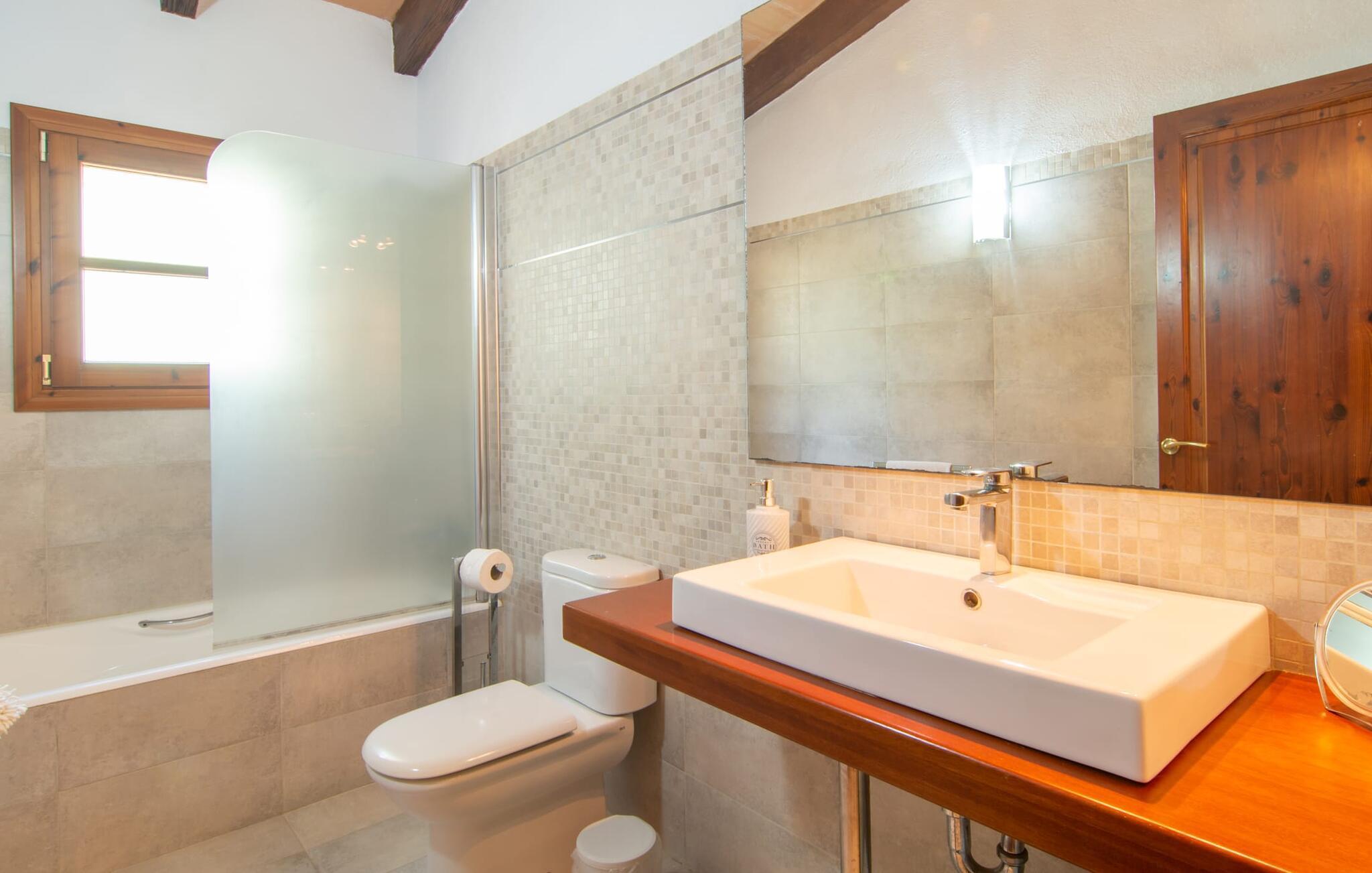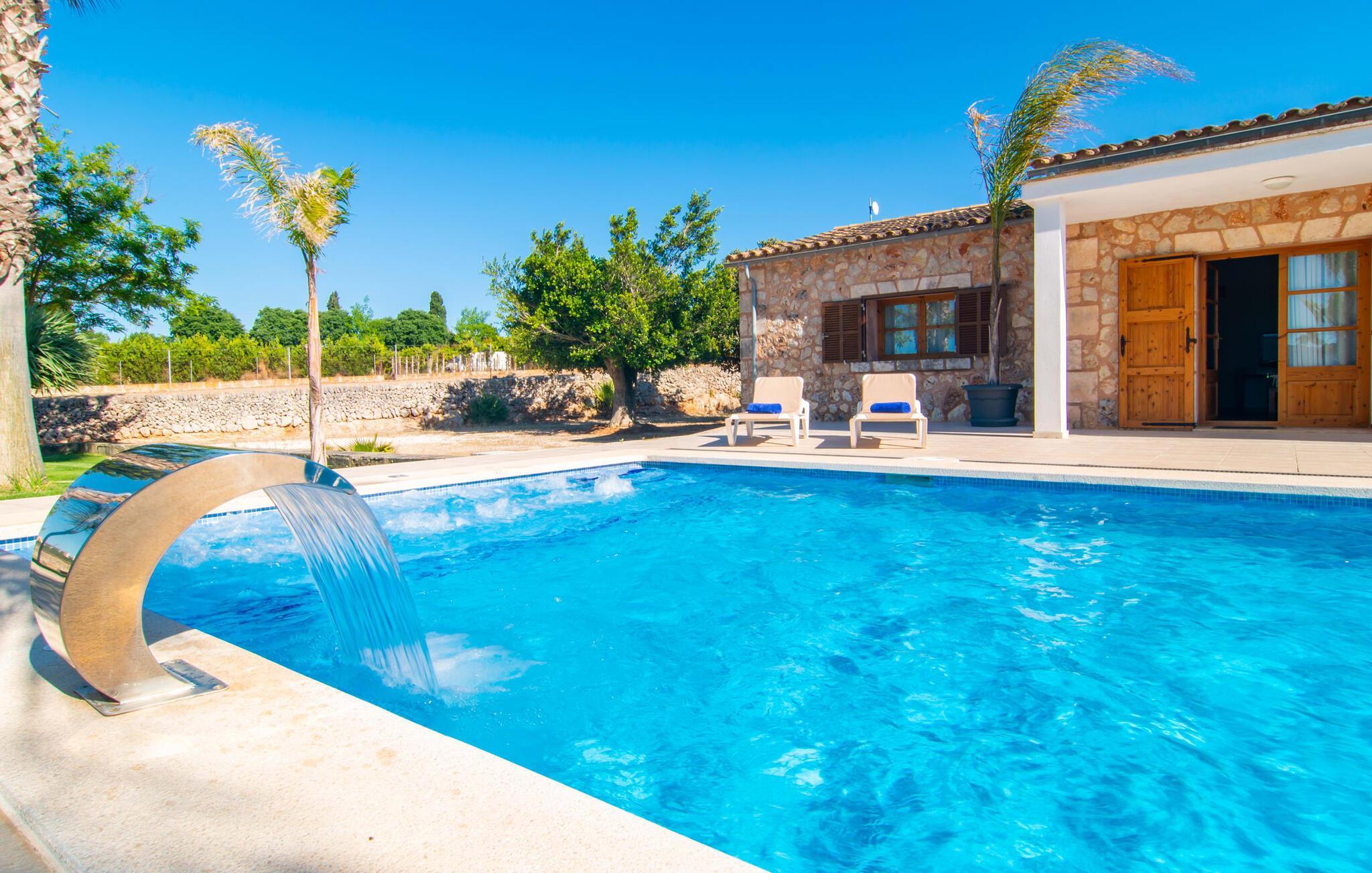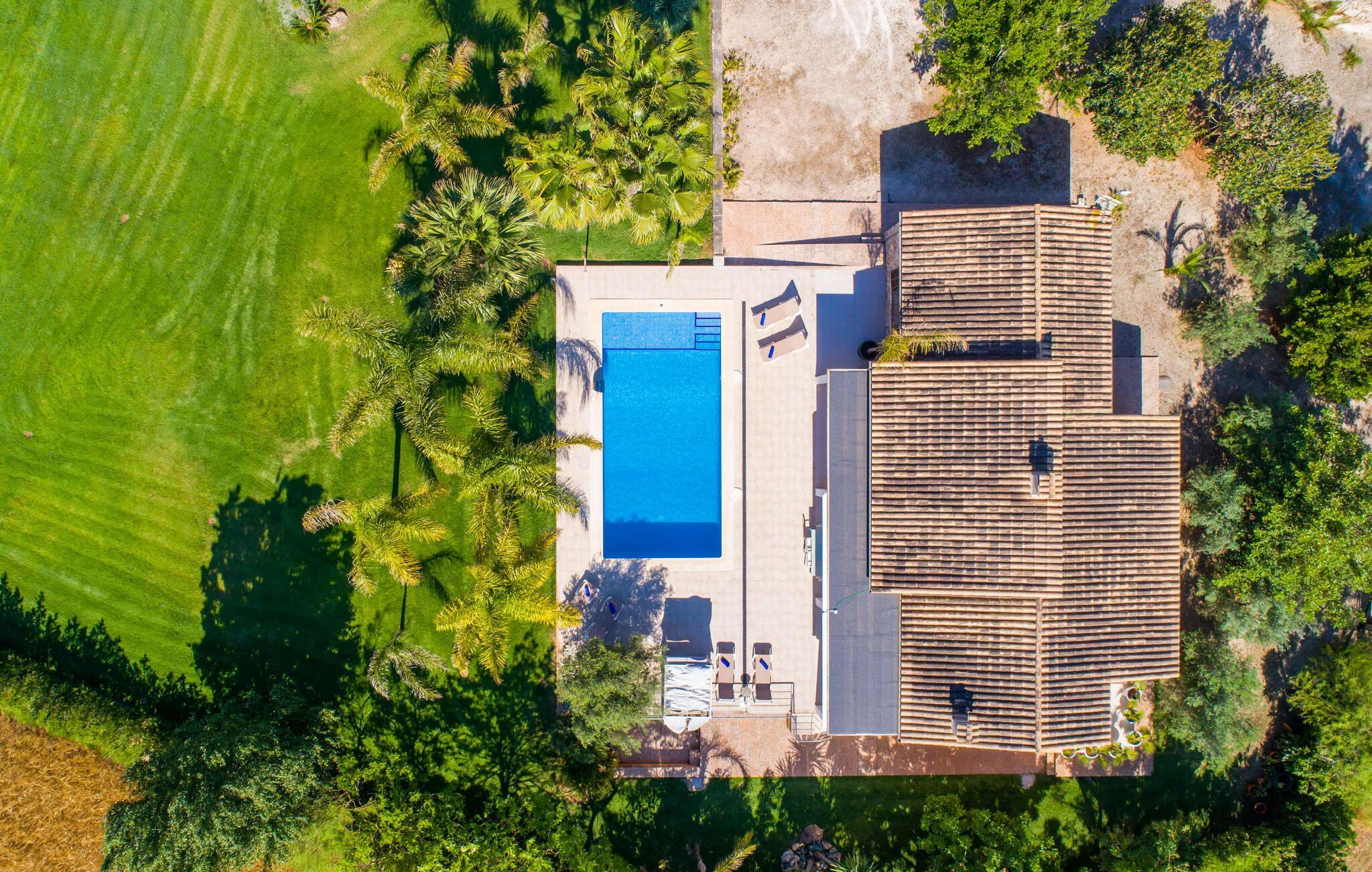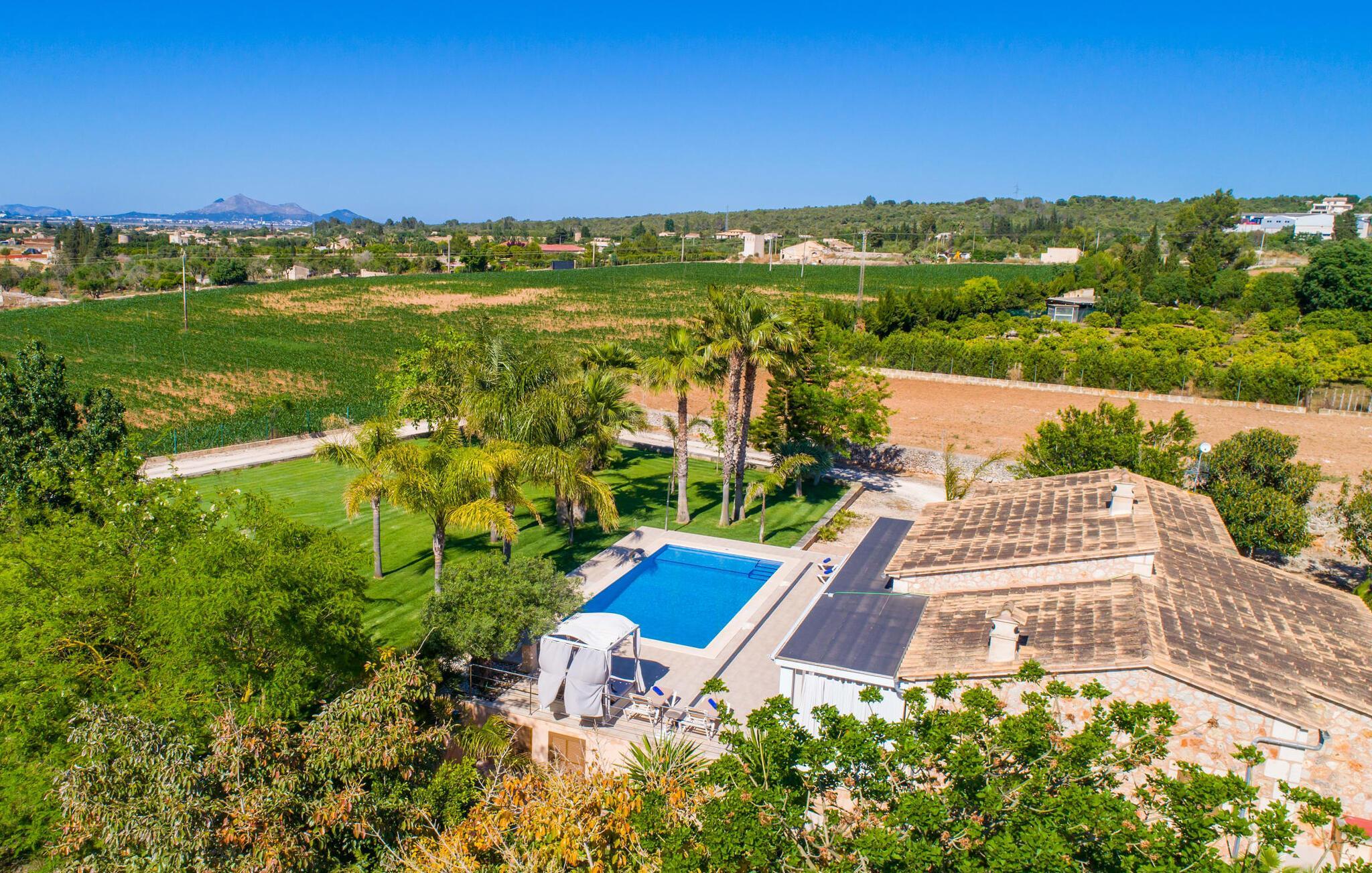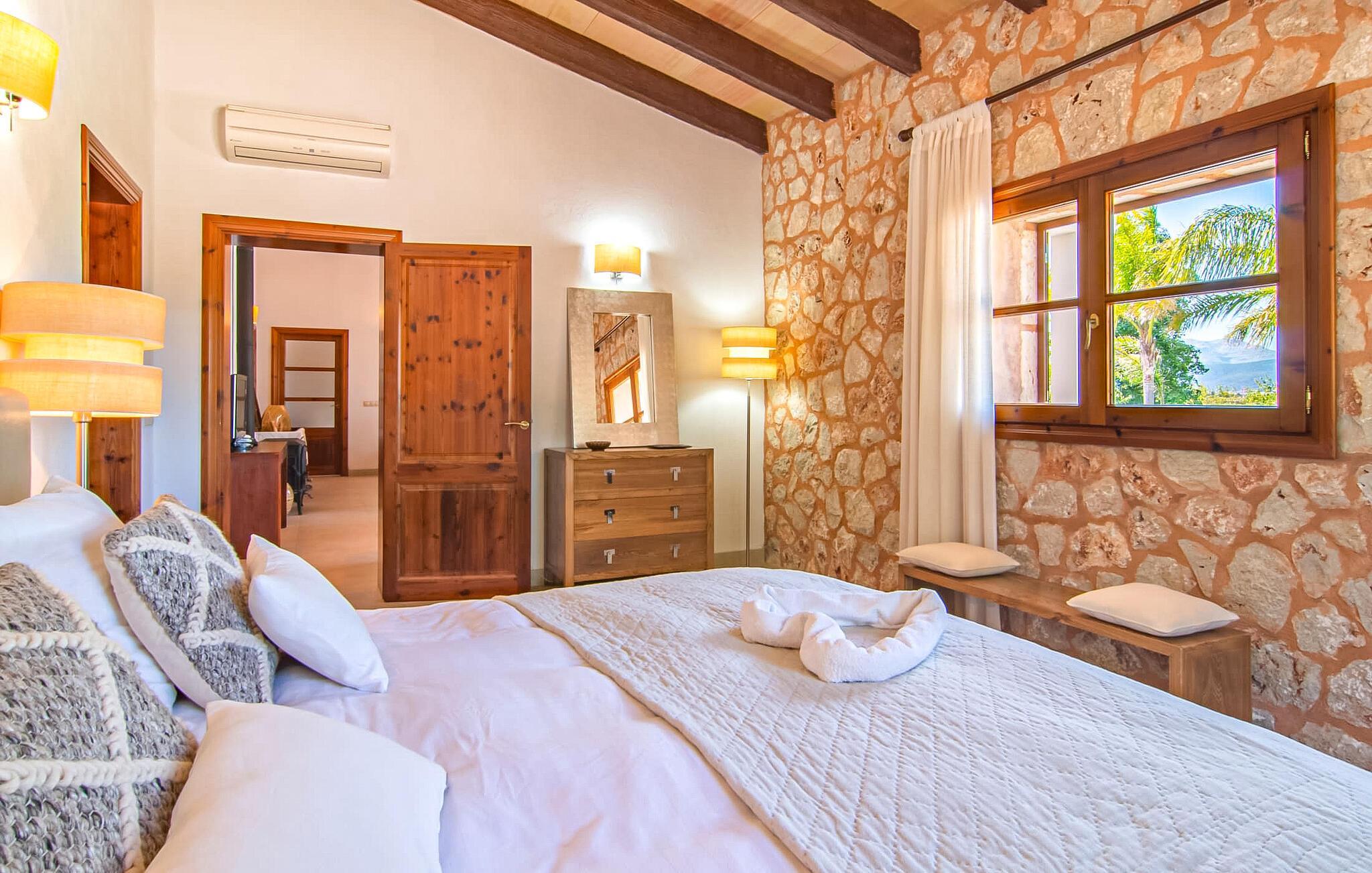Livet på landet er ikke nødvendigvis fuld af afsavn – tværtimod: Drømmer du om en villaferie tæt på naturen i en rolig, men ikke isoleret beliggenhed med alle bekvemmelighederne i et moderne sommerhus, så er "Vinroma" det perfekte valg for dig ! Naturstenshuset i 1 plan ligger på en smukt anlagt, kærligt anlagt ejendom og byder på en vidunderlig udsigt over de omkringliggende marker og bjerge i det fjerne. Bag huset er der ikke kun en overdækket terrasse med spisebord, stole og komfortable havemøbler, men også en stor, lavvandet pool med integreret spabad og et behageligt lydende stilfuldt vandfald. Her kan du virkelig forkæle dig selv i fuldstændig privatliv og efter en forfriskende svømmetur i det kølige vand nyde en velfortjent siesta på en af de indbydende liggestole. Når du kigger søvnigt over dine solbriller, kan du kun se de imponerende, høje palmer plantet langs poolens lange side - en drøm! Og det samme gælder indretningen: Kom og føl dig godt er feriemantraet her. Interiøret er gennemgående designet i en lys, frisk og klassisk stil. Hvide og creme vægge veksler med rustikke naturstensvægge, suppleret af smukke mørkebrune træbjælker på lofterne. Et særligt højdepunkt ved den yderst velholdte villa er konstruktionen i et plan. Ingen skal gå op ad trapper her – hvilket kan være en kæmpe lettelse, især med børn, men også for alle andre. I den åbne og rummelige spise- og opholdsstue kan I enten sidde ved det enkle, moderne træbord med smarte stole og nyde et afslappet måltid sammen eller sætte jer ned i de elegante læderlænestole eller den tilhørende sofa og nyde en krimi-thriller på tv med en glas vin. Du kan også sidde ved det stilrene glasbord med delvist gennemsigtige stole i køkkenet, som er udstyret med højkvalitets hvidevarer og et stort køleskab. Og når du er træt, kan du bare trække dig tilbage til et af de tre stilfulde dobbeltværelser, hvoraf det ene har eget badeværelse. Beboerne i de to andre soveværelser deler endnu et rummeligt badeværelse. Din villa "Vinroma" er omgivet af smukke landskaber, der er typiske for den nordlige del af øen. Den ligger midt i den såkaldte "grøntsagskurv" på Mallorca, i en særlig grøn, frugtbar slette. Nyd et par afslappende gåture på opdagelse eller en cykeltur gennem naturen, som altid inkluderer den vidunderlige udsigt over bjergene i det fjerne. Bymidten i Muro er også let tilgængelig til fods - så du har adskillige indkøbsmuligheder, restauranter og caféer lige uden for døren. Muro er blevet skånet for masseturisme og er en rustik lille mallorcansk by i ordets bedste betydning, med smalle gader, smukke sandstenshuse og et museum, der er værd at se, Museo Museu Etnologico de Muro. Her kan du lære en masse om livet på landet på øen gennem århundreder og beundre udstillinger lige fra kunsthåndværk til musikinstrumenter. Foretrækker du at tage til stranden, skal du blot køre cirka 11 km til Alcúdia-bugten, hvor du finder en fin, hvid sandstrand og grønne klitter. Et smukt etplanshus, omgivet af en velholdt have med grøn græsplæne, duftende blomster og en stor pool, indlejret i et fantastisk middelhavslandskab: Dette er villaen "Vinroma" nær Muro på det nordlige Mallorca. Her kan du nyde din familieferie i fred - men du kan også gå til byen kun 0,6 km væk, prøve de lokale restauranter og shoppe. Og den nærmeste strand ligger kun omkring 11 km væk og kan hurtigt nås med lejebil. Dette er et Fincallorca feriehus.