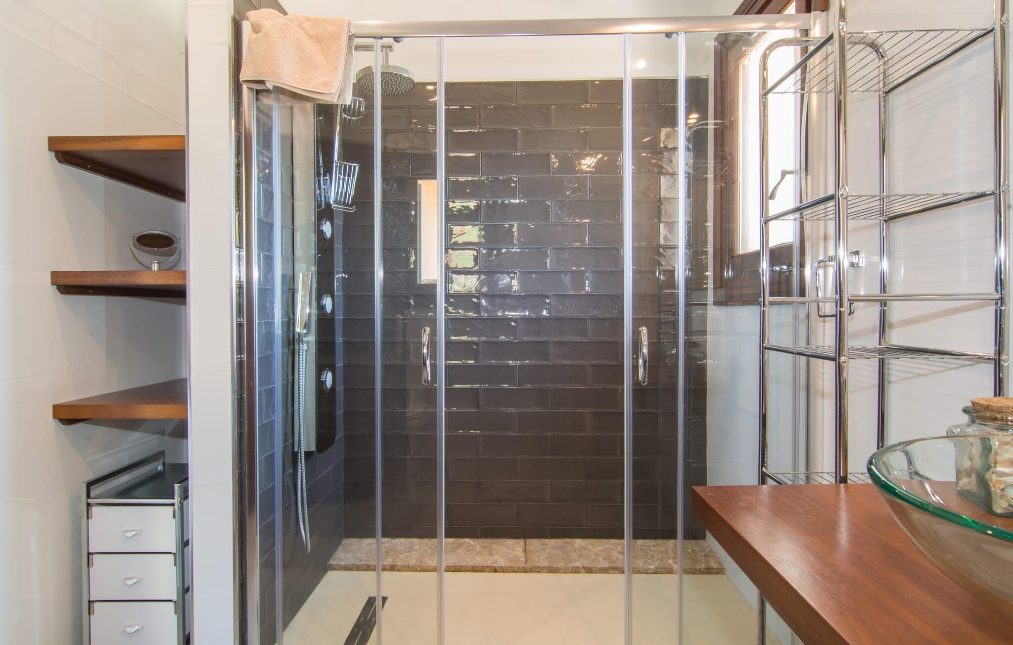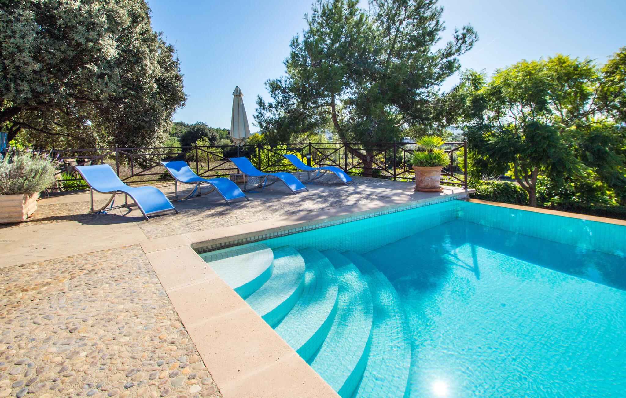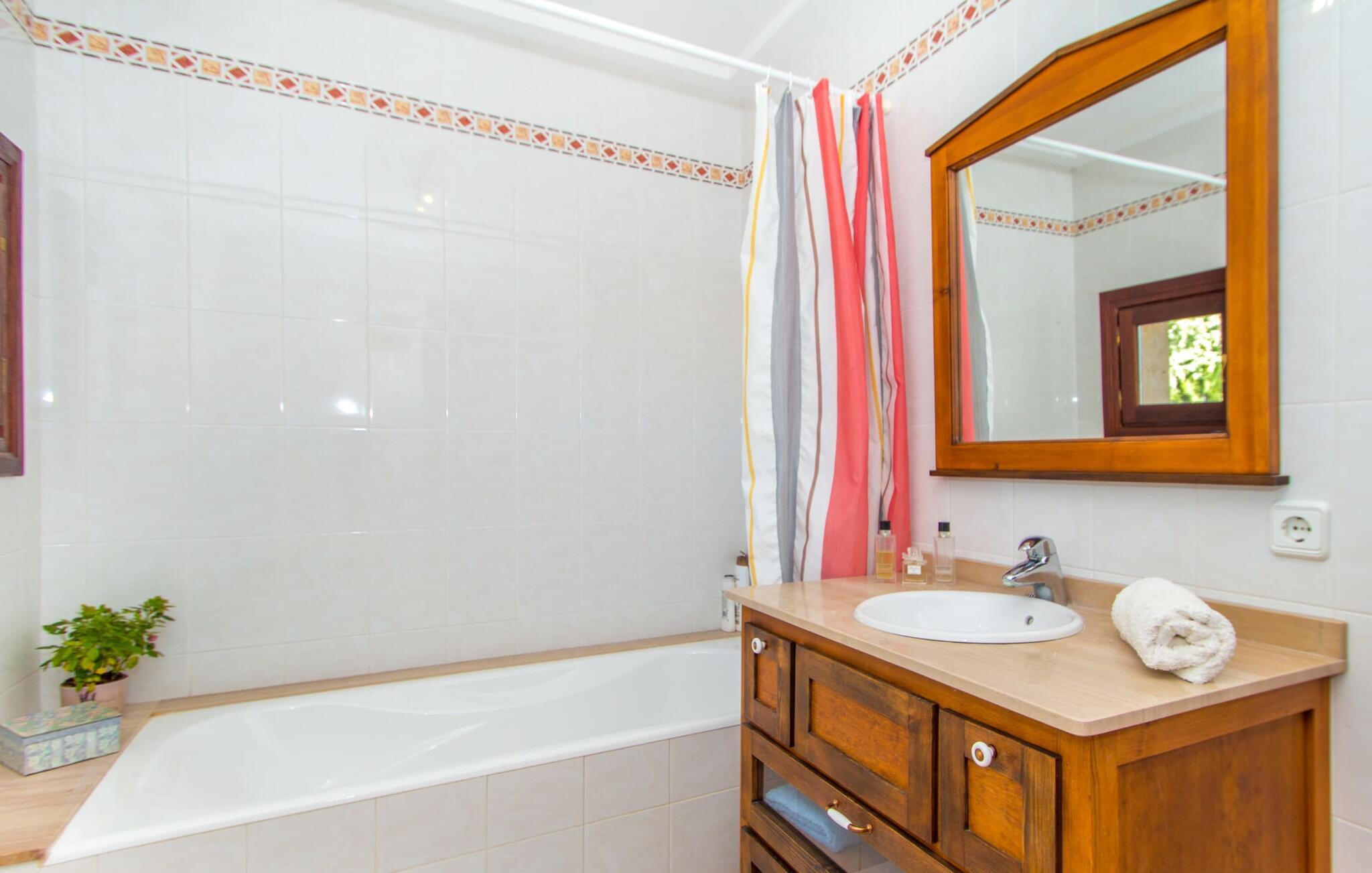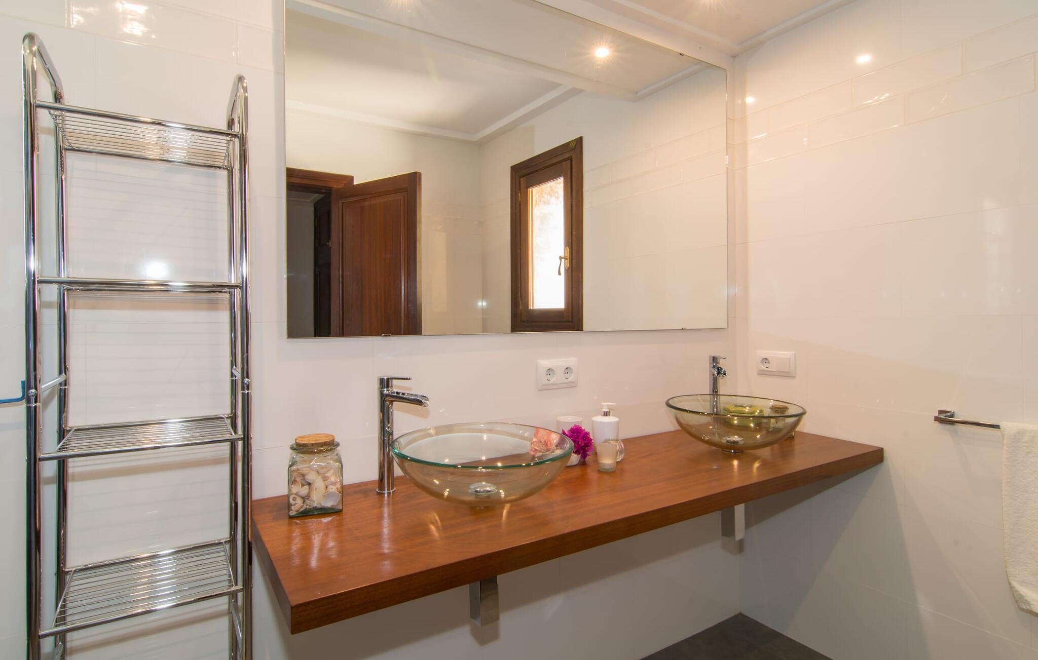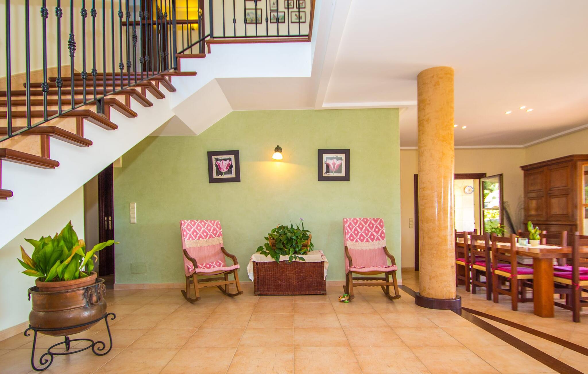 Den usædvanligt muntre villa "Vista Castell" venter os, let hævet på en bakke på vejen mellem Artà og Capdepera. Det to-etagers hus med delvis frilagt murværk, stedvis glat pudset og malet sandfarvet, udstråler en munter og ubekymret stemning, hvilket også de lyseblå skodder og beliggenheden på en stor grund omgivet af en vingård bidrager til. . Det vil virkelig varme jeres hjerte, når I træder ind i villaen, som ikke kan ses i miles takket være ejendommens privatliv. Vinduernes buer og overdækkede terrasser i stueetagen ud mod pool- og havesiden af ejendommen understreger husets indbydende atmosfære. Villaen ligger på den nærliggende, lejlighedsvis hørte, landevej, der forbinder Artà og Capdepera. Takket være denne vej er den smukke Sa Marjal-strand (ofte kun besøgt af lokalbefolkningen) samt andre smukke sandstrande og vidunderlige badebugter meget nemme at nå. Den smukke villa er beliggende i bjergskråningen, som er besat af en vingård. Den høje beliggenhed giver jer mulighed for at nyde en vidunderlig udsigt over Artà og dens fæstning samt pilgrimskirken San Salvador, et vartegn for Artà, som også er kendt ud over grænserne. Nærheden til Artà giver jer mulighed for at udforske den maleriske lille by til fods. Tirsdage er markedsdage, som I ikke bør gå glip af: Det farverige travlhed og de glade markedsfolk er udtryk for den højeste livskvalitet på den sydlige del af øen. Ikke kun på markedet, men også i landsbyens små gader, er der adskillige hyggelige butikker, der tilbyder typiske mallorcanske varer at nyde eller til pynt, og som kan tjene som en souvenir til jeres ferie, når I vender tilbage. Vil I ud om aftenen, finder I mange gode restauranter i Artà, som også kan nås via en kort gåtur gennem byen. Denne villa er særdeles velegnet til ferier med hele familien, vennegrupper og alle, der leder efter ro og afslapning. Den fænomenale udsigt over Artà kan også bedst nydes fra det rummelige poolområde. Den 10 x 5 m store pool med en blid hjørneindgang er 1,50 m dyb og har en omgivende solterrasse, hvor I nemt kan skubbe jeres liggestol på plads og nyde både den fjerne udsigt og billedet af landsbyen og de omkringliggende bølgende bakker i Artà . Poolen er indhegnet for at gøre den sikker for børn. Fra poolen kan I få adgang til villaens smukt designede udendørs opholdsområde. Den overdækkede terrasse af høj kvalitet, som åbner ud til haven og poolen, er udstyret med et polyrattan-møbelsæt til afslapning og en udendørs spiseplads. Både en mobil og en muret grill er til rådighed til en afslappet grillaften. Et kæmpe oliventræ i den velholdte græsplæne imponerer og giver skygge. Et bordtennisbord er tilgængeligt til sportsaktiviteter. Fra den overdækkede hjørneterrasse på siden af huset har I en tredje mulighed for at komme ind i huset - gennem gulv-til-loft-døre, som også er indrammet af de ovenfor nævnte azurblå skodder. I stueetagen er der et stort åbent rum, som danner omdrejningspunktet for den hyggelige villa. Gennem det store panoramavindue i stuen vil I blive overvældet af endnu en spektakulær udsigt over Artà. Foran pejsen er der et hyggeligt opholdsområde med 2 mere komfortable kurvestole, der inviterer til at sidde og læse. Dette værelse har også et stort spisebord, der kan rumme alle gæster. Bag spisepladsen er det fuldt udstyret køkken med rustik træindretning. I det lyse køkken-alrum er der endnu en spiseplads med stort ovalt bord. Et badeværelse på denne etage er ret praktisk til almindelig brug. Soveværelserne selv er alle på øverste etage og kan nås via en trappe fra den åbne opholdsstue. På første sal vil I opdage master soveværelset med en-suite badeværelse, udstyret med et stort hjørne badekar. I vil også finde et walk-in closet og 3 yderligere soveværelser med dobbeltsenge. Der er også et andet badeværelse tilgængeligt på denne etage. I hvert af soveområderne er den ene væg malet farverigt, så I kan nyde en rig æblegrøn, turkis eller azurblå - endnu et udtryk for den muntre, ligefremme stil i den friske villa "Vista Castell". Vi hos Fincallorca ønsker jer en afslappende ferie. Beliggende midt i en vingård ligger den venlige, lyse villa "Vista Castell" kun få minutters gang fra Artà og tilbyder en fantastisk udsigt over fæstningen og pilgrimskirken San Salvador. I den maleriske by Artà kan I gøre jeres indkøb i supermarkederne eller på markedet, som finder sted hver tirsdag. Store strande som Sa Marjal kan nås meget hurtigt i bil. Bemærk venligst, at denne ejendom ikke accepterer ungdomsgrupper eller polterabender. En ungdomsgruppe på denne ejendom består af personer på 25 år eller derunder. Book ikke denne ejendom, hvis I er en ungdomsgruppe eller en polterabendgruppe, da jeres reservation vil blive afvist, når den er booket, hvilket også kan være tilfældet ved ankomst til ejendommen eller under jeres ophold, og I vil ikke modtage en refusion.