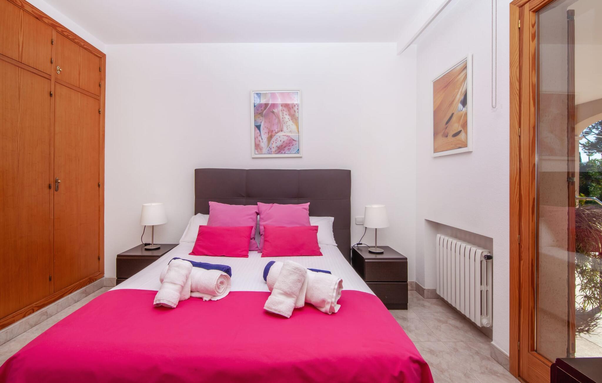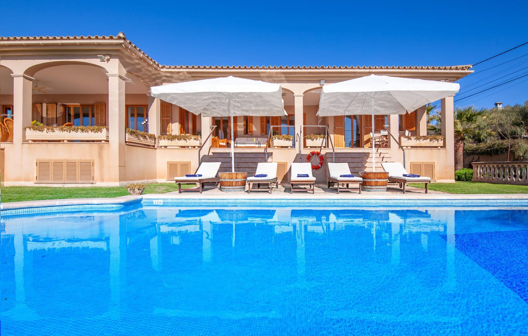 Som navnet antyder, ligger denne alsidige og rummelige villa tæt på land og hav - perfekt til dem, der vil nyde begge dele på ferien! Den ret rolige beliggenhed, men alligevel tæt på byen, bringer yderligere fordele med sig. Det, der umiddelbart springer i øjnene her, er den sensationelle veranda, som er placeret over poolen og udover flere særligt indbydende sidde- og afslapningsmuligheder også byder på en vidunderlig udsigt. Svømmehallen, der skinner i blå nuancer og nemt kan nås via en romersk trappe, den velholdte græsplæne og soldækket strækker sig lige foran dig og bagved kan du se det ret flade landskab på den sydlige ø. Dette er de bedste betingelser for omfattende udendørs ophold - gasgrill, komfortable liggestole og parasoller fuldender udvalget af underholdning, der vil glæde store og små. Dette er et Fincallorca feriehus. En værdig stemning strømmer gennem rummene, som konsekvent viderefører princippet om "generøsitet". Selv når restauranten er fyldt op, er der rig mulighed for at finde individuelle steder at slappe af indenfor. I stuen, som støder direkte op til verandaen, byder flere sofaer på behagelige steder at slappe af, og bordet giver mulighed for at spise sammen. Det fuldt udstyrede køkken i hvidt udseende har alt hvad du behøver for en selvstændig ferie med selvforplejning og lige ved siden af, åbent udadtil, er der en yderligere spiseplads med fantastisk udsigt. I i alt fem individuelt indrettede værelser finder du en hyggelig atmosfære til afslappende ferieaftener. Gulv til loft vinduer lukker middelhavslys ind og byder på en smuk udsigt. Tre badeværelser en suite, hvoraf nogle er tilgængelige fra to soveværelser, runder smagfuldt af boligkomforten. Navnet på denne villa, der ligger i en urbanisering ud for kysten af hovedstaden Palma, fortæller om "hav og land". En velholdt have med masser af grønne plæner giver de bedste forudsætninger for værdig afslapning. Placeringen på vejen giver dig mulighed for nemt at nå flere destinationer, og du kan gøre dine indkøb i den nærliggende landsby Sa Cabaneta. Palma ligger omkring 20 minutter væk i bil. Forskellige sandstrande på sydkysten, såsom Cuidad Jardin, Cala Estancia eller Es Penyo, ligger 12 til 13 km væk. Bemærk venligst, at denne ejendom ikke accepterer ungdomsgrupper eller polterabender. En ungdomsgruppe på denne ejendom består af personer på 25 år eller derunder. Book ikke denne ejendom, hvis du er en ungdomsgruppe eller polterabend, da din reservation vil blive afvist, når den er booket, hvilket også kan være tilfældet ved ankomst til ejendommen eller under dit ophold, og du vil ikke modtage en refusion