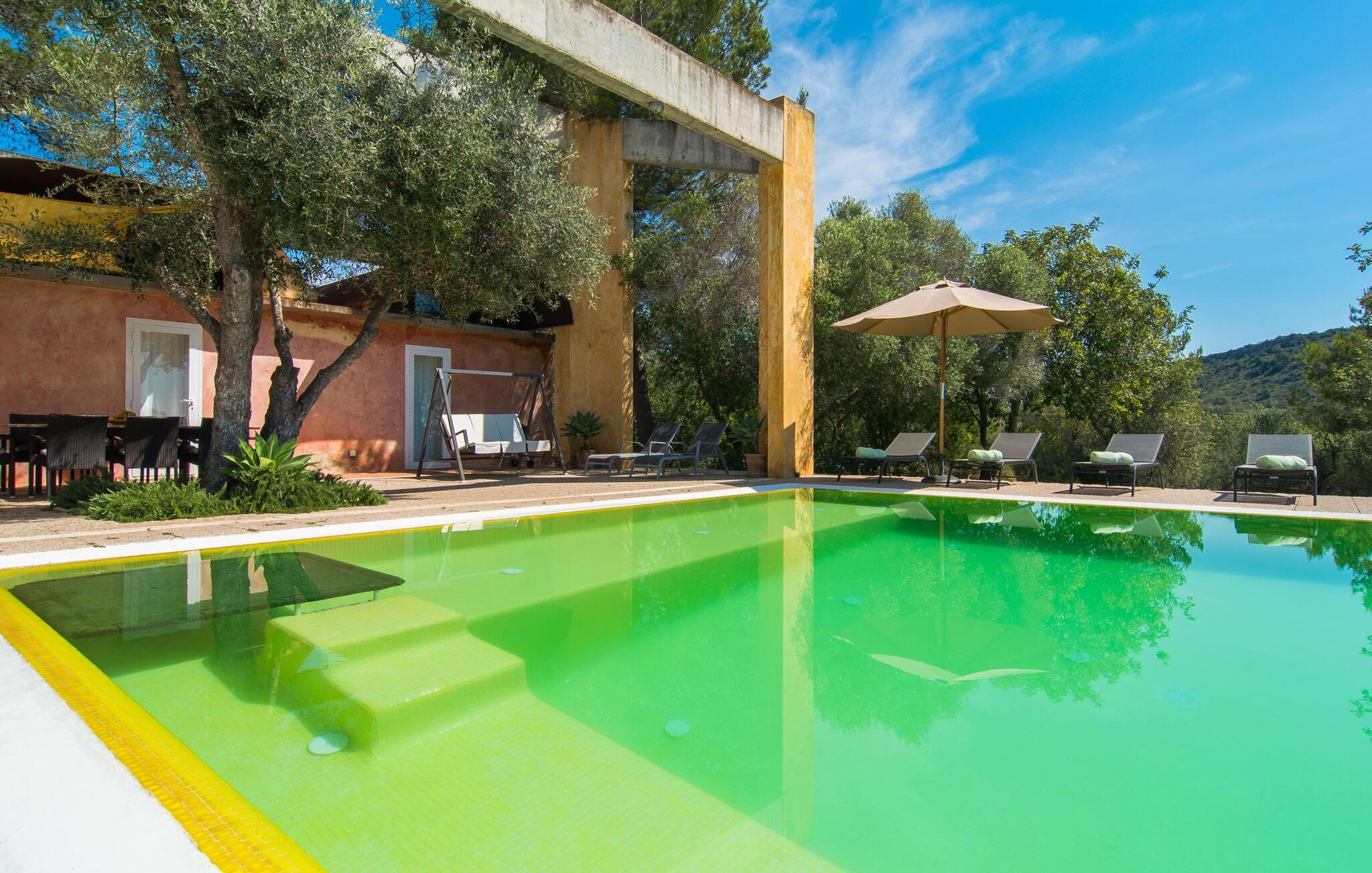 Der er en parkeringsplads lige bag denne smukke villa. Der er ingen veje i nærheden og derfor ingen støj eller forstyrrelser. Villaen "Viterbo" er beliggende i en indbydende landlig beliggenhed og byder på ideelle forhold for en helt afslappende ferie. Den afsidesliggende plads byder på et meget roligt miljø takket være den store græsplæne, der grænser op til en lille skov, som er særdeles velegnet til en hyggelig ferie. Træer og buske er plantet på ejendommen mellem poolen og villaen og langs en del af terrassen; De udstråler en masse charme og bringer typiske mallorcanske træk meget tættere på, hvilket skaber en meget romantisk og hyggelig atmosfære. Ejendommen byder på en betagende udsigt: Udsigten strækker sig over det let bakkede landskab til de fjerne bjerge og videre ud i det typisk mallorcanske åbne landskab, hvor man netop kan se Middelhavet. Ren feriehygge! Det rummelige poolområde med udendørs bruser passer harmonisk ind i denne ejendom. Selve bassinet måler 8 x 8 m og er mellem 1,25 m og 2,25 m dybt og indbyder til langsomt at dykke ned og svømme. Poolen er flisebelagt gul. I direkte sollys antager den smukke grøn-blå-gule toner - simpelthen fortryllende! Efter svømning kan du slappe af på en af de mange liggestole, hvis det ønskes under et par parasoller, og gøre dig godt tilpas på den omkringliggende terrasse. Når vejret er godt, bør du nyde din morgenmad og aftensmad på terrassen foran stuen. Charmen ved Villa "Viterbo" er særligt tydelig her. Her kan du nyde stemningen omkring et stort spisebord med behagelige stole og suge så meget af det som muligt. Særligt bemærkelsesværdigt er det, at huset byder på meget sol takket være dets lave udhæng; Det byder dog også på skyggefulde pletter. Hvis du ser på bygningen udefra, vil du bemærke et andet slående træk: Villaen består af en traditionelt restaureret del, bygget af gamle sten typisk for øen, og en meget moderne tilbygning, der minder om en designervilla. Kommer man ind i villaen fra terrassen gennem den store buegang, bliver man mødt af den store, lyse stue med sin smagfulde og hjemlige indretning, et dejligt opholdsrum. Møbleringsstilen er meget lys og designet er minimalistisk. Værd at nævne er de store vinduespartier og brede terrassedøre i glas, som lader masser af lys og atmosfære strømme ind i villaen. Lyse gulvlange gardiner bringer hygge til dette vidunderlige rum. Rummet har desuden højt til loftet, hvilket understreger den rummelige følelse. Gulvene i næsten alle rum er belagt med jordfarvede klinker. Sammen med de store velplacerede planter skaber dette en gennemgående middelhavsstemning. Det meget interessant designede åbne køkken, fuldt udstyret med moderne teknologi, lader intet tilbage at ønske. To moderne arkitektoniske stilarter mødes her - den traditionelle og den moderne - og giver et særligt attraktivt og farverigt resultat. Hvor er den første morgenkaffe fra kaffemaskinen lækker! Øens travle karakter afspejles her i morgen- og aftensolen. Til højre for stuen er der et rummeligt, flot soveværelse med tilhørende badeværelse. En åben trappe forbinder stuen med første sal. Her er der åbent område med endnu et hyggeligt soveværelse og badeværelse. Tilbage i stuen når du den moderne tilbygning, som indeholder køkkenet og yderligere to soveværelser med hver to senge og endnu et badeværelse. De fire dobbeltværelser er alle komfortabelt indrettede og har en delvis åben tagbalkon, som skaber en helt naturlig atmosfære og indbyder til at sove godt. De tre badeværelser er alle flisebelagt, udstyret med bruser og indrettet i en funktionel, overskuelig stil. Varmelegemet giver hyggelig varme på køligere forårs- og efterårsdage. Den nærmeste by er Son Servera, 3,2 km væk, hvis ugentlige fredagsmarked absolut burde være på programmet. Den charmerende by Artà, også med et imponerende ugentligt marked, inviterer dig til at blive hængende og slentre. Et besøg på caféerne og restauranterne i den gamle bydel, selv ved siden af fæstningen på bakken, er altid det værd. Den nærmeste golfbane (Pula Golf) ligger 2,4 km væk. De nærmeste smukke naturstrande ligger kun 5 km væk. Den arkitektonisk bemærkelsesværdige villa "Viterbo" er beliggende i en absolut rolig, afsondret beliggenhed på den østlige del af øen nær en lille skov. Fra ejendommen har du en vid udsigt over havet. Den nærmeste by Son Servera ligger kun 2,5 km væk. Den lille, men smukke by Artà med sit velkendte ugentlige marked og gode indkøbsmuligheder ligger inden for en overskuelig afstand. Strandene ligger kun omkring 5 km væk. Dette er et Fincallorca feriehus.