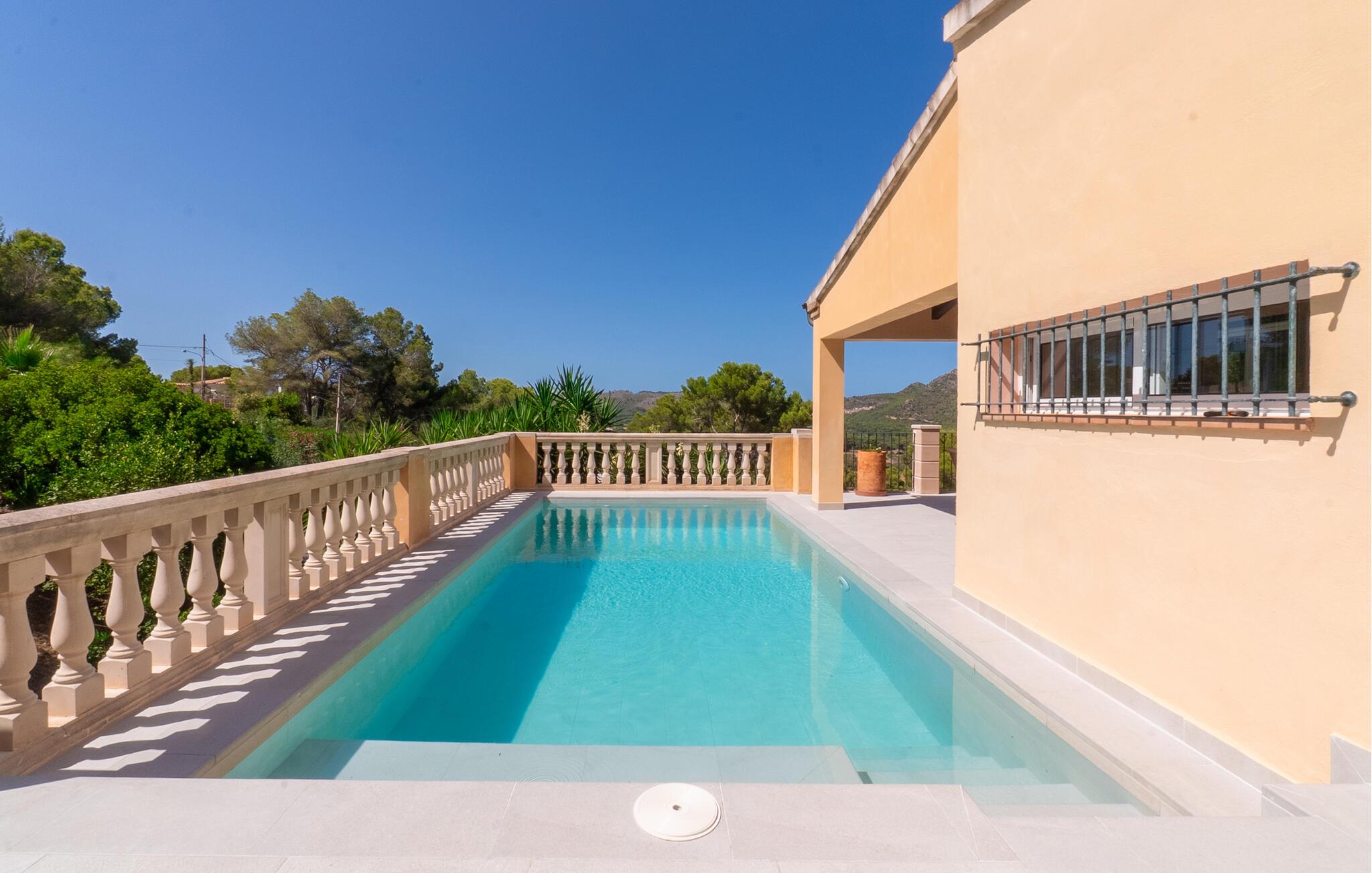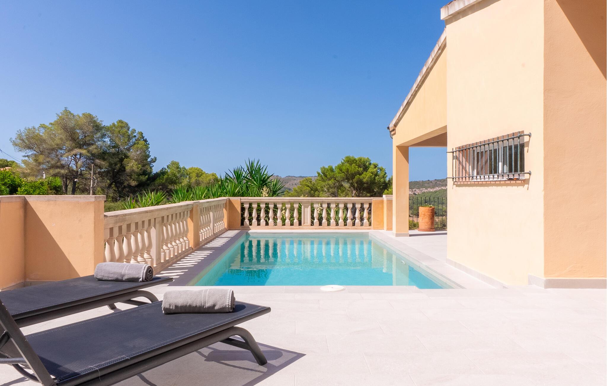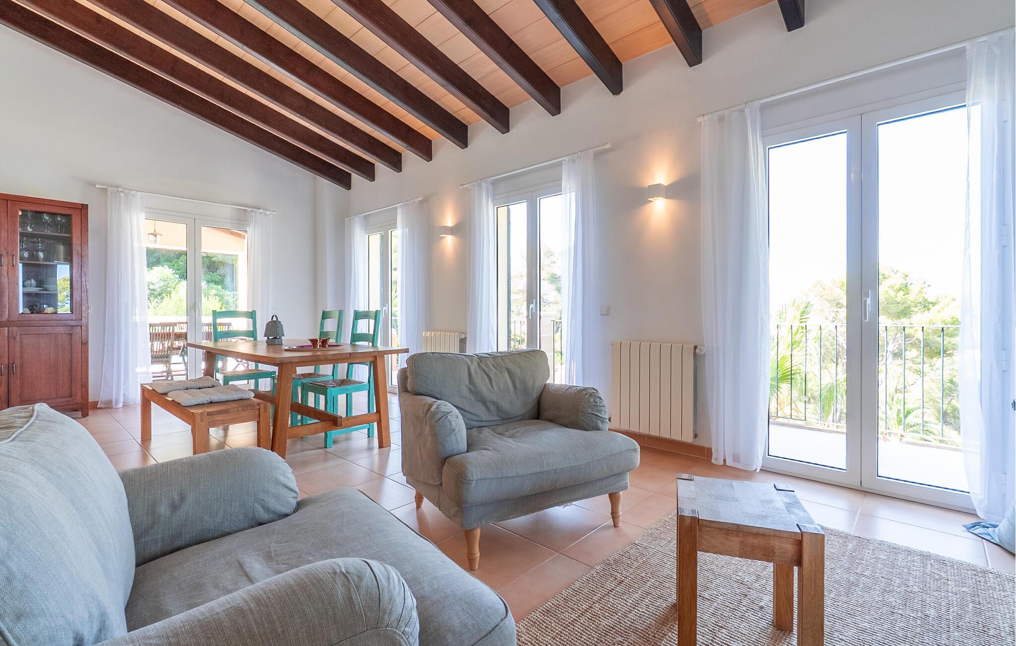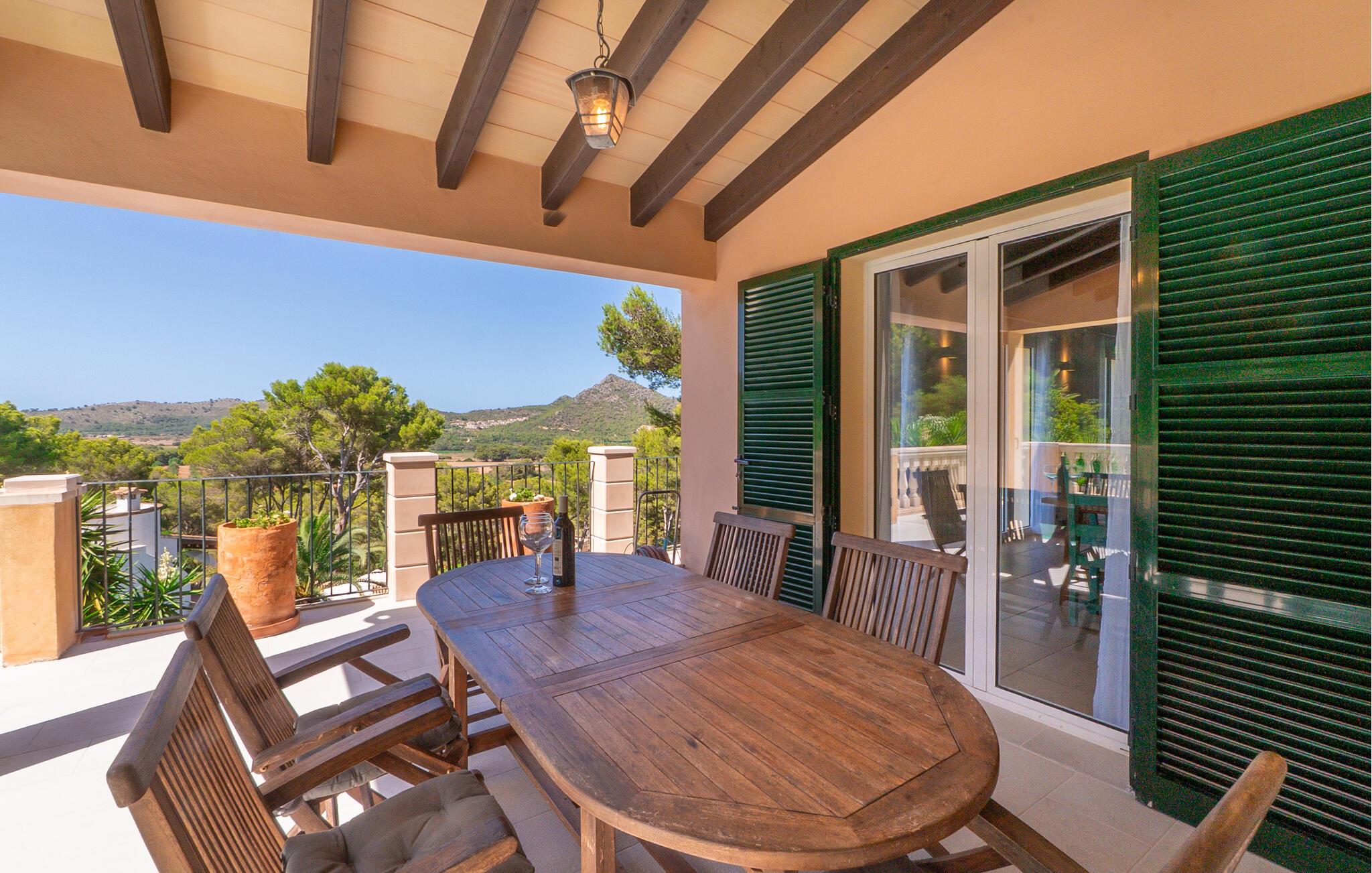 en vidunderlig beliggenhed på en bjergskråning og kærligt indrettet, er "Voltor 3" på Costa Canyamel som noget ud af en billedbog: havudsigt, komfort, pool lige ved siden af huset. Med sine masser af udendørs siddepladser og en vidunderlig udsigt vil denne villa på Mallorca krybe sig ind i ethvert solrigt feriehjerte lidt efter lidt. To-etagers, bygget i en klassisk middelhavsstil, præsenterer det sig selv som en allrounder, når det kommer til feriestemning midt i frugtbart grønt. En overdækket terrasse med spisebord, plus en chill-out lounge med kunstrattan møbler og en parasol - den smukkeste tid på året begynder, så snart du ankommer til den 7 m lange pool. Senere vil du måske gå til en af de mange andre altaner. Der er mange steder at trække sig tilbage til – og alligevel den rette stemning til en godnatdrink. Selv de varmeste dage er ikke noget problem: Den fremragende beliggenhed og de mange store døre og vinduer sikrer et perfekt indeklima! I øvrigt: Villaen har en asfaltparkeringsplads, så du kan parkere din lejebil direkte foran huset. Naturlige farver, lysstyrke og lidt nordisk stil – det skaber sommerfriskhed og afslappet hygge i denne villa på Mallorca. Omdrejningspunktet på øverste etage er opholdsstuen med pejs: harmoniske accenter møder massivt træ og originale møbler såsom det gyldent udseende sofabord i et honeycomb-design. I samme rum er der også spisebord med bænk og stole samt gennemgang til det tilstødende køkken. Her kan du ikke kun nyde friskbrygget kaffe, men selvforplejning finder også det nødvendige udstyr. Du finder gulv til loft vinduer og døre i hele huset – helt klart en feel-good faktor. Tydelig adskillelse: De tre kærligt designede soveværelser er placeret i villaens kælder. Alle har en-suite badeværelser og indbyggede skabe. Villaen “Voltor 3” ligger i det mangfoldige østlige Mallorca, cirka 1,5 km sydvest for Canyamels centrum med butikker, restauranter og den smukke, naturlige sandstrand. Her kan du bo stille og fredeligt midt i frodig vegetation og høj vegetation. Besøg de smukke bugter om dagen og nyd Middelhavet fra terrassen om aftenen: mere er ikke muligt. Dette er et Fincallorca feriehus.