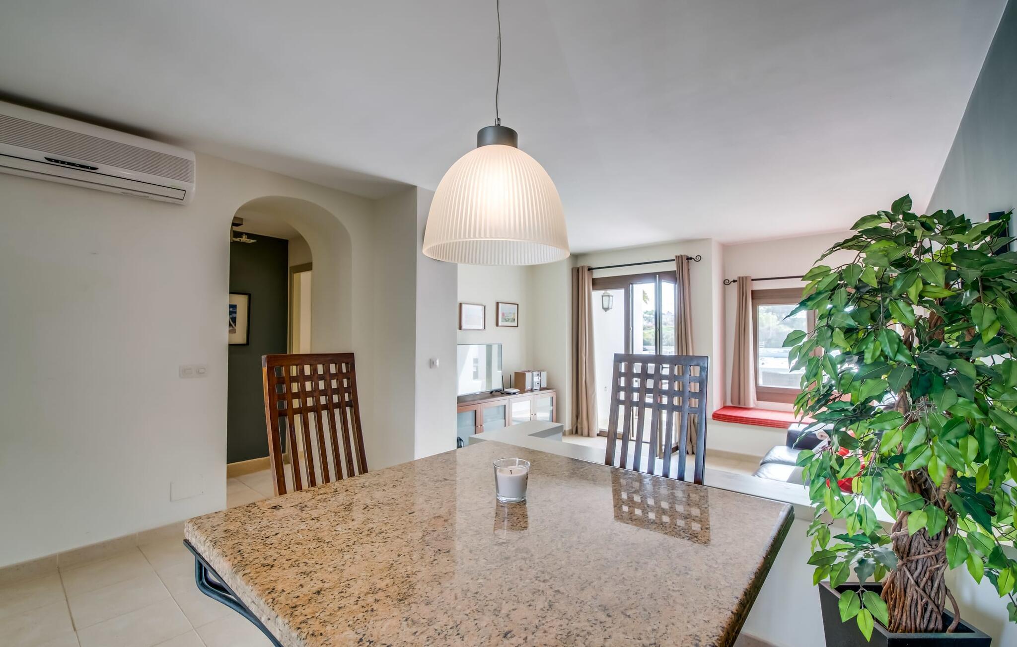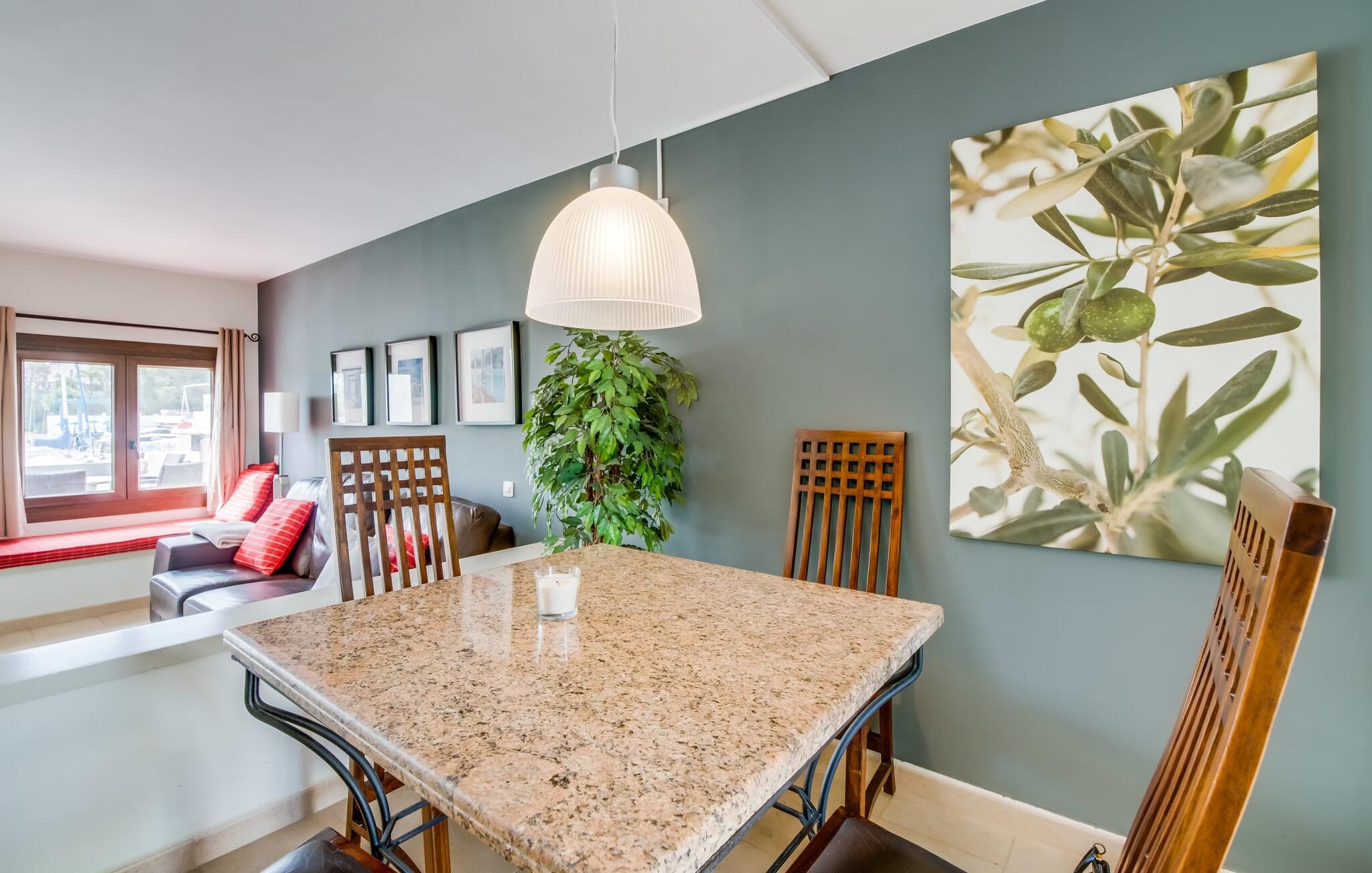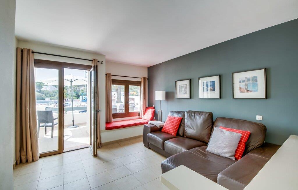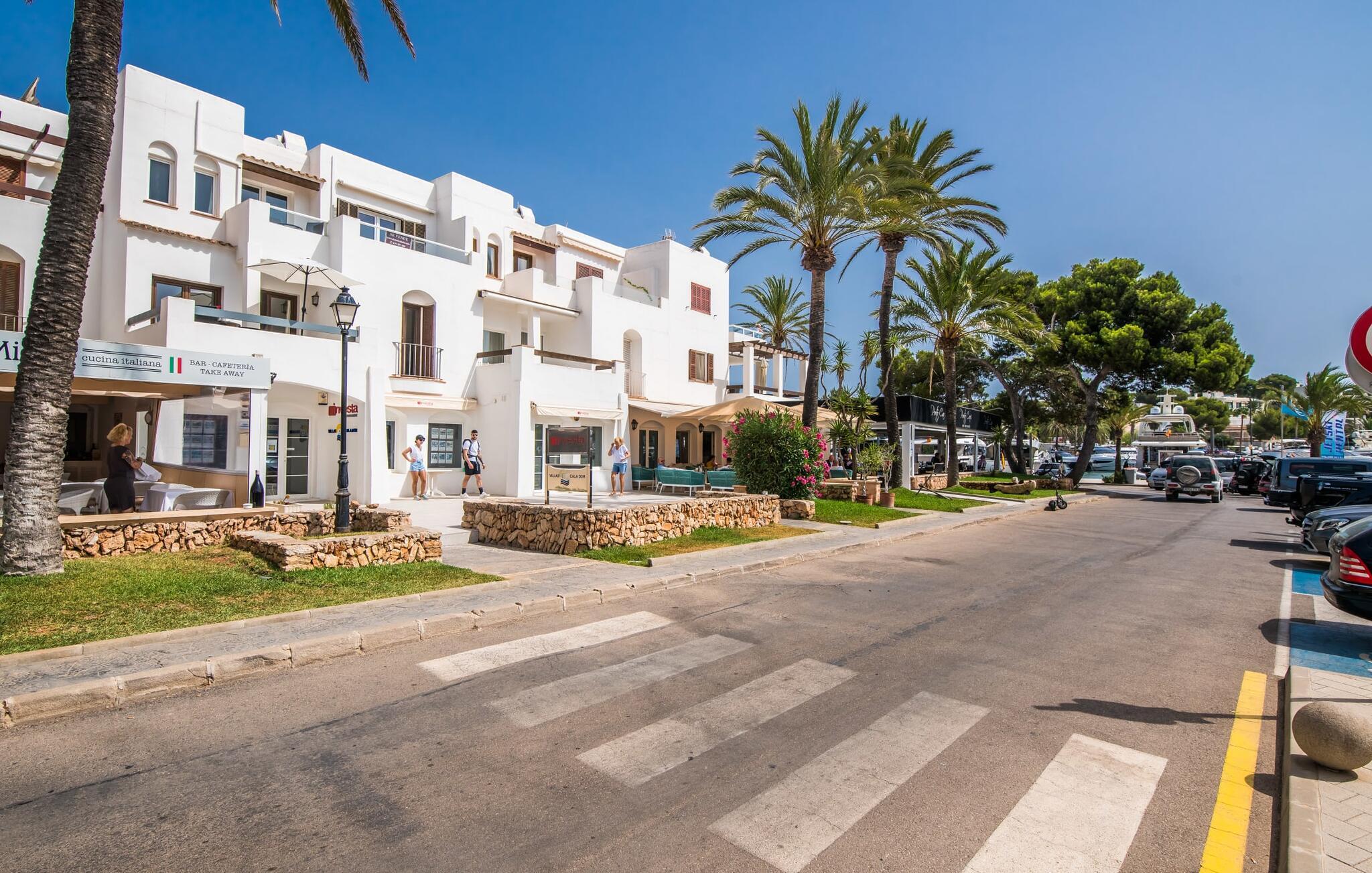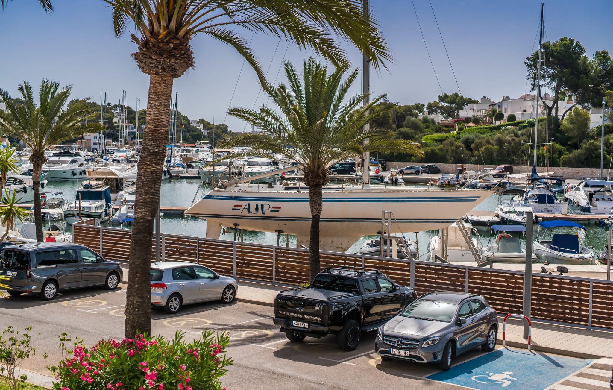 Den charmerende ferielejlighed "Yachthafen Dor" venter på jer i et funklende hvidt, arkitektonisk meget smukt designet bygningskompleks direkte på marinapromenaden i Cala D'Or. Stedets navn kan oversættes som "Golden Bay", og faktisk har badebugten med sin fine gule sandstrand, azurblå vand og børnevenlige lavvandede indsejling ikke dette navn for ingenting. Cala D'Or består næsten udelukkende af lyse hvide bygninger som denne, hvor ferielejligheden er særdeles bekvemt placeret i lavsæsonen. Brug af det fælles poolområde er inkluderet i prisen. Husene er omgivet af fyrreskove og palmer, hvilket giver stedet et meget naturligt udtryk. På grund af beliggenheden på havnebassinet nyder I ikke kun en helt betagende udsigt fra den generøst store altan, men I kan også nyde jeres velduftende morgenkaffe ved spisebordet og afslutte aftenen romantisk. Med denne beliggenhed drager I fordel af nærheden til mange restauranter og barer langs havnepromenaden. Ikke desto mindre har I adgang til et køkken til jeres ønskede selvforplejning, som giver jer mere fleksibilitet end hotelovernatning. Pladsen i ferieboligen, som har et ret åbent design, er også optimal. I tilknytning til stuen ligger spisepladsen med sit store panoramavindue, hvis vinduessæde giver en fantastisk udsigt selv i de køligere årstider. Værelserne, der er indrettet i venlige farver, er kølige om sommeren og kan nemt varmes op i lavsæsonen takket være den varme-kolde aircondition. To soveværelser, hver med komfortable badeværelser med badekar (et af dem en suite), tilbyder behagelig komfort uden at begrænse privatlivets fred. Velkommen til "Yachthafen Dor" - nyd jeres tid ude i den perfekte kombination af by, land og hav. Den velholdte ferielejlighed "Yachthafen Dor" venter på jer på den sydlige del af øen i den smukke kystby Cala D'Or. Navnet siger selvfølgelig det hele, da det lyse hvide lejlighedskompleks ligger direkte ved lystbådehavnen. Fra balkonen i den centralt beliggende ferielejlighed kan I nyde en direkte udsigt over havnen, som ikke er skæmmet af lejlighedsvise akustiske lyde fra gaden. I kan nå byen og den smukke sandstrand i bugten af samme navn til fods.