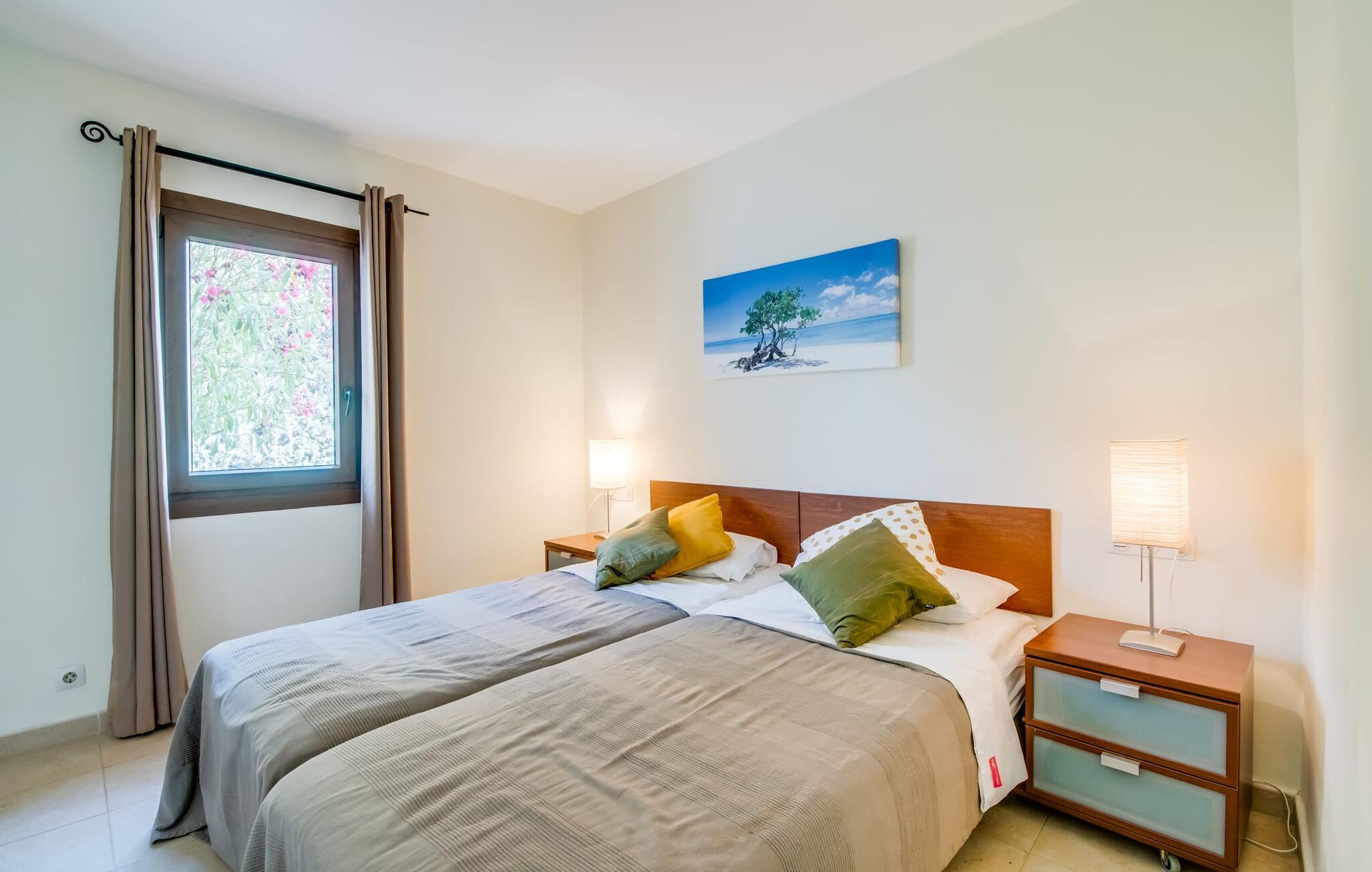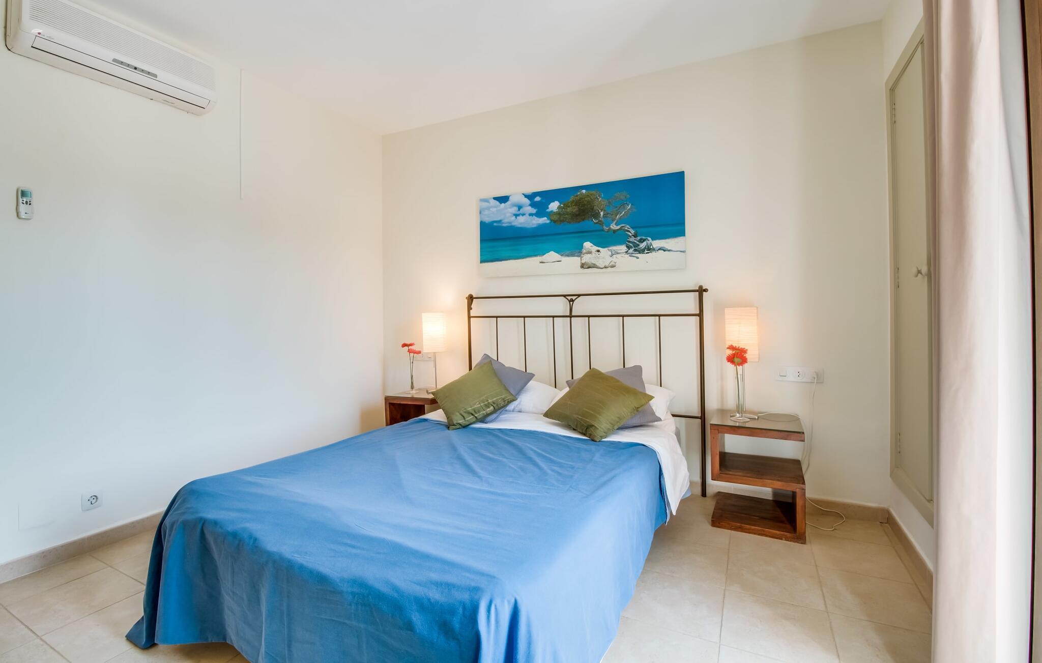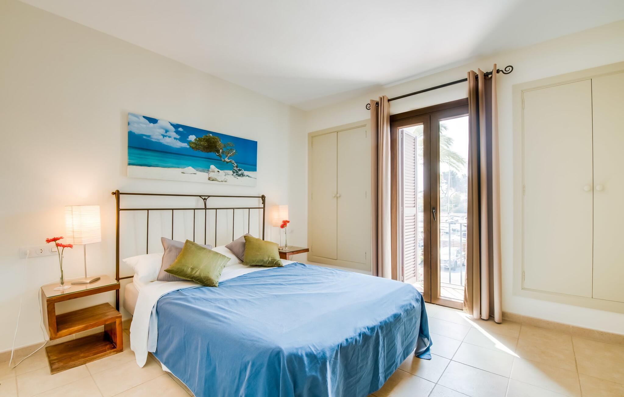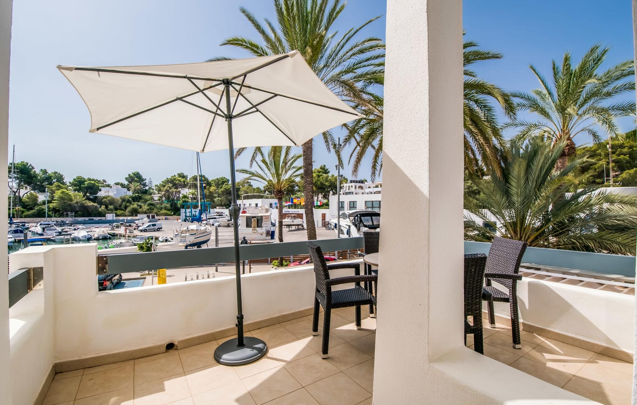 Den charmerende ferielejlighed "Yachthafen Dor" venter på jer i et funklende hvidt, arkitektonisk meget smukt designet bygningskompleks direkte på marinapromenaden i Cala D'Or. Stedets navn kan oversættes som "Golden Bay", og faktisk har badebugten med sin fine gule sandstrand, azurblå vand og børnevenlige lavvandede indsejling ikke dette navn for ingenting. Cala D'Or består næsten udelukkende af lyse hvide bygninger som denne, hvor ferielejligheden er særdeles bekvemt placeret i lavsæsonen. Brug af det fælles poolområde er inkluderet i prisen. Husene er omgivet af fyrreskove og palmer, hvilket giver stedet et meget naturligt udtryk. På grund af beliggenheden på havnebassinet nyder I ikke kun en helt betagende udsigt fra den generøst store altan, men I kan også nyde jeres velduftende morgenkaffe ved spisebordet og afslutte aftenen romantisk. Med denne beliggenhed drager I fordel af nærheden til mange restauranter og barer langs havnepromenaden. Ikke desto mindre har I adgang til et køkken til jeres ønskede selvforplejning, som giver jer mere fleksibilitet end hotelovernatning. Pladsen i ferieboligen, som har et ret åbent design, er også optimal. I tilknytning til stuen ligger spisepladsen med sit store panoramavindue, hvis vinduessæde giver en fantastisk udsigt selv i de køligere årstider. Værelserne, der er indrettet i venlige farver, er kølige om sommeren og kan nemt varmes op i lavsæsonen takket være den varme-kolde aircondition. To soveværelser, hver med komfortable badeværelser med badekar (et af dem en suite), tilbyder behagelig komfort uden at begrænse privatlivets fred. Velkommen til "Yachthafen Dor" - nyd jeres tid ude i den perfekte kombination af by, land og hav. Den velholdte ferielejlighed "Yachthafen Dor" venter på jer på den sydlige del af øen i den smukke kystby Cala D'Or. Navnet siger selvfølgelig det hele, da det lyse hvide lejlighedskompleks ligger direkte ved lystbådehavnen. Fra balkonen i den centralt beliggende ferielejlighed kan I nyde en direkte udsigt over havnen, som ikke er skæmmet af lejlighedsvise akustiske lyde fra gaden. I kan nå byen og den smukke sandstrand i bugten af samme navn til fods.