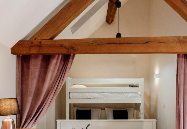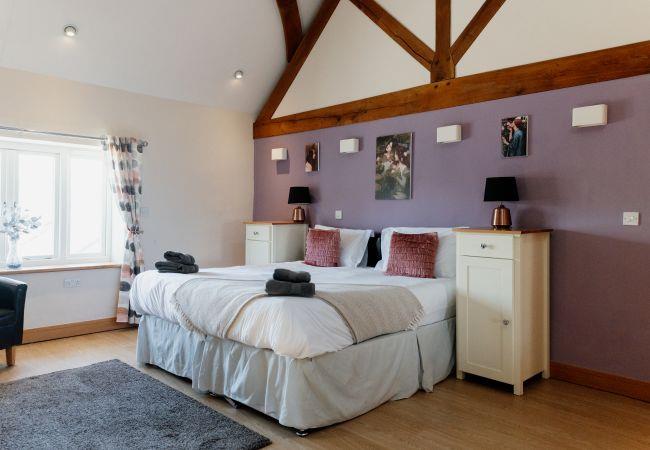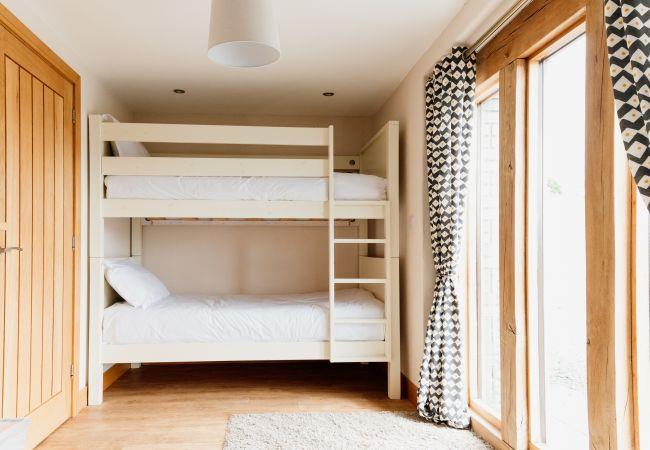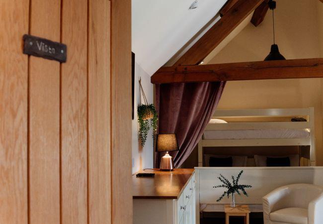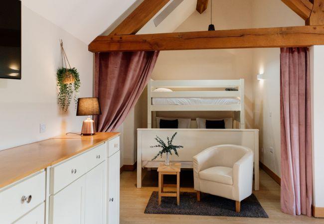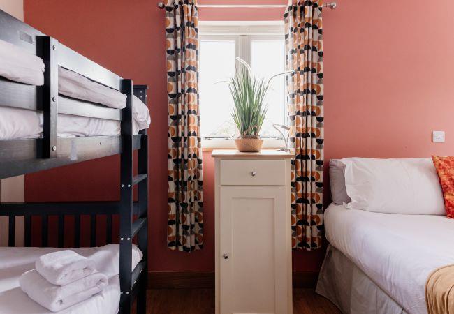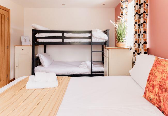 Rhos Suite – Ground floor. 1 Super King-sized bed & sturdy bunk beds. Private en suite wet room bathroom. (Sleeps 4) Super King can't be split.