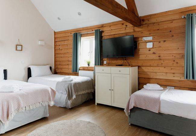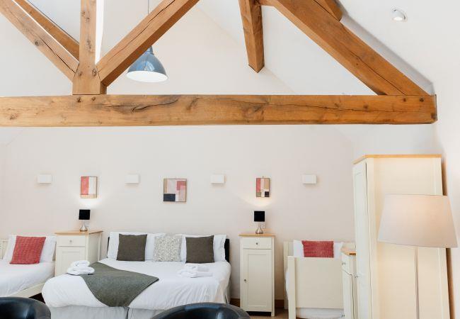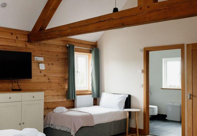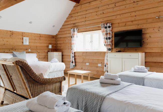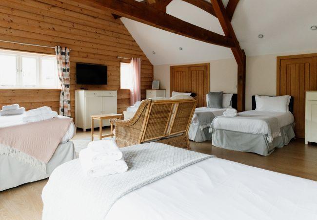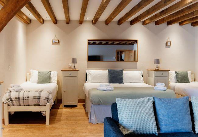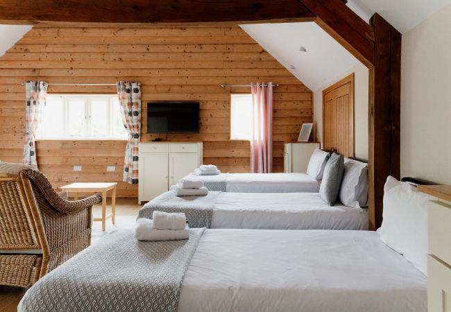 Village Suite – First floor. 1 Super King-sized bed and 3 single beds. Seating area, SMART tv. Private en suite has twin showers and sinks. (Sleeps 5) Super King can't be split.