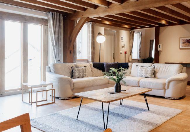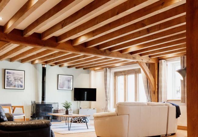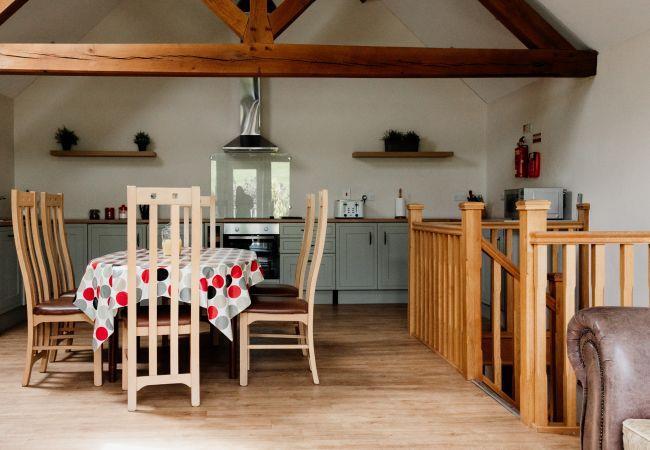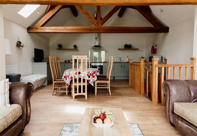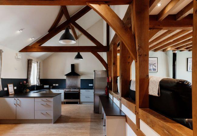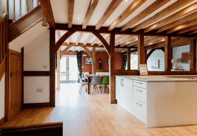 Cambrian House has open plan living, dining and kitchen area blending modern facilities with classic country chic decor making a sumptuously comfortable and inviting home from home. Time spent with family and friends is precious, which is why we have created a spacious but cosy living area with beamed ceilings, underfloor heating and log burner, furnished with comfortable seating for you to make the most of your valuable time together.